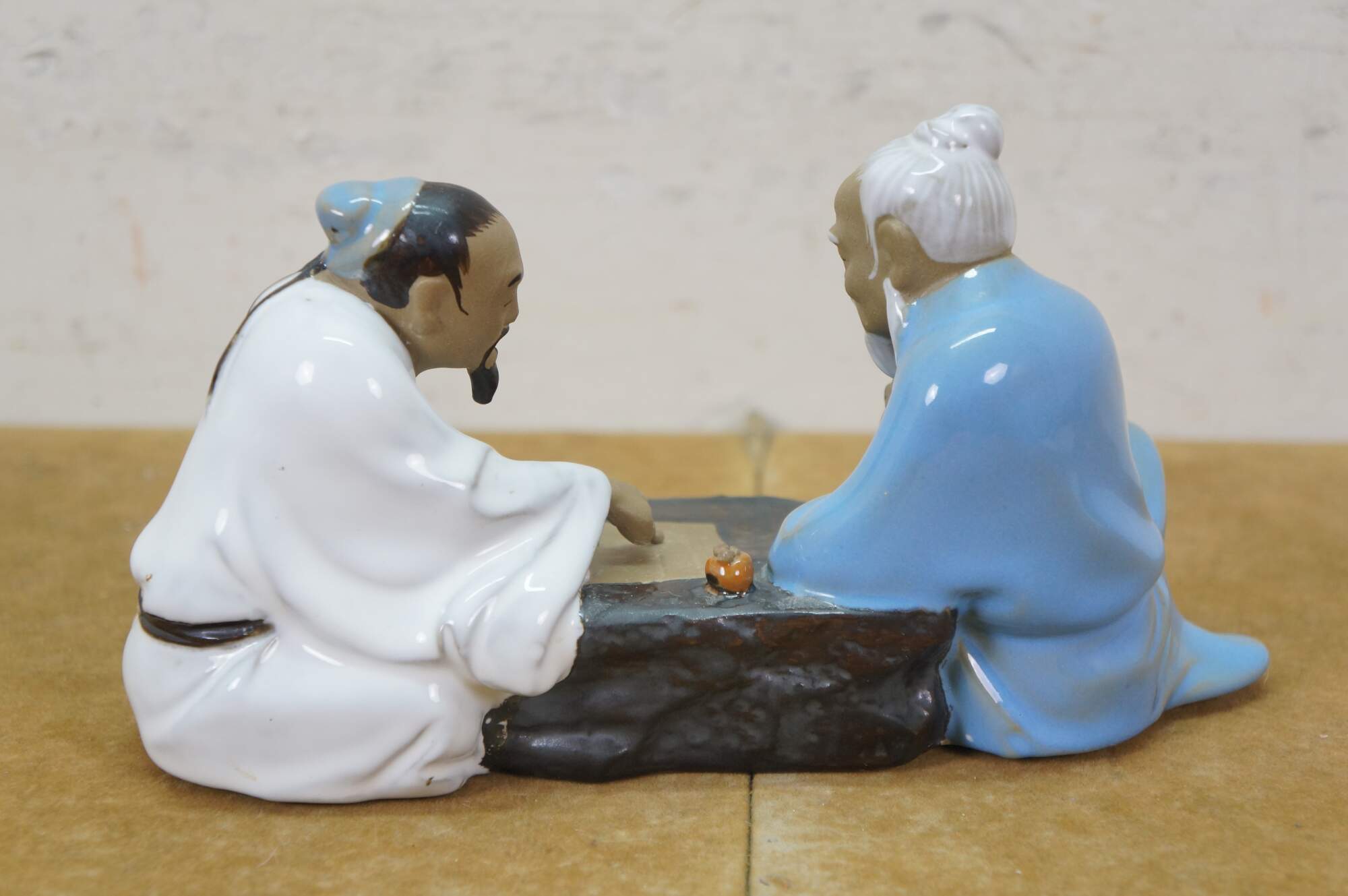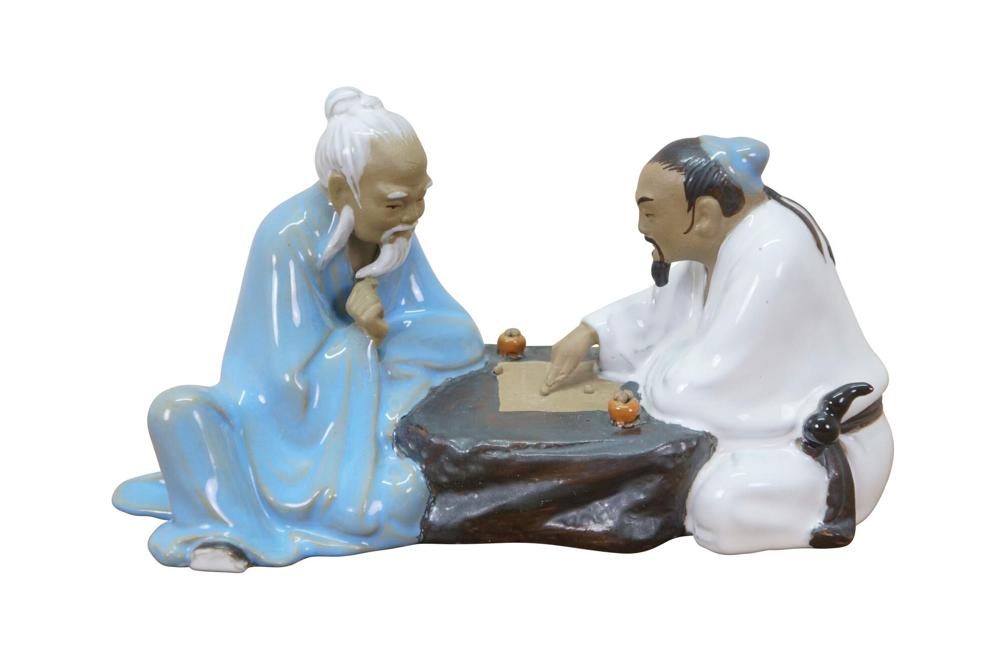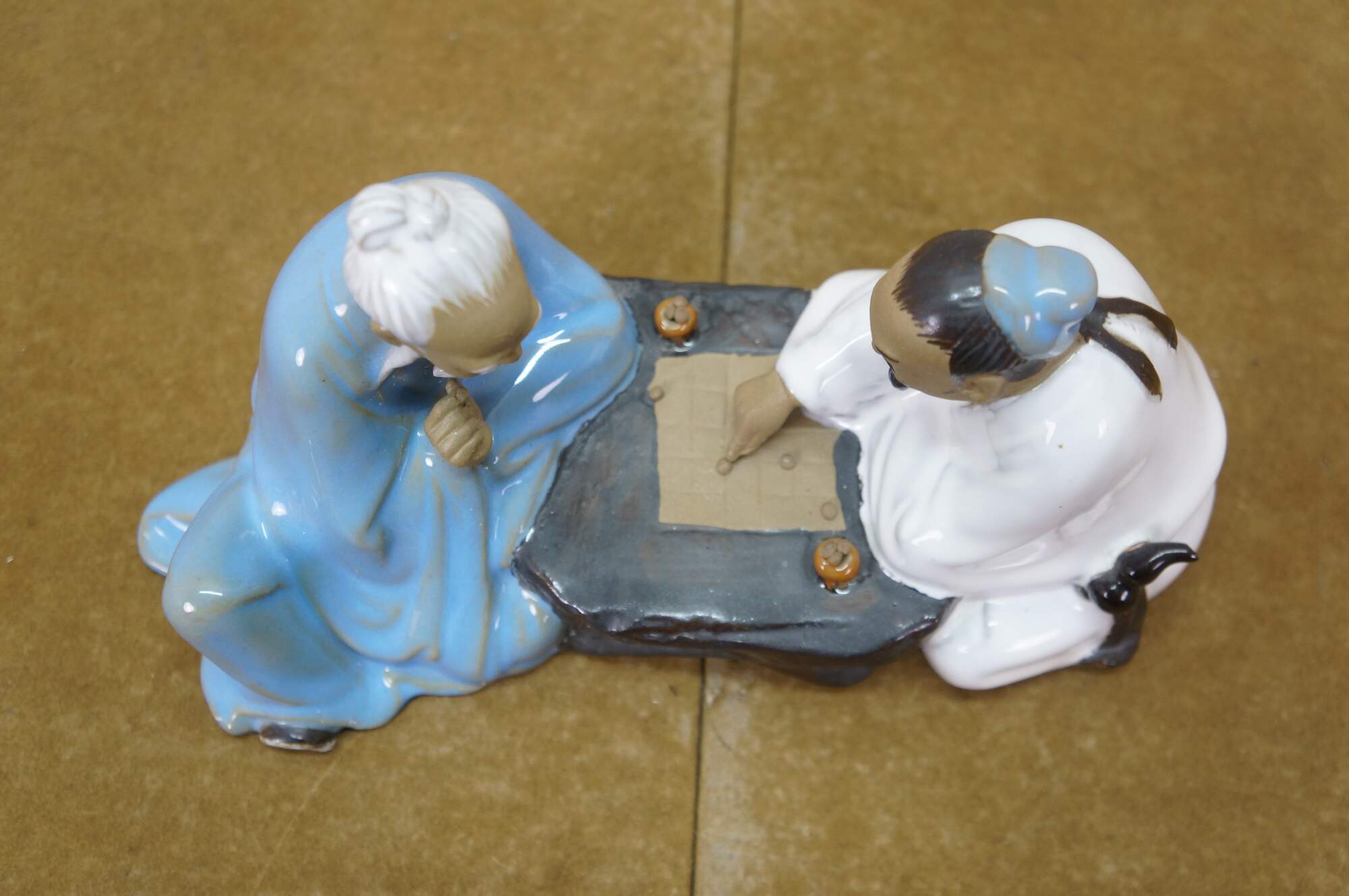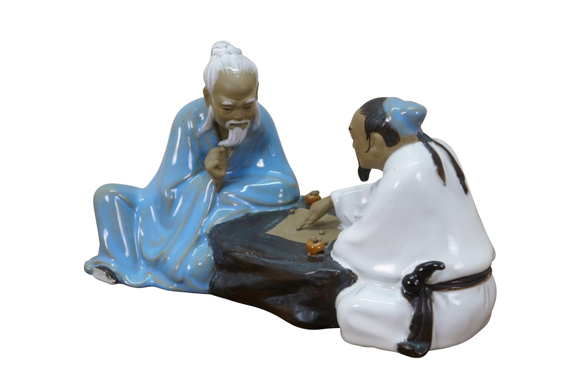 Vintage Chinese Shiwan (Shekwan) pottery mudman figurine depicting two elderly men playing a board game, likely "Go" (Weiqi).