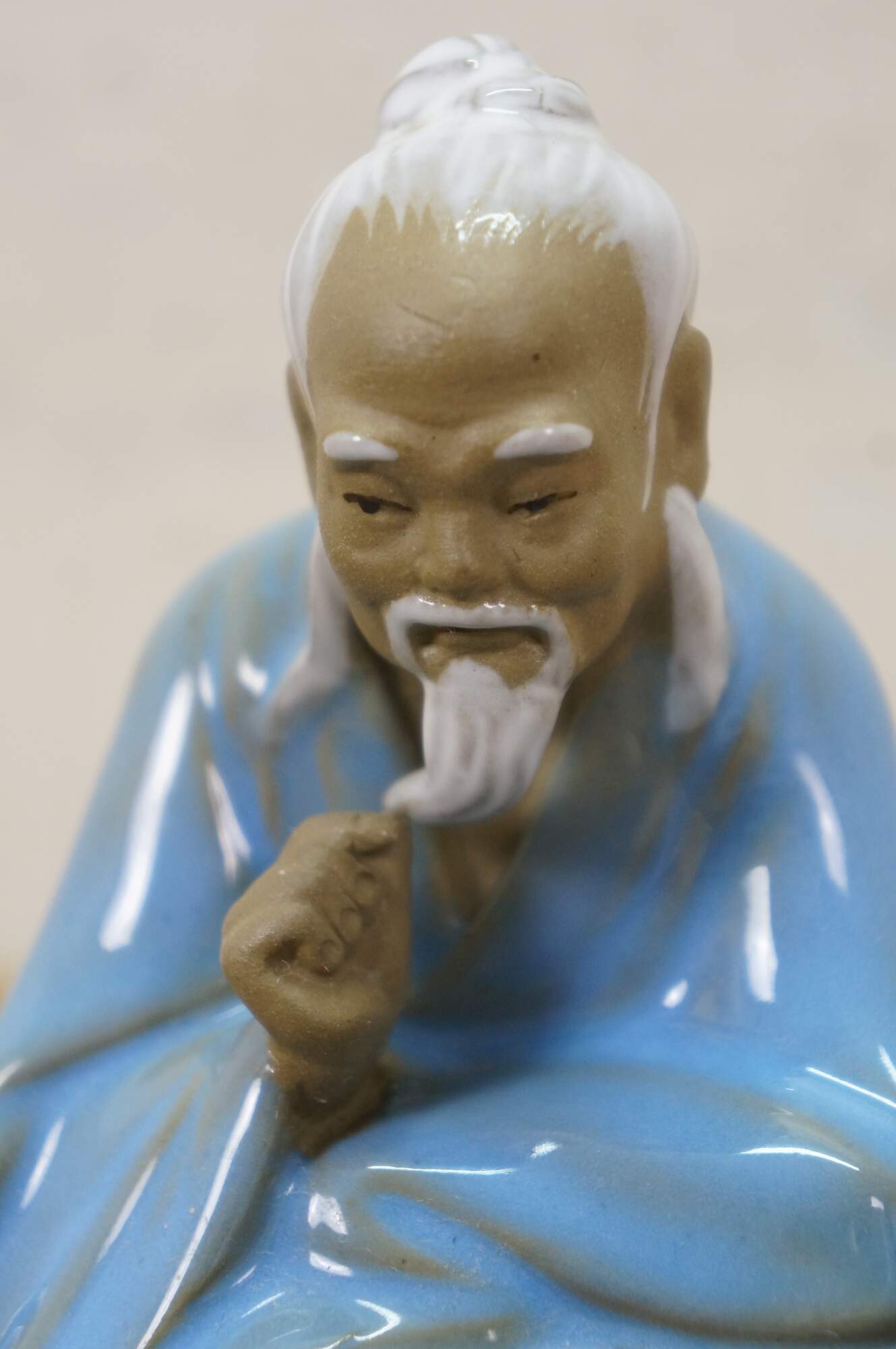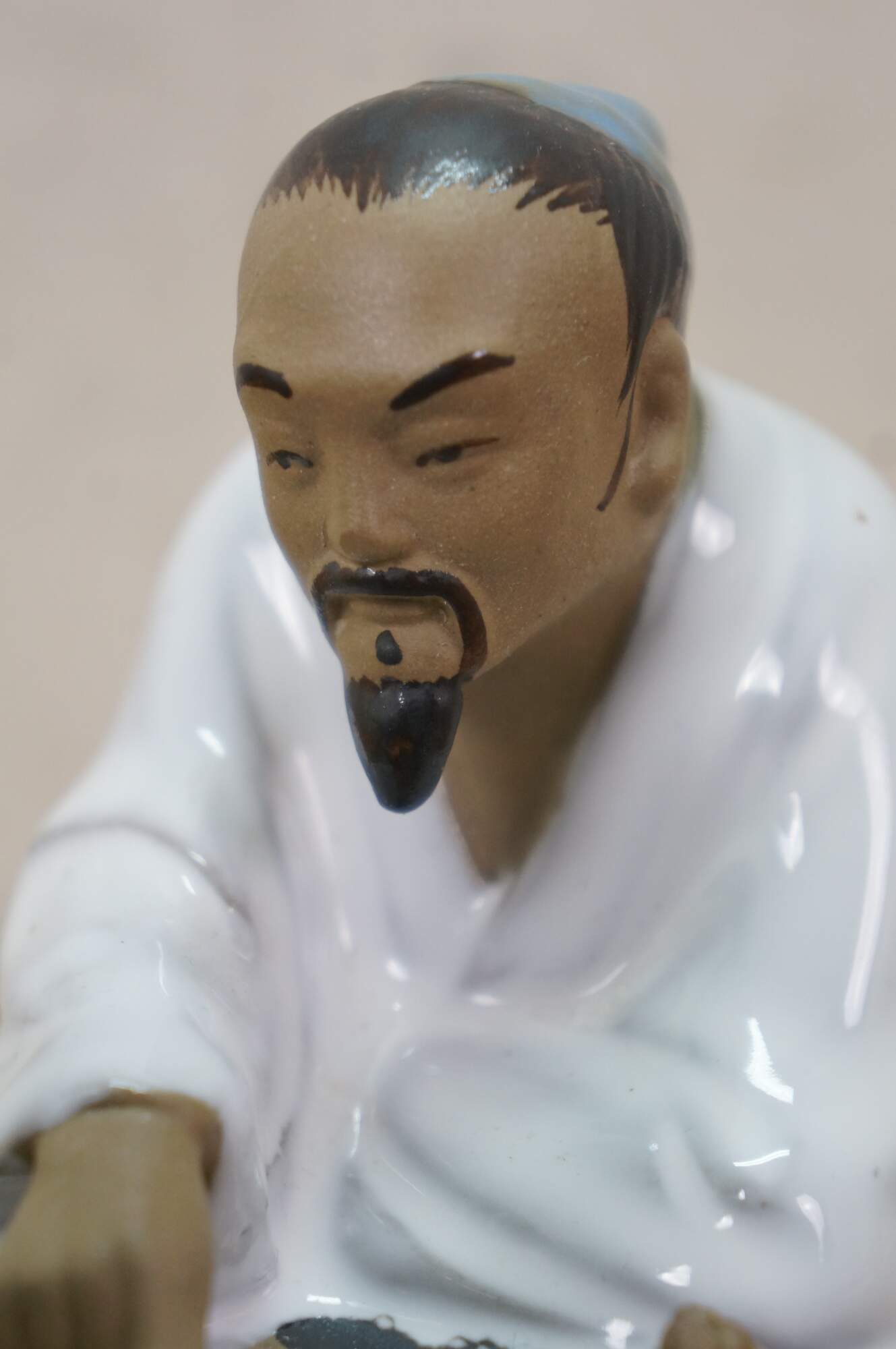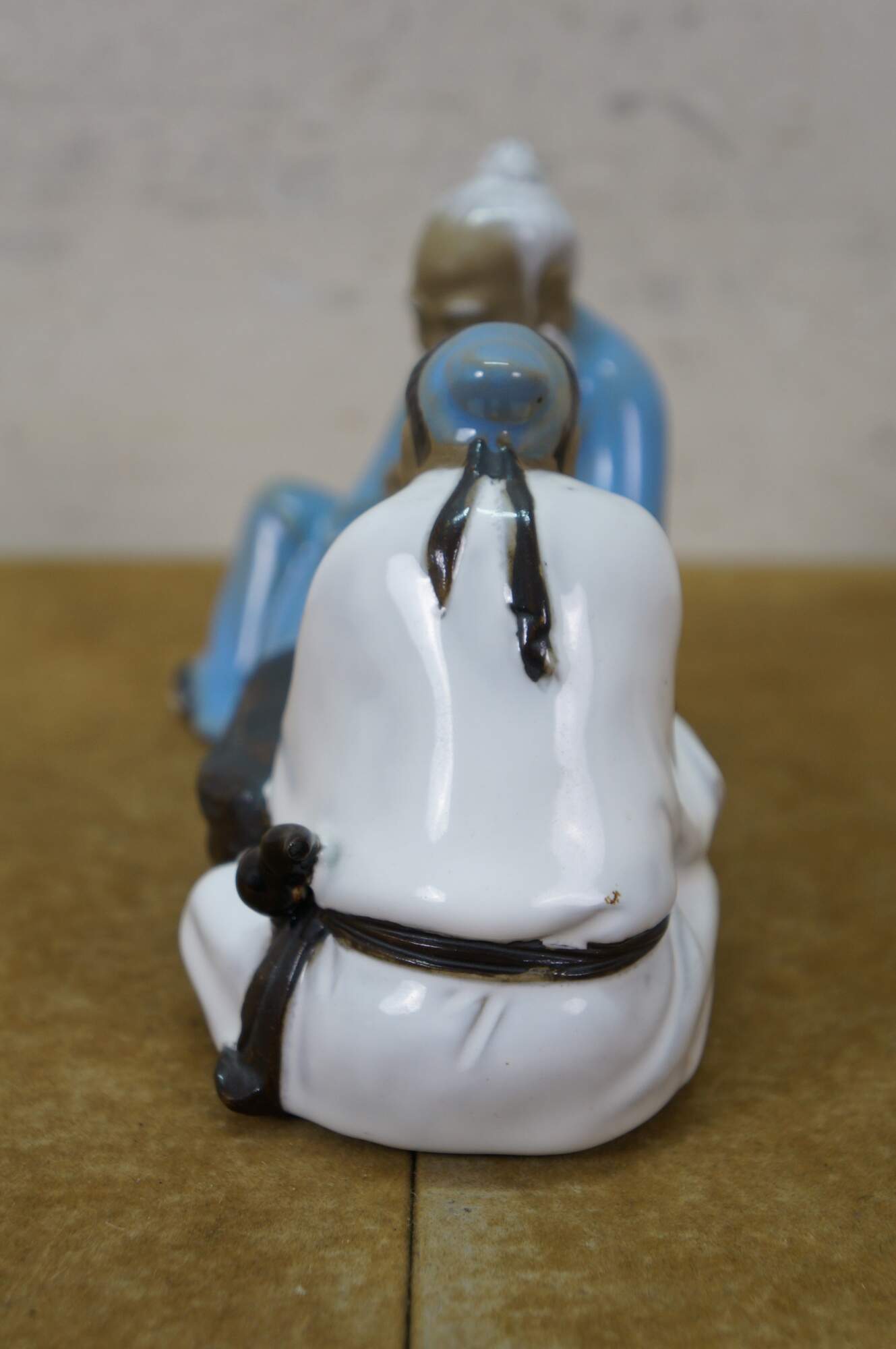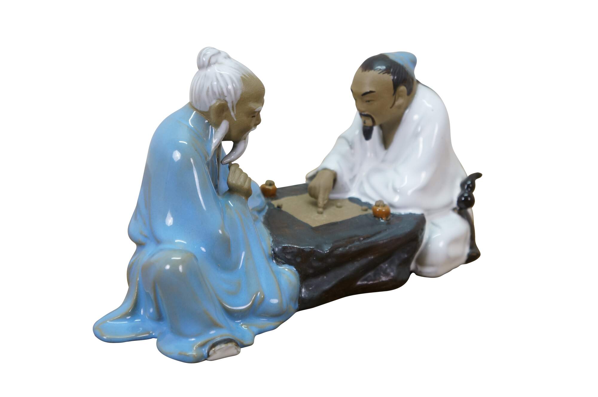 Vintage Chinese Shiwan (Shekwan) pottery mudman figurine depicting two elderly men playing a board game, likely "Go" (Weiqi).