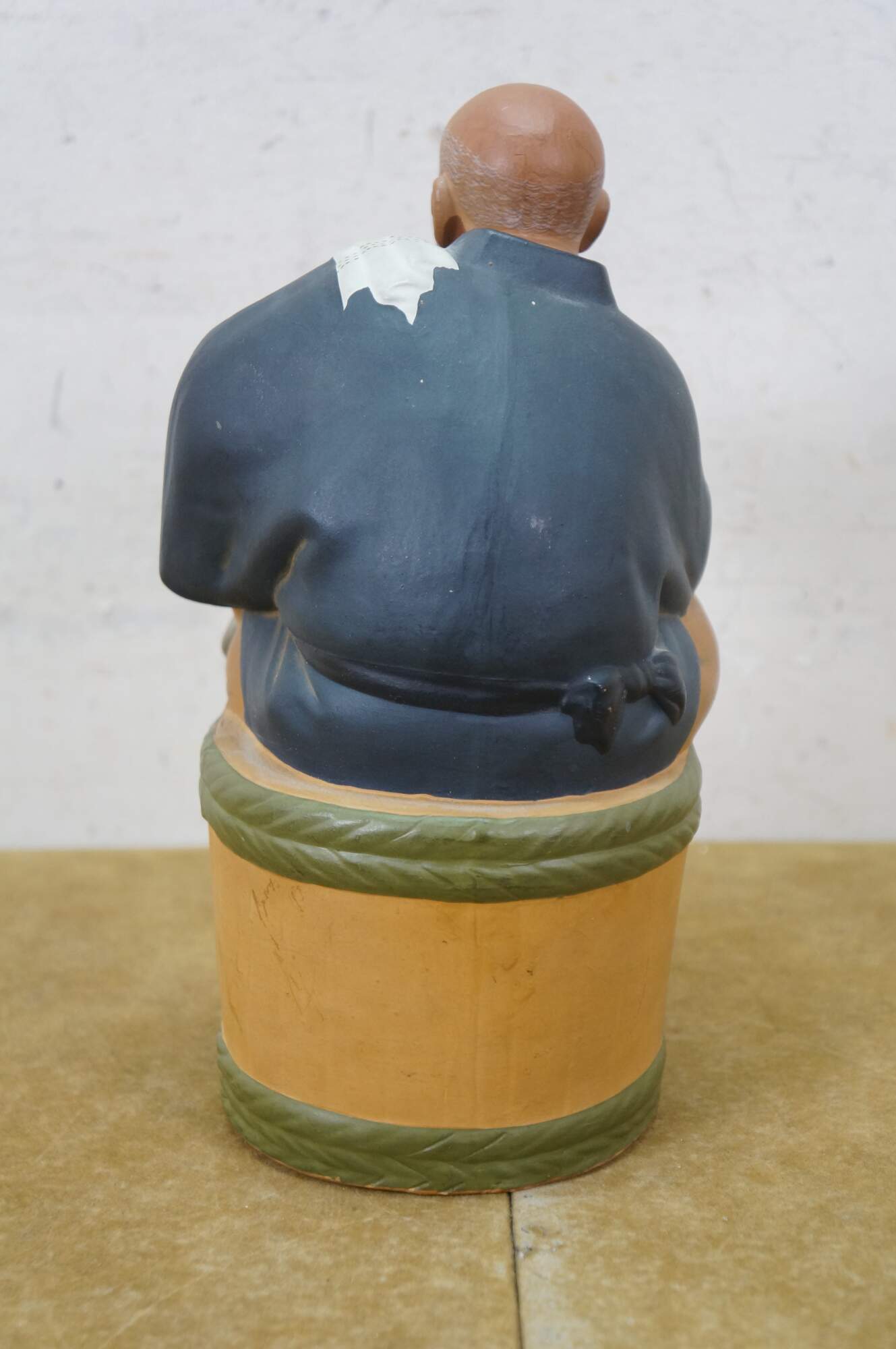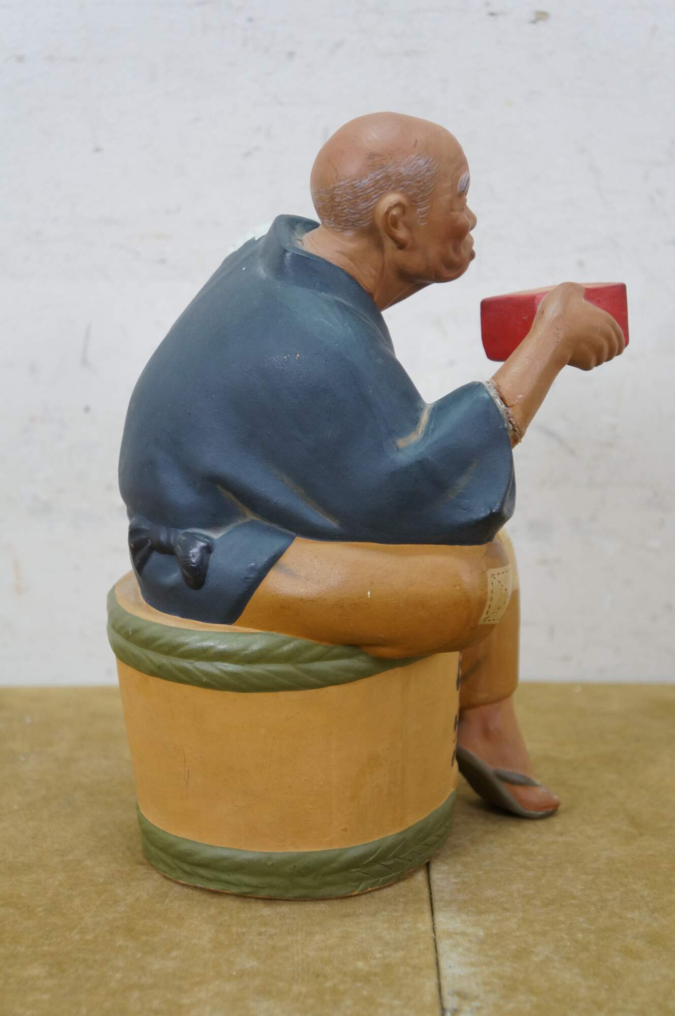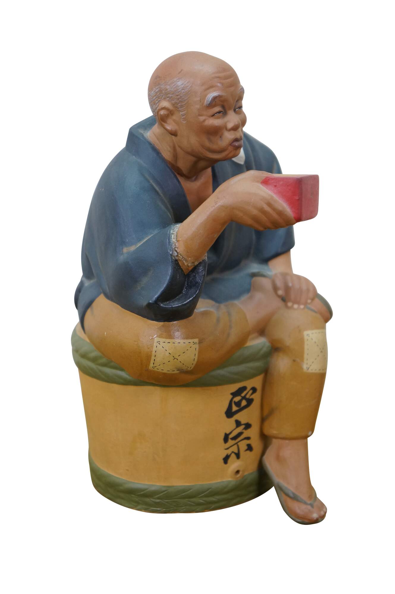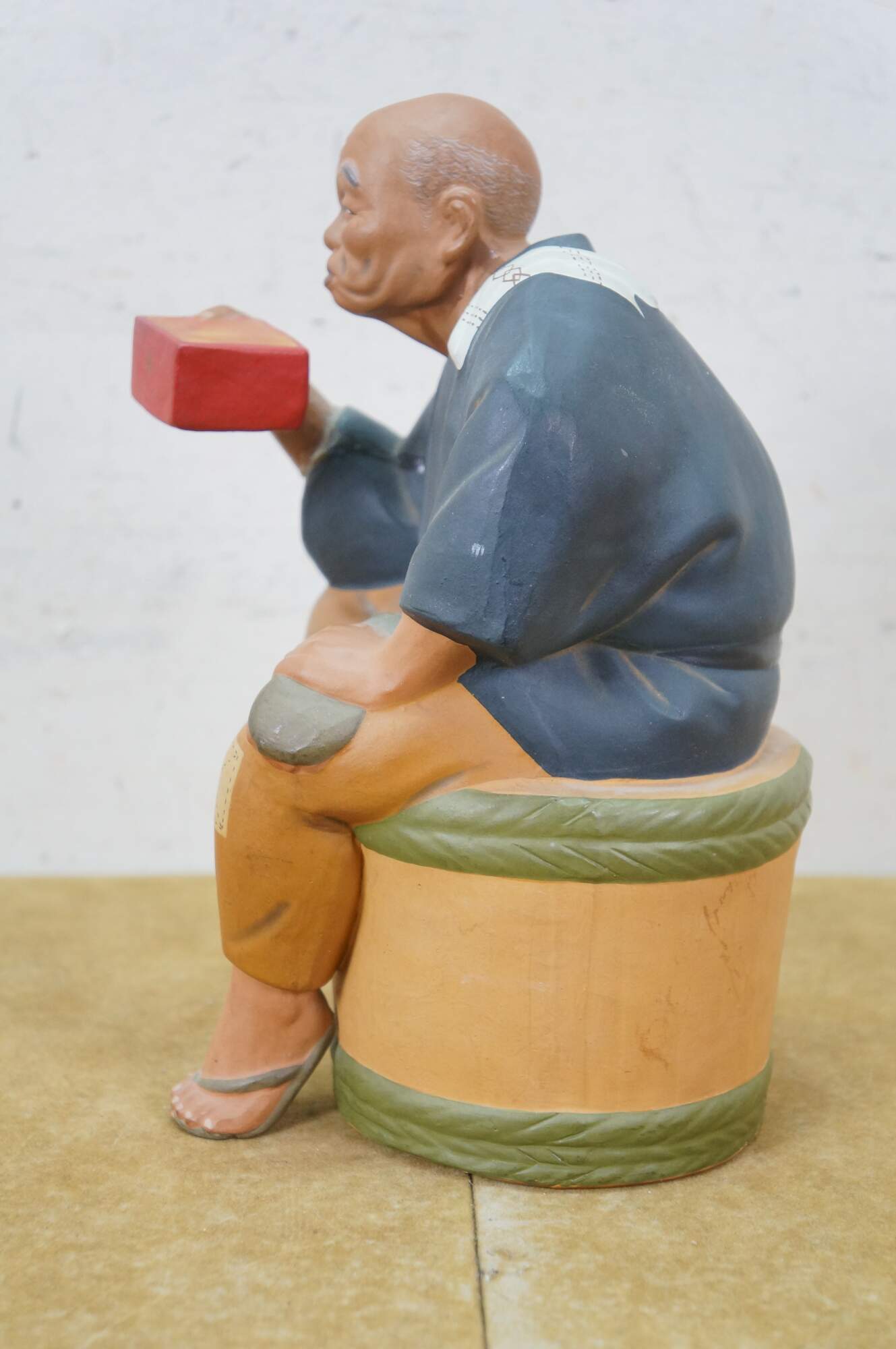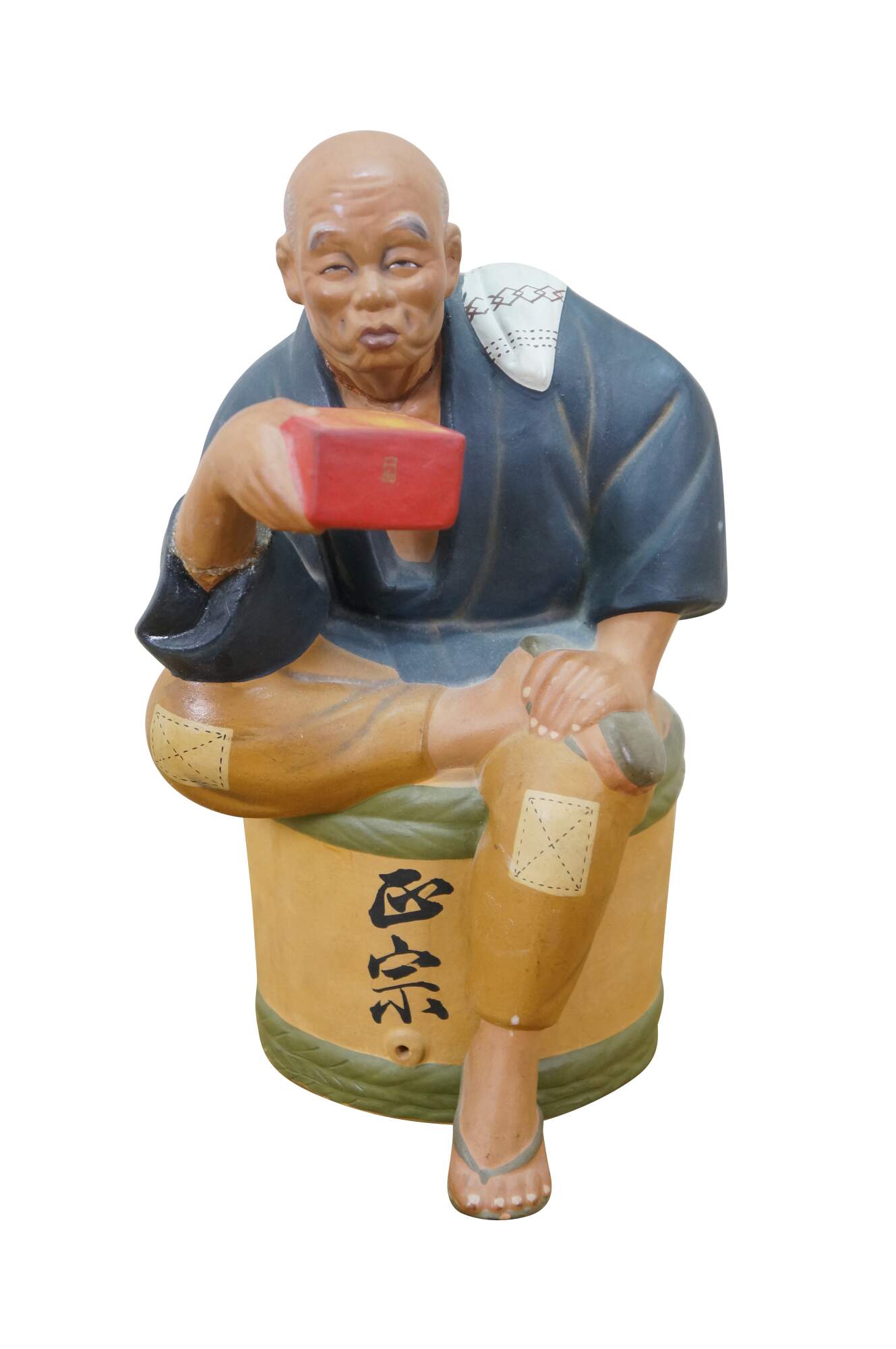 Mid century Japanese Hakata Urasaki clay doll figurine depicting an elderly man with a box in his hand and a smug look on his face. He appears to be an off duty chef, seated on a barrel of rice or saki.