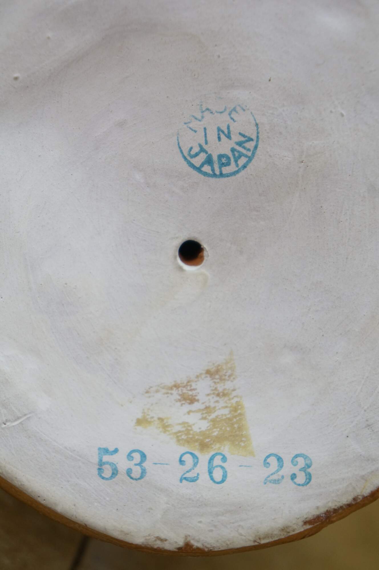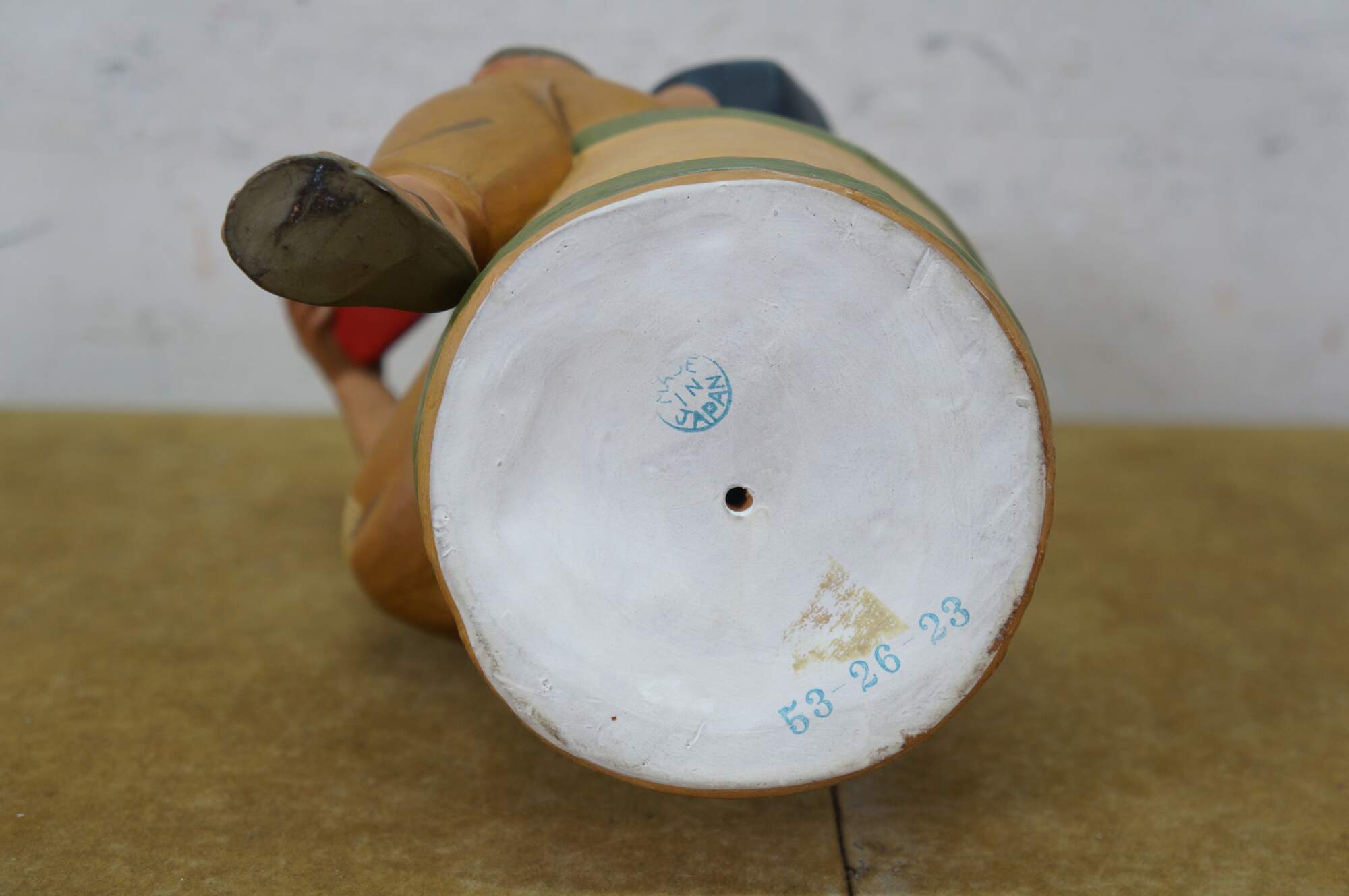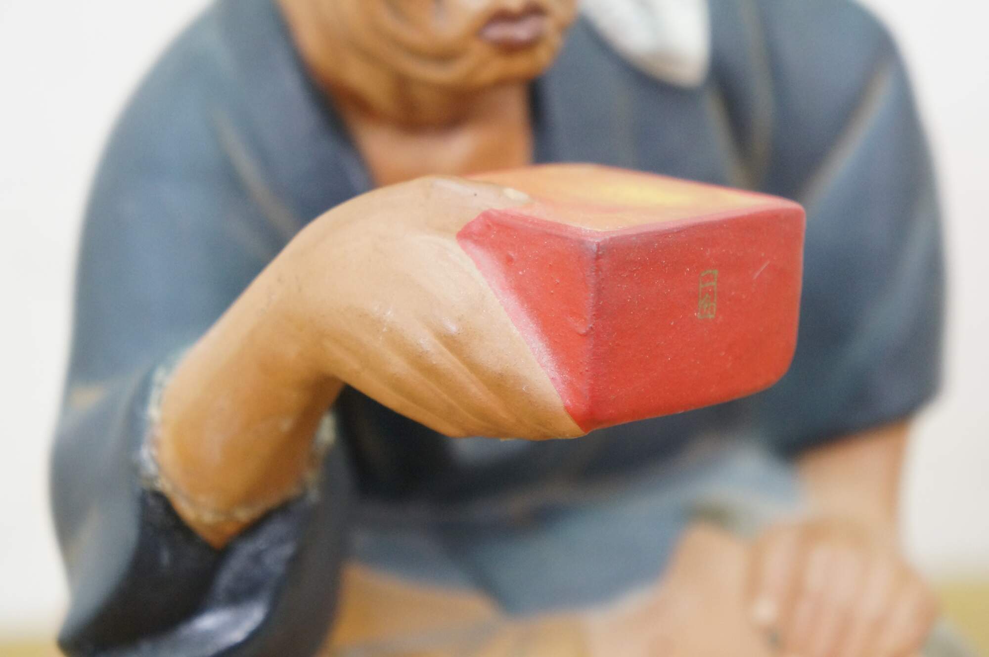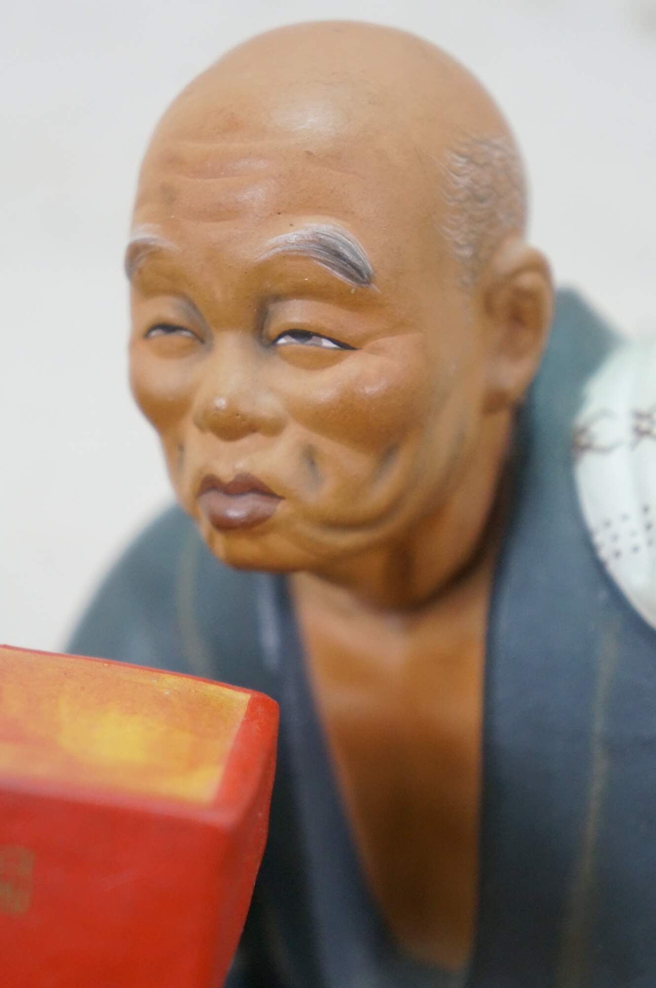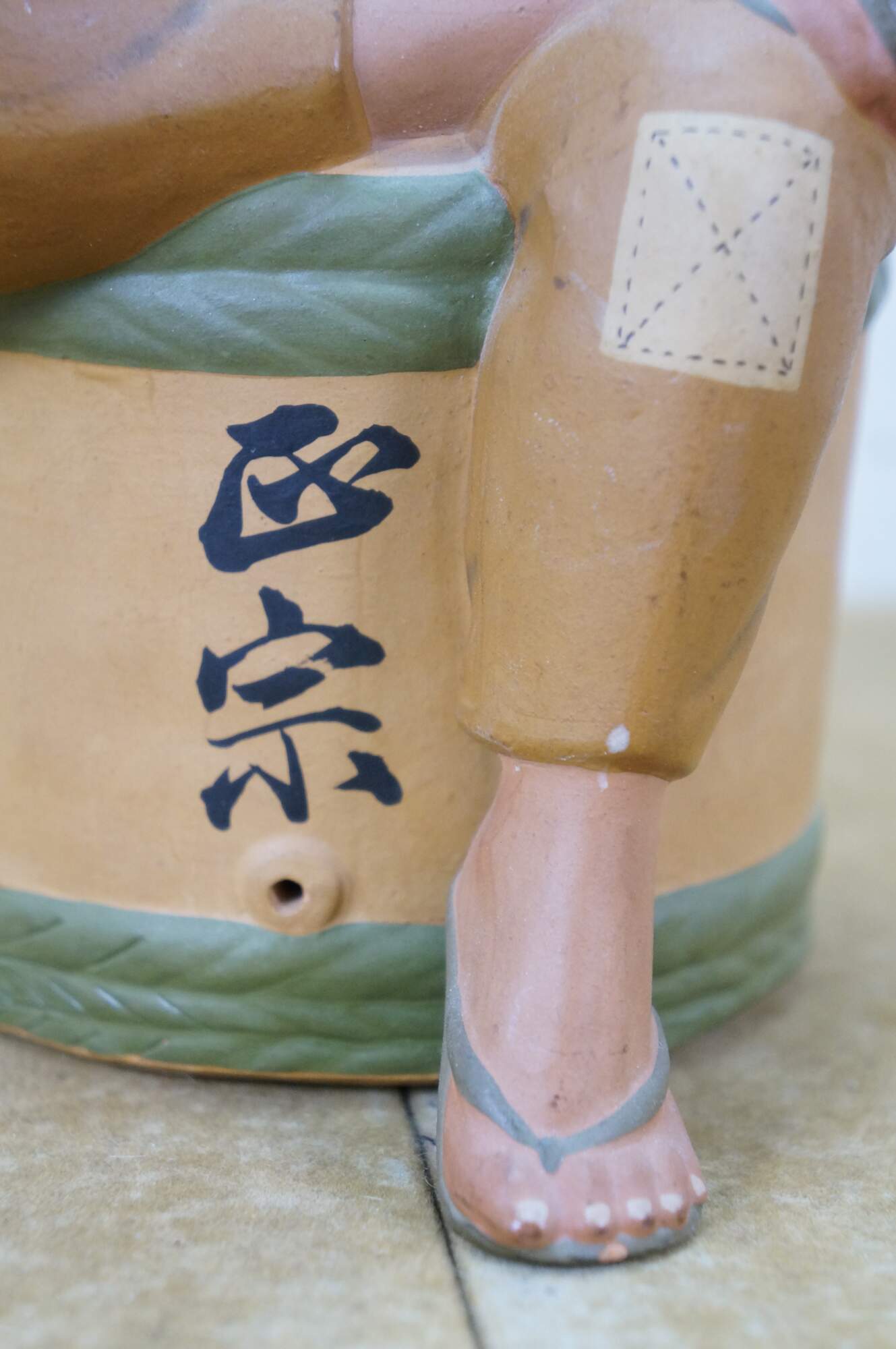 Mid century Japanese Hakata Urasaki clay doll figurine depicting an elderly man with a box in his hand and a smug look on his face. He appears to be an off duty chef, seated on a barrel of rice or saki.