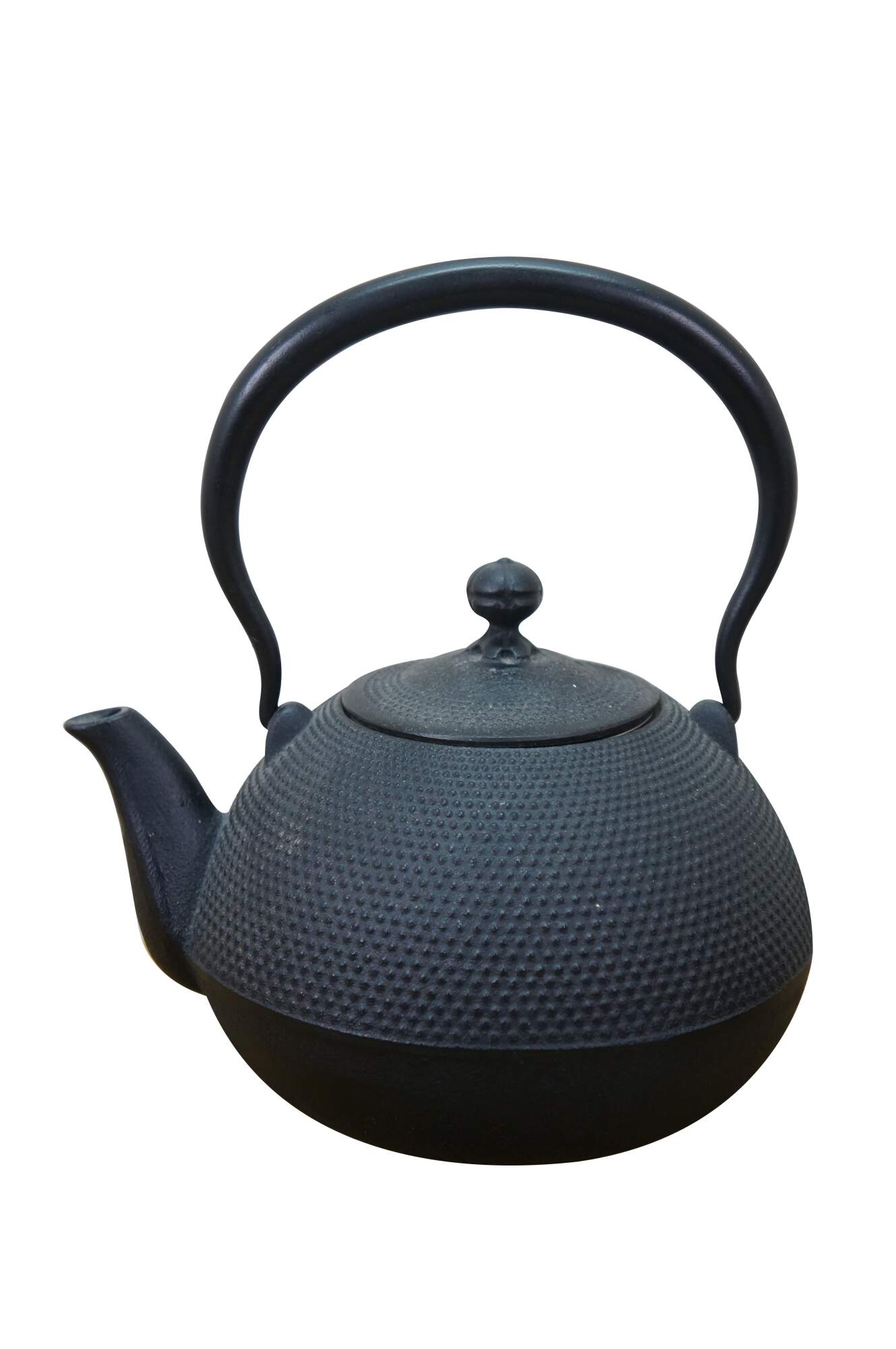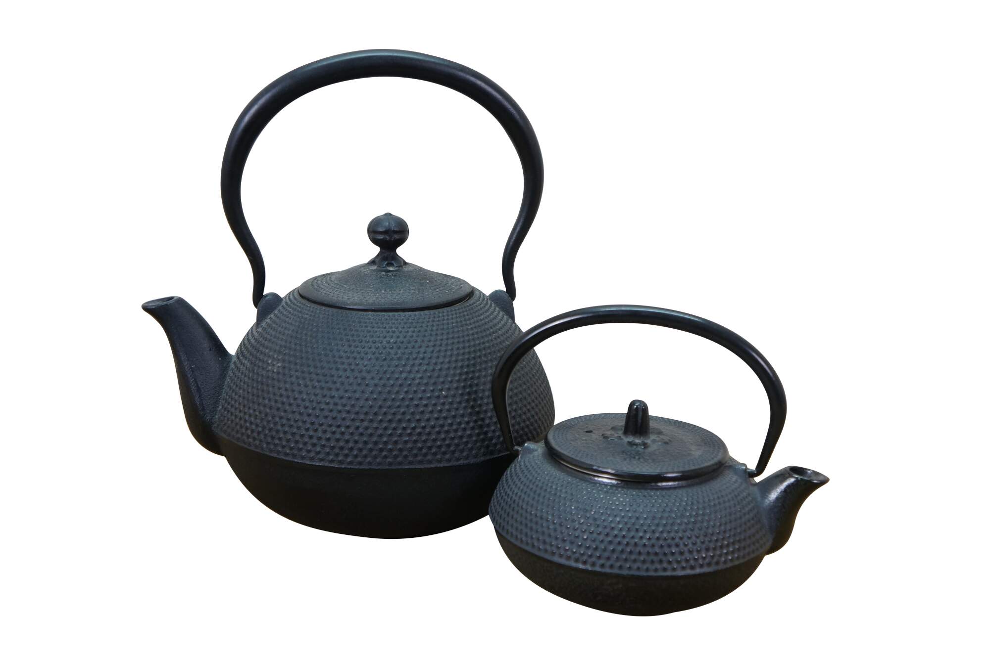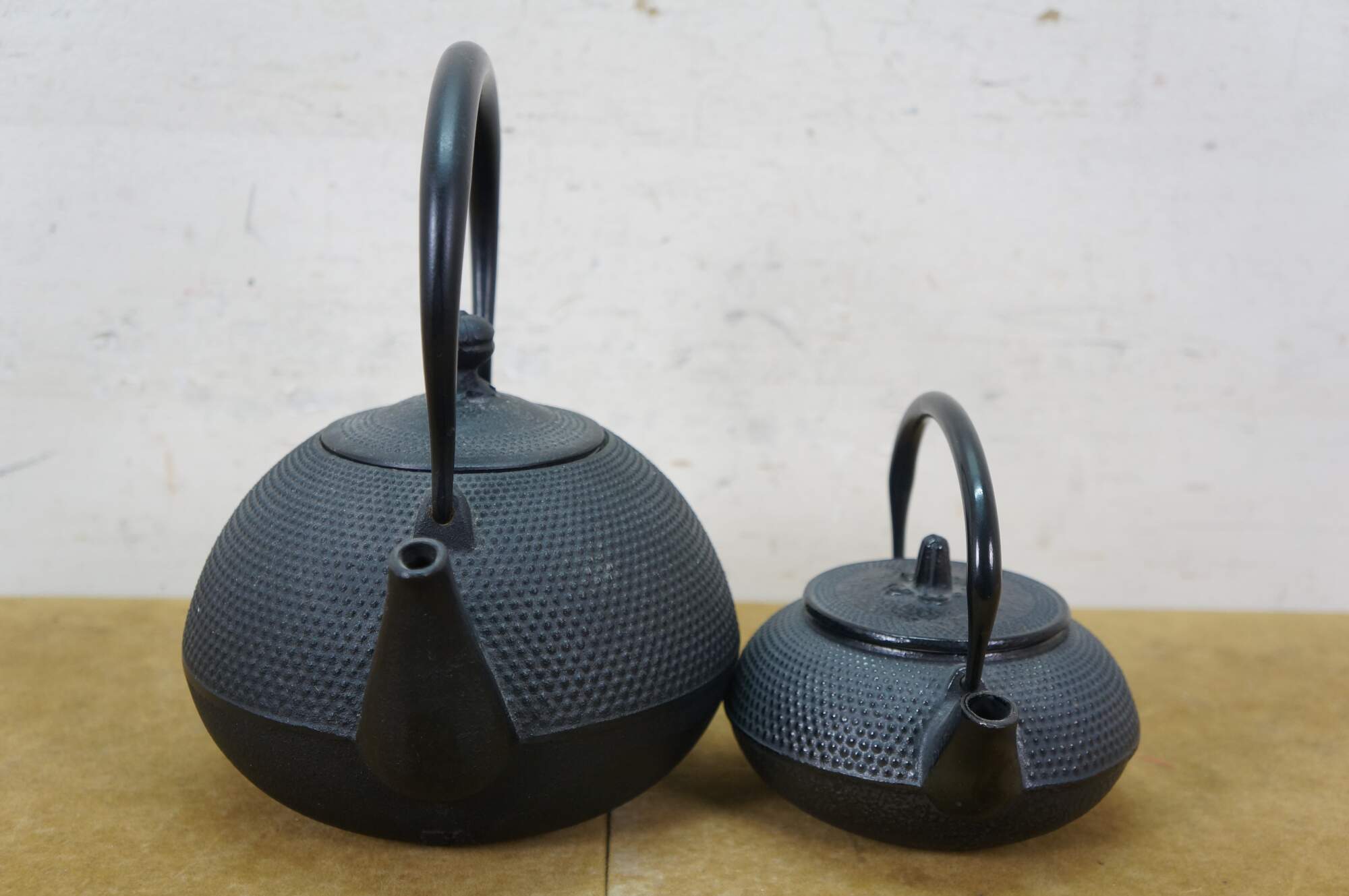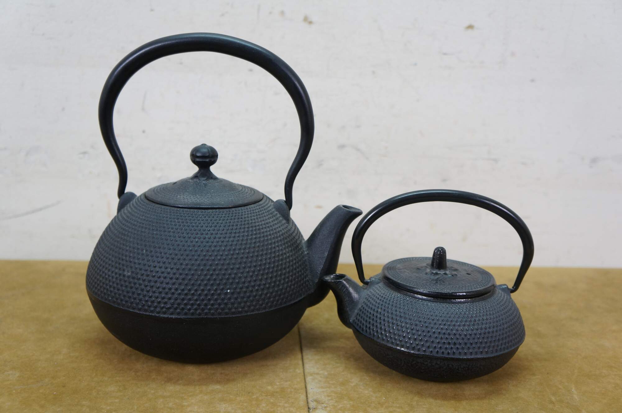 Vintage Japanese black cast iron Arare / hobnail pattern teapots / kettles, known as tetsubin or Nambu tekki. Tetsubin pots are traditionally used for boiling water and are prized for their durability and craftsmanship. The cast iron material helps keep water heated for longer periods than other materials. Water boiled in these kettles can release dissolved iron, which may help prevent anemia and enhances the flavor of green tea.