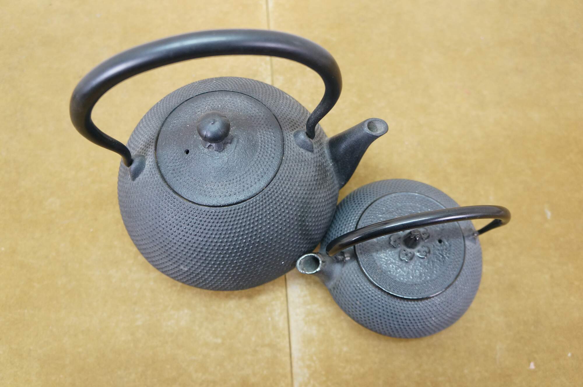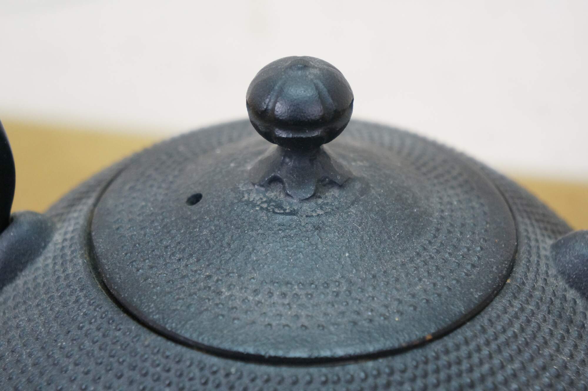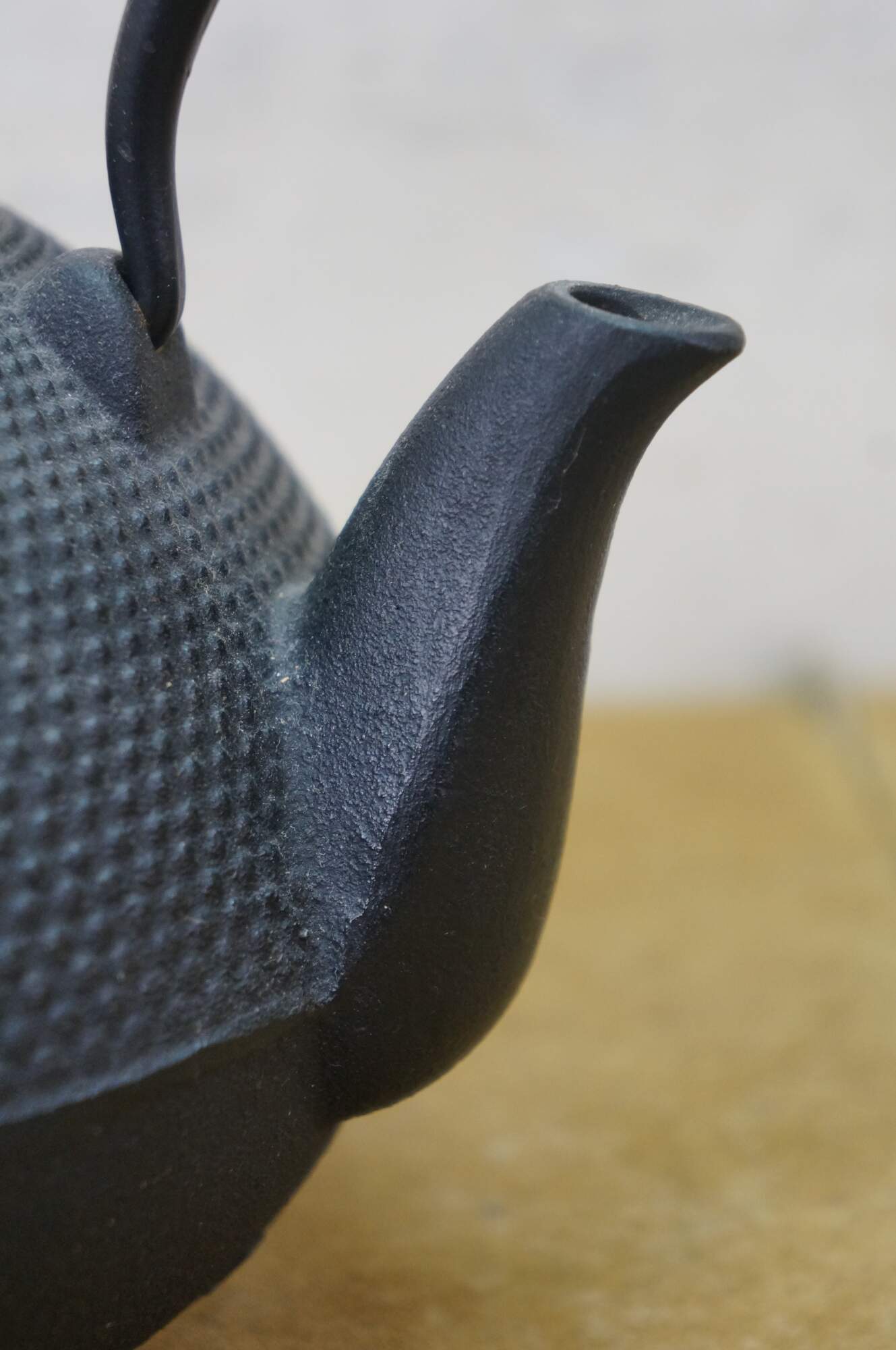 Vintage Japanese black cast iron Arare / hobnail pattern teapots / kettles, known as tetsubin or Nambu tekki. Tetsubin pots are traditionally used for boiling water and are prized for their durability and craftsmanship. The cast iron material helps keep water heated for longer periods than other materials. Water boiled in these kettles can release dissolved iron, which may help prevent anemia and enhances the flavor of green tea.