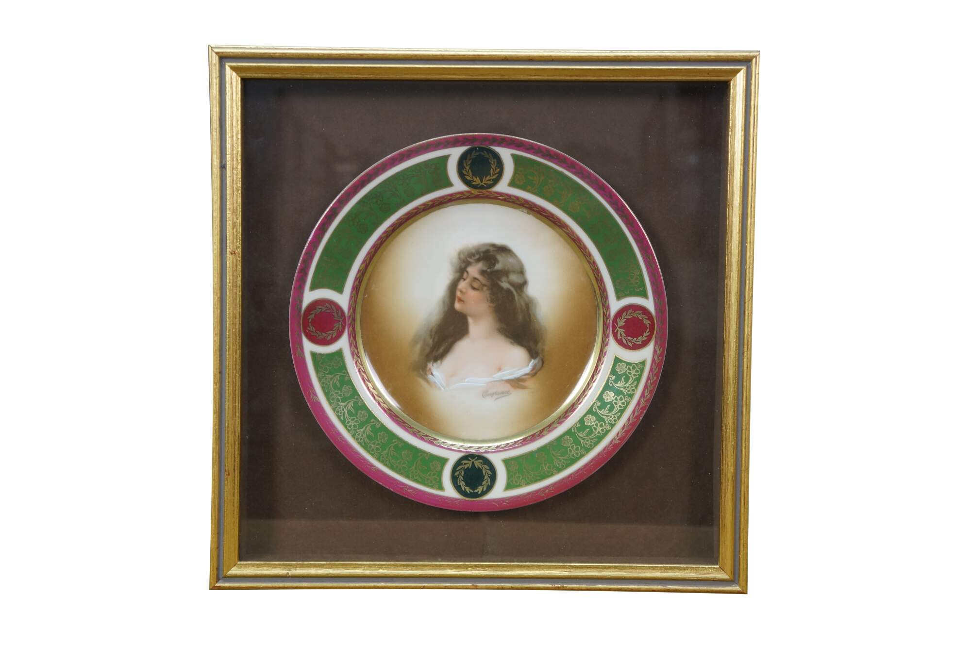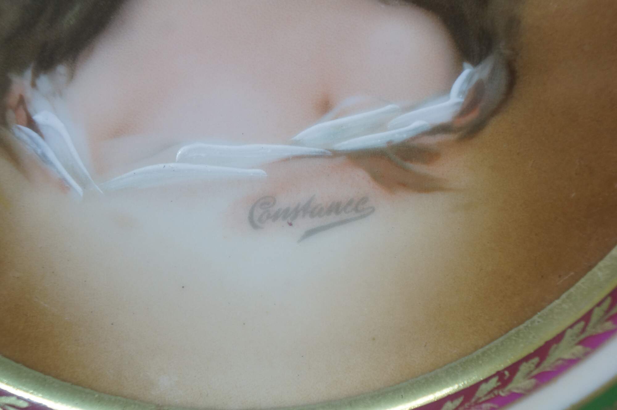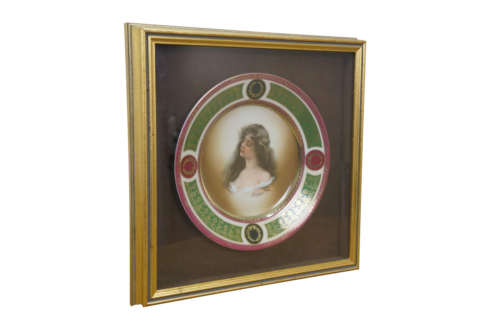 Antique Austrian Royal Vienna hand-painted porcelain portrait plate framed in a gilt shadowbox curio display frame. Features a central portrait of a woman named Constance, surrounded by a red and green border with Neoclassical / Art Nouveau gilt gold floral motifs.
