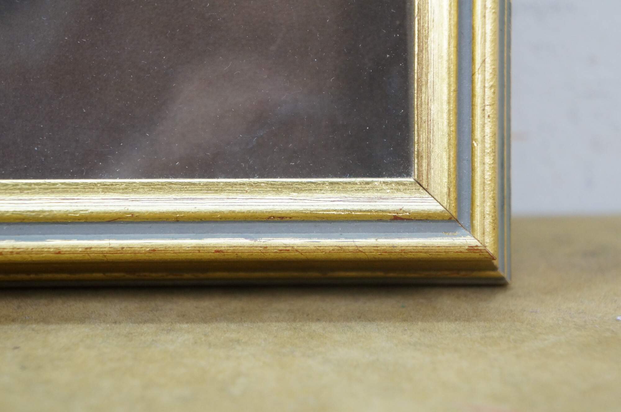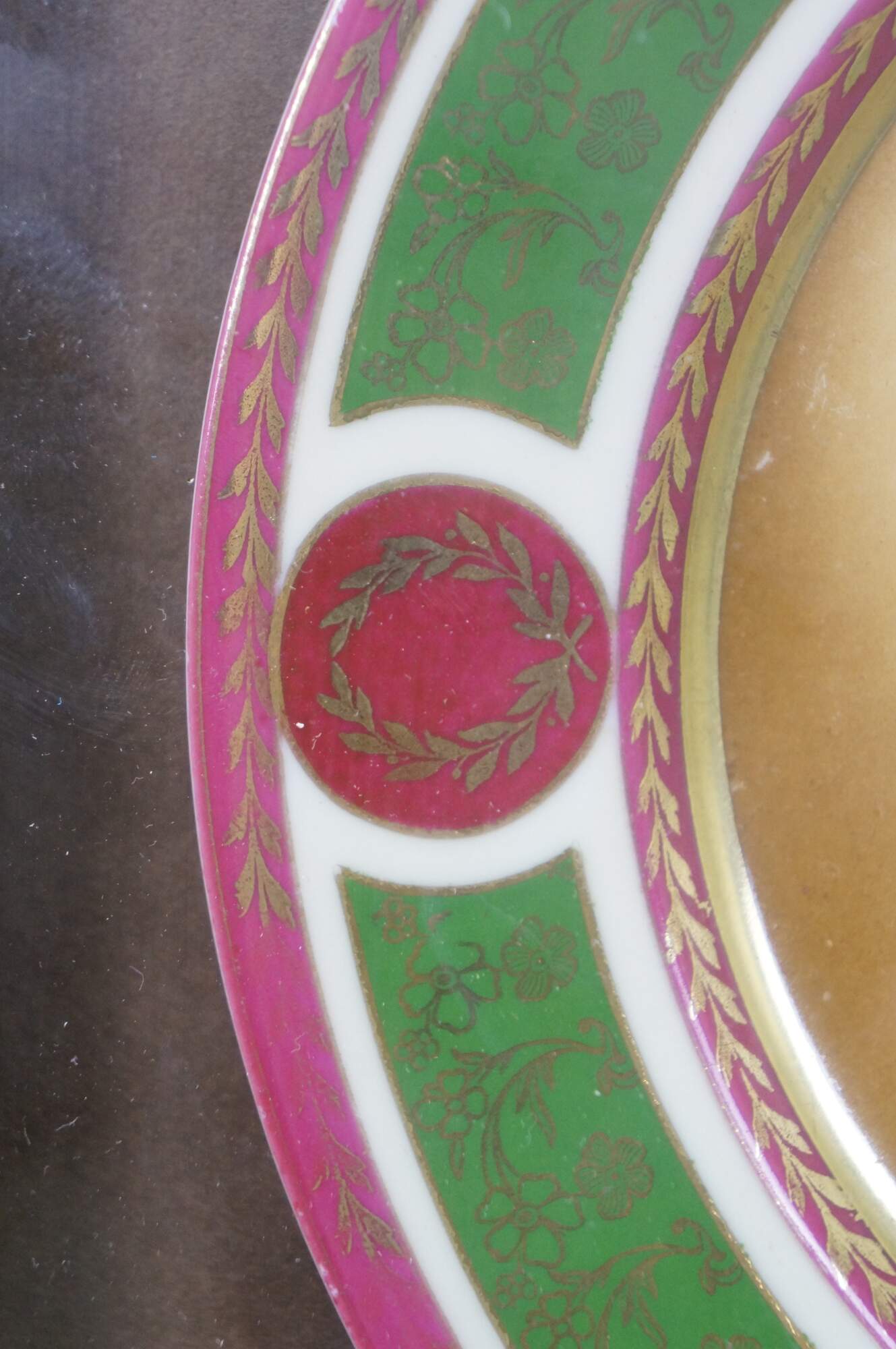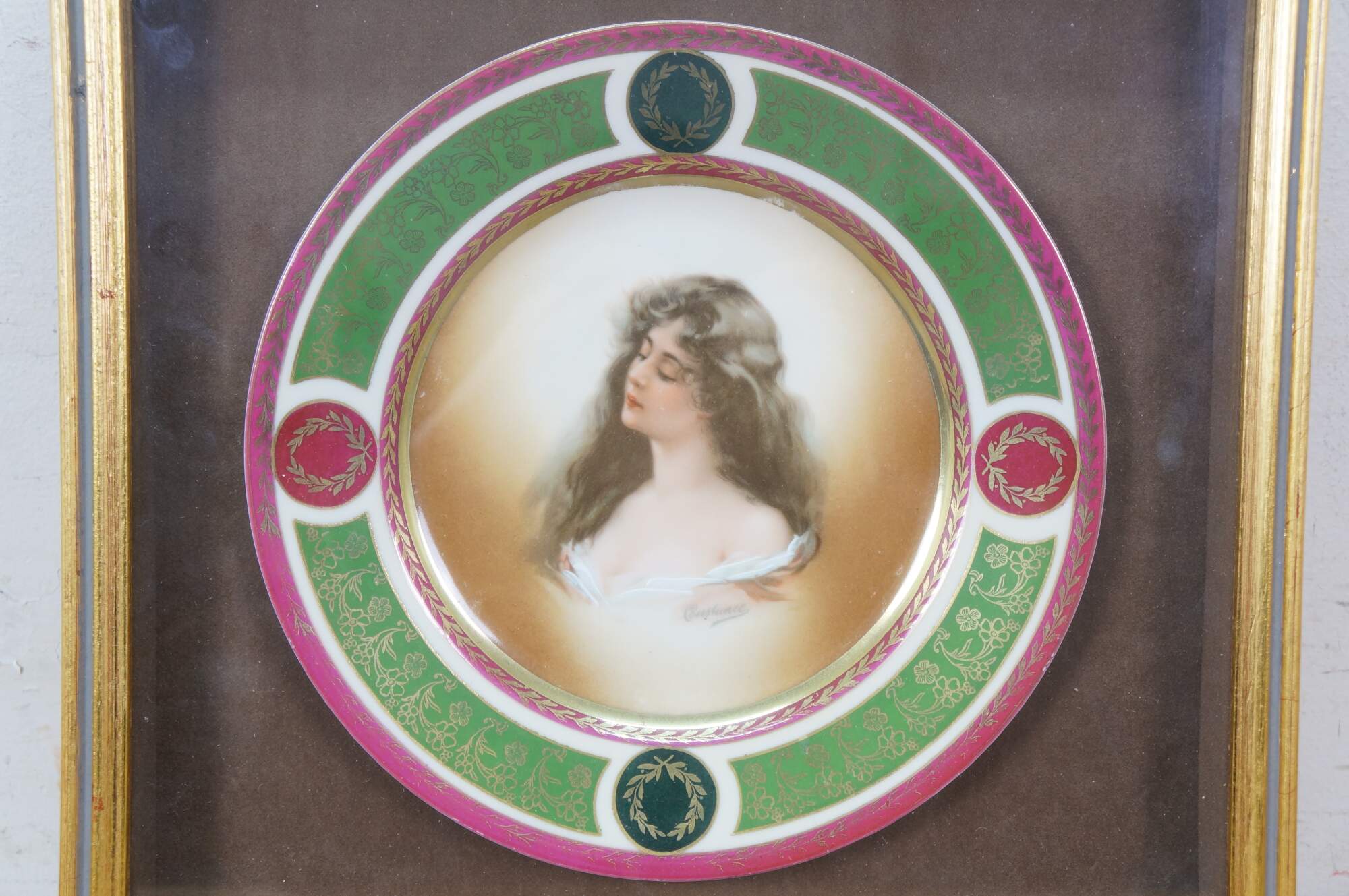 Antique Austrian Royal Vienna hand-painted porcelain portrait plate framed in a gilt shadowbox curio display frame. Features a central portrait of a woman named Constance, surrounded by a red and green border with Neoclassical / Art Nouveau gilt gold floral motifs.