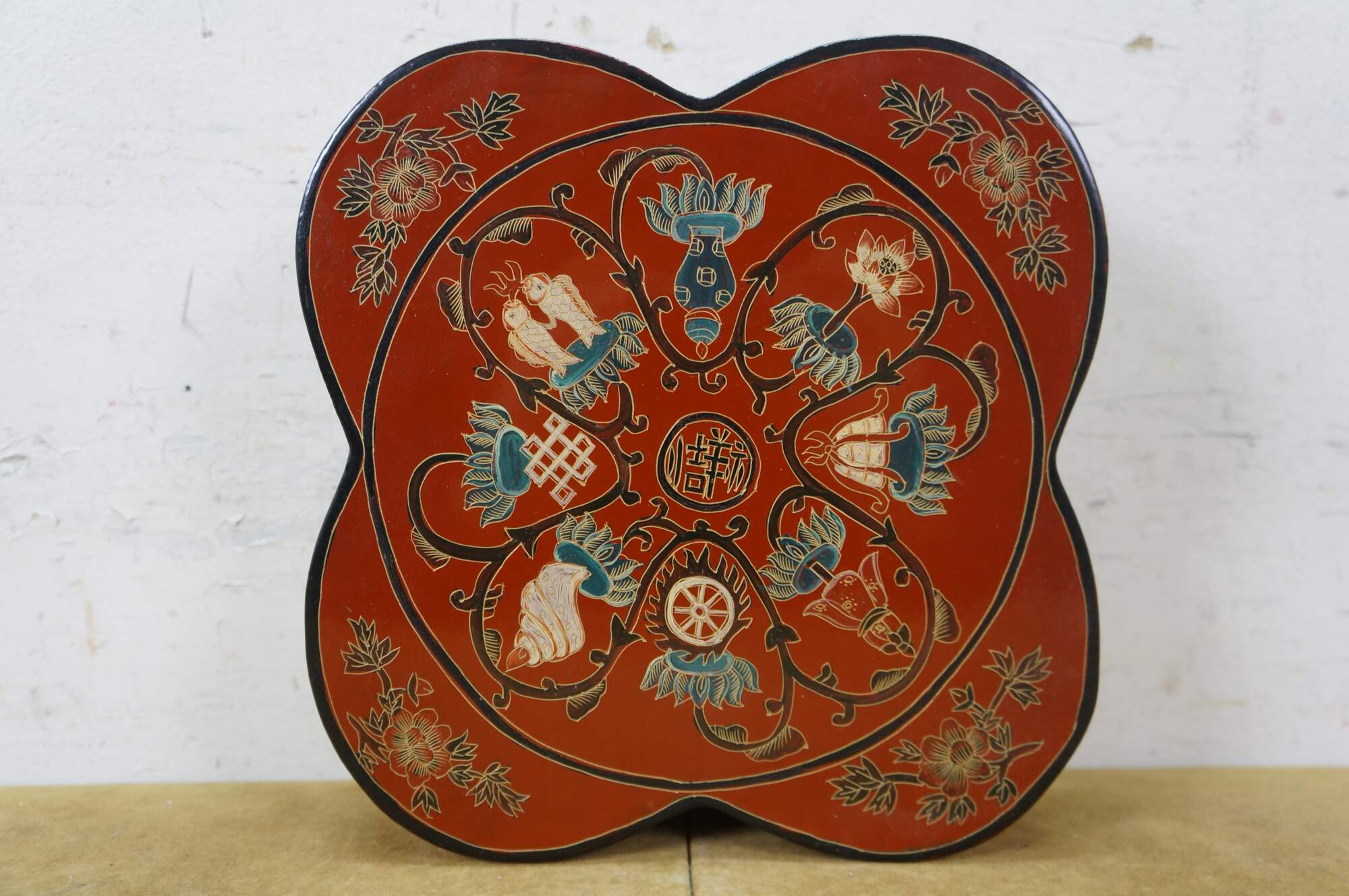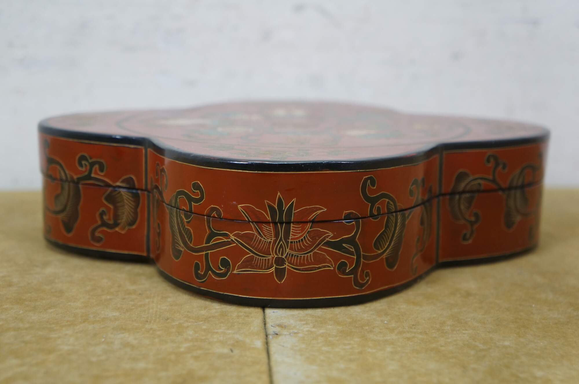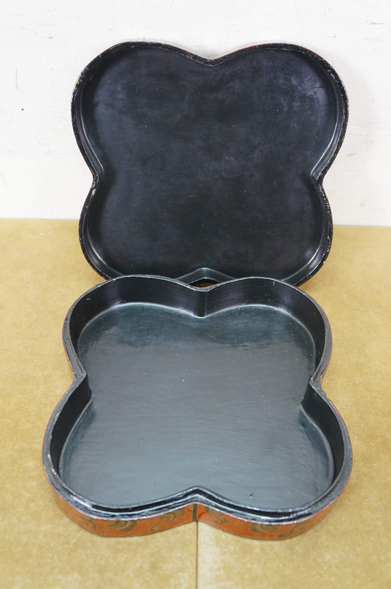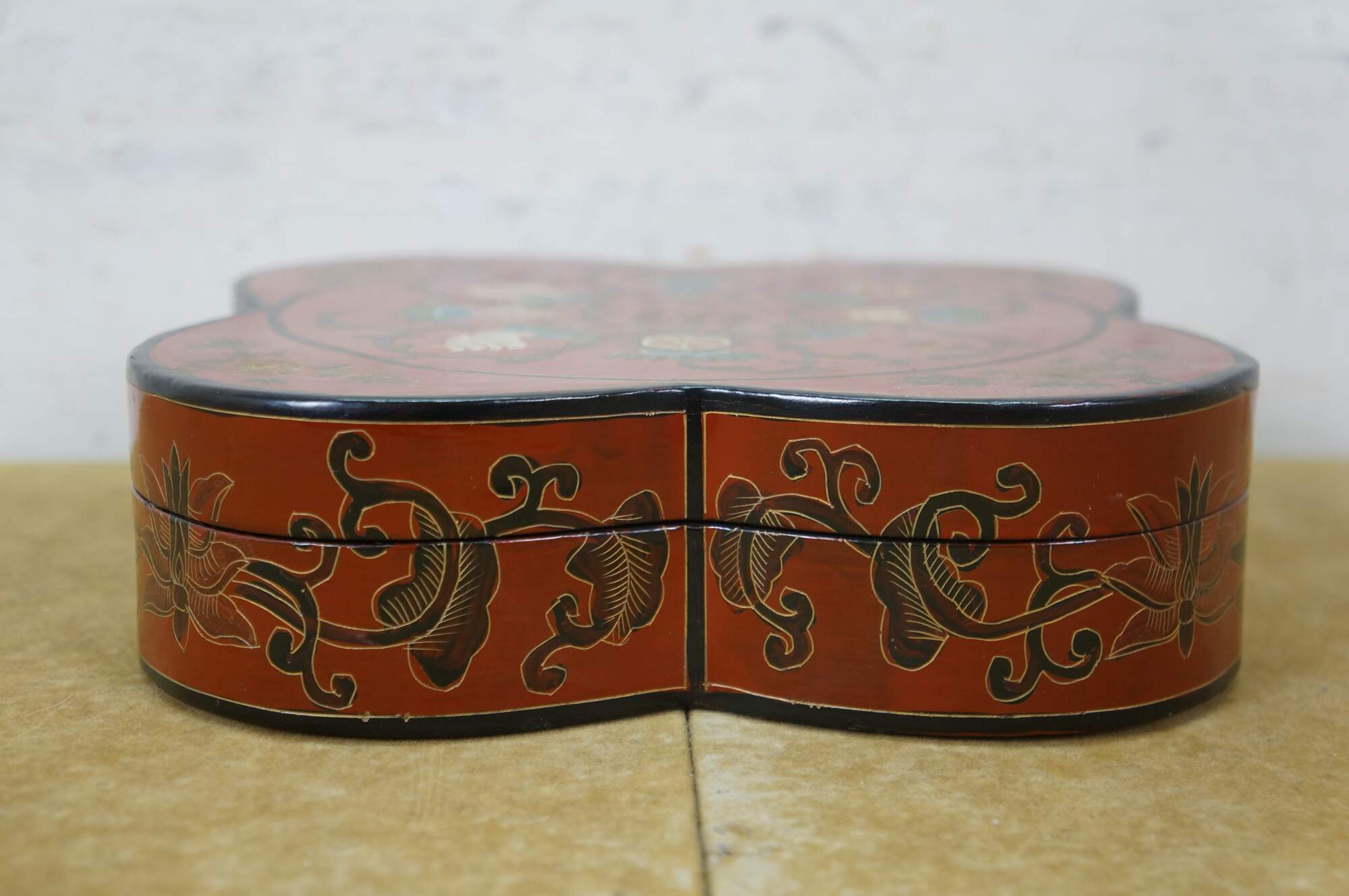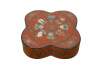 Vintage Chinese red and black lacquered four petal / clover shaped trinket keepsake box / case featuring the Eight Treasures pattern.