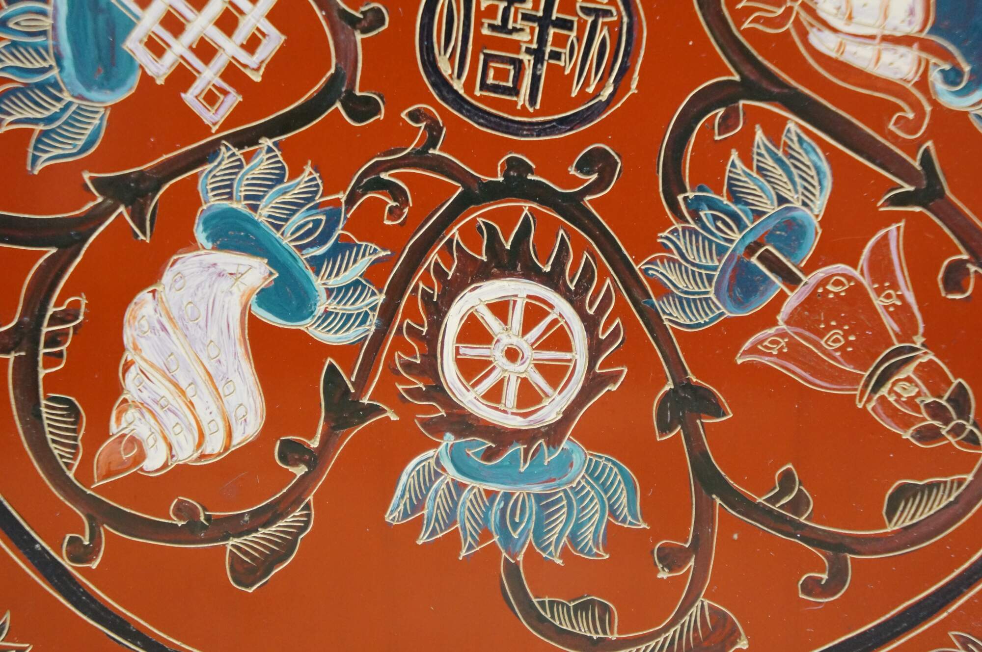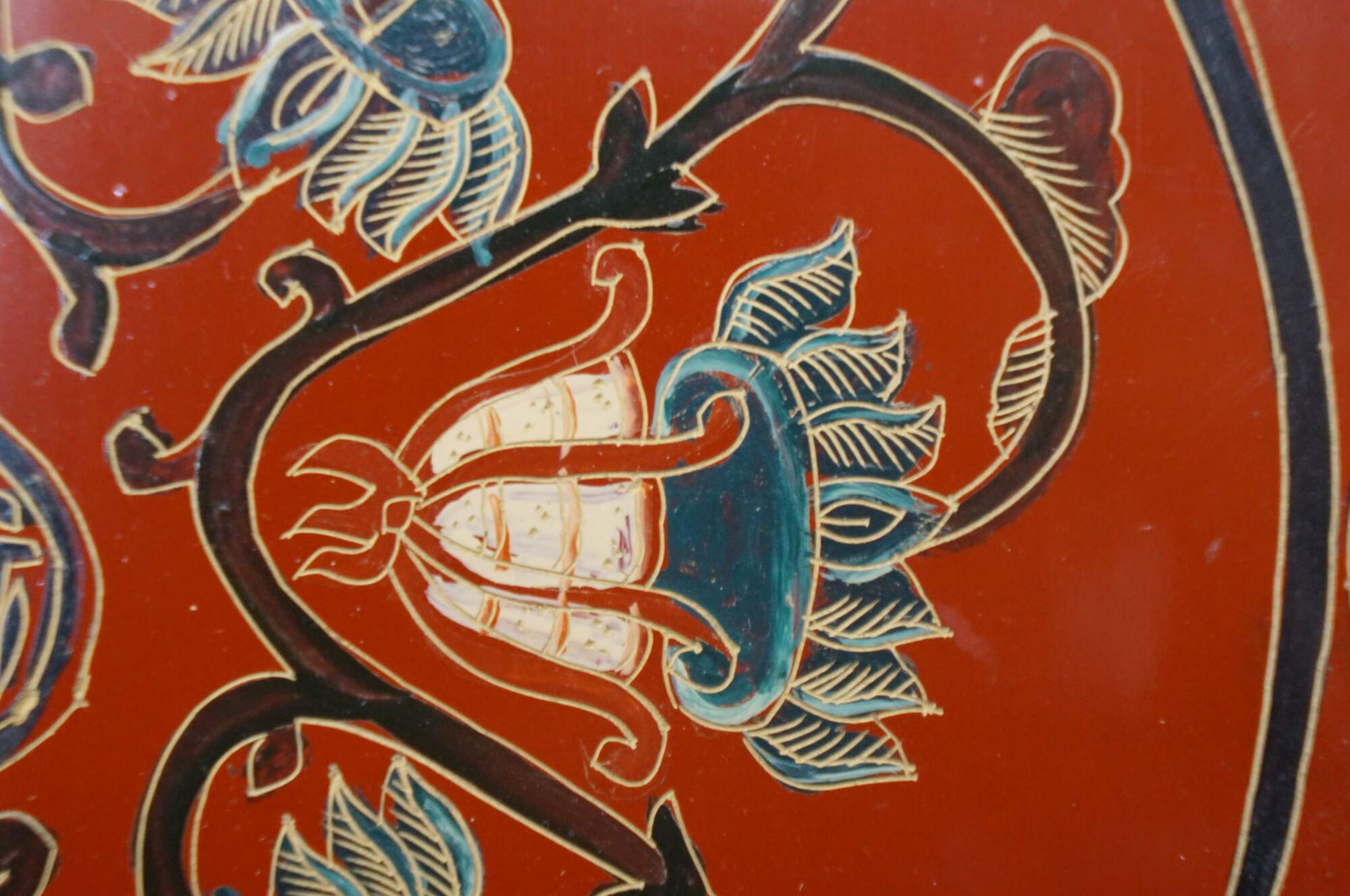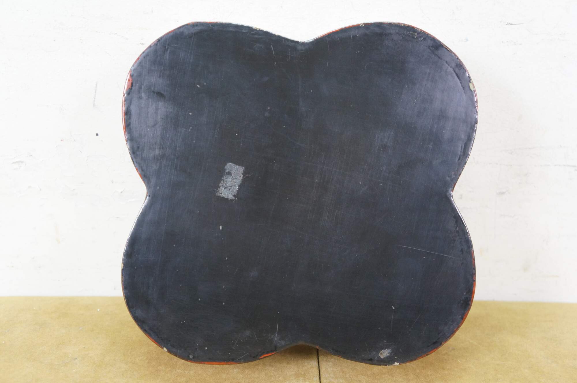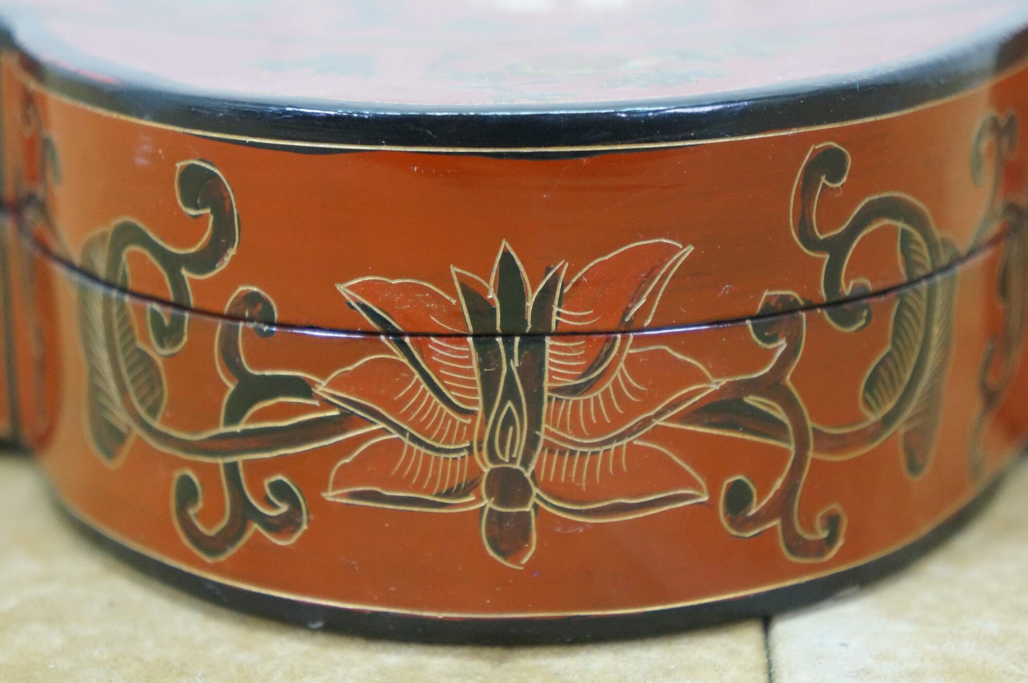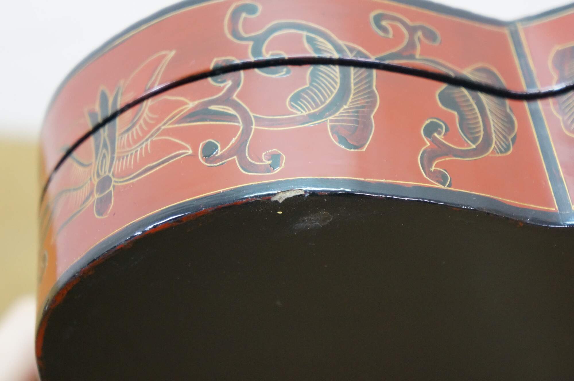 Vintage Chinese red and black lacquered four petal / clover shaped trinket keepsake box / case featuring the Eight Treasures pattern.
