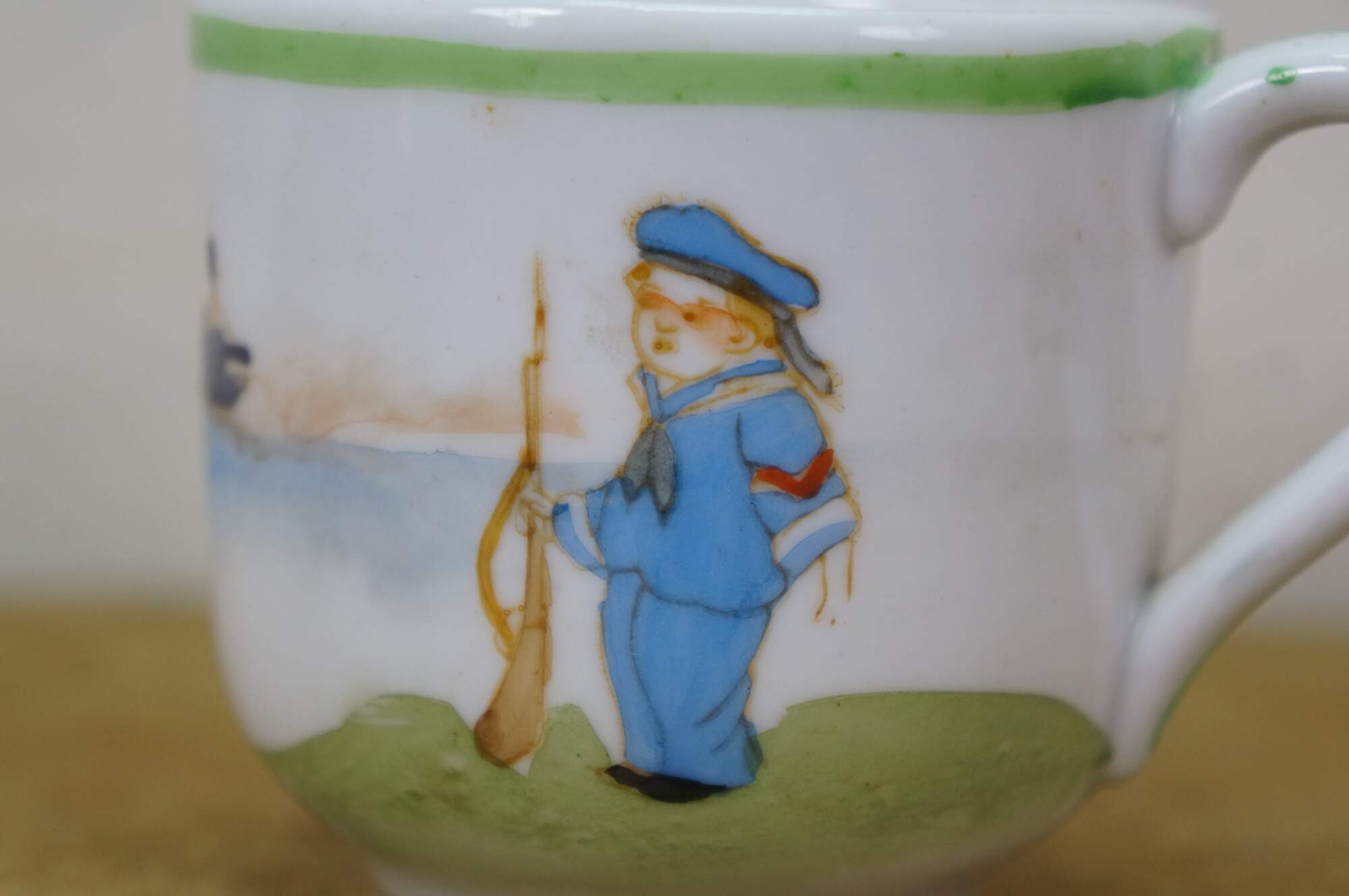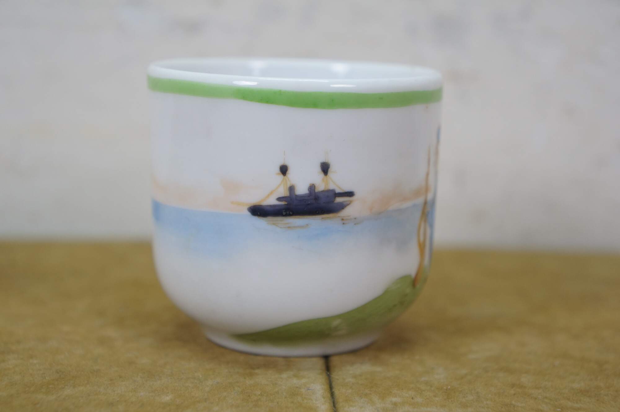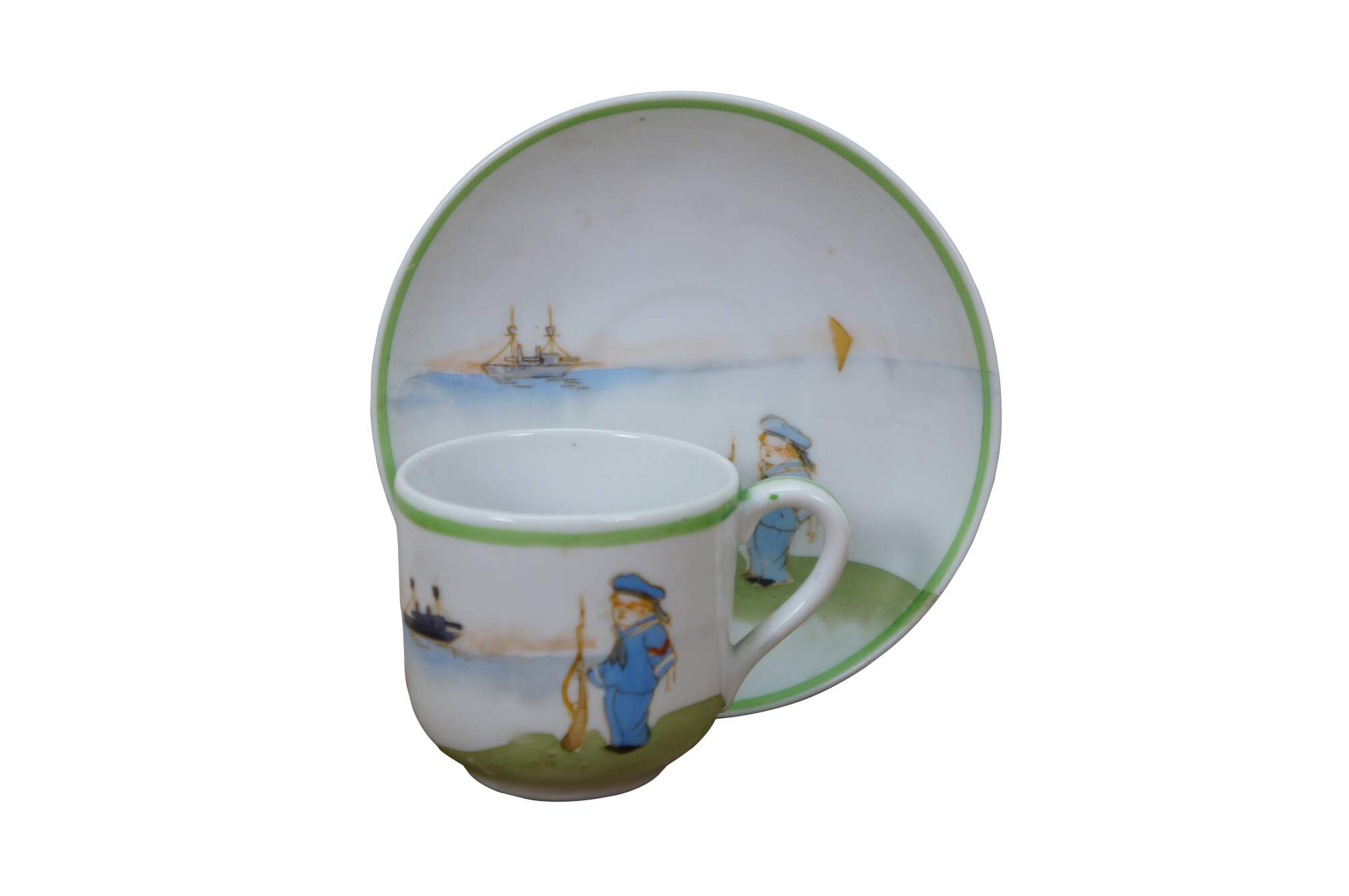 Antique tea cup and saucer featuring a hand-painted WWI-era nautical maritime sailor boy saluting a passing military ship. Produced in Japan by Noritake circa 1911 - 1921.