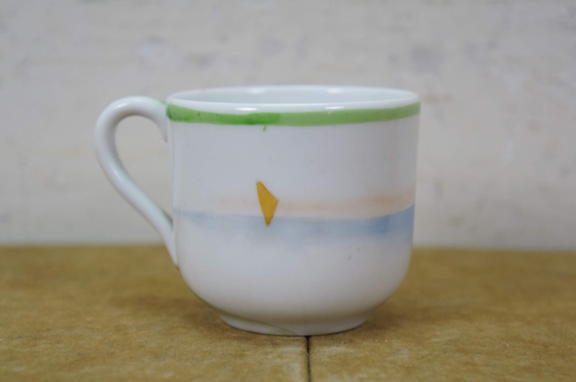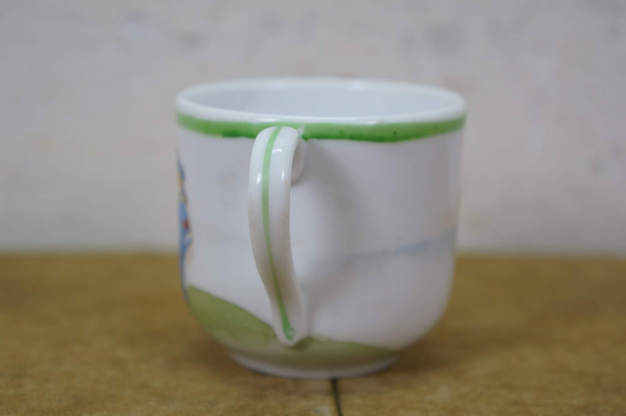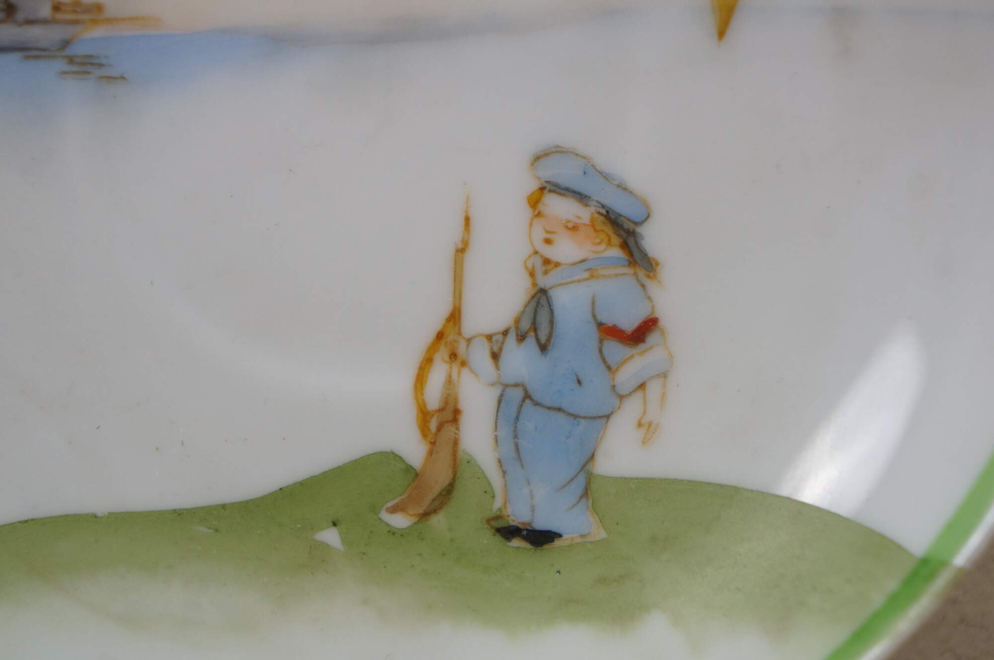 Antique tea cup and saucer featuring a hand-painted WWI-era nautical maritime sailor boy saluting a passing military ship. Produced in Japan by Noritake circa 1911 - 1921.