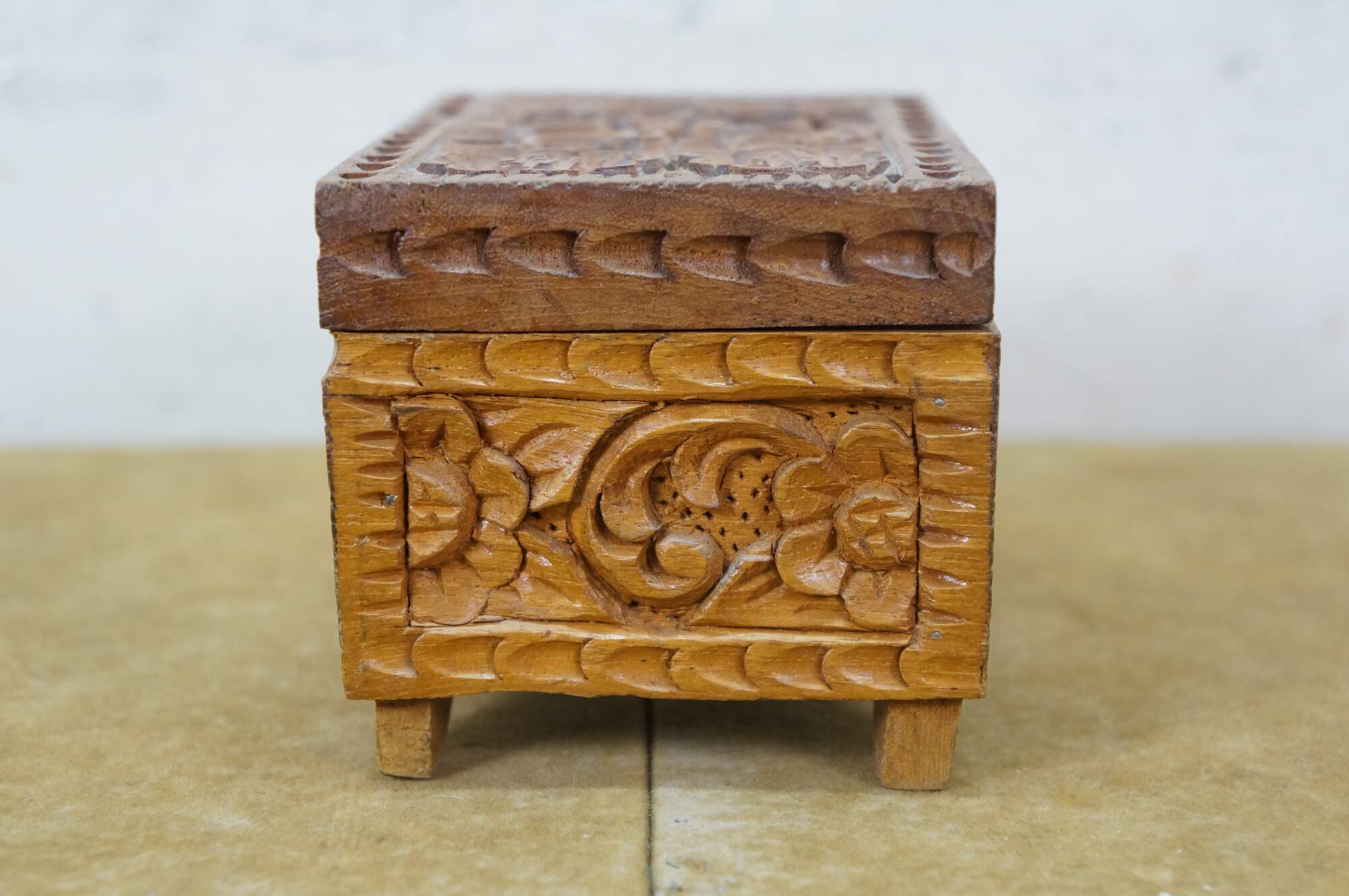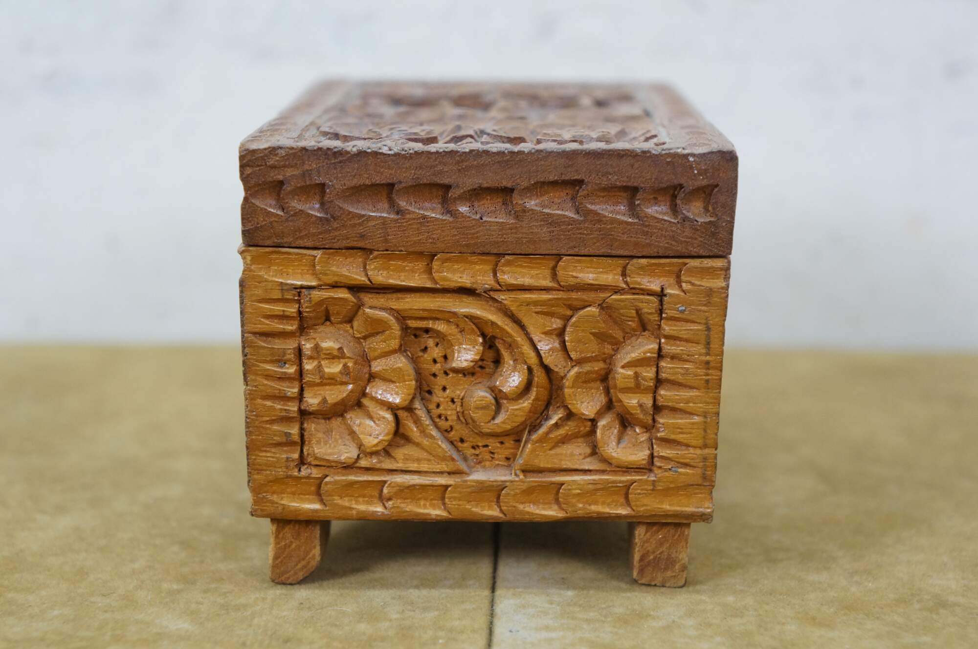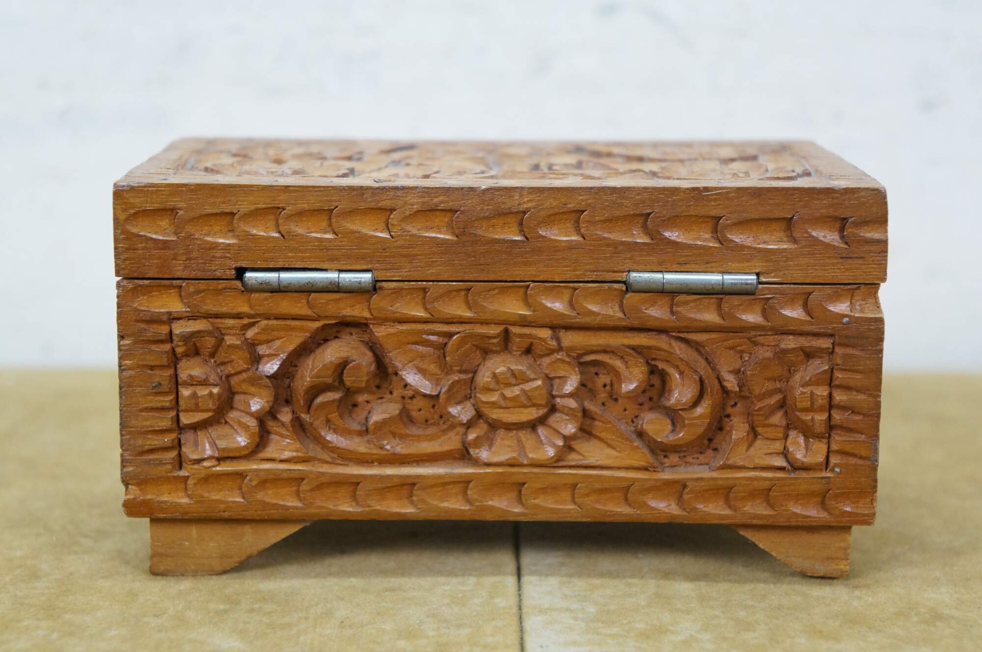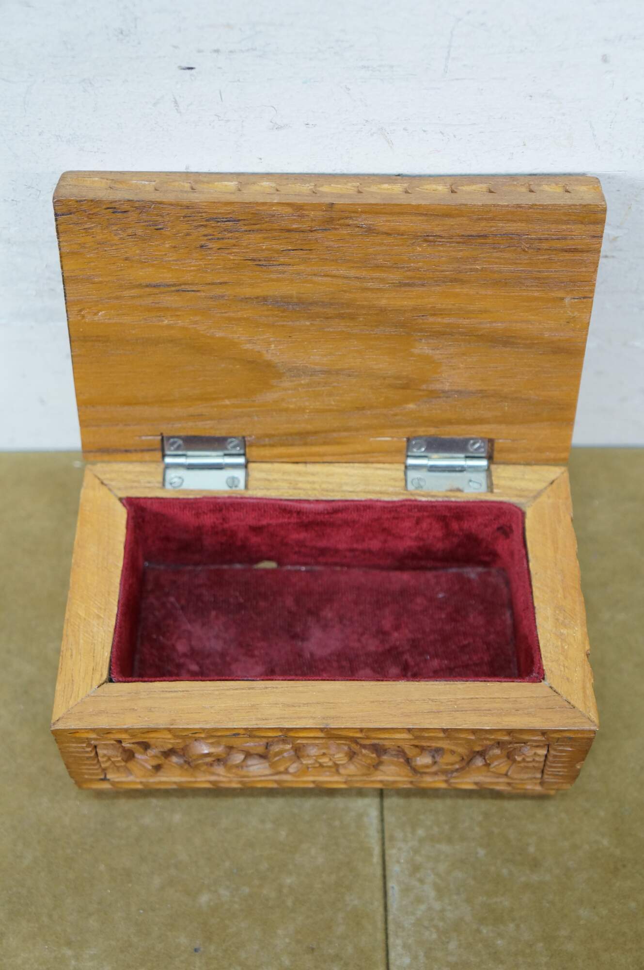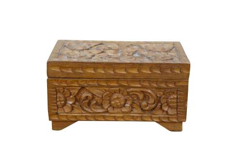 Vintage hand carved wooden jewelry / trinket / valet / treasure box featuring floral acanthus design with red velvet interior.