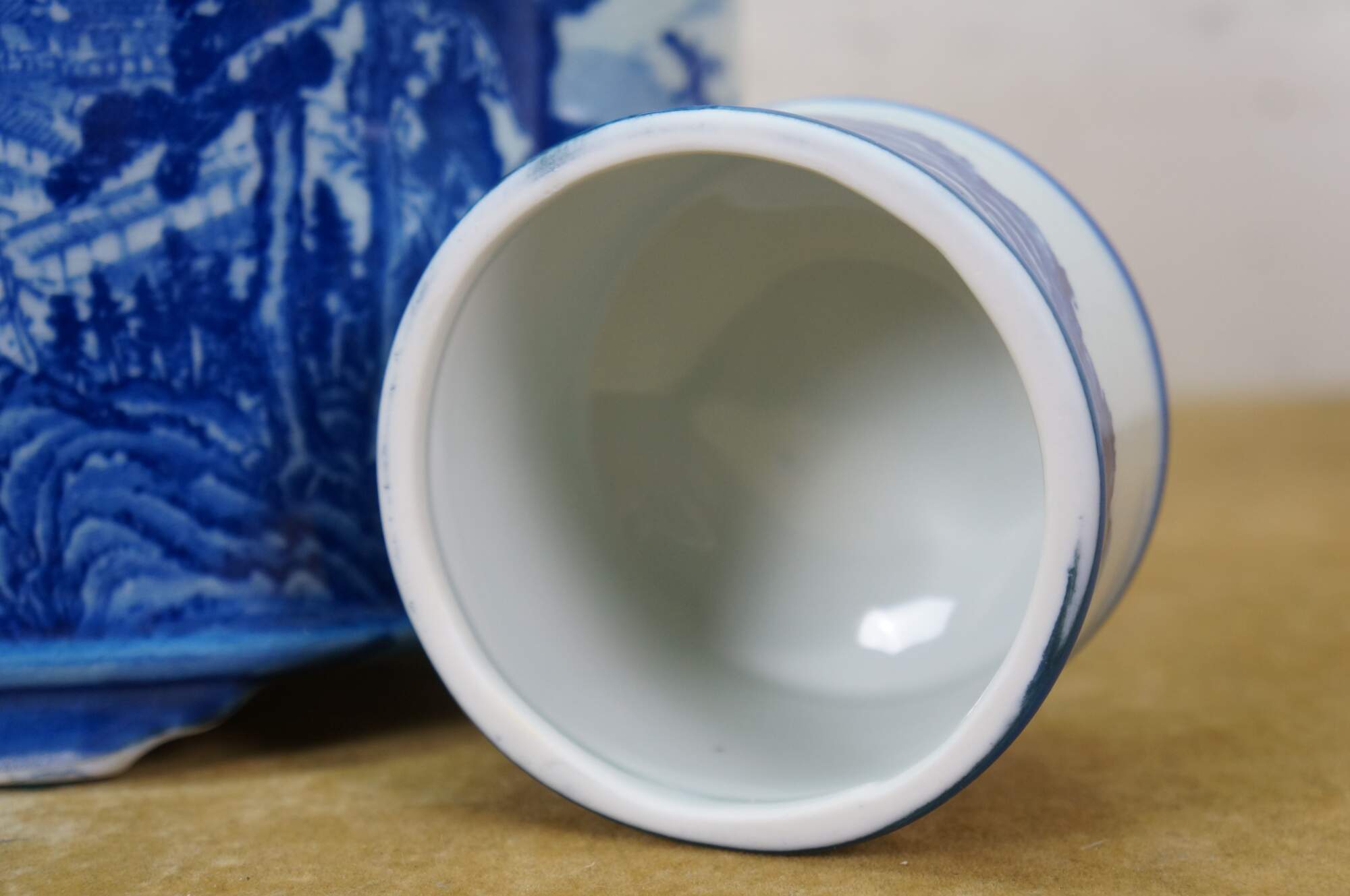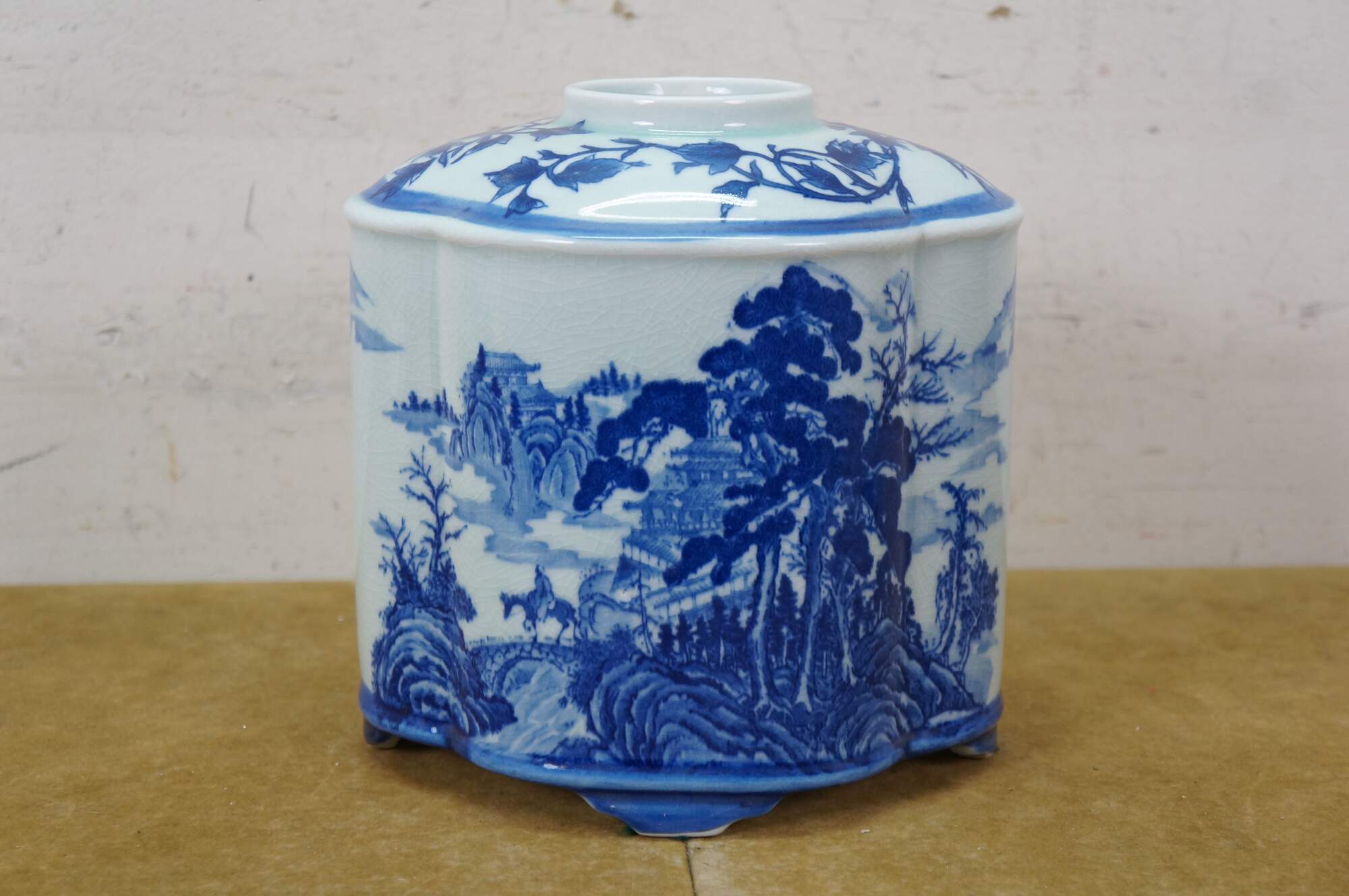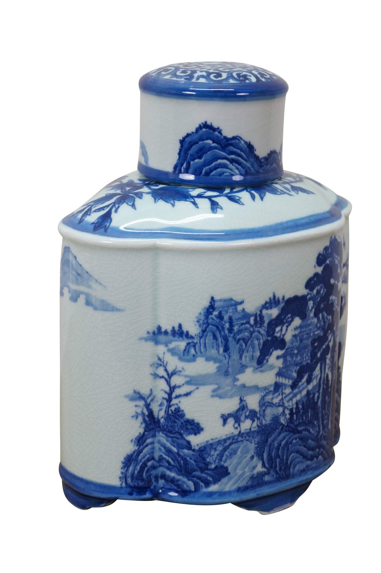 Large antique Chinese export blue and white porcelain tea caddy / ginger jar / decanter featuring hand-painted mountain landscape scene with Pagodas and a figure on a horse or donkey.