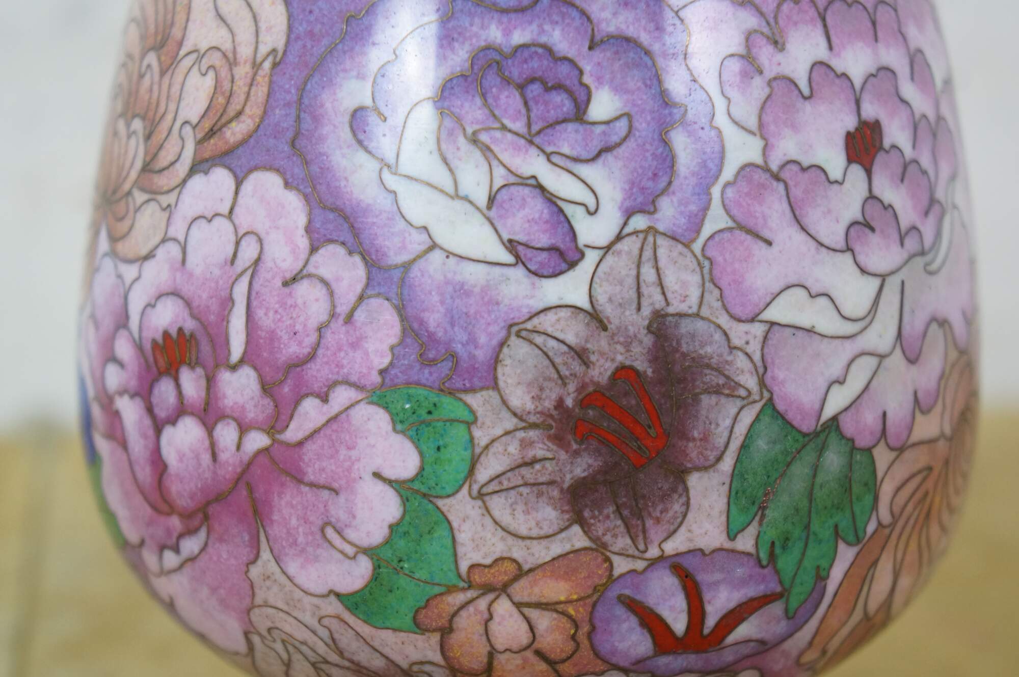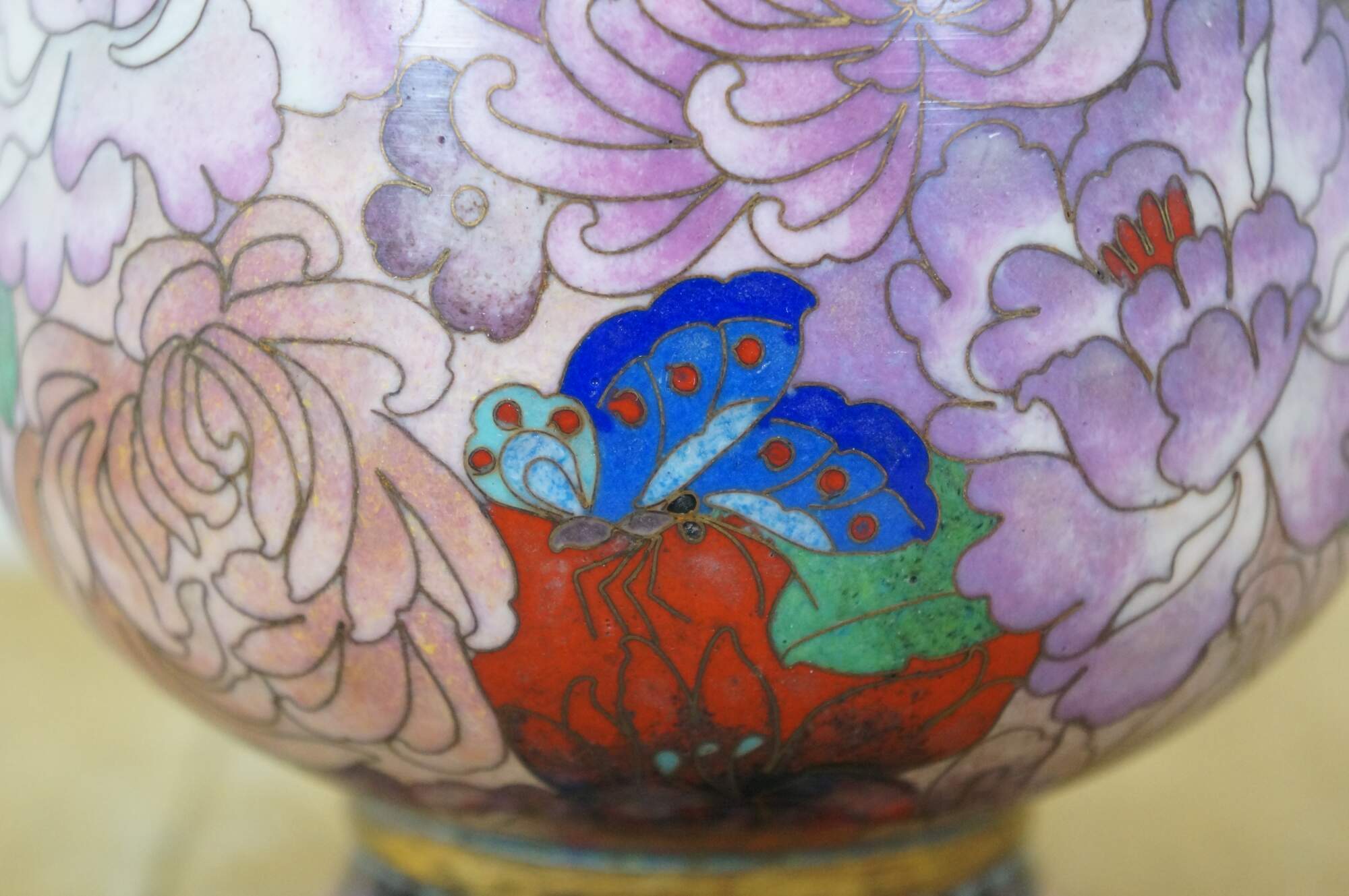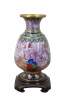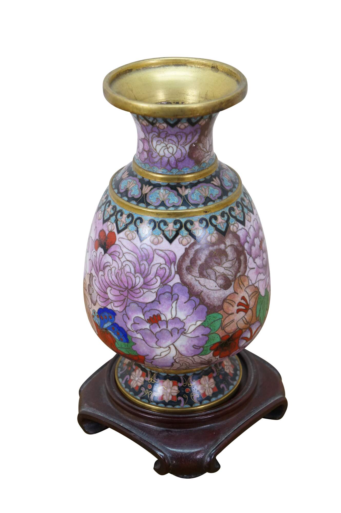 Vintage Chinese cloisonné enamel vase with a chrysanthemum, butterfly and tulip motif. Includes wooden stand.
