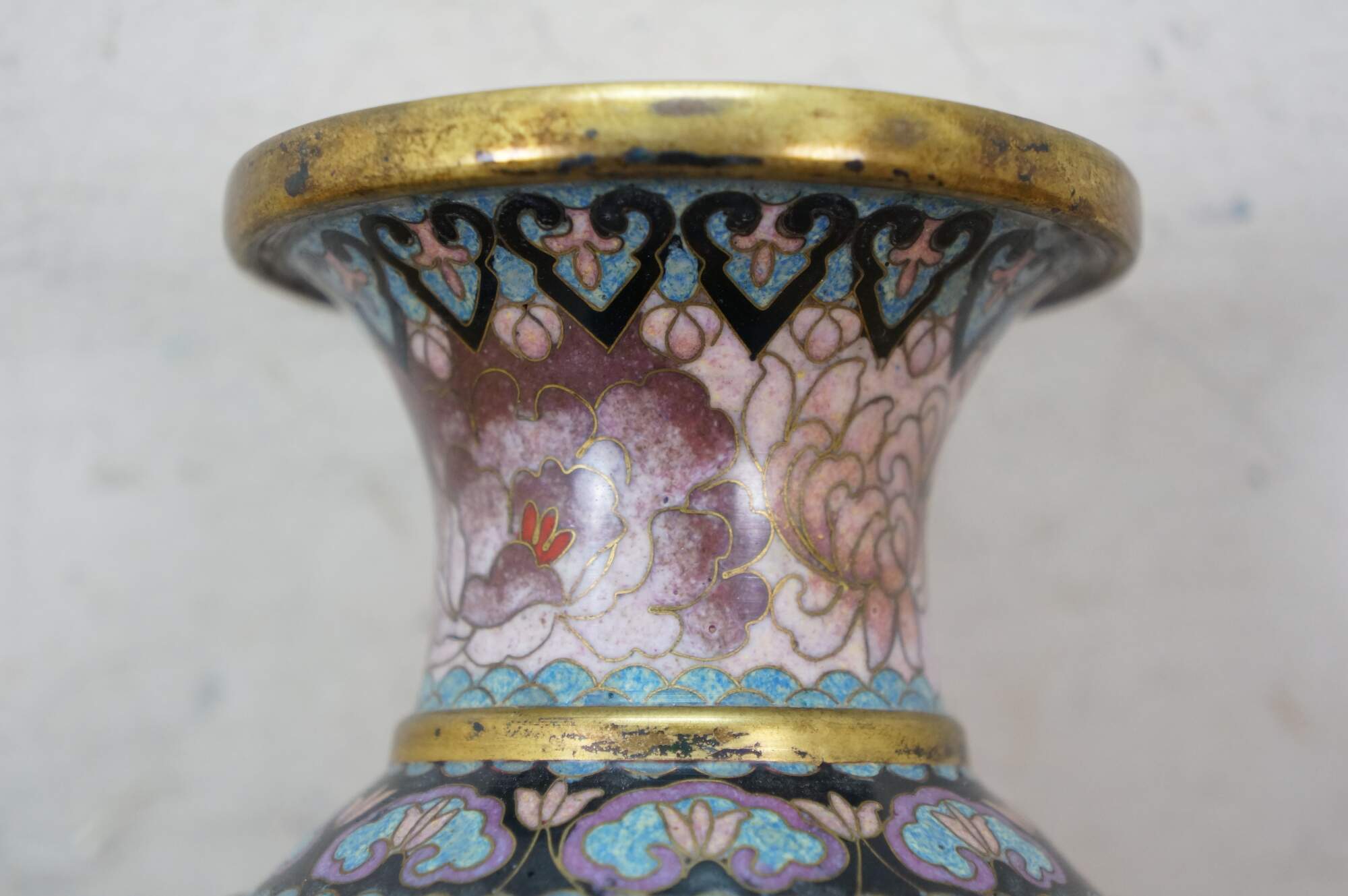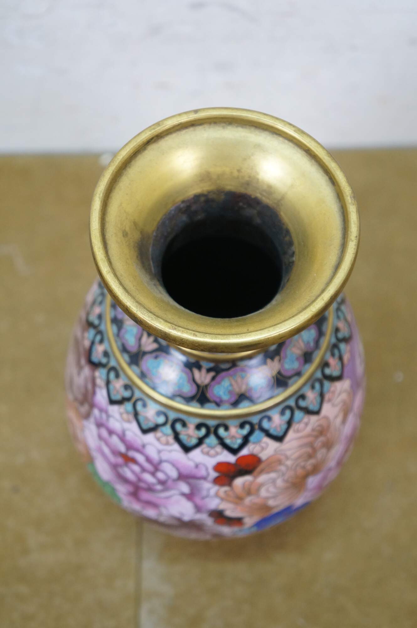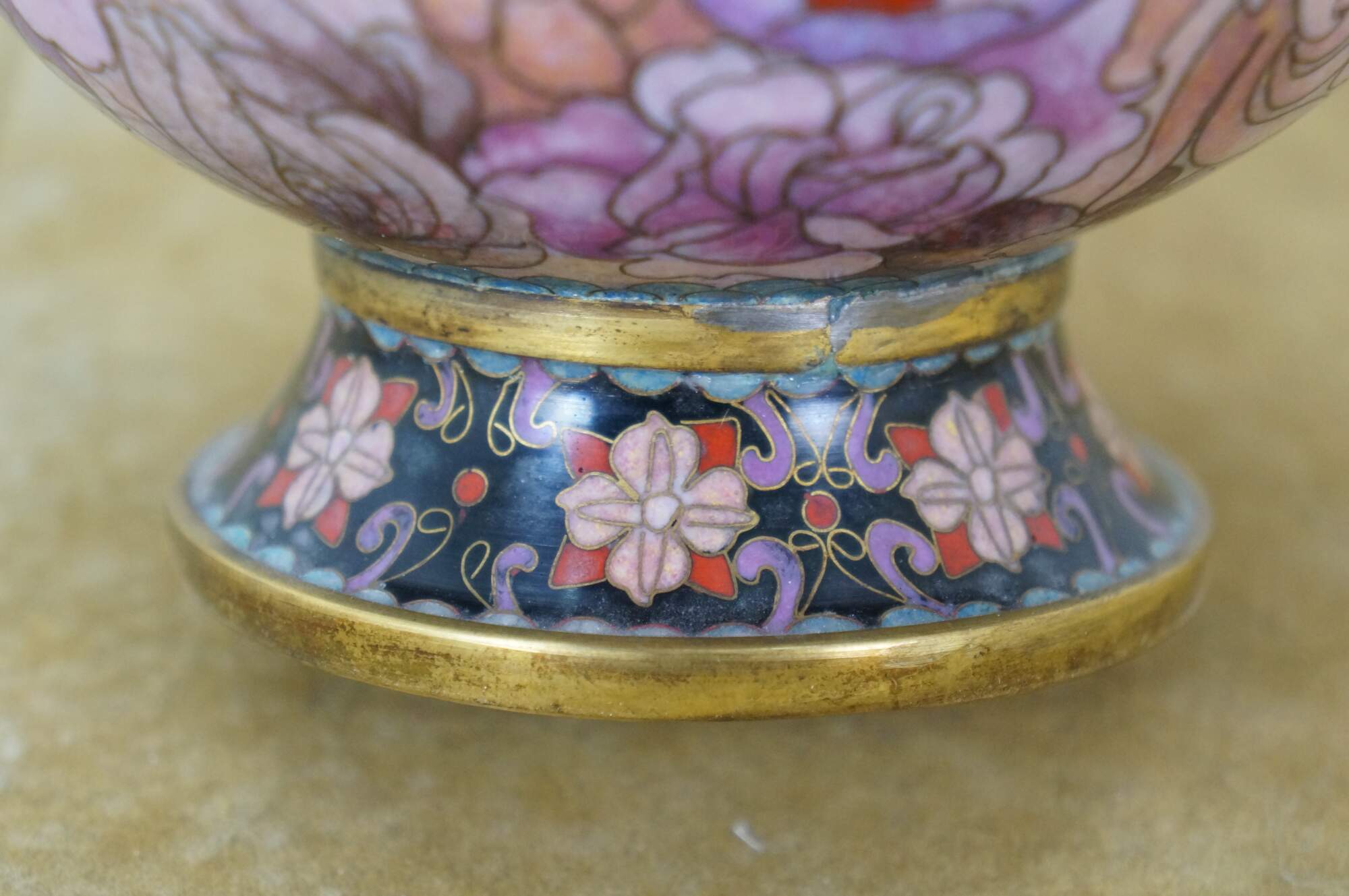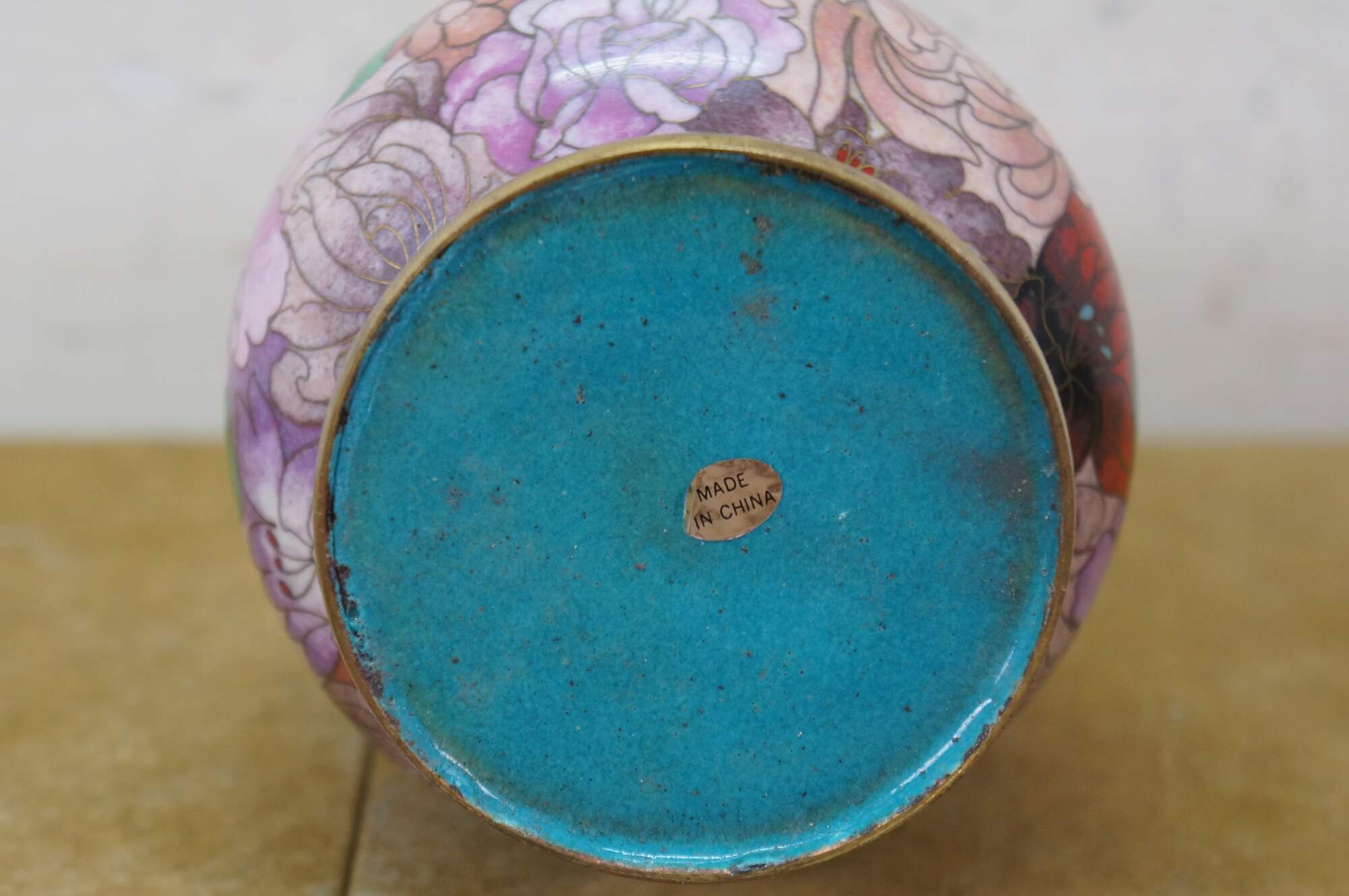 Vintage Chinese cloisonné enamel vase with a chrysanthemum, butterfly and tulip motif. Includes wooden stand.