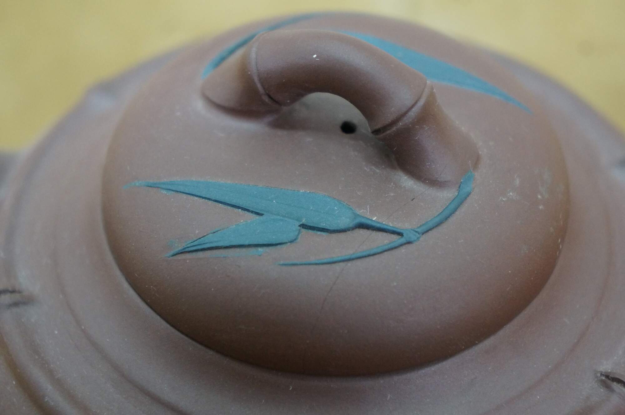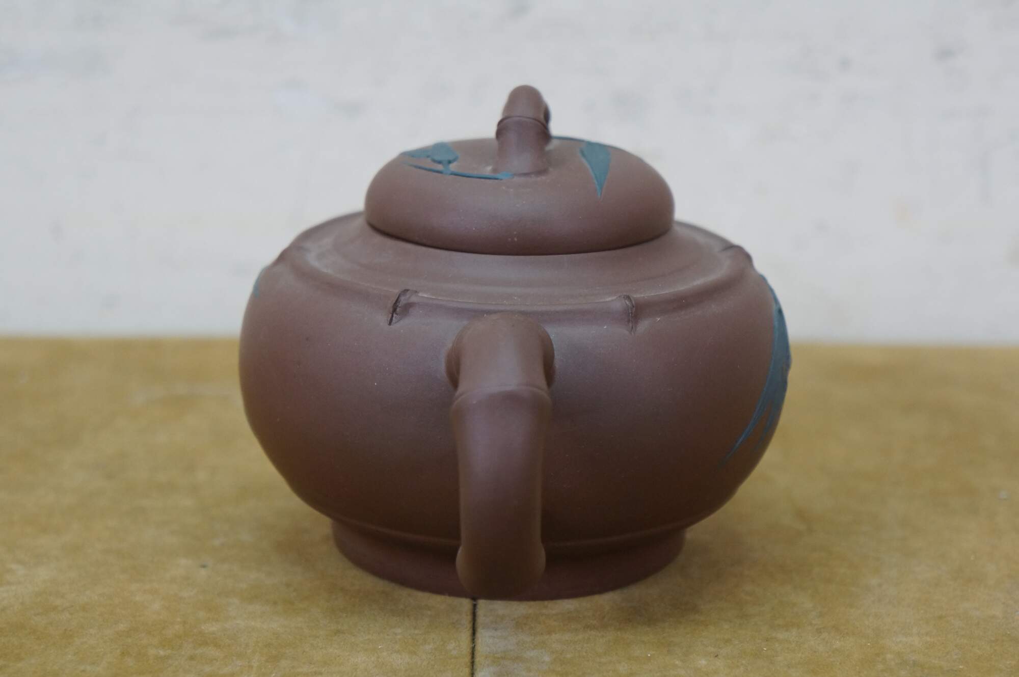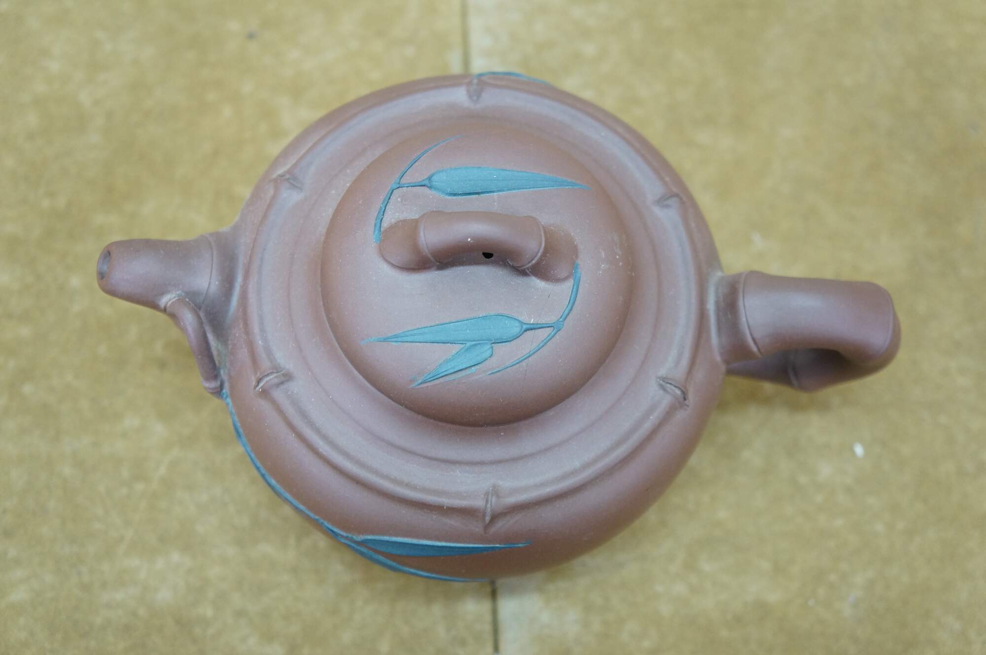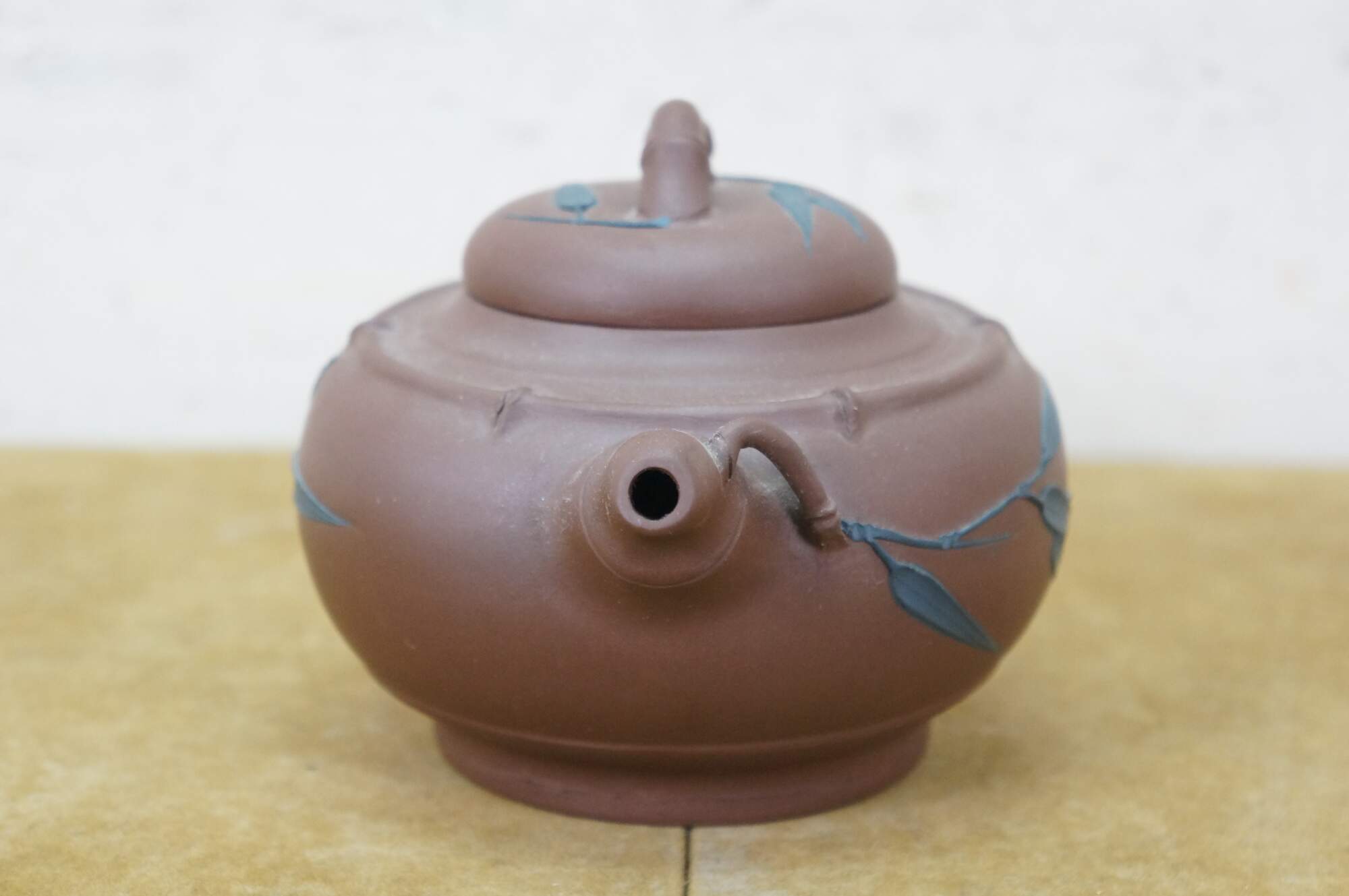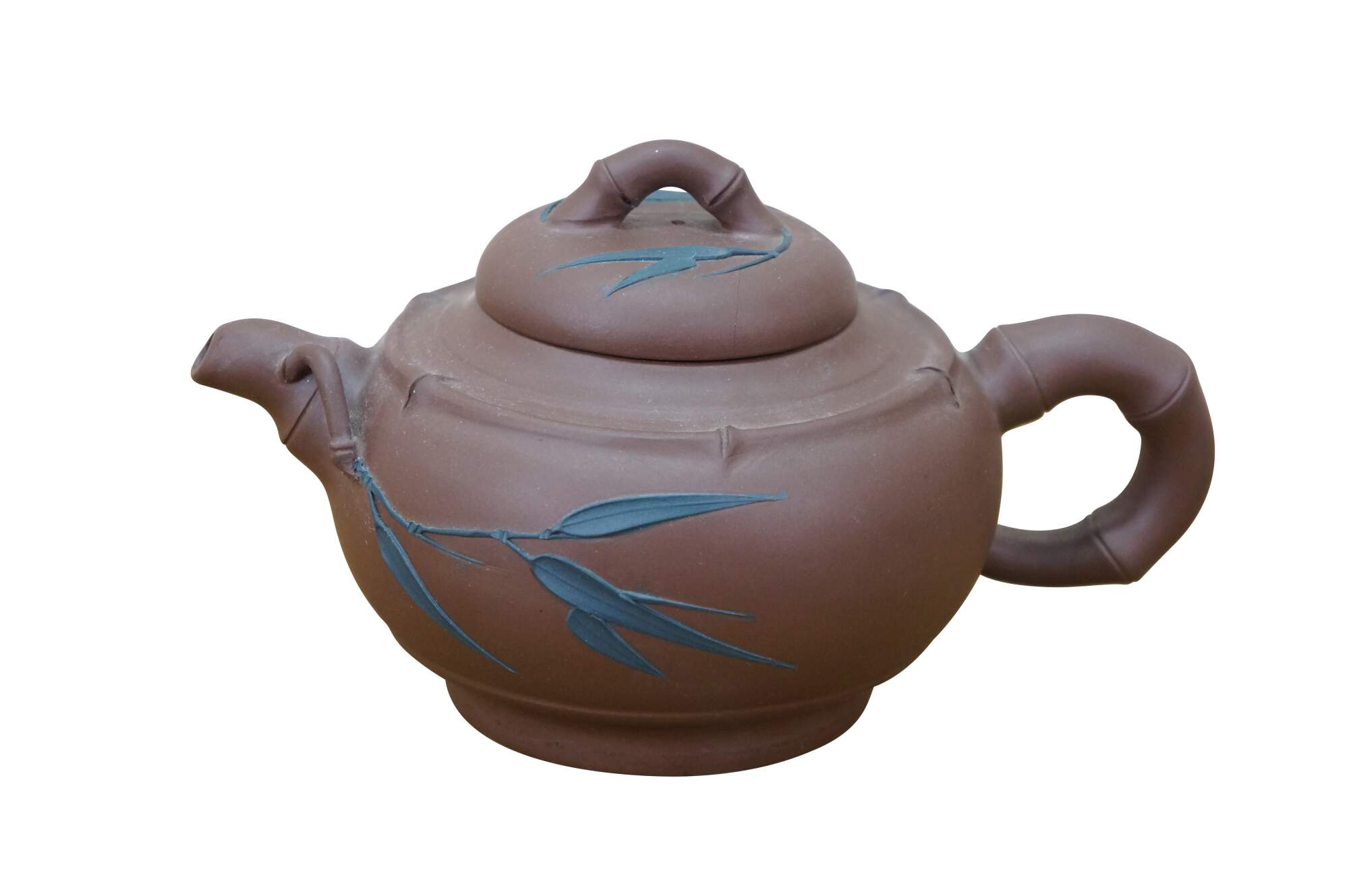 Vintage Chinese Yixing clay tea / coffee pot with a bamboo leaf motif. It is made from purple clay (zisha), a type of unglazed, porous earthenware from the Yixing region of China. The handle and spout are shaped like bamboo branches, and there are carved/applied blue bamboo leaves on the body and lid.