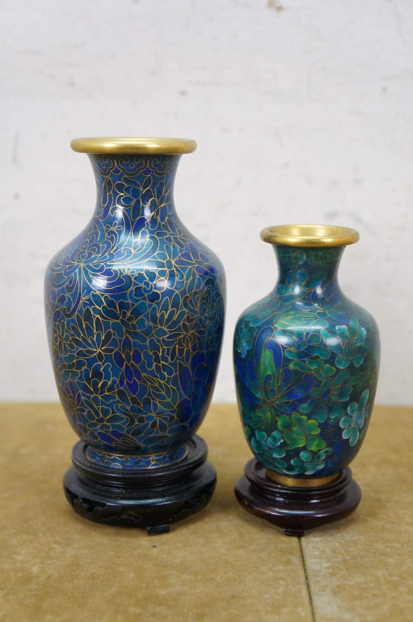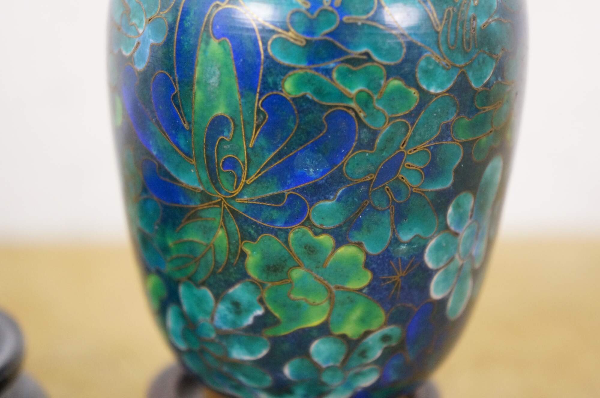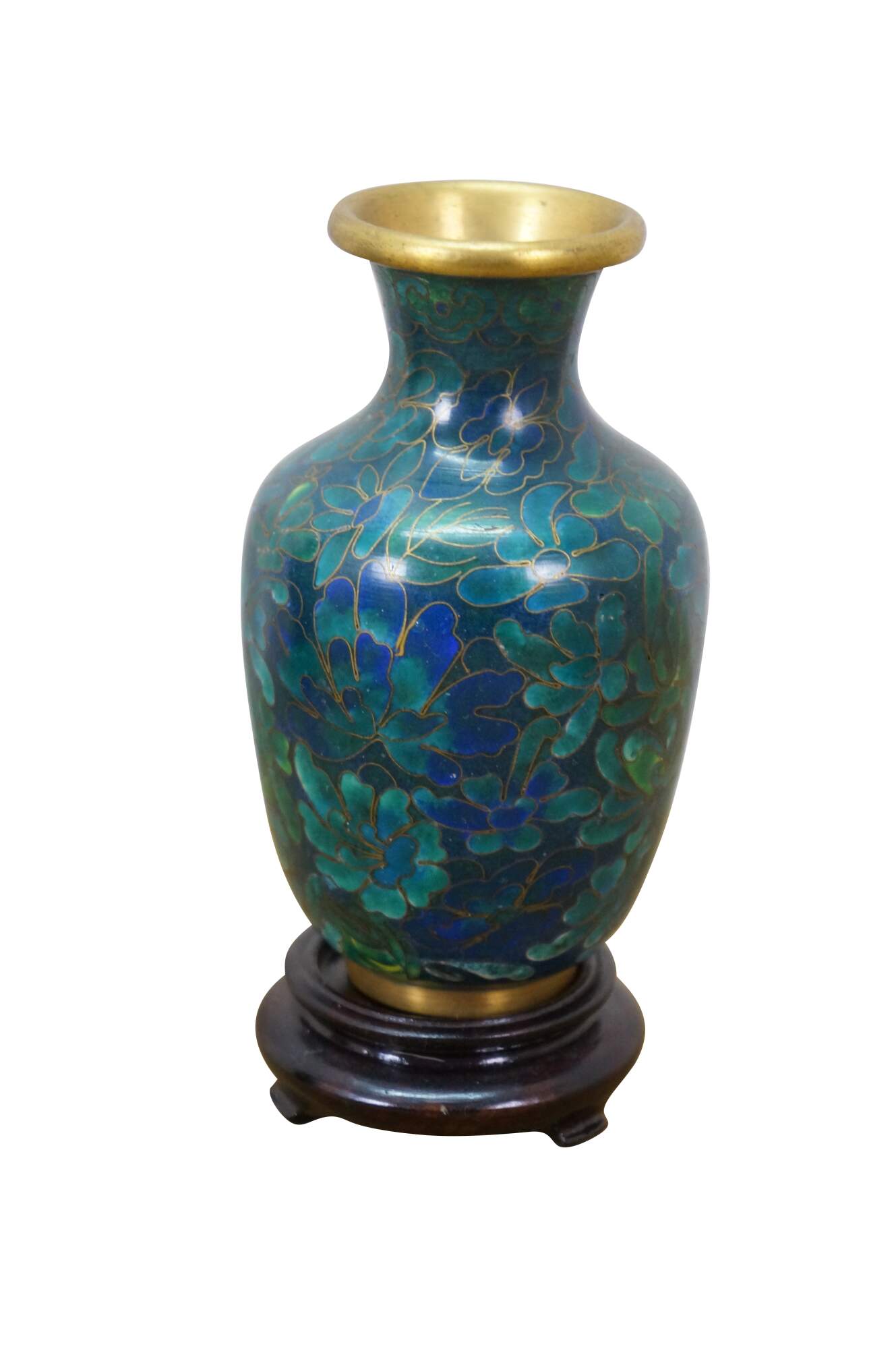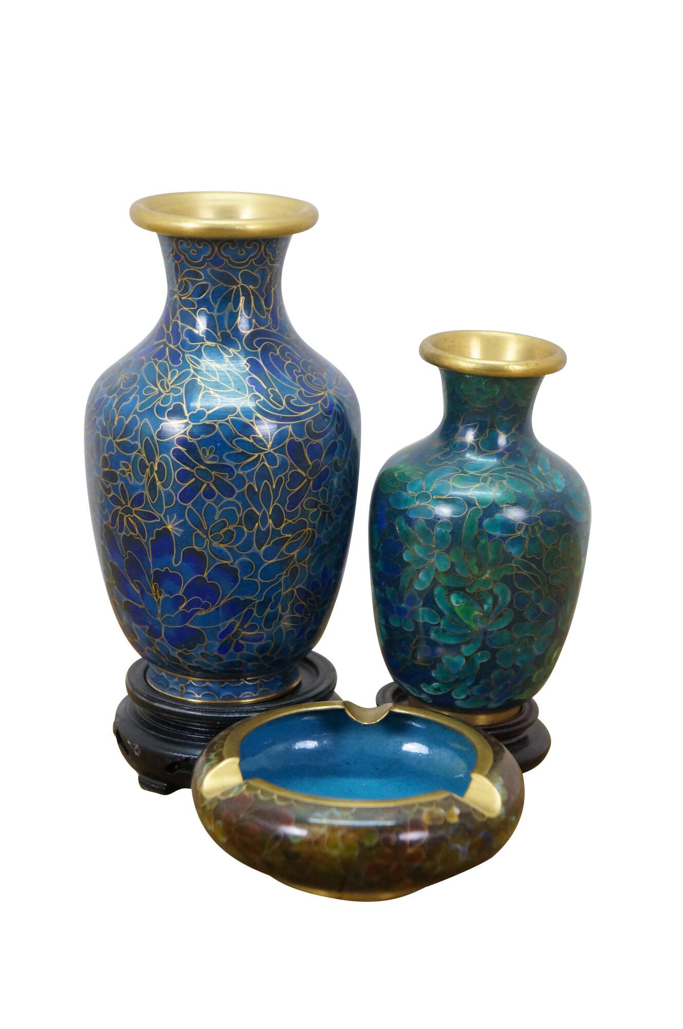 Vintage Chinese cloisonné enamel baluster bud vases and ashtray featuring turquoise / cobalt blue and green floral designs. Each piece includes a base.