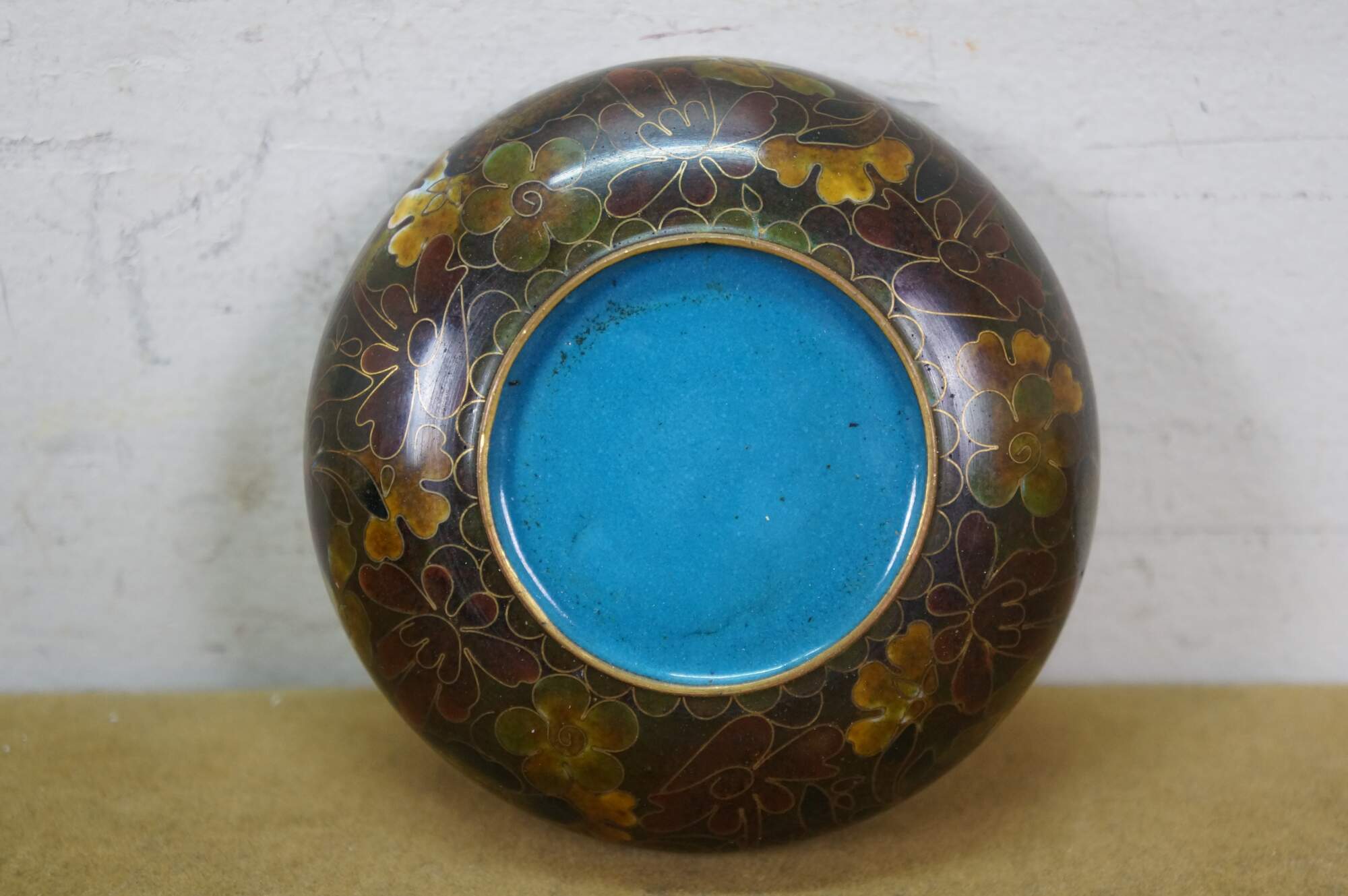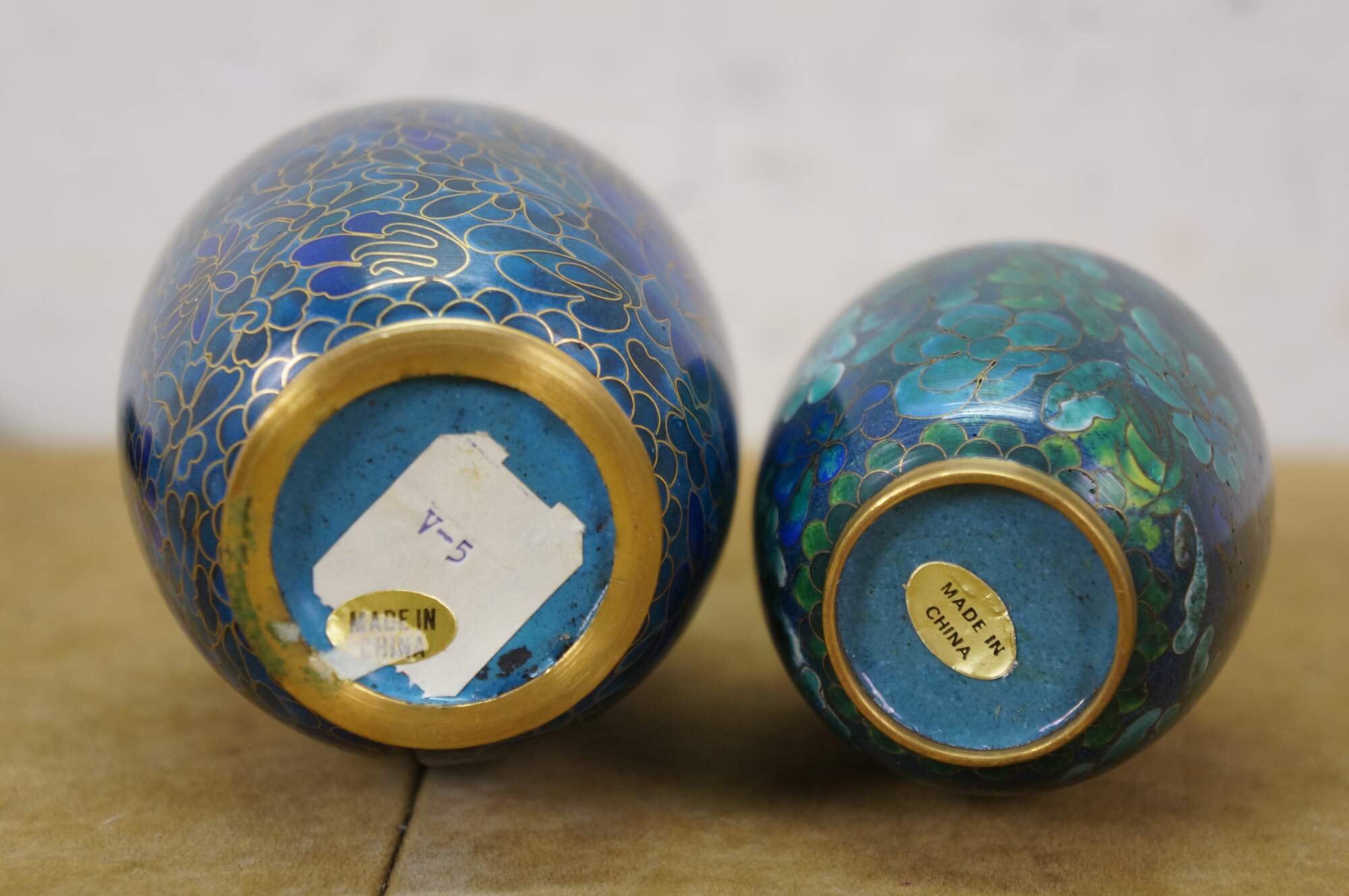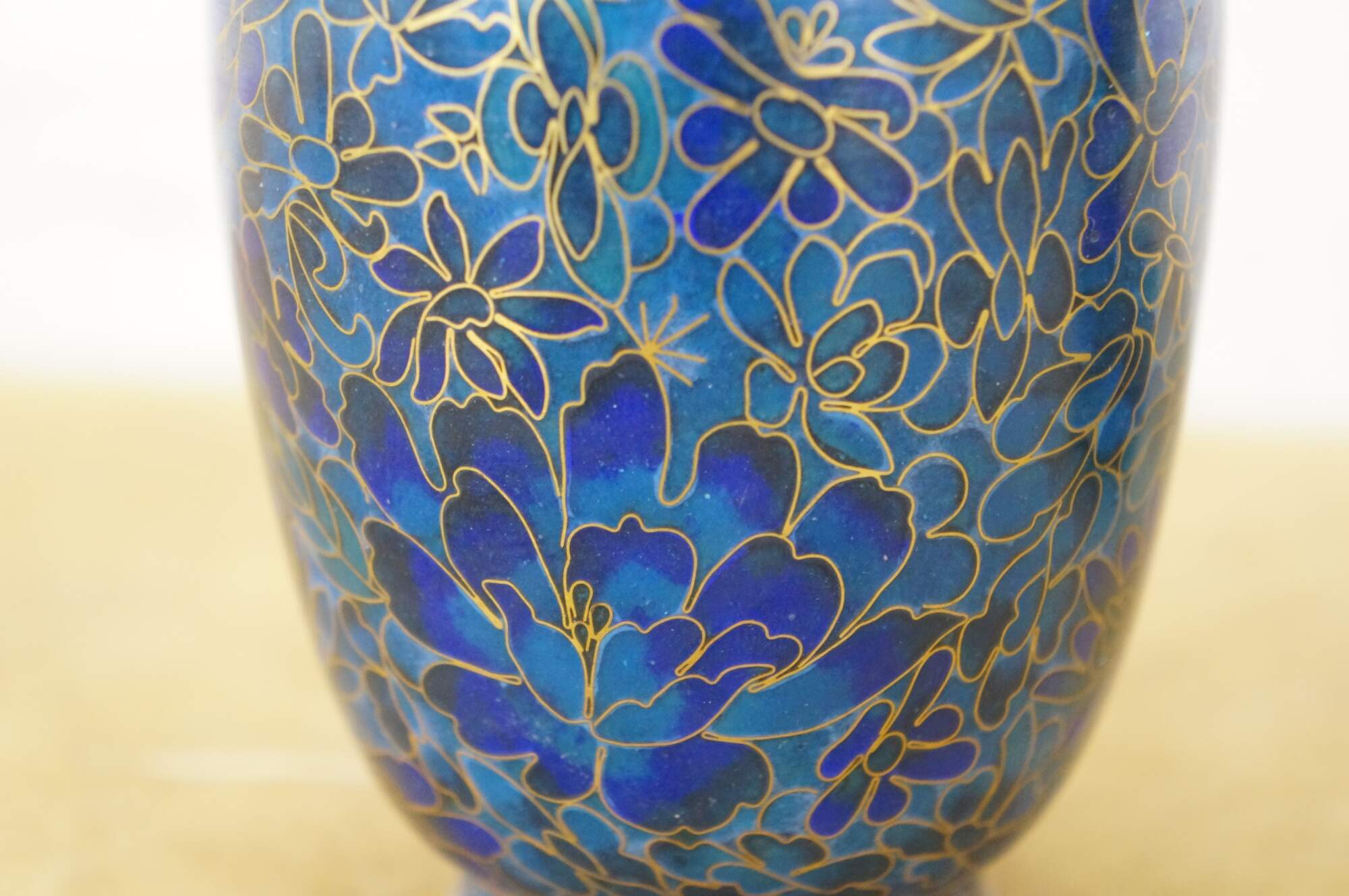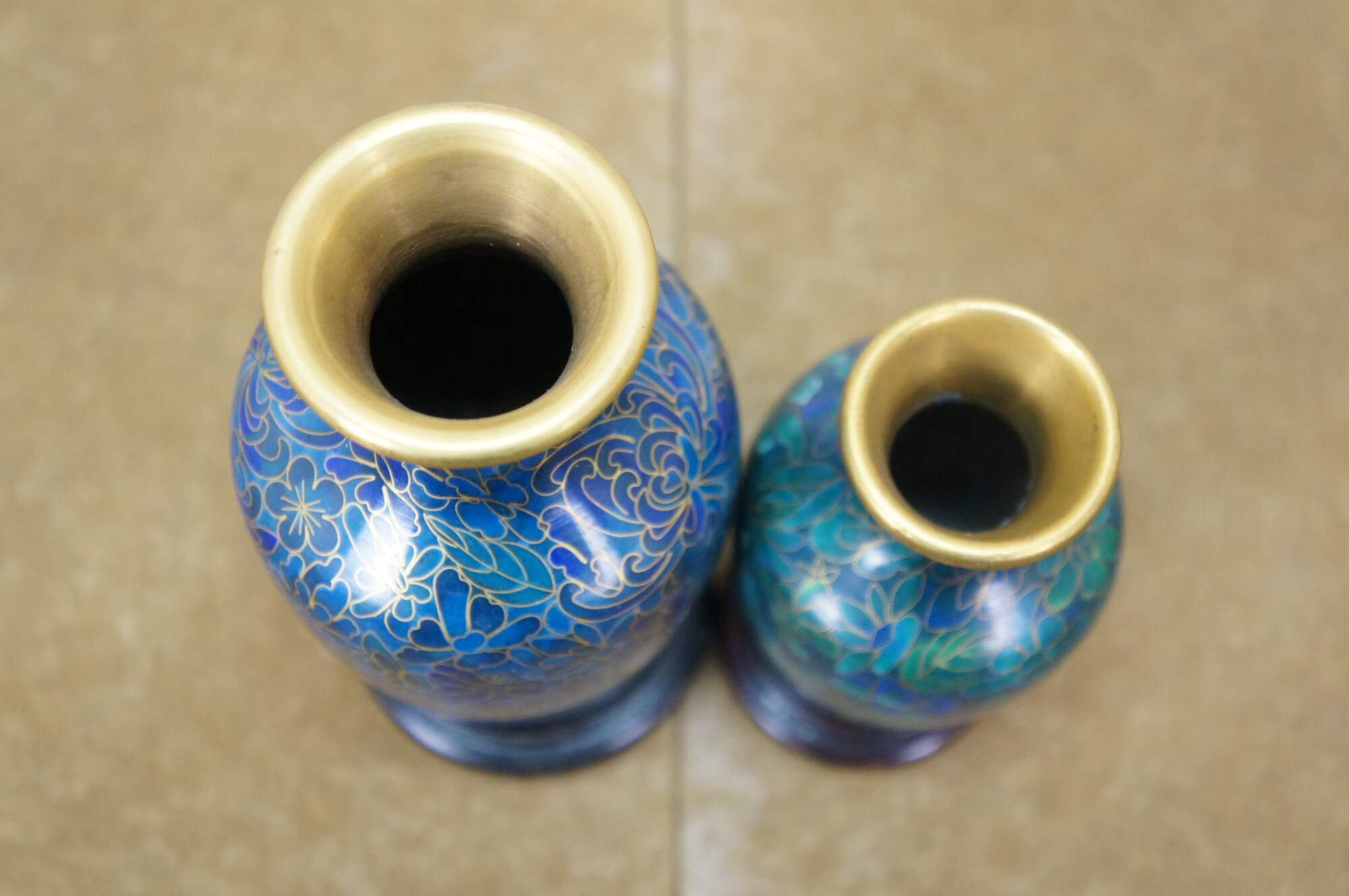 Vintage Chinese cloisonné enamel baluster bud vases and ashtray featuring turquoise / cobalt blue and green floral designs. Each piece includes a base.