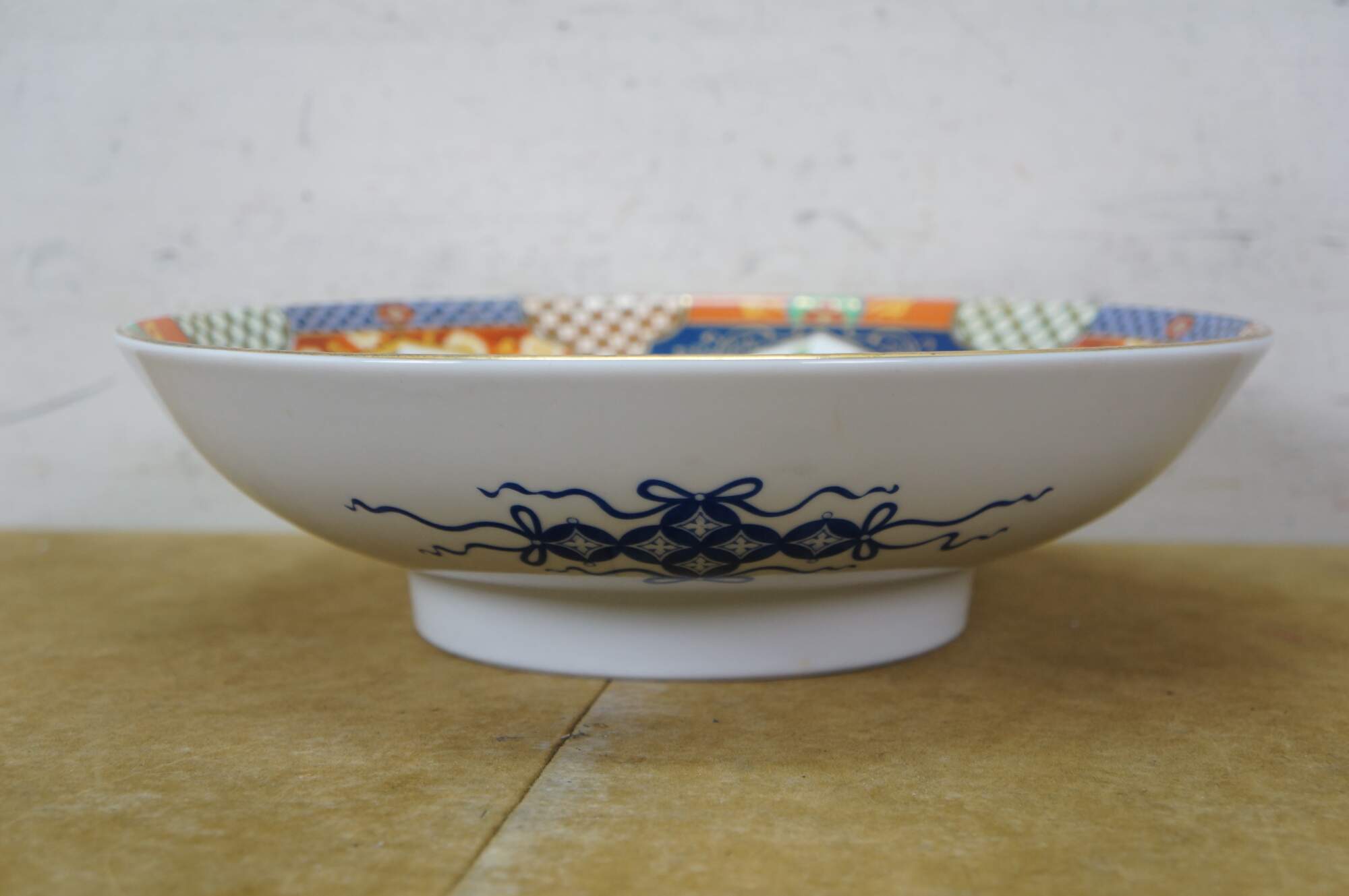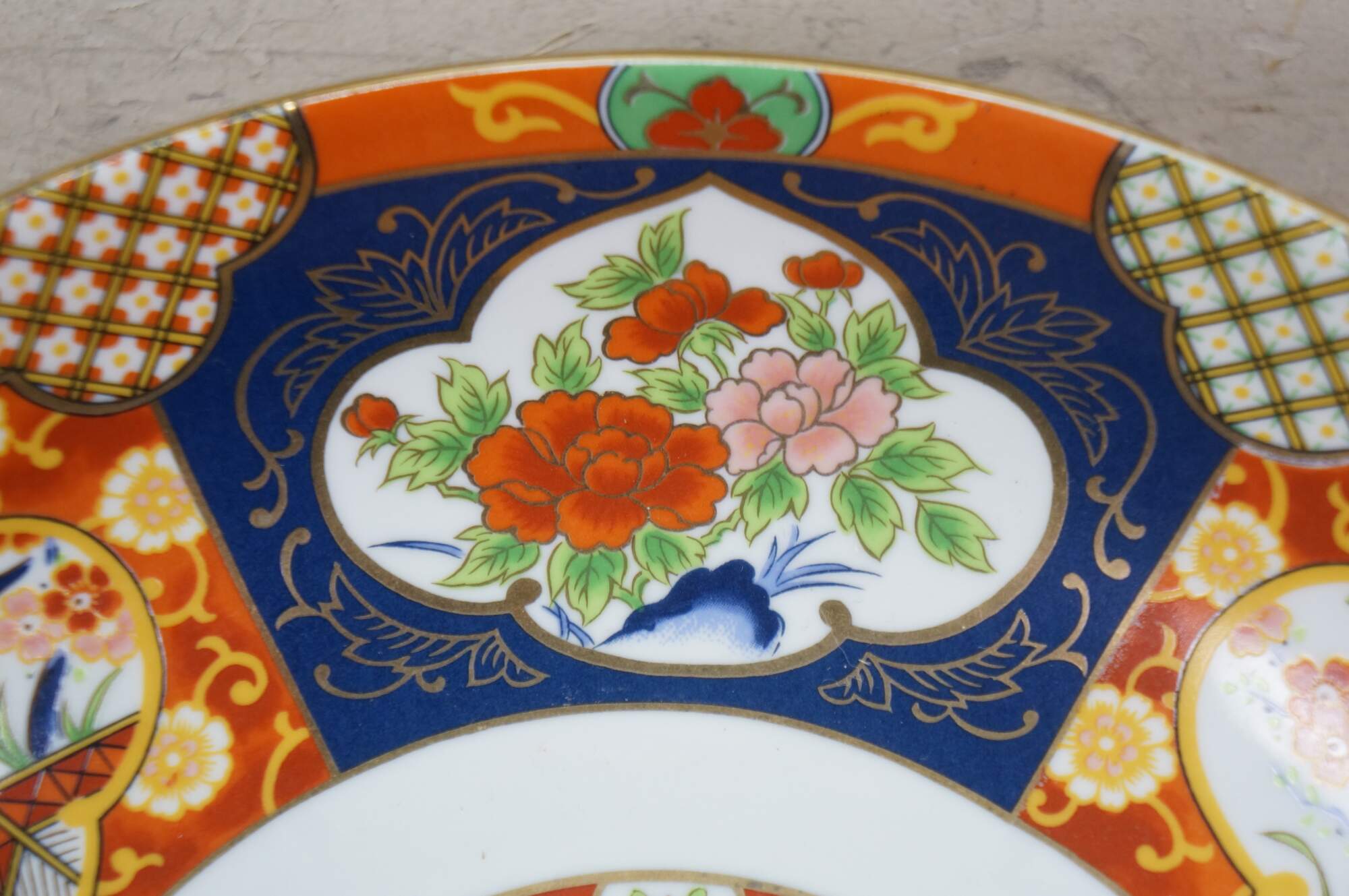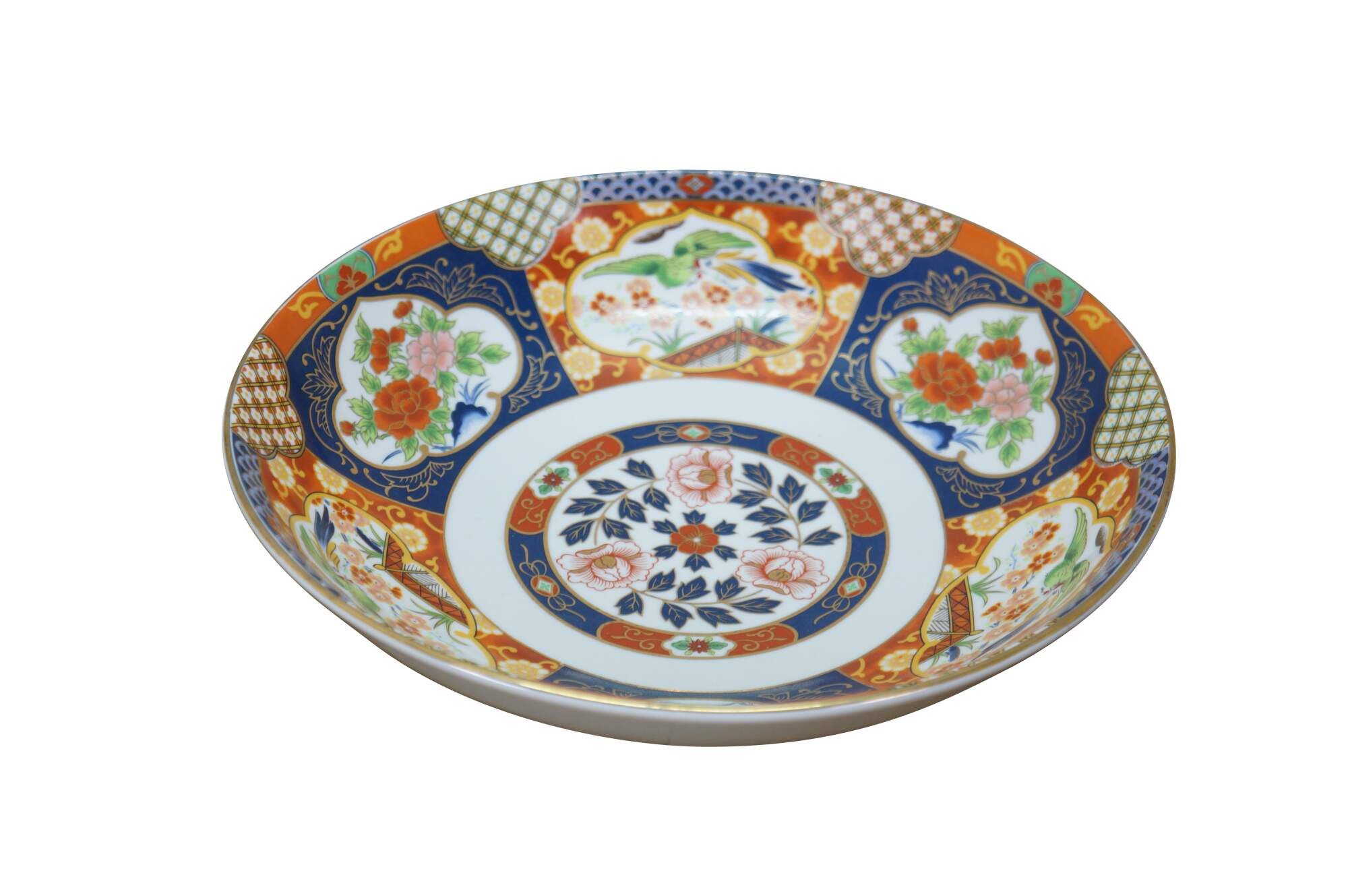 Large vintage Japanese Imari porcelain bowl featuring a traditional Imari color palette of cobalt blue, vibrant red-orange, green, and rich gold accents including a central floral medallion surrounded by panels with alternating floral and mystical bird motifs.