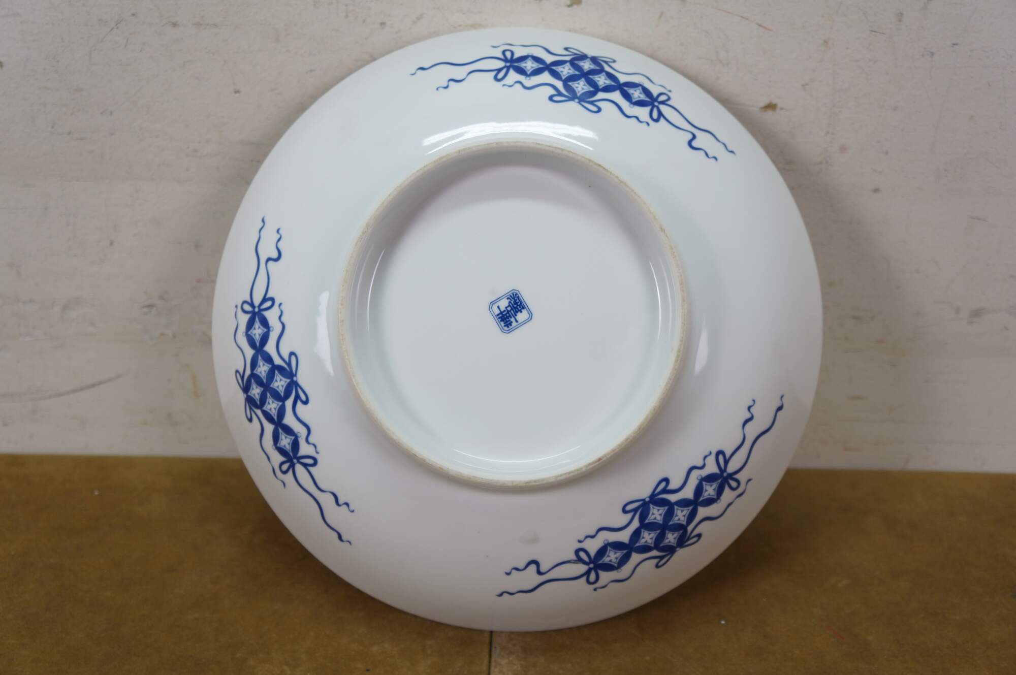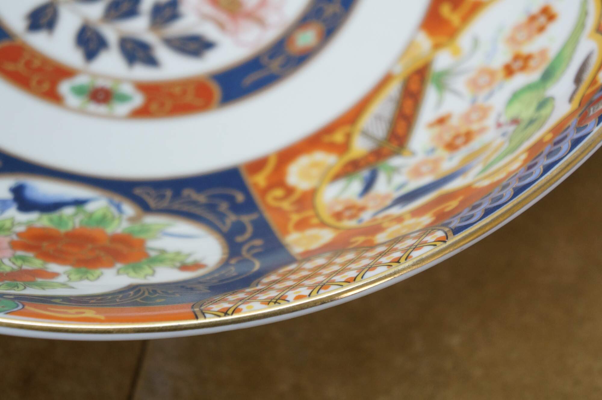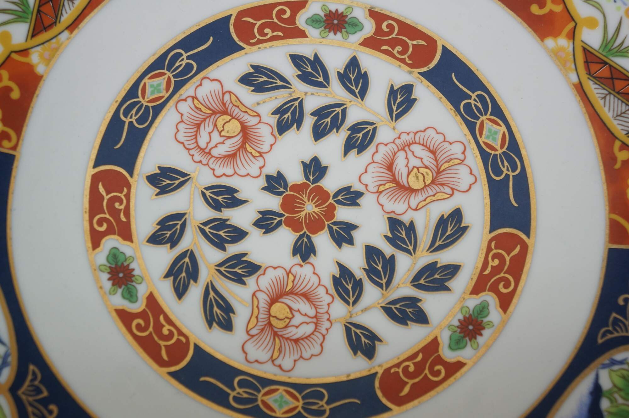 Large vintage Japanese Imari porcelain bowl featuring a traditional Imari color palette of cobalt blue, vibrant red-orange, green, and rich gold accents including a central floral medallion surrounded by panels with alternating floral and mystical bird motifs.