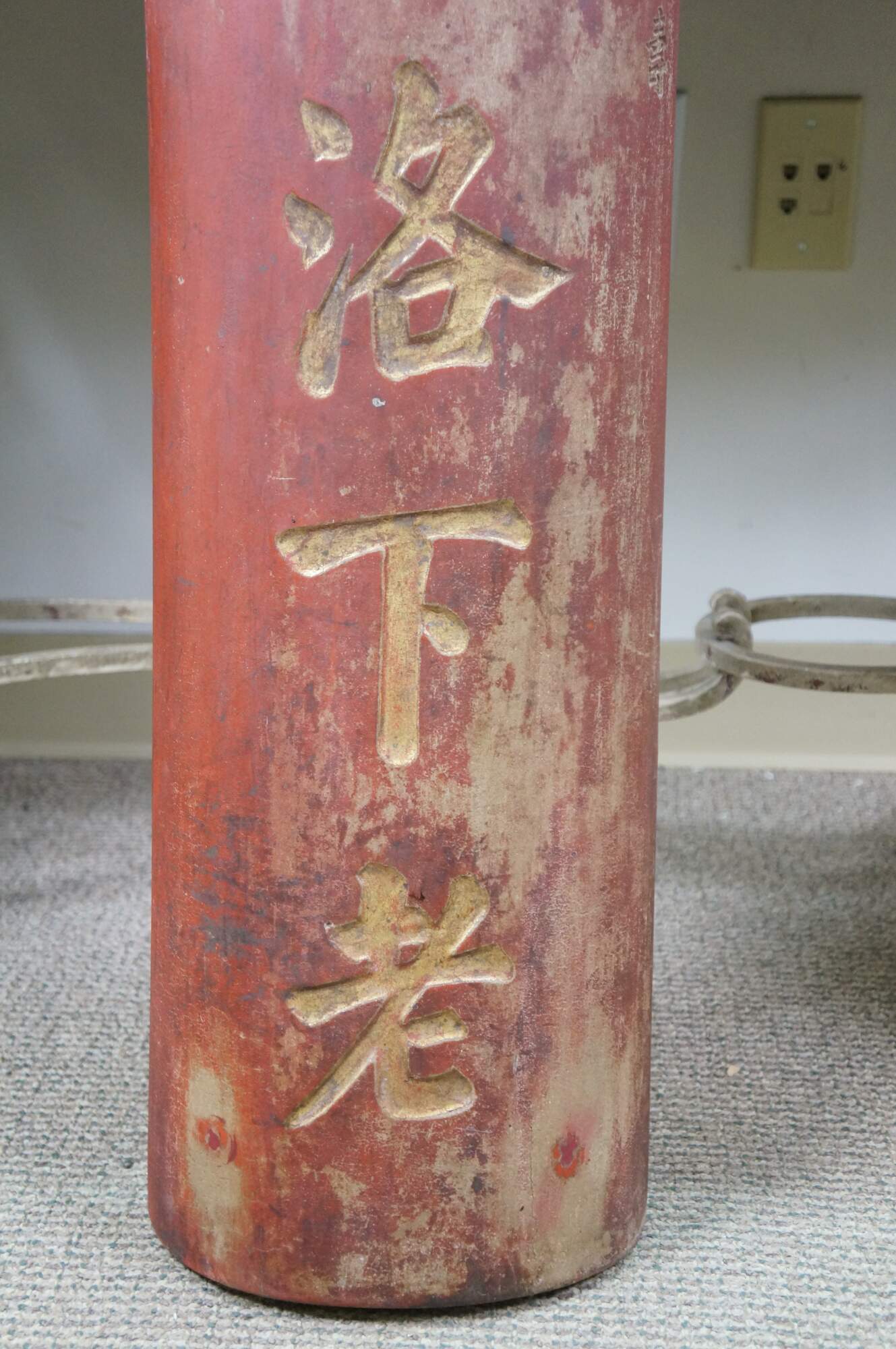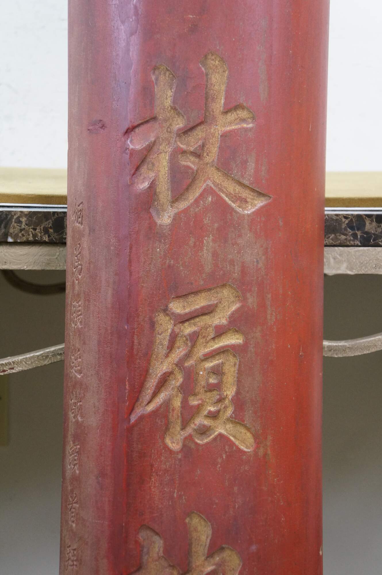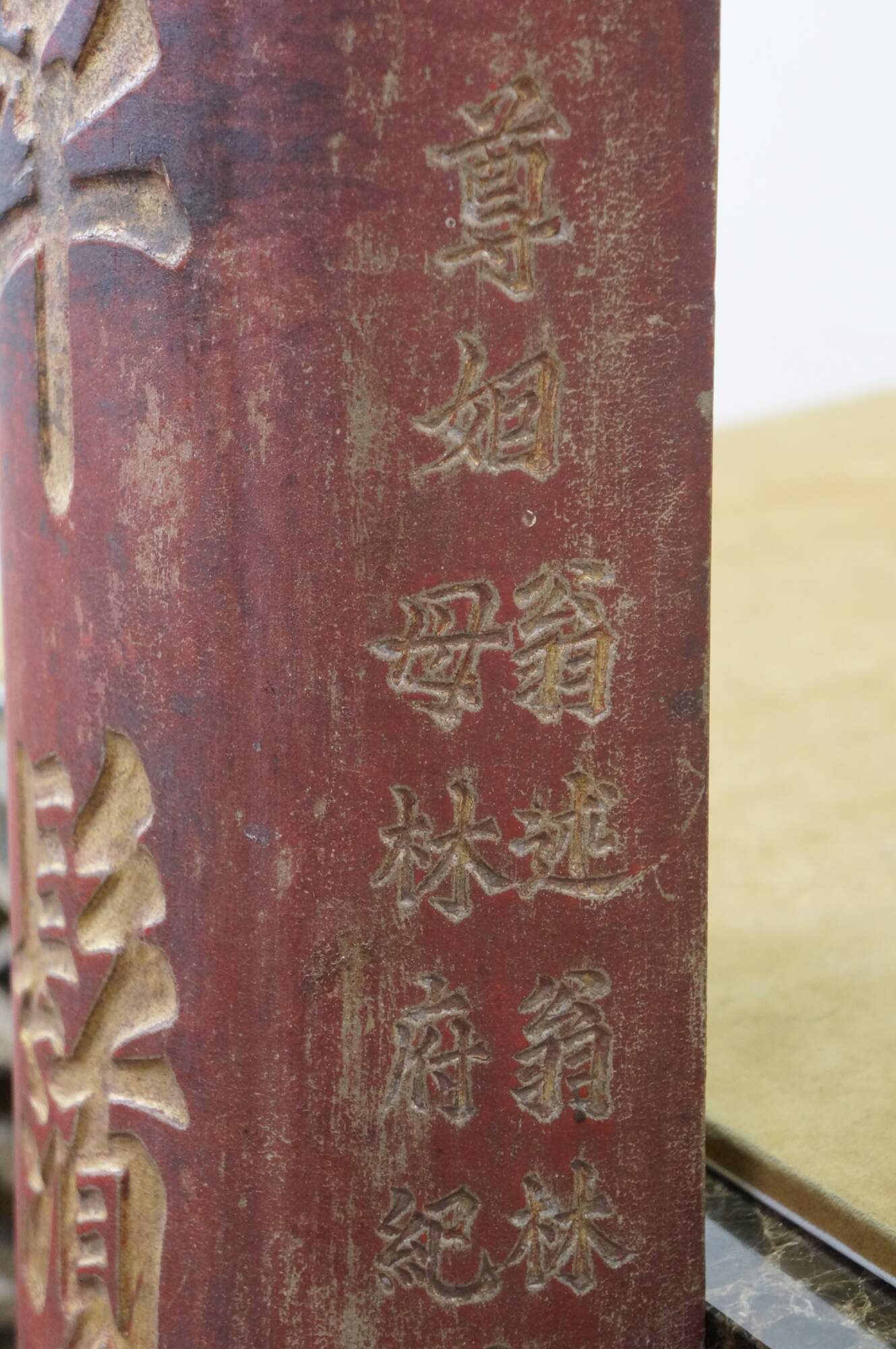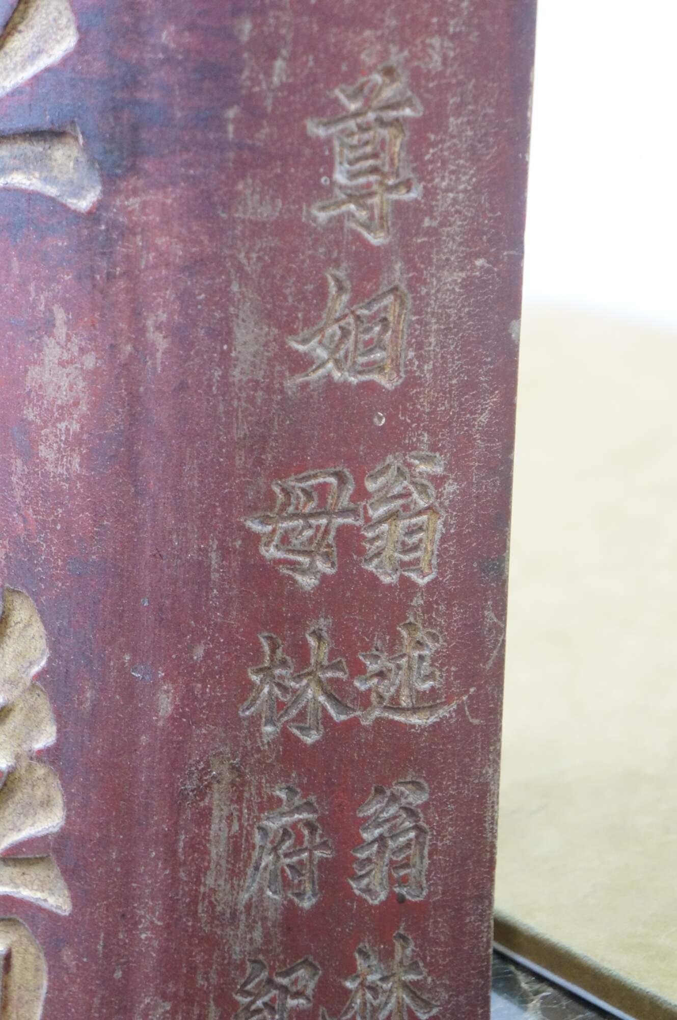 Beautiful pair of antique Chinese wooden couplet wall plaques dating to the late Qing Dynasty. Hand-carved with traditional Chinese gold calligraphy and red lacquer, these panels were a birthday gift given by a person named Tingjing Zhang 張廷