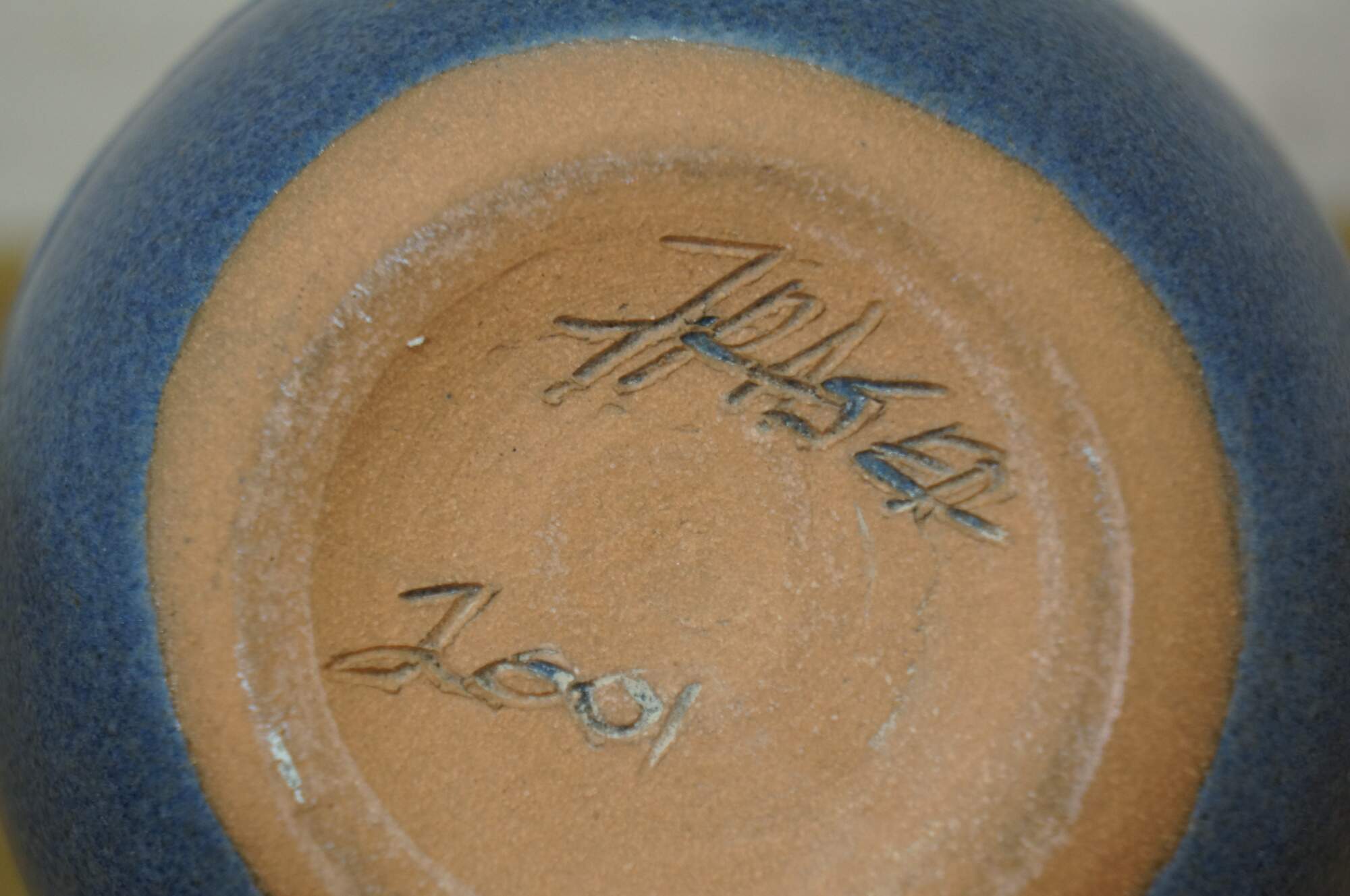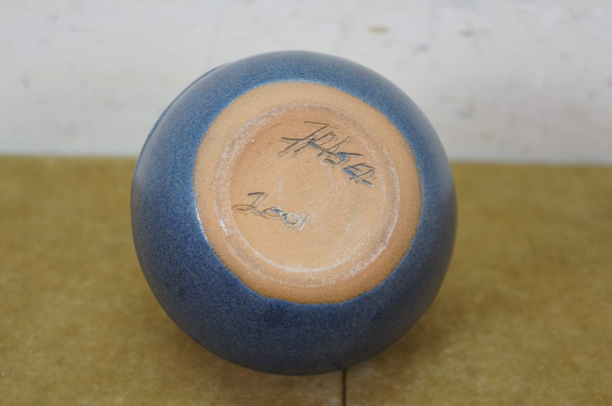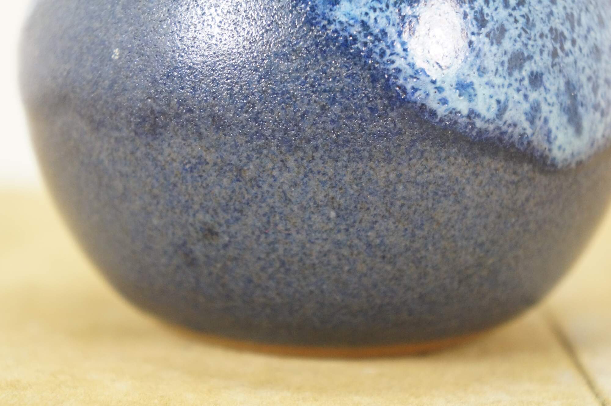 Vintage studio pottery artisans wheel-thrown clay / stoneware vase featuring a mottled, blue glaze. Signed Fraser 2001.