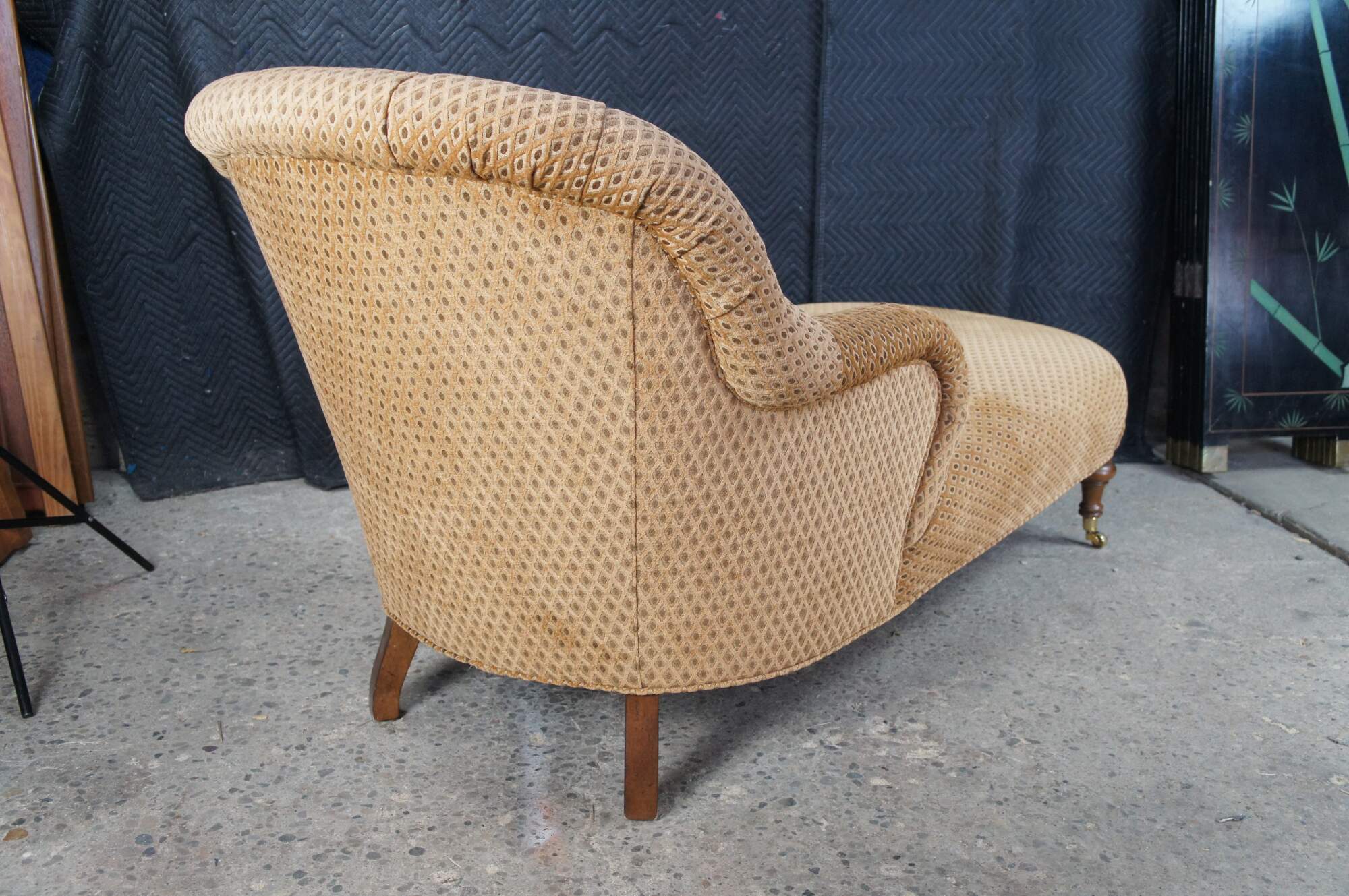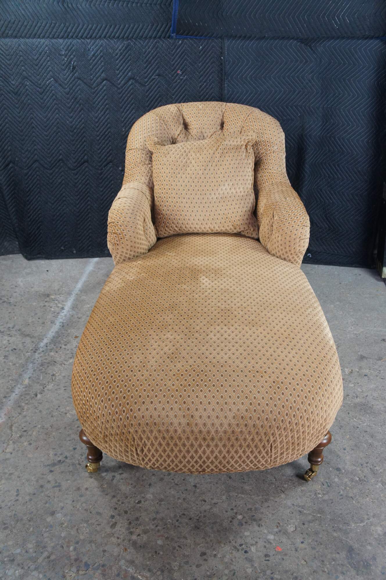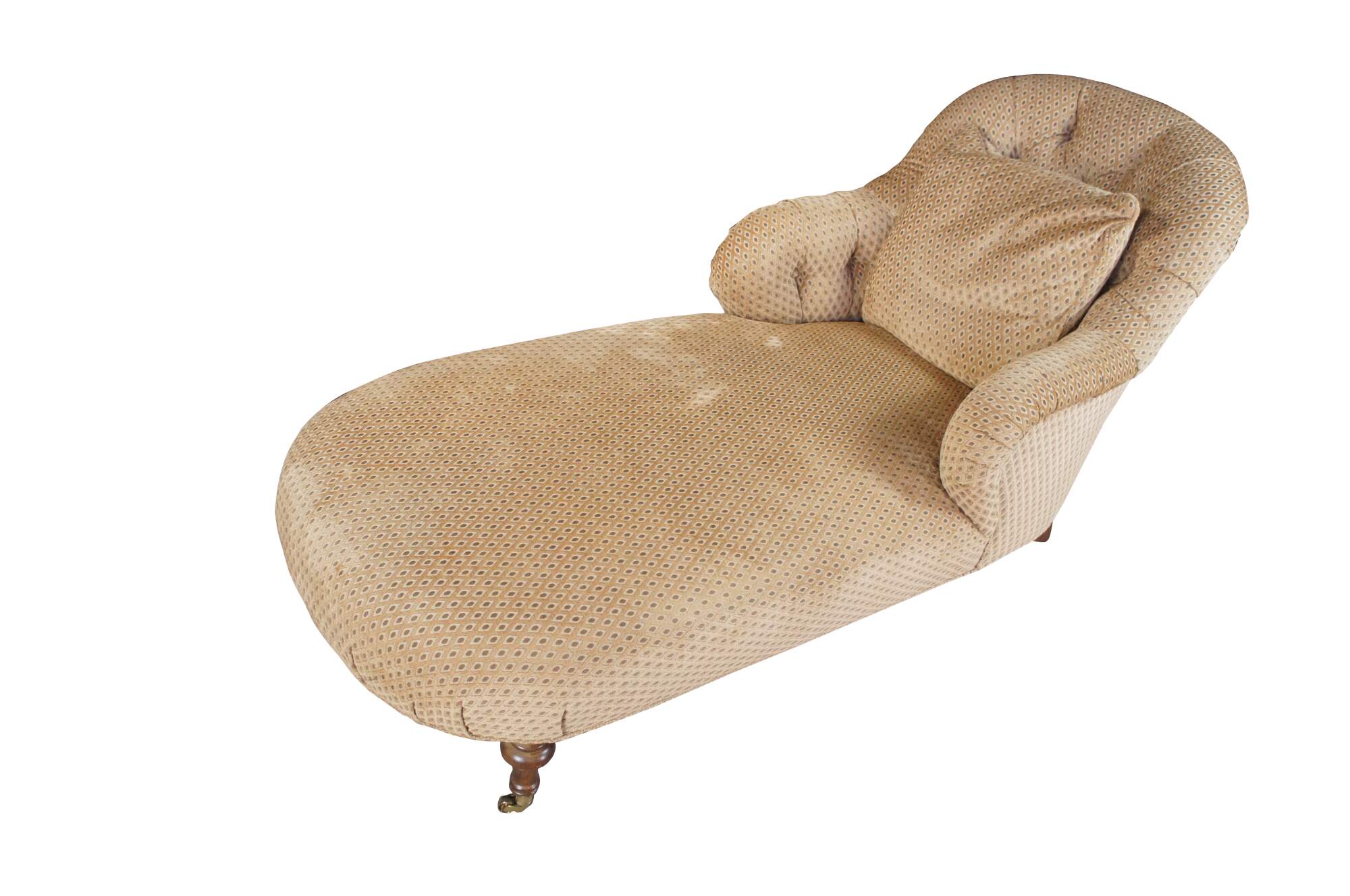Antique Victorian era chaise lounge / day bed / fainting couch / settee. It features a tufted diamond upholstery with rolled arms, supported by turned walnut legs with brass castors.