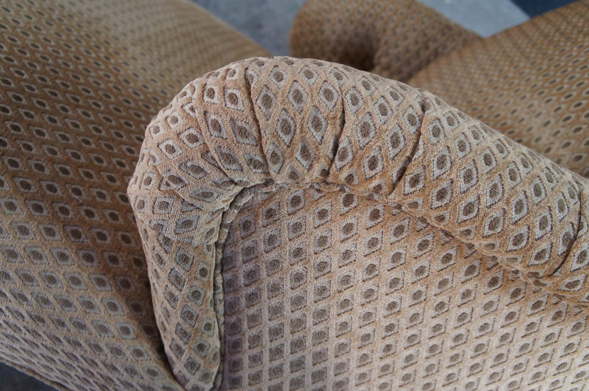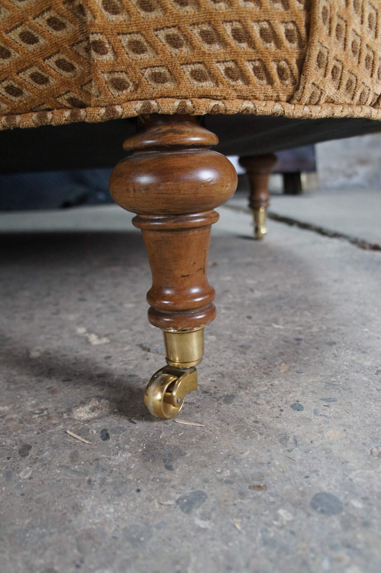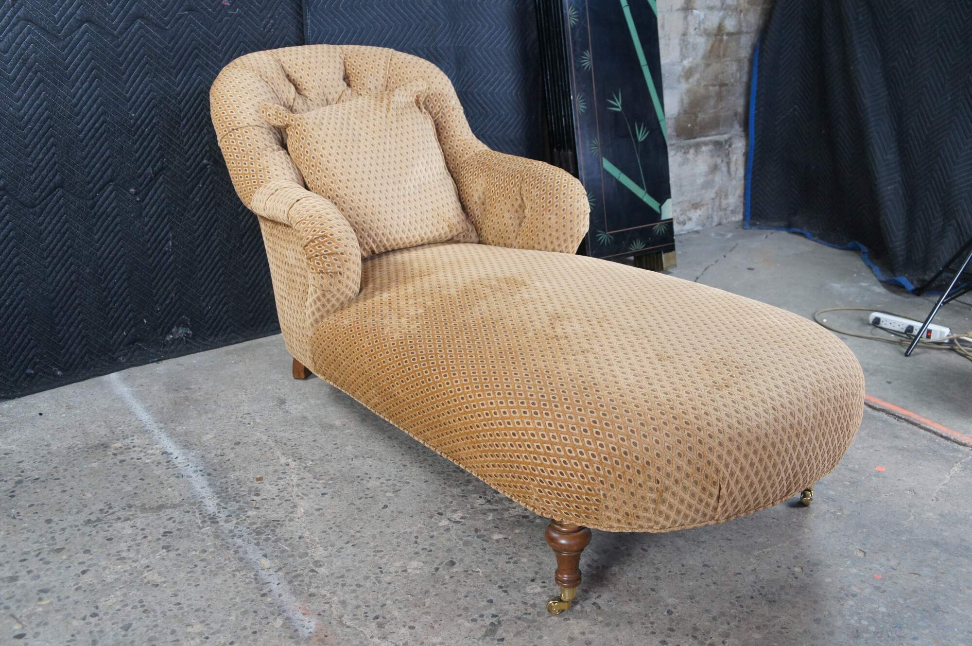 Antique Victorian era chaise lounge / day bed / fainting couch / settee. It features a tufted diamond upholstery with rolled arms, supported by turned walnut legs with brass castors.