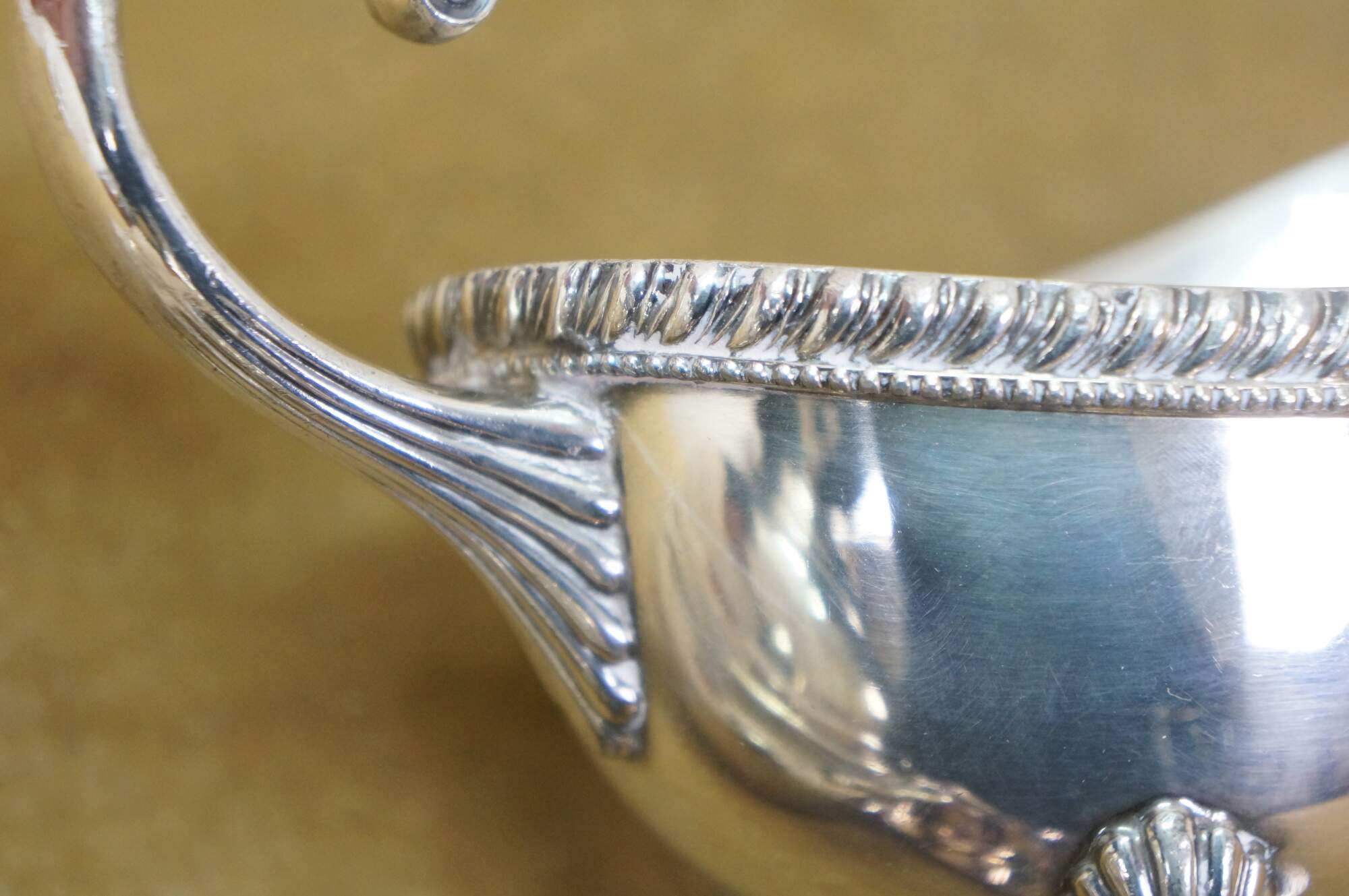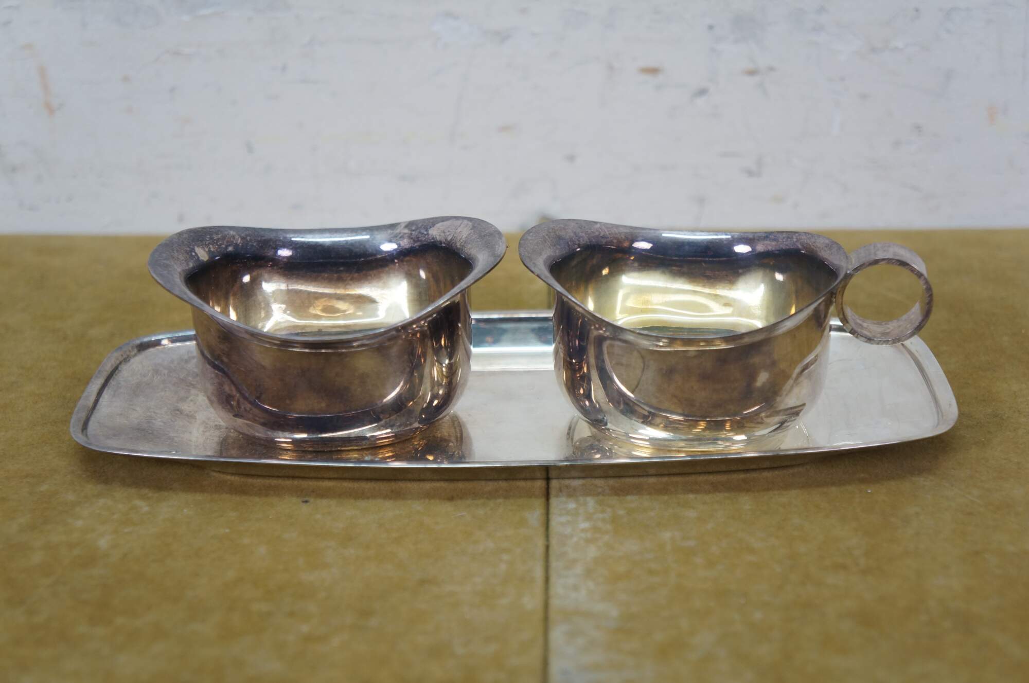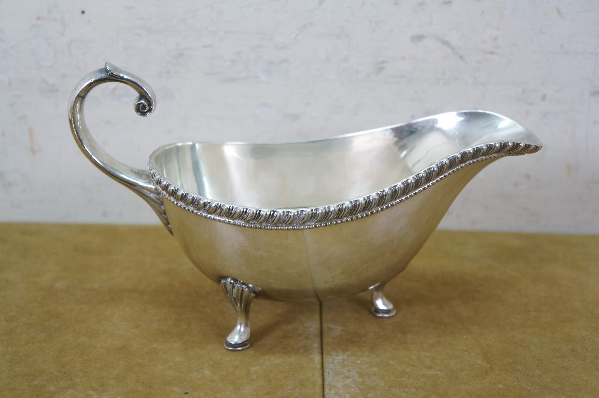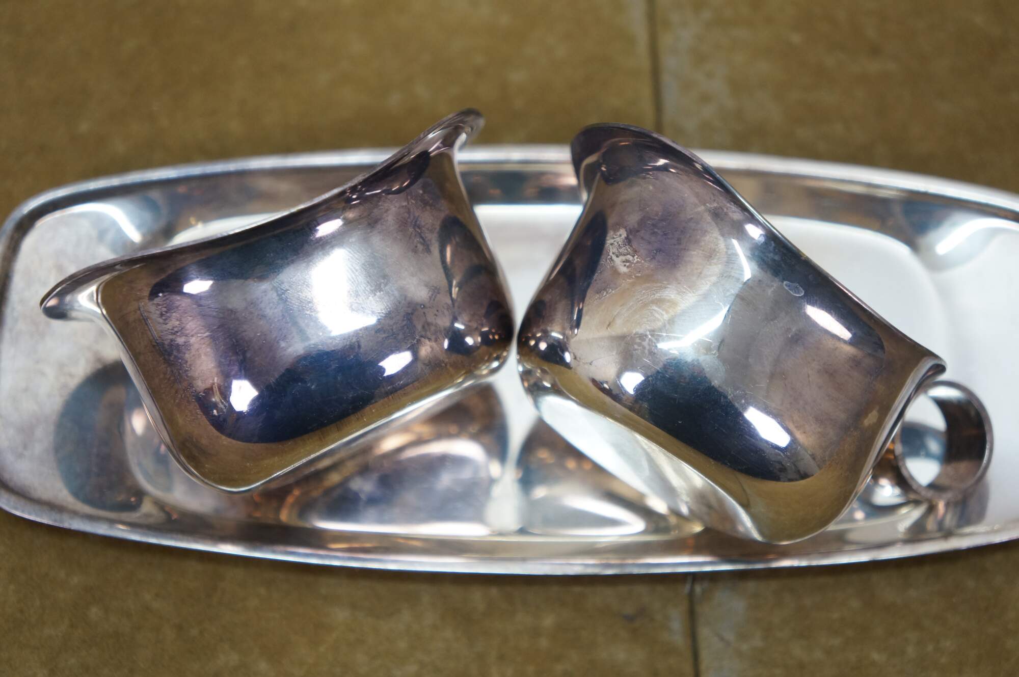 Vintage silver plate serving pieces. Including Oneida Community - Lakewood, National Silver Co, W&S Blackinton, Farberware. 2 Gravy / Sauce Boats, 2 Butler Crumb Trays, Lidded Butter Dish, Cream & Sugar Bowl with Underplate