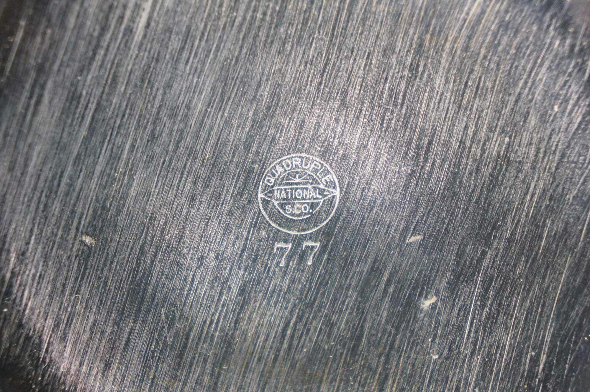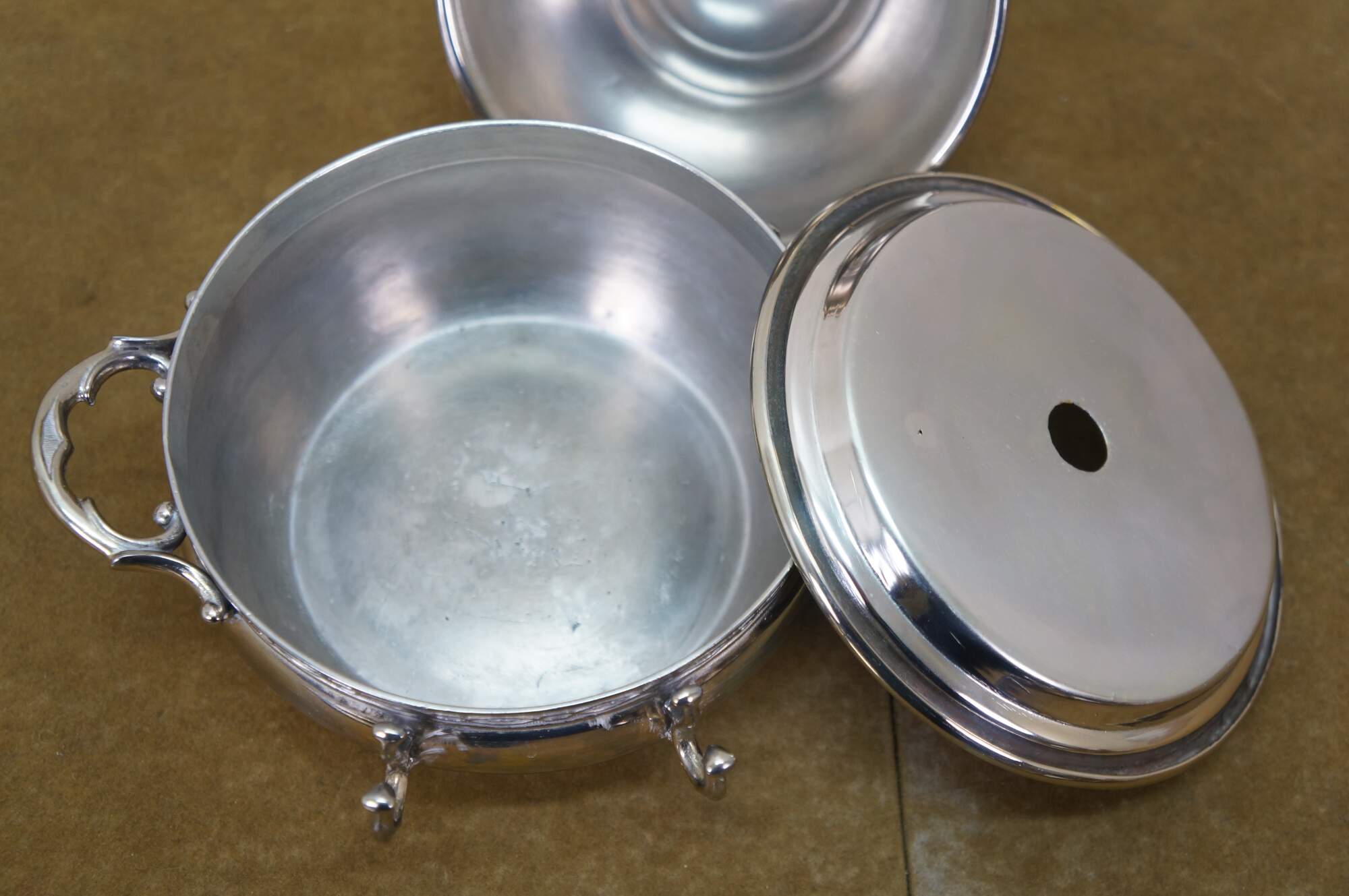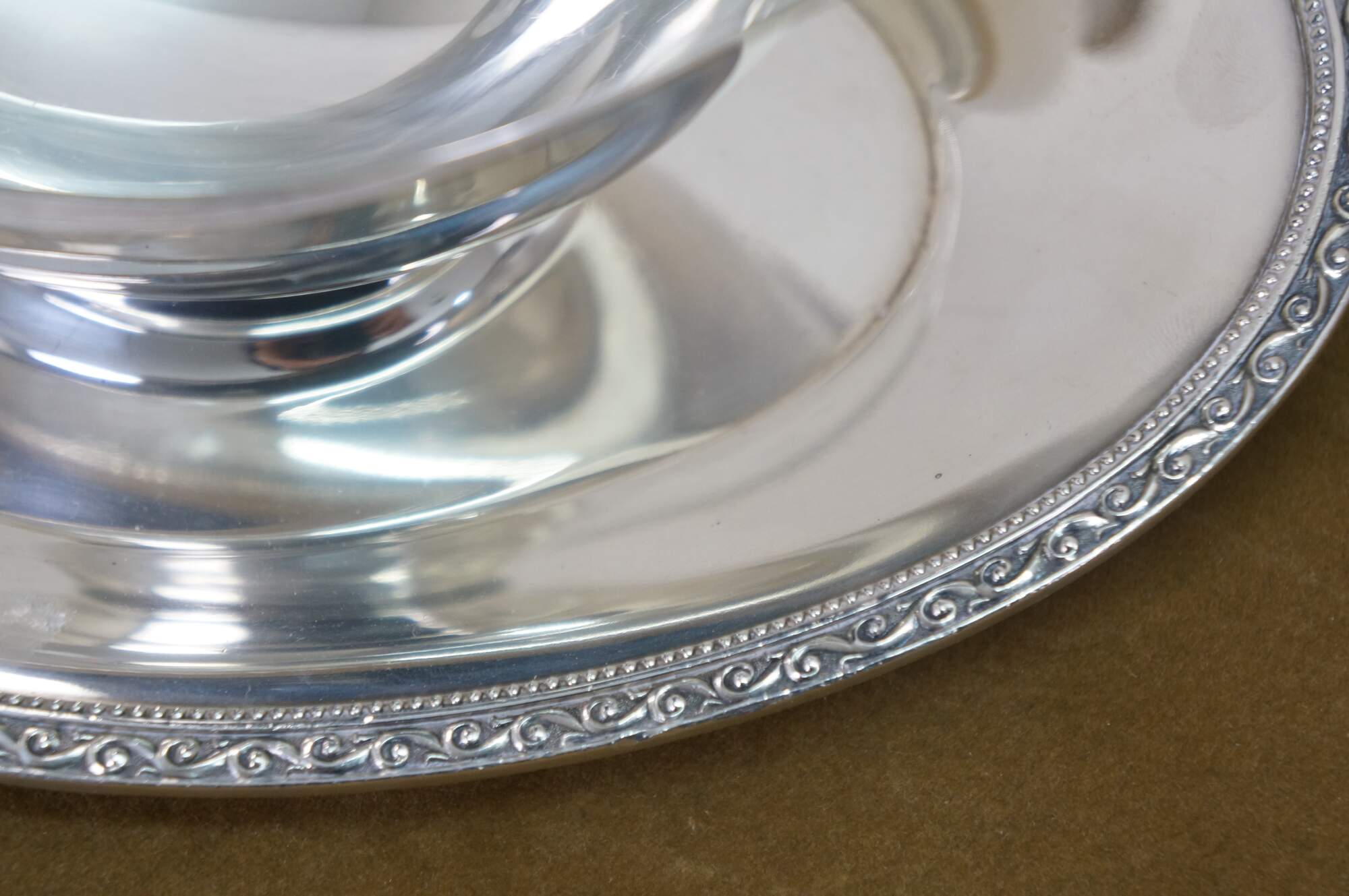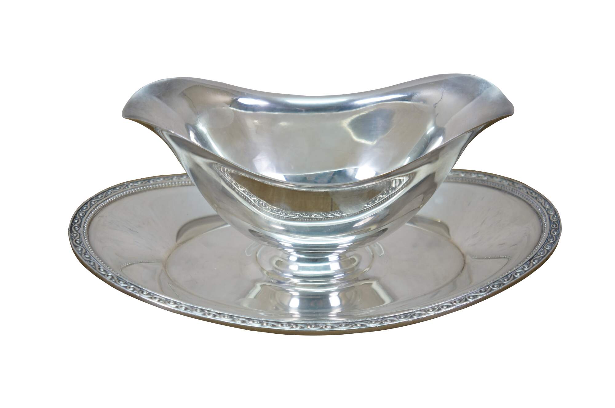 Vintage silver plate serving pieces. Including Oneida Community - Lakewood, National Silver Co, W&S Blackinton, Farberware. 2 Gravy / Sauce Boats, 2 Butler Crumb Trays, Lidded Butter Dish, Cream & Sugar Bowl with Underplate