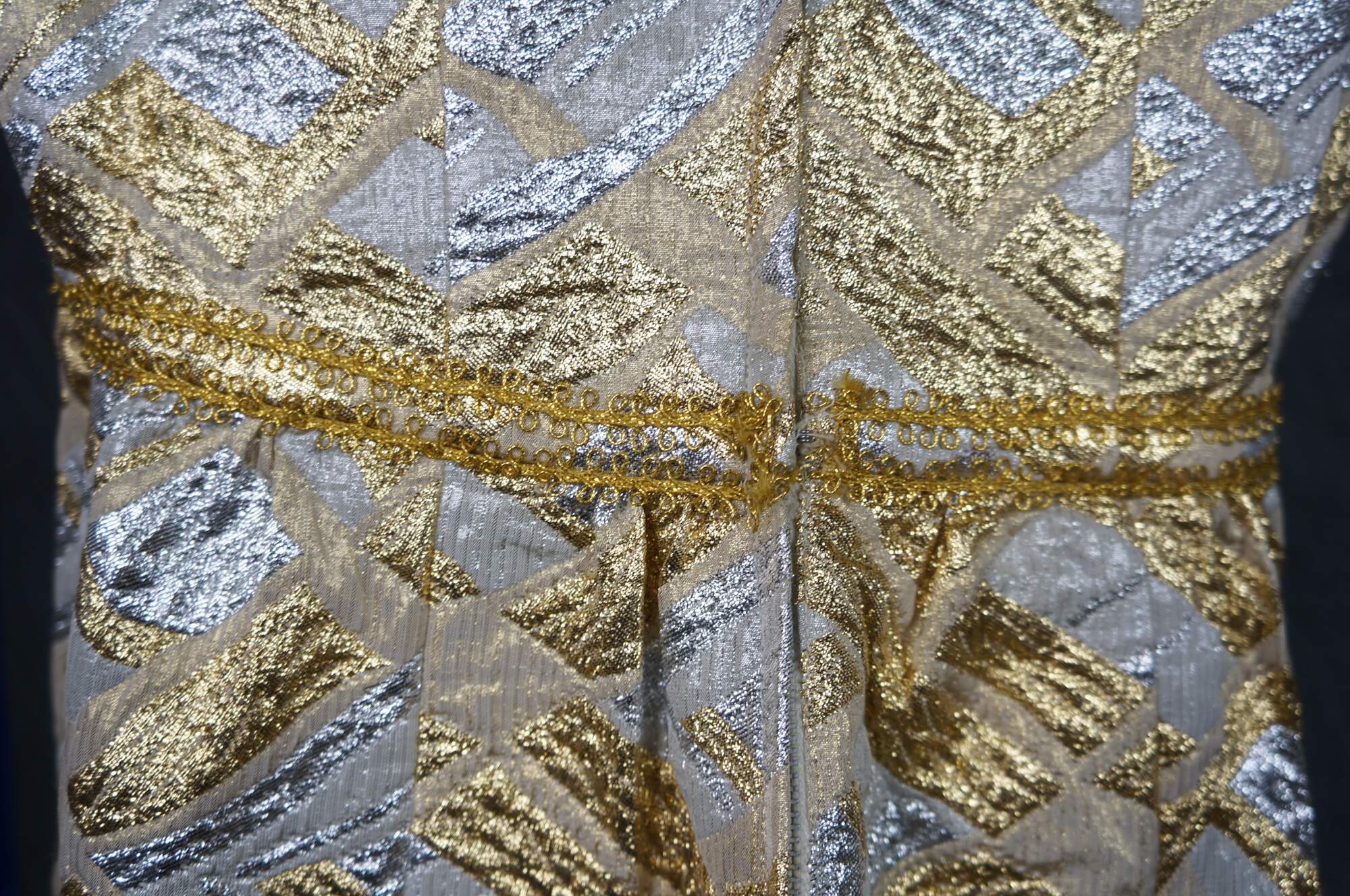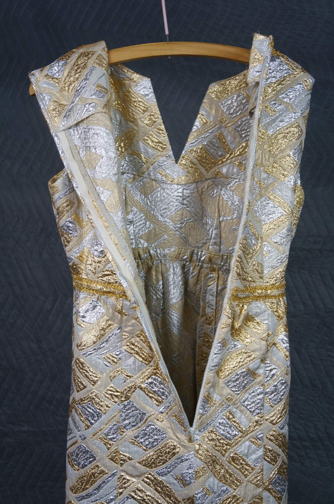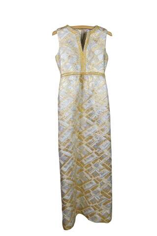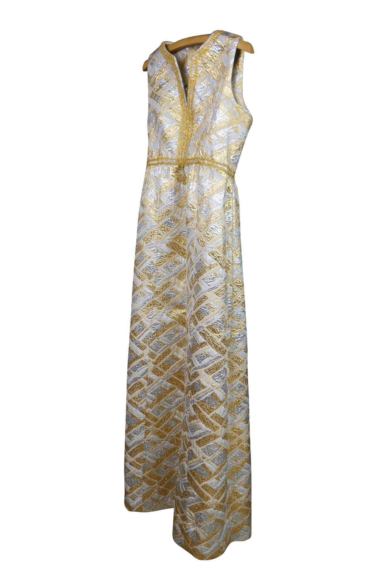 Vintage sleeveless 1960s gold and silver brocade maxi dress featuring an abstract geometric pattern and V-neckline.