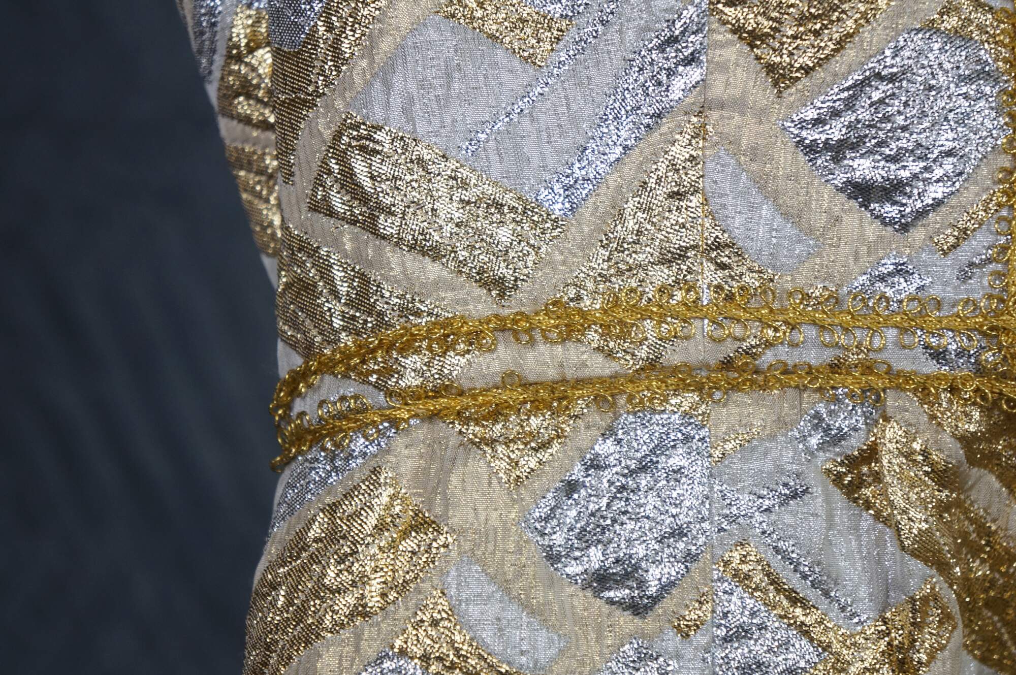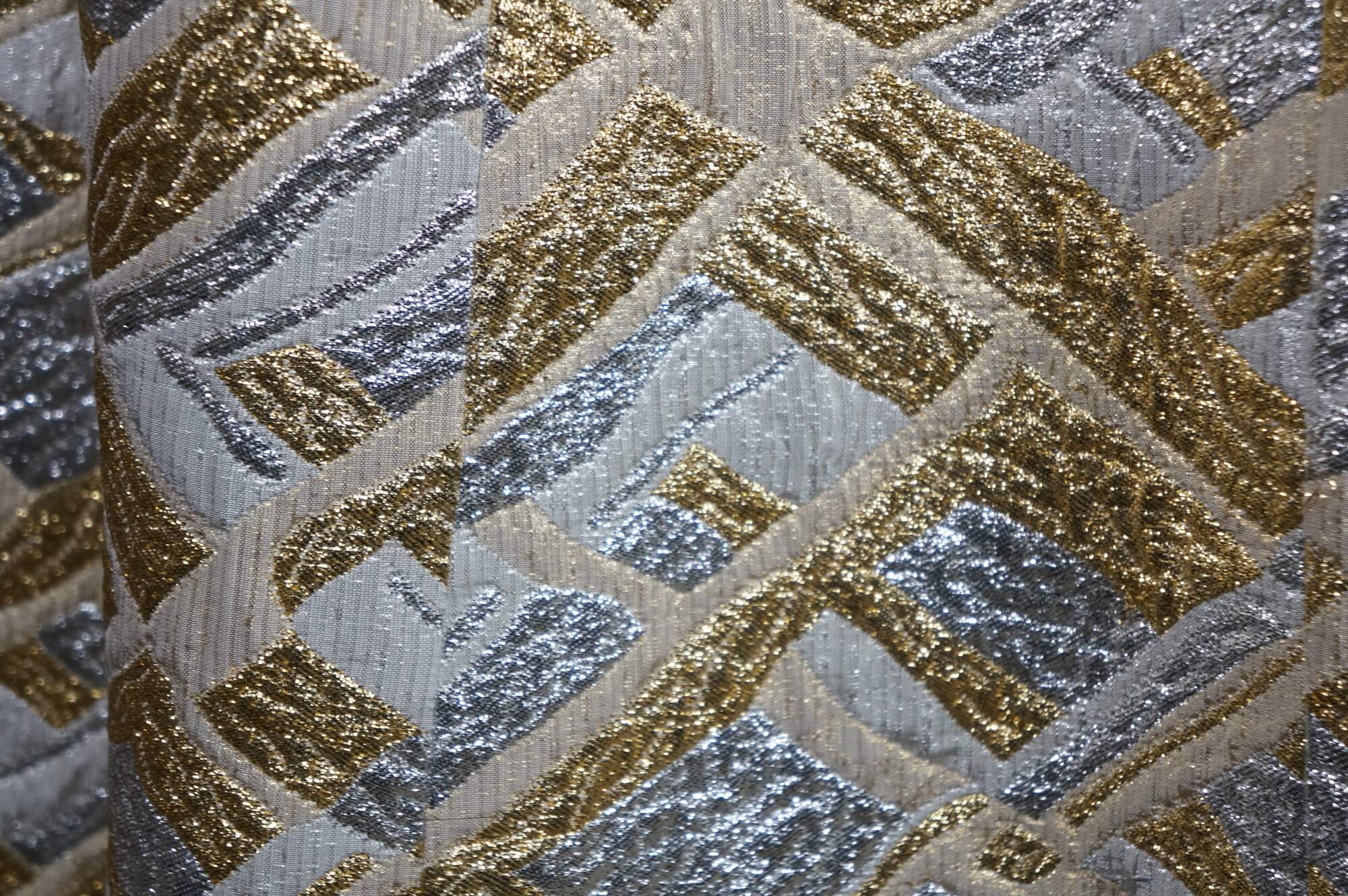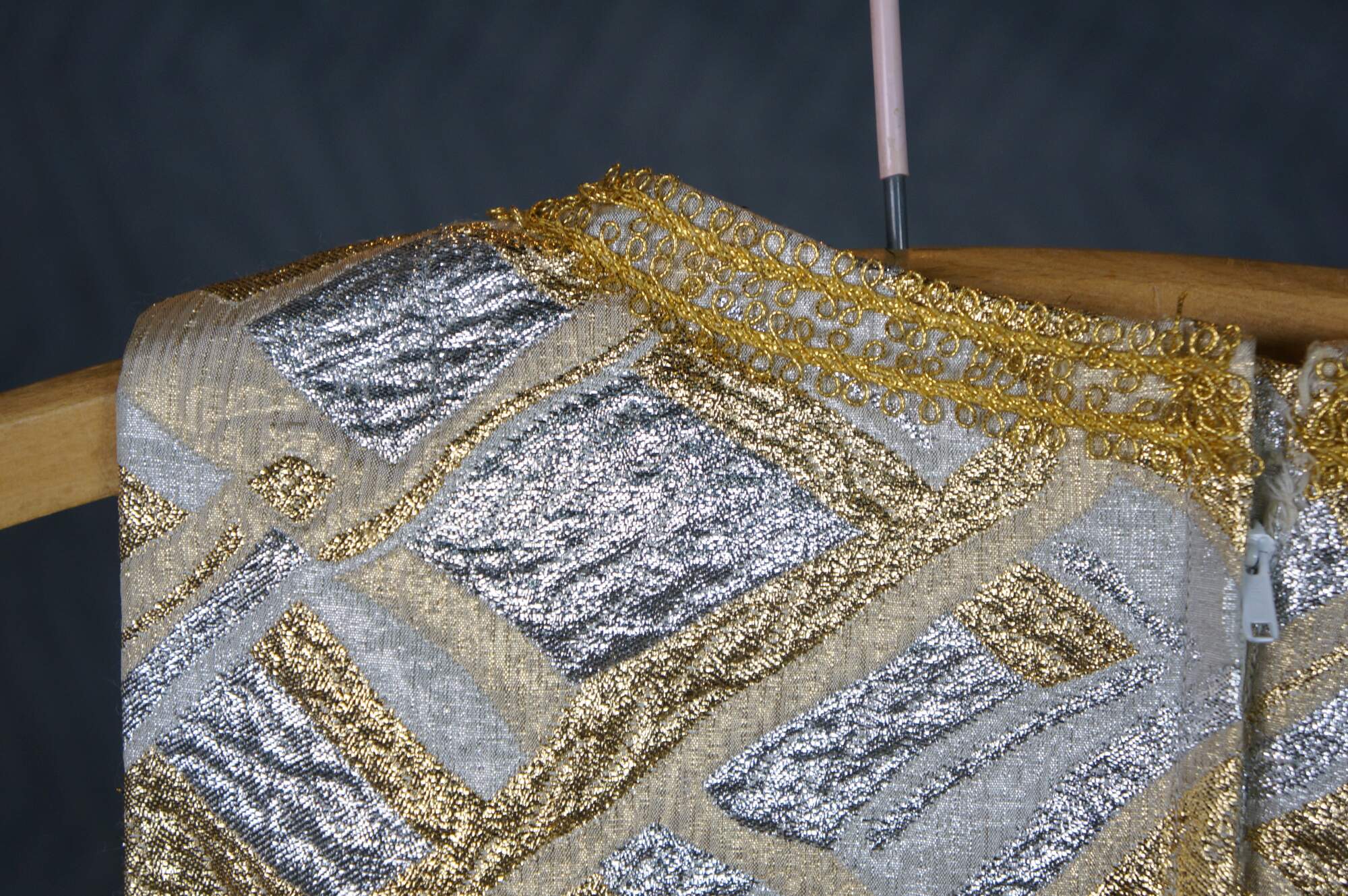 Vintage sleeveless 1960s gold and silver brocade maxi dress featuring an abstract geometric pattern and V-neckline.