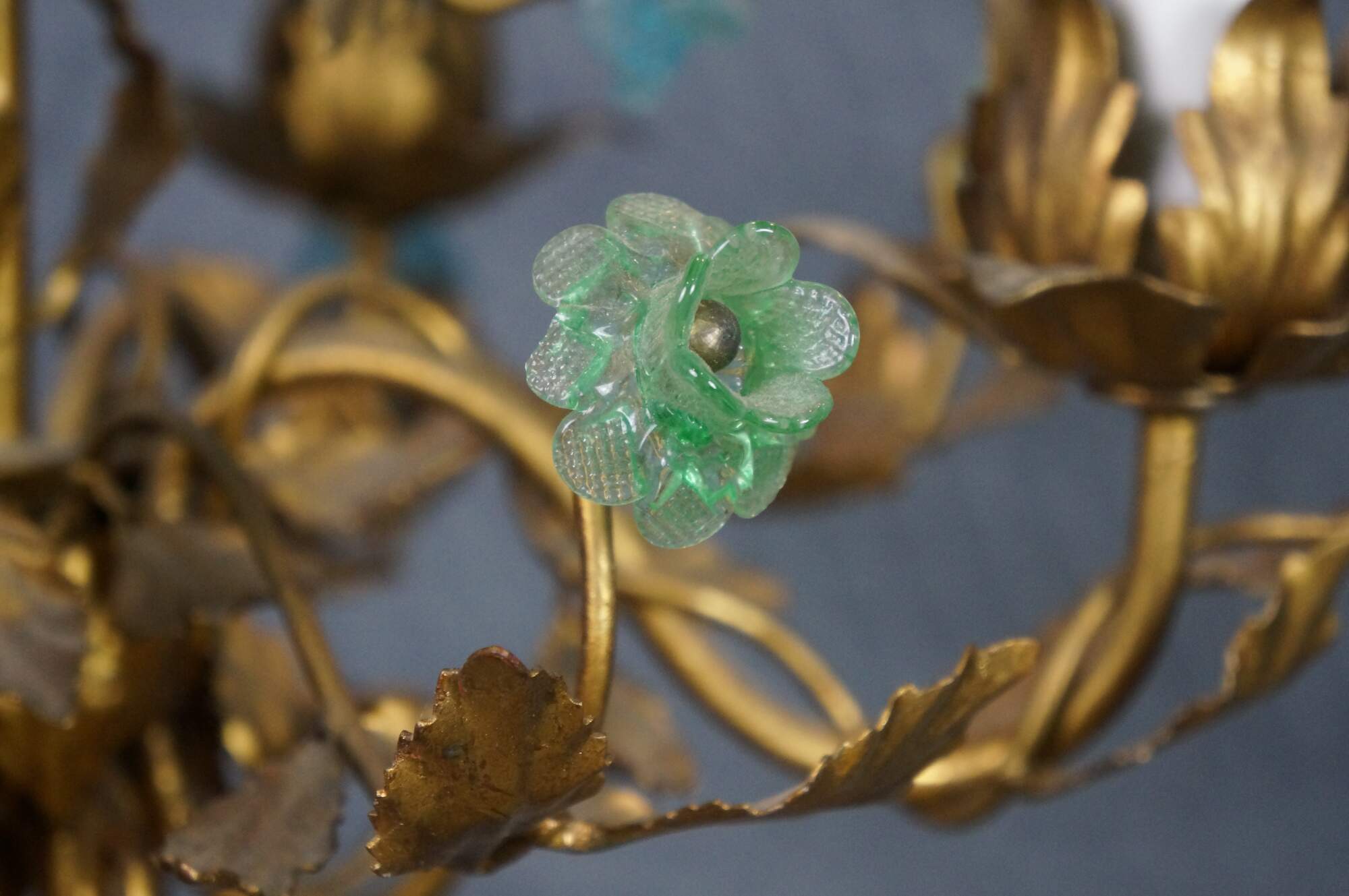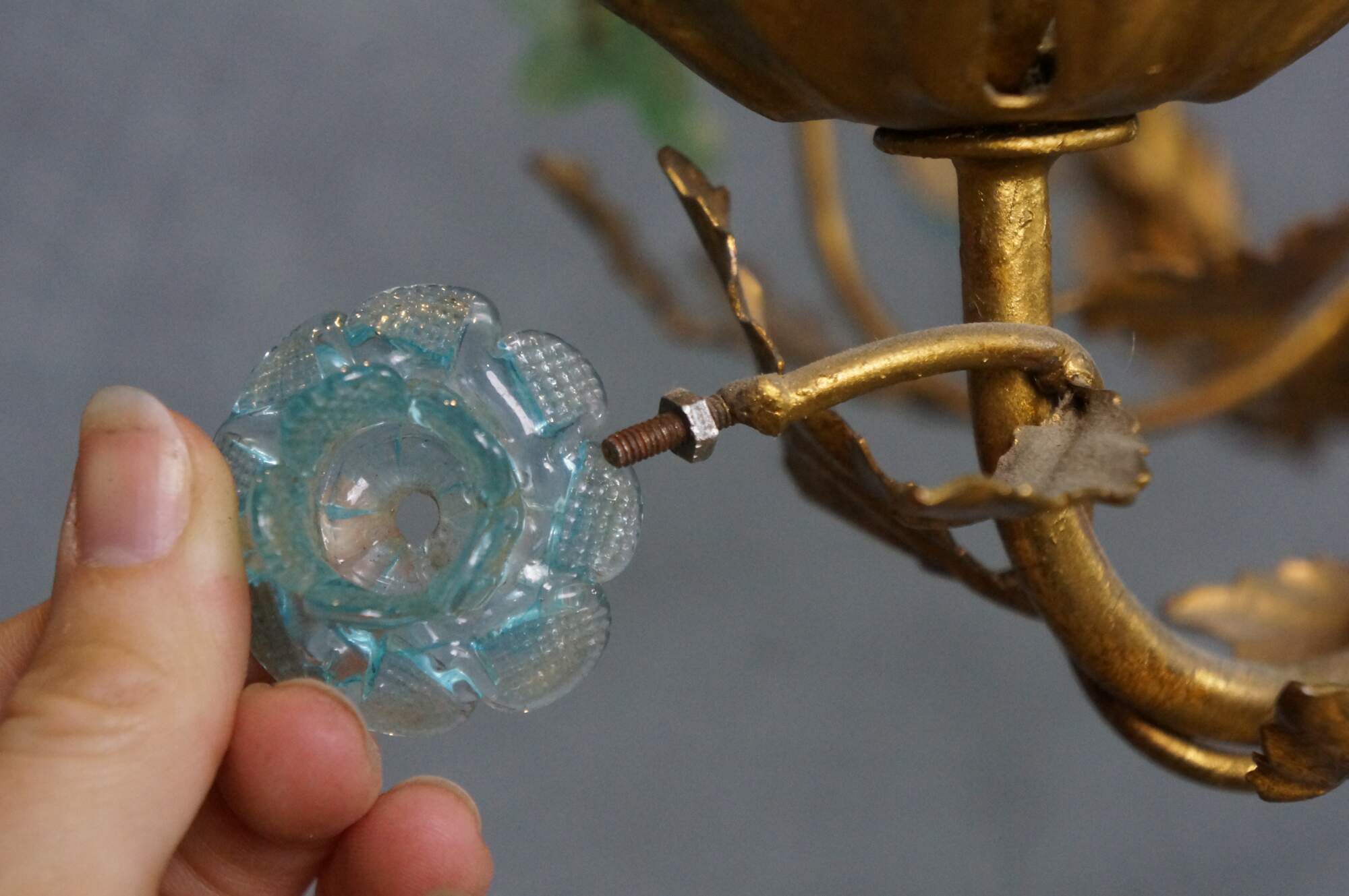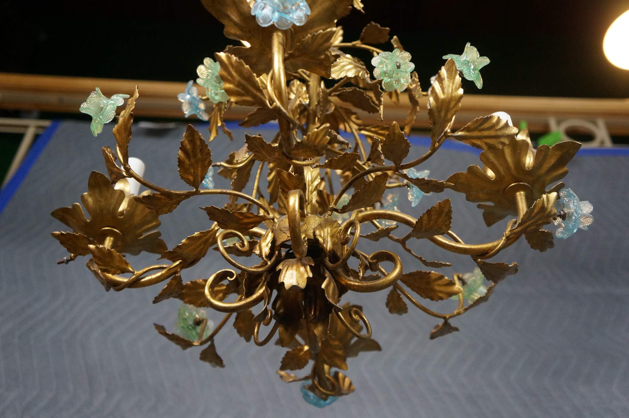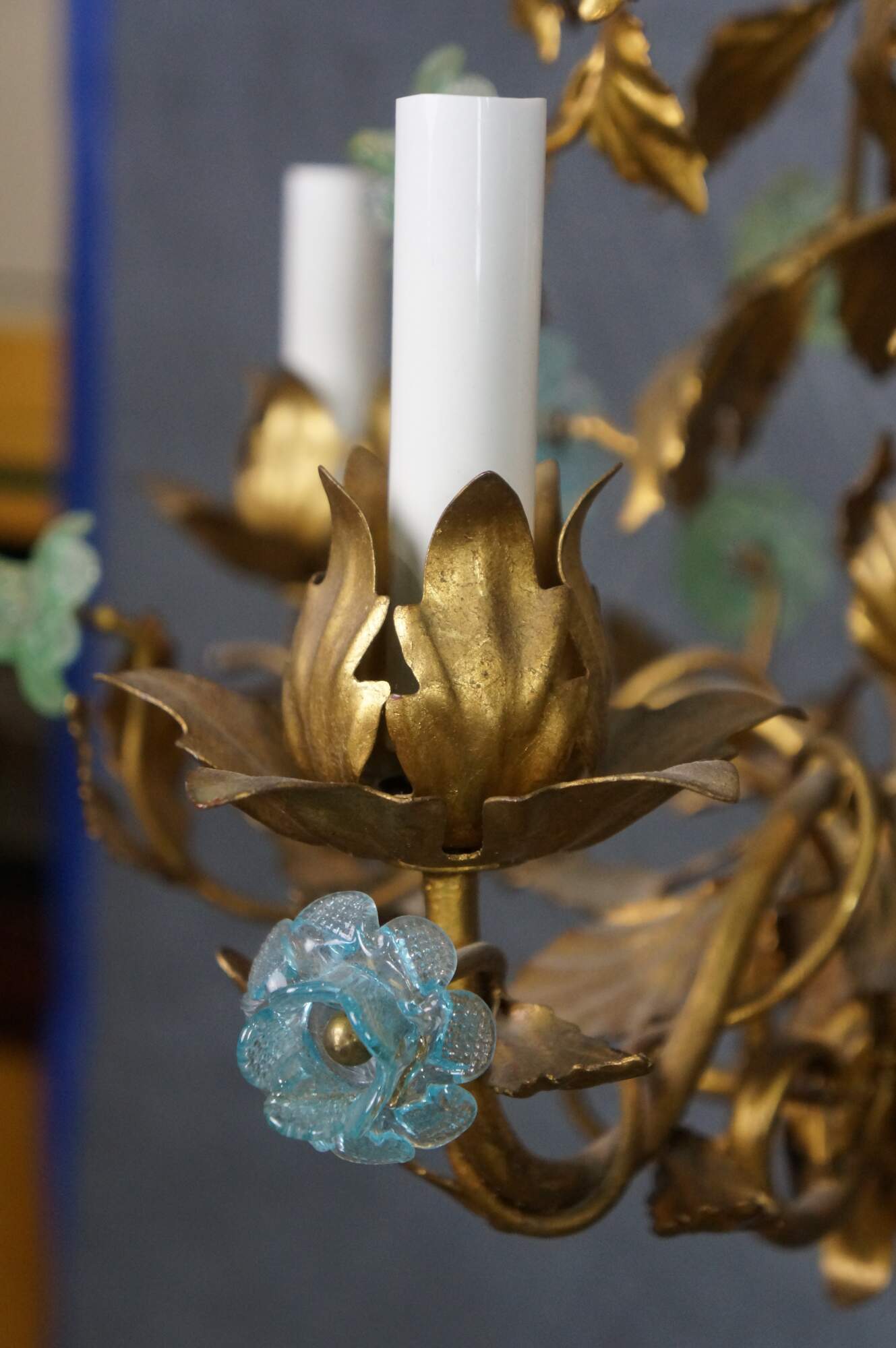 Vintage Italian Hollywood Regency Venetian Florentine Murano glass chandelier featuring gilt gold painted leaves, blue and green rosettes, and four candlestick lights. Circa 1970s.