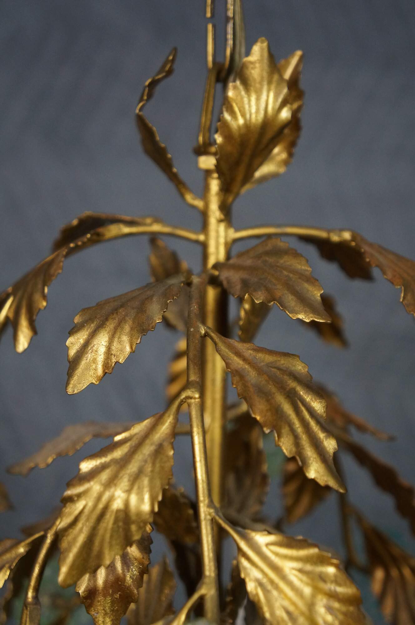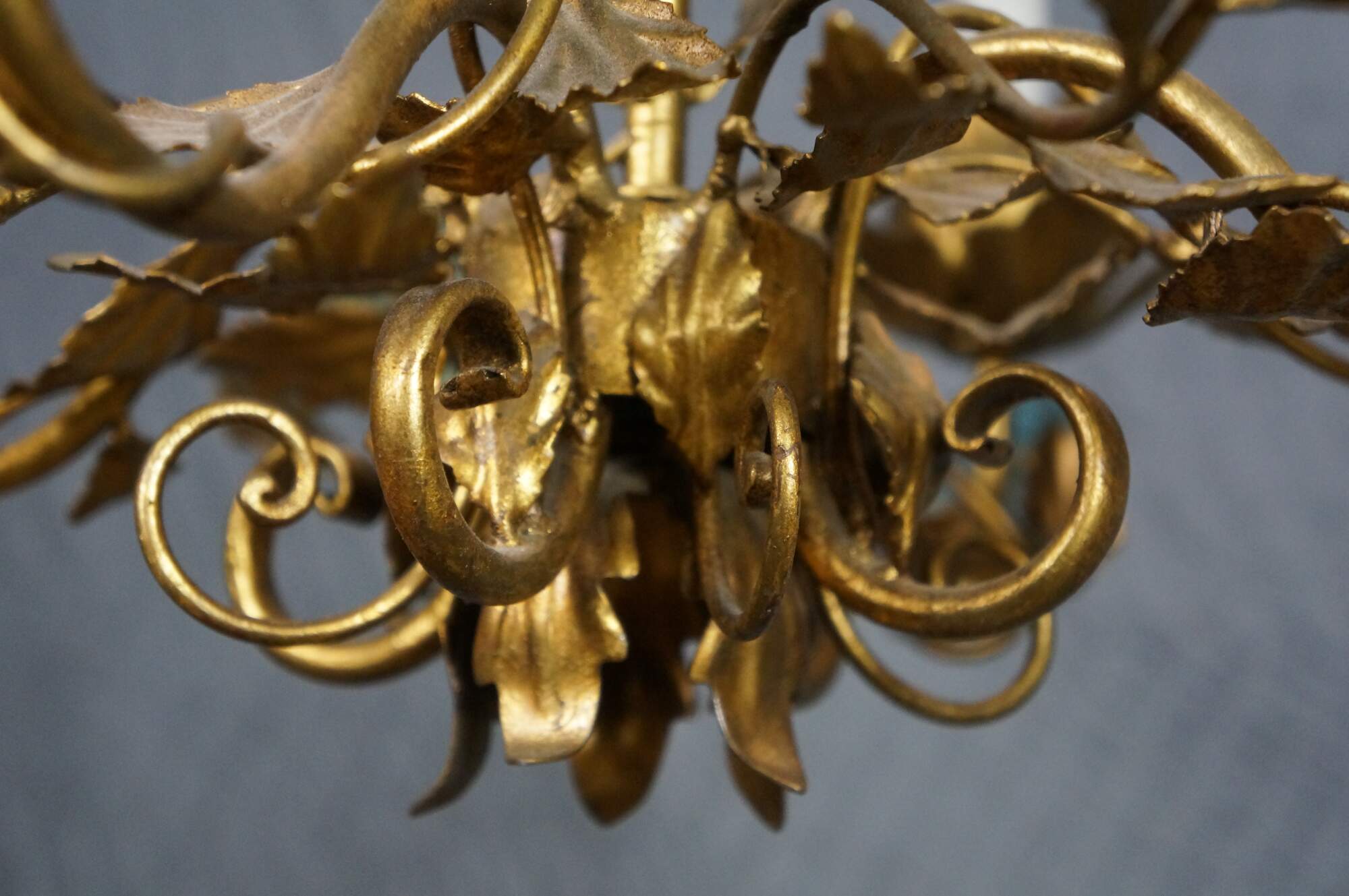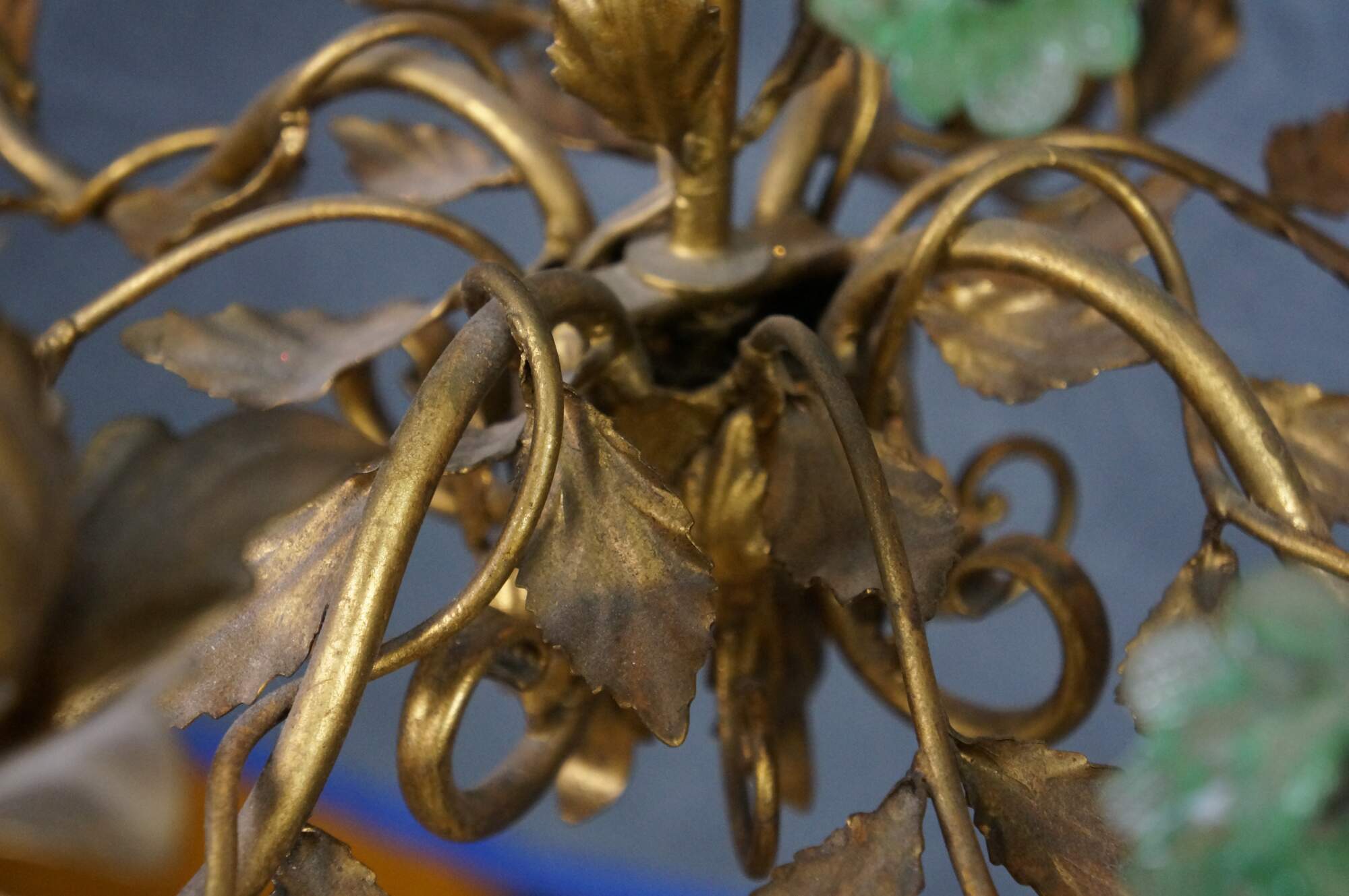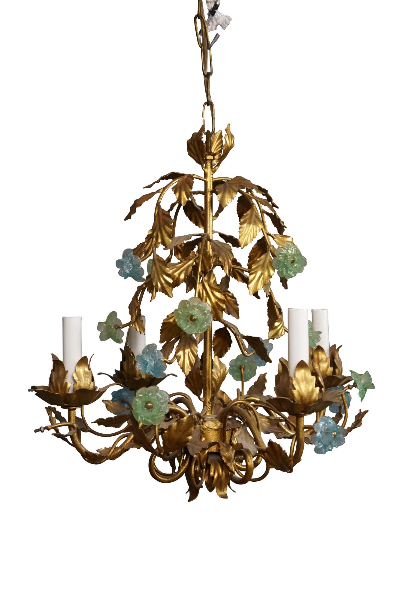 Vintage Italian Hollywood Regency Venetian Florentine Murano glass chandelier featuring gilt gold painted leaves, blue and green rosettes, and four candlestick lights. Circa 1970s.