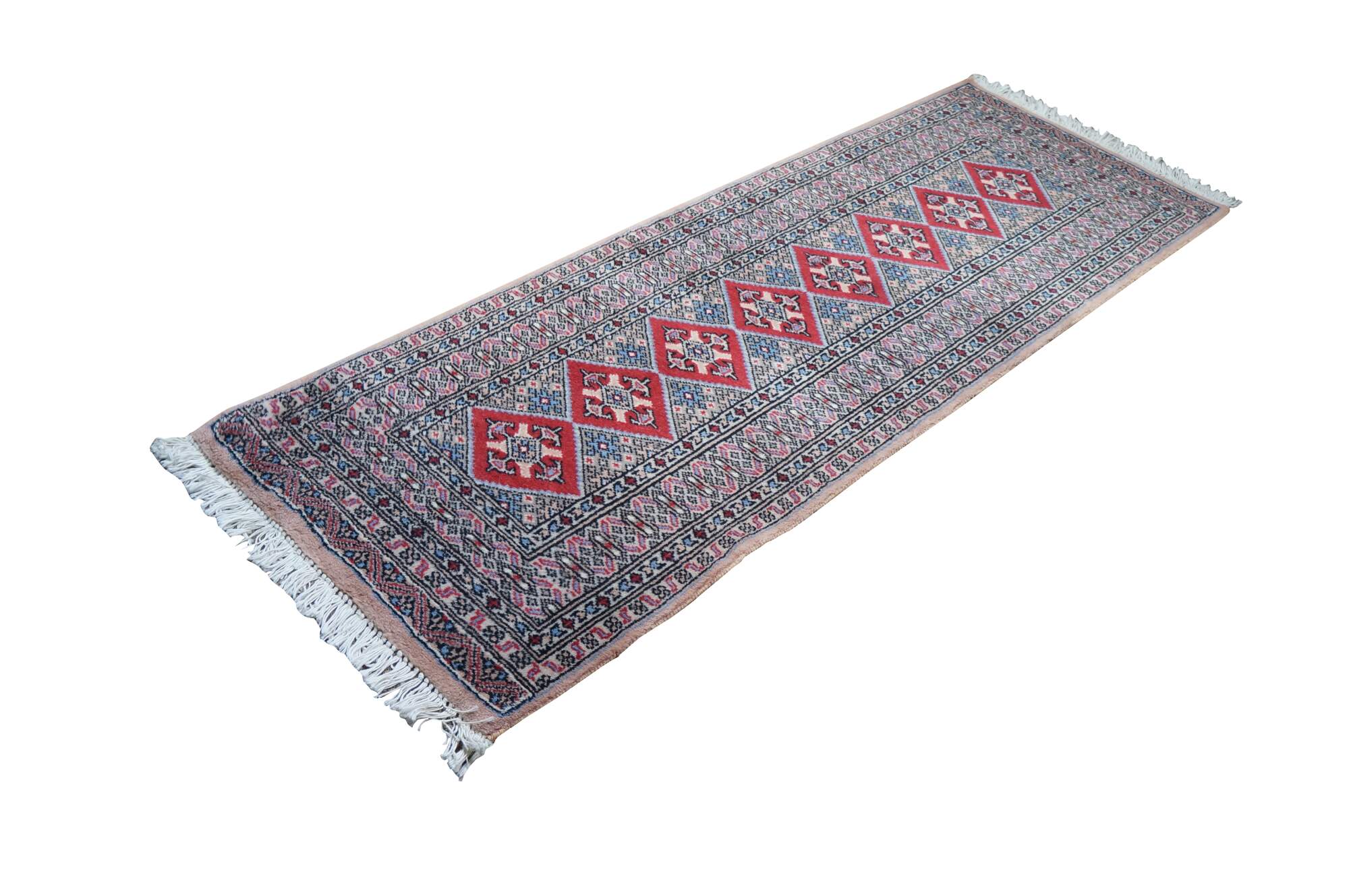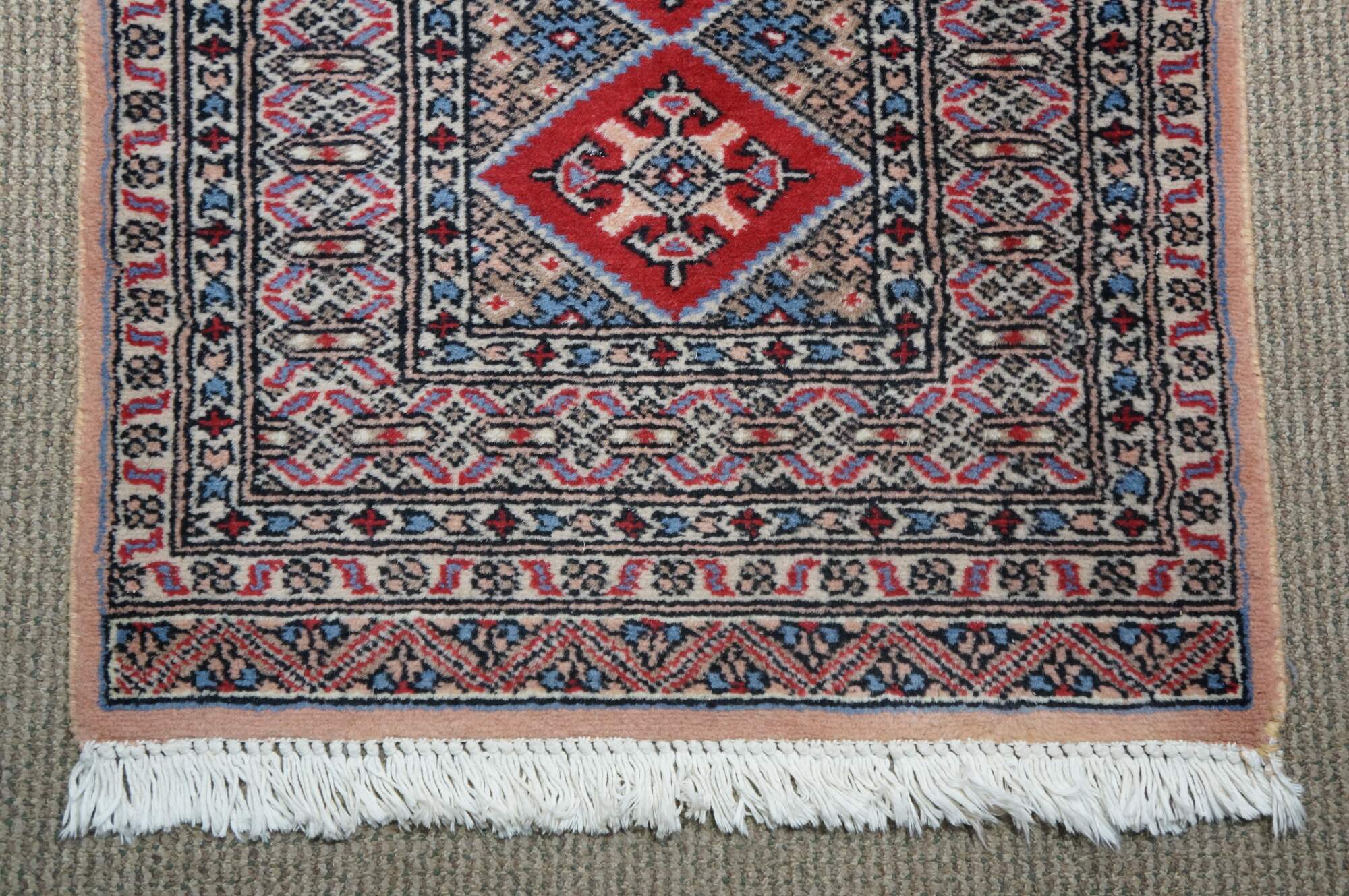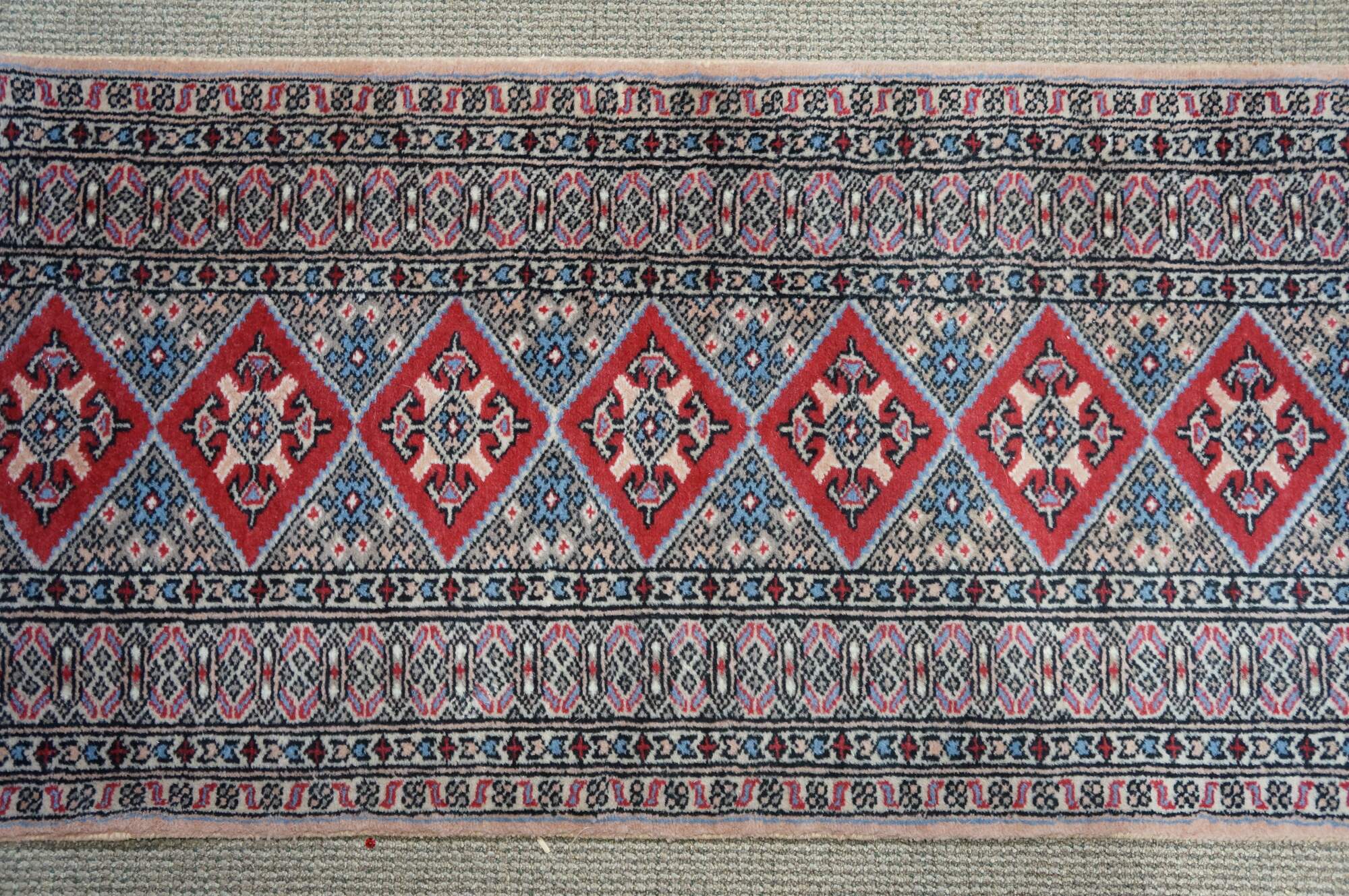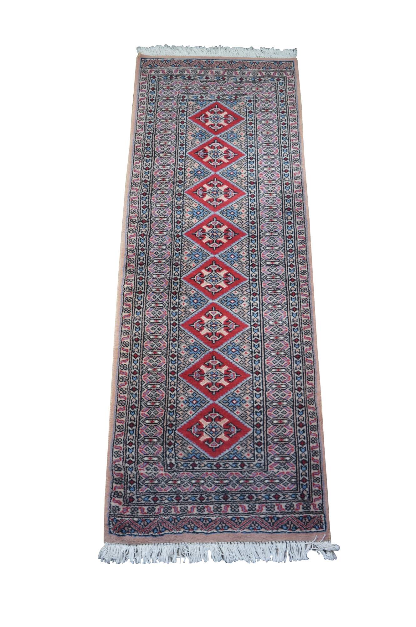Vintage Pakistan 100% wool Oriental rug runner featuring a geometric diamond pattern in reds, pink, beige, and blues.