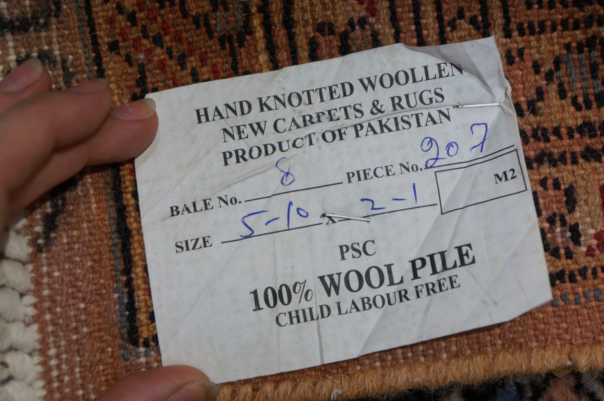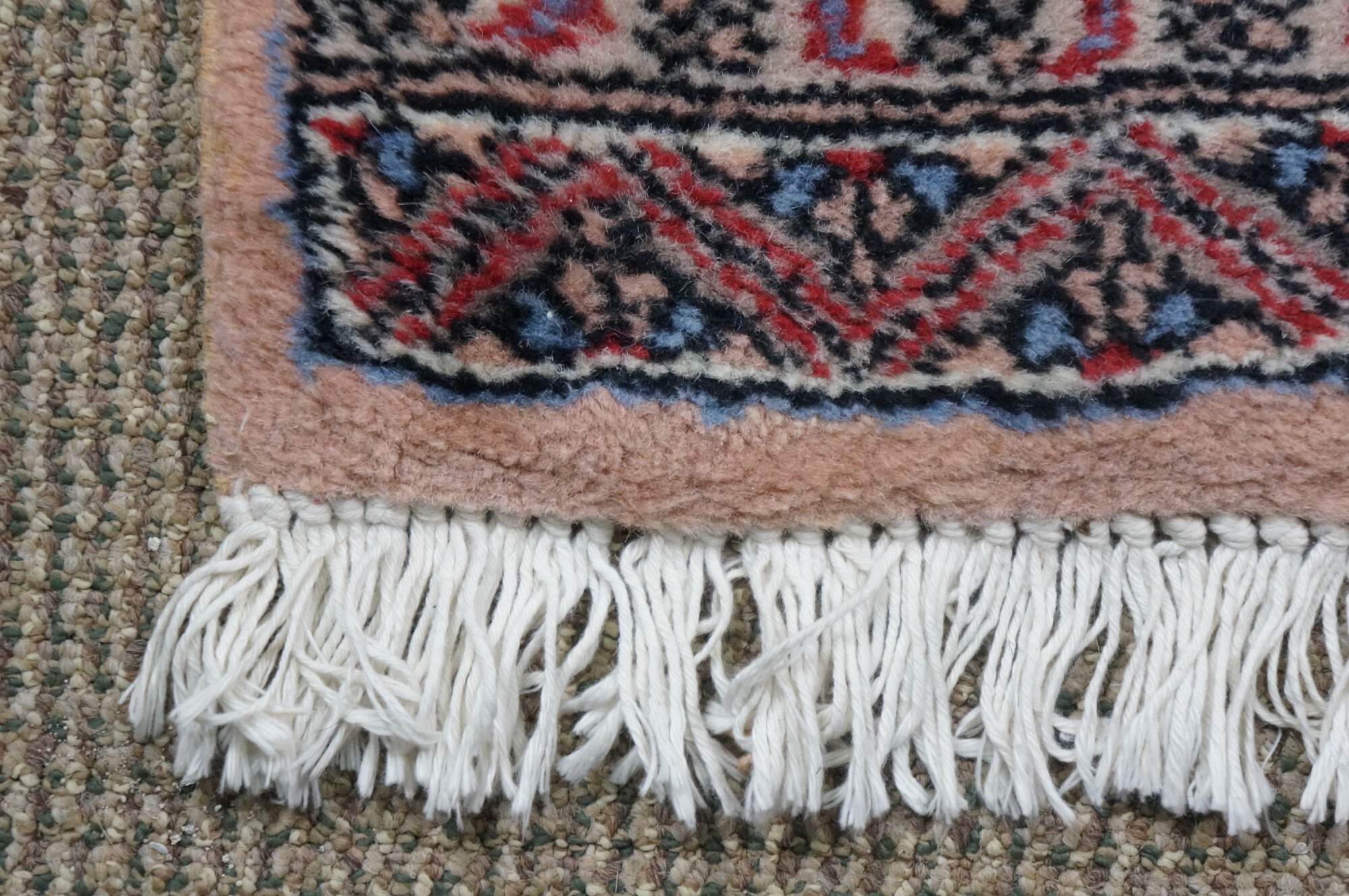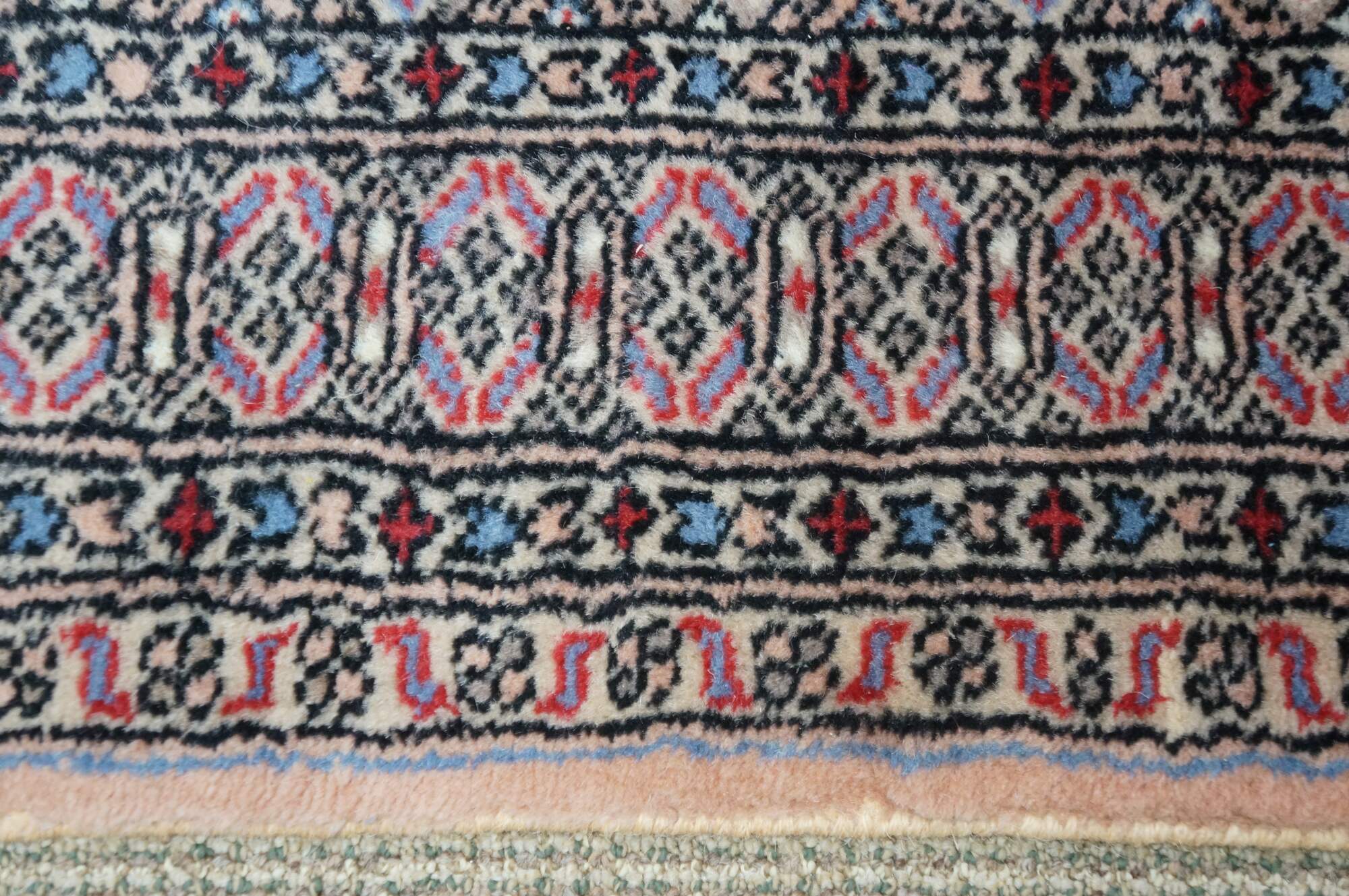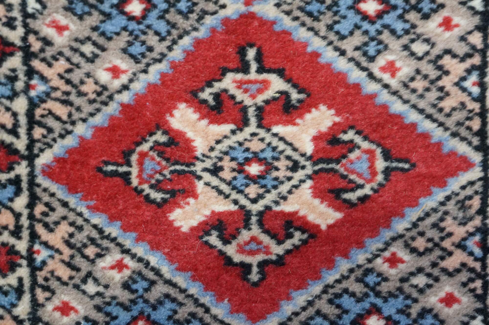 Vintage Pakistan 100% wool Oriental rug runner featuring a geometric diamond pattern in reds, pink, beige, and blues.