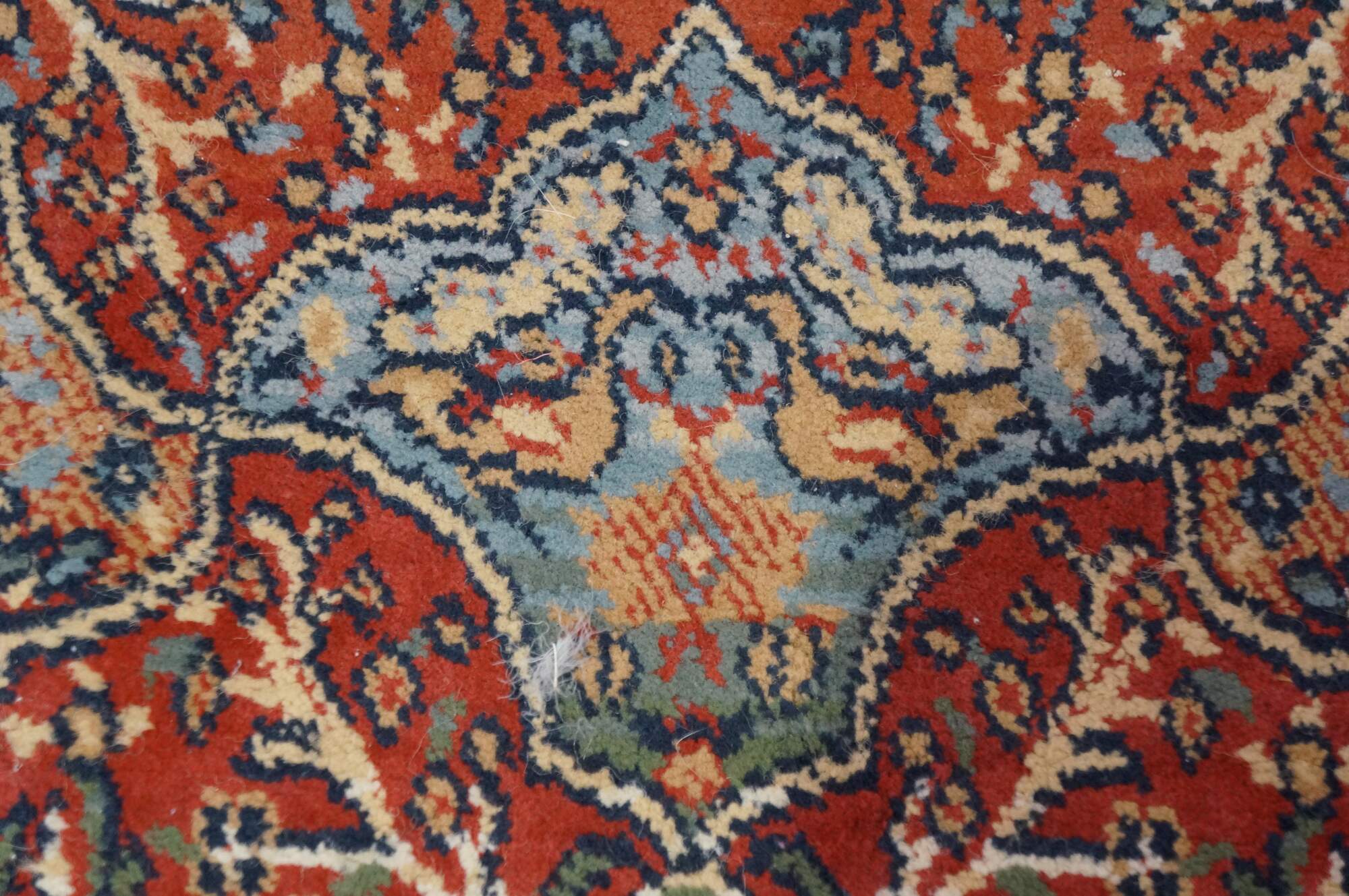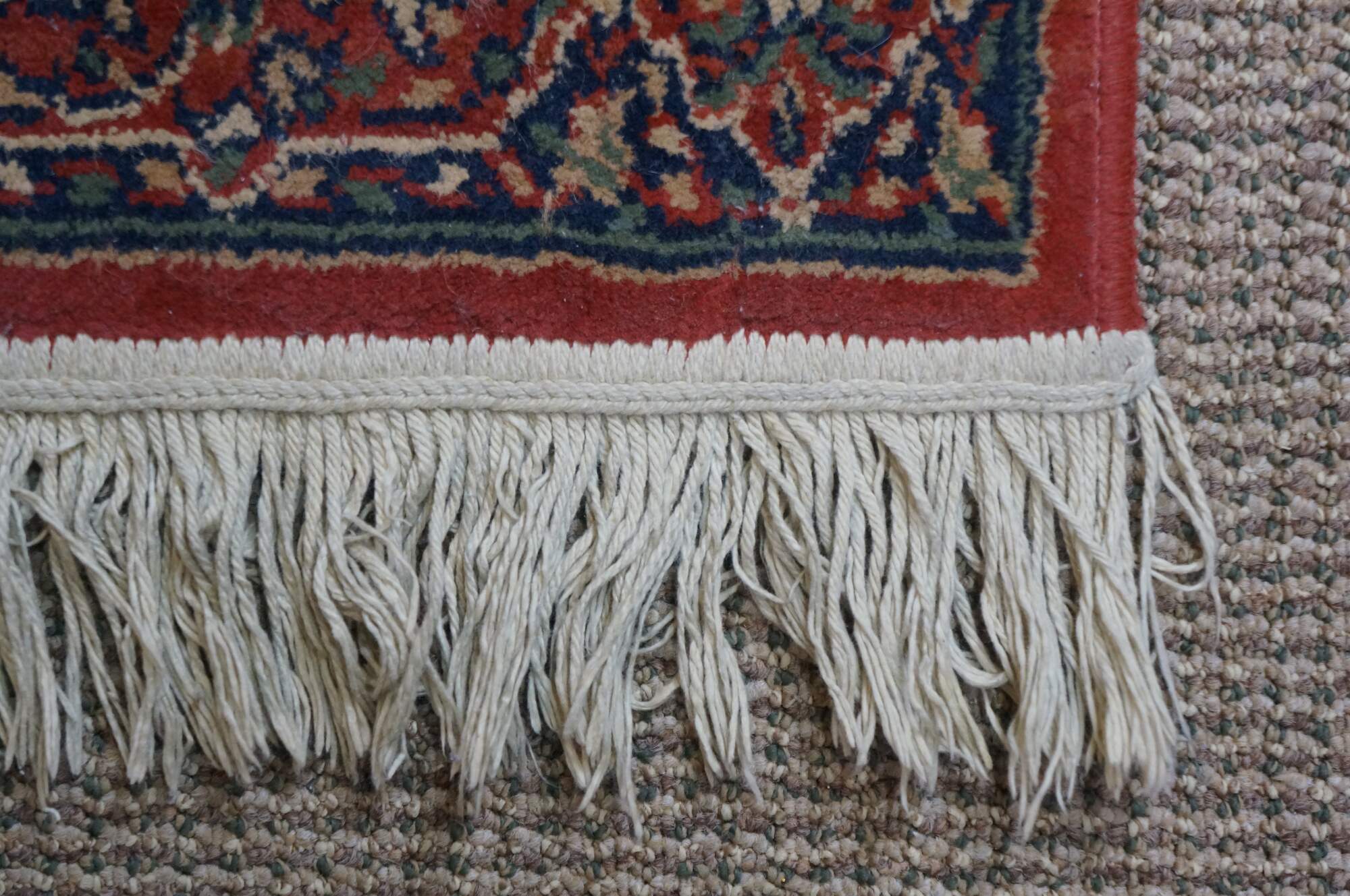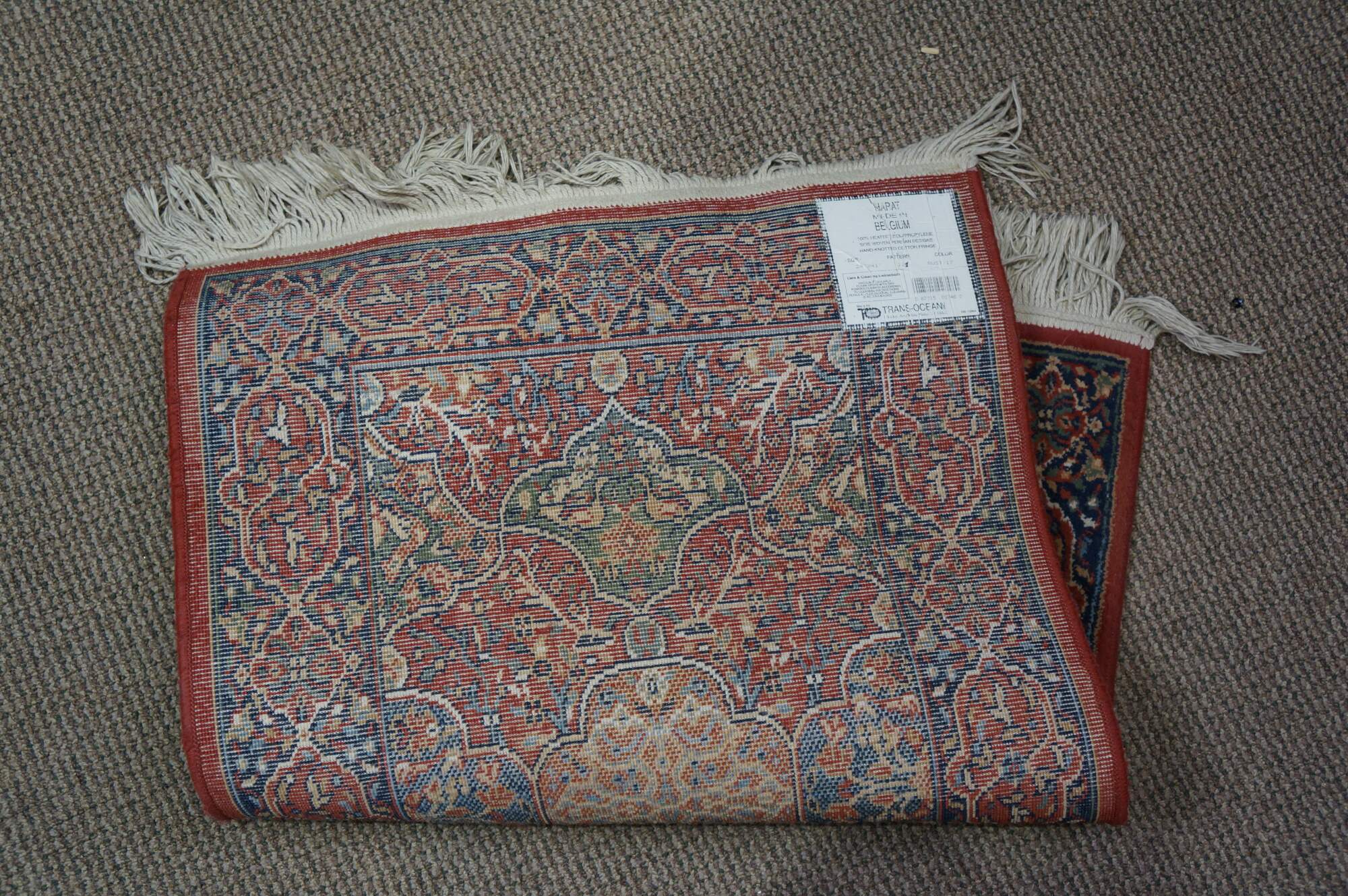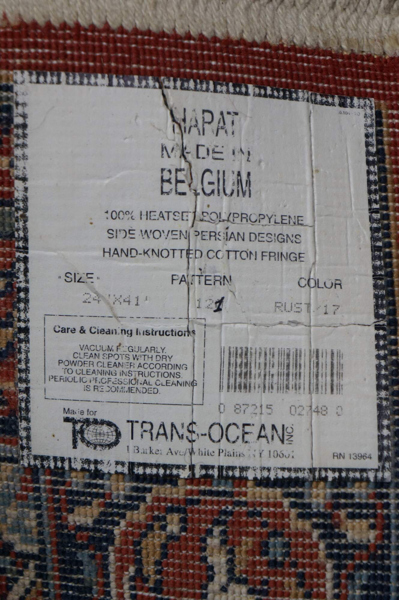 Vintage Belgian synthetic rug runner featuring a abstract floral medallion pattern in red, green, beige, and blue.
