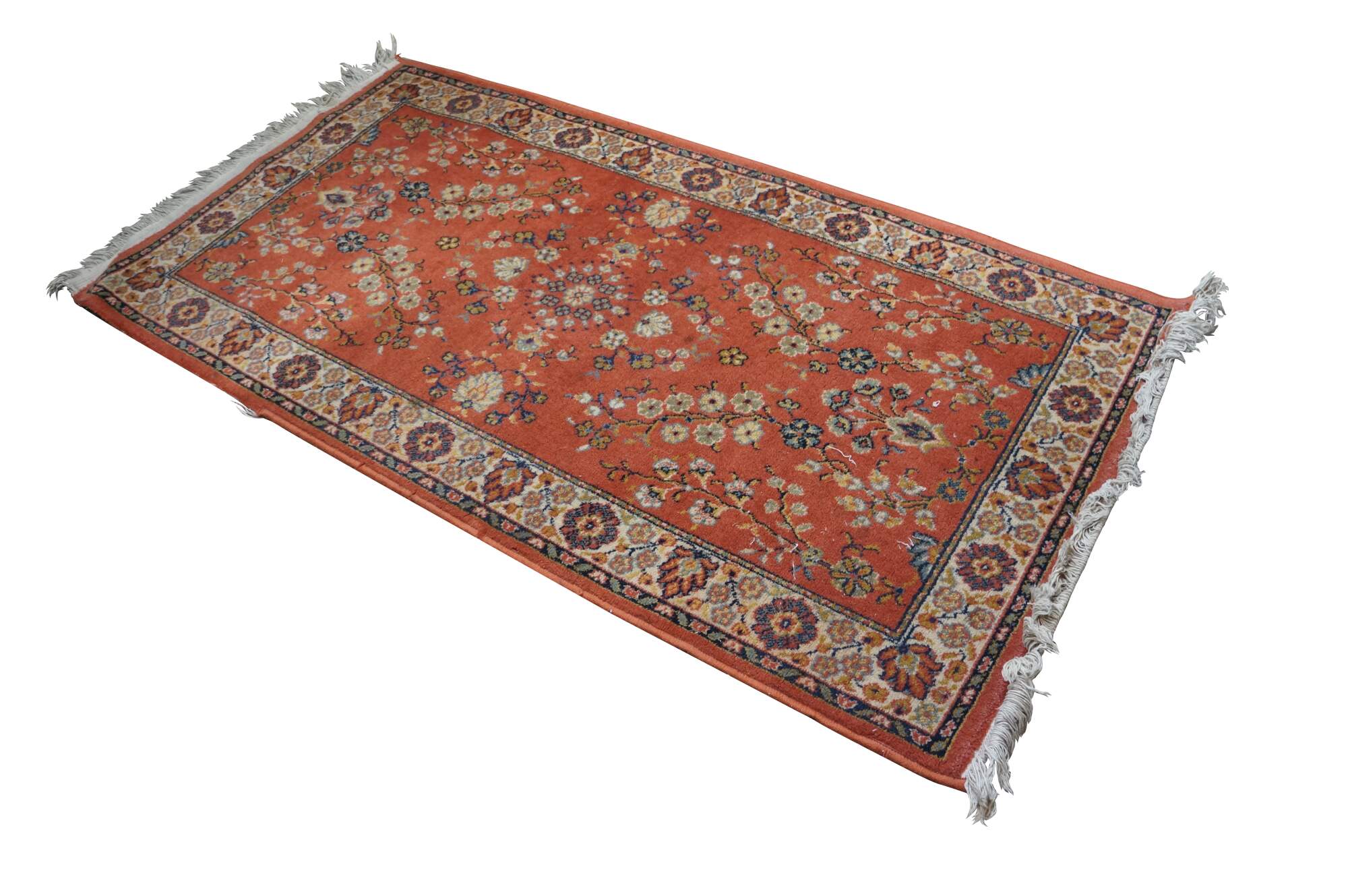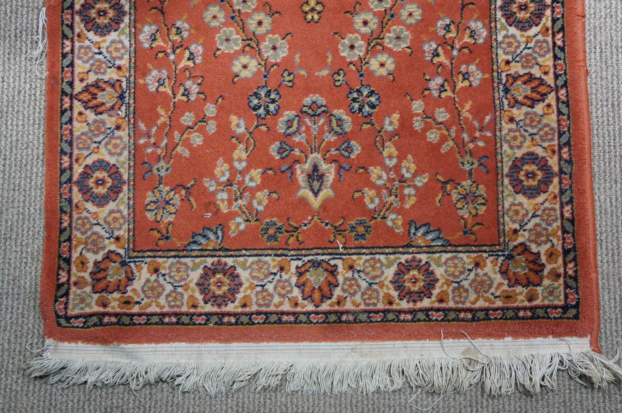Vintage German Belgium Orienta rug runner featuring a floral medallion design in red / orange, blue, pink, green, and beige.