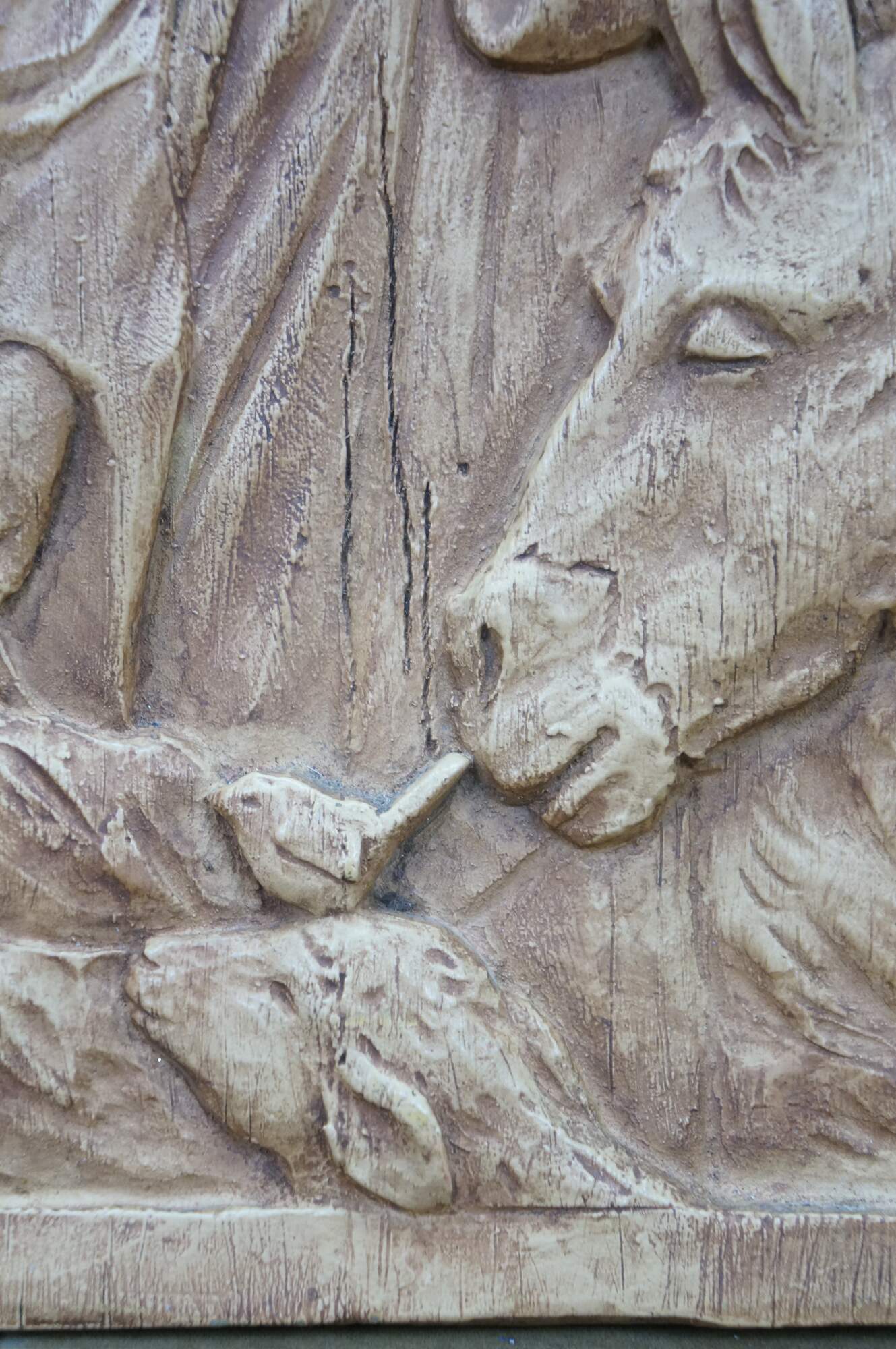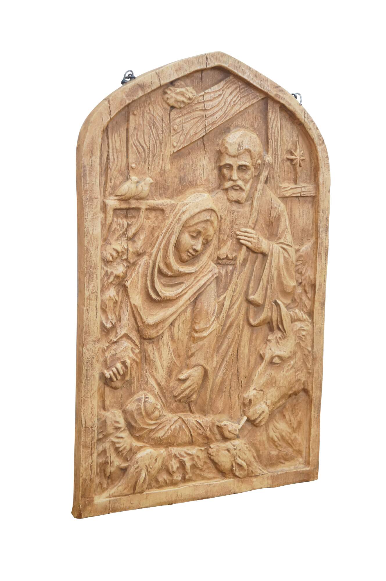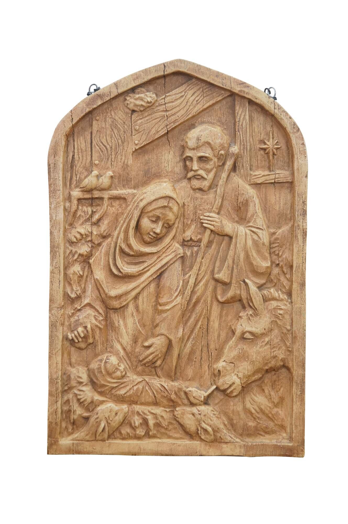 Vintage resin faux carved wood high relief Christmas Nativity plaque depicting the Holy Family (Mary, Joseph, and Baby Jesus) in a scene with birds, sheep and a donkey.