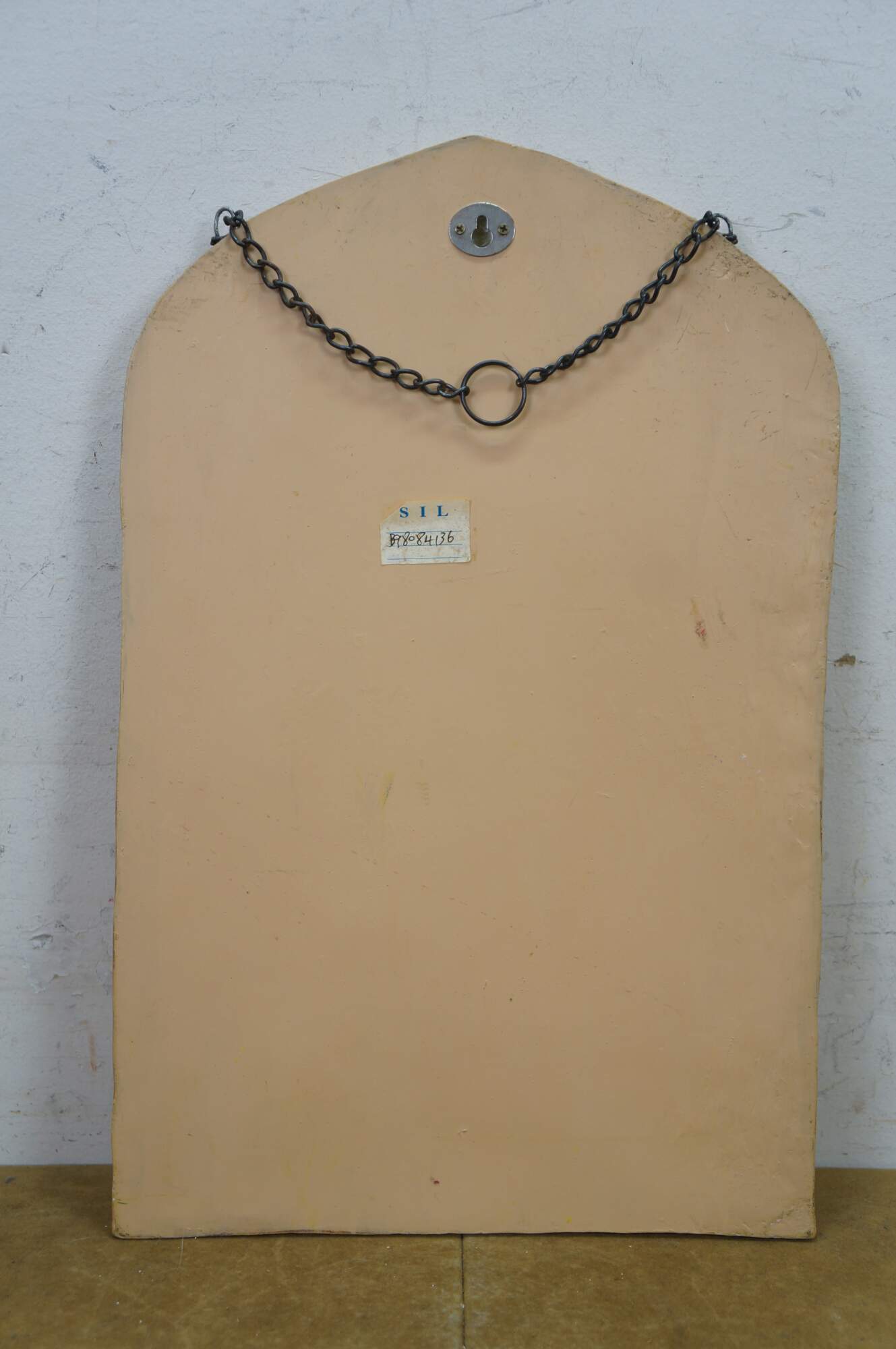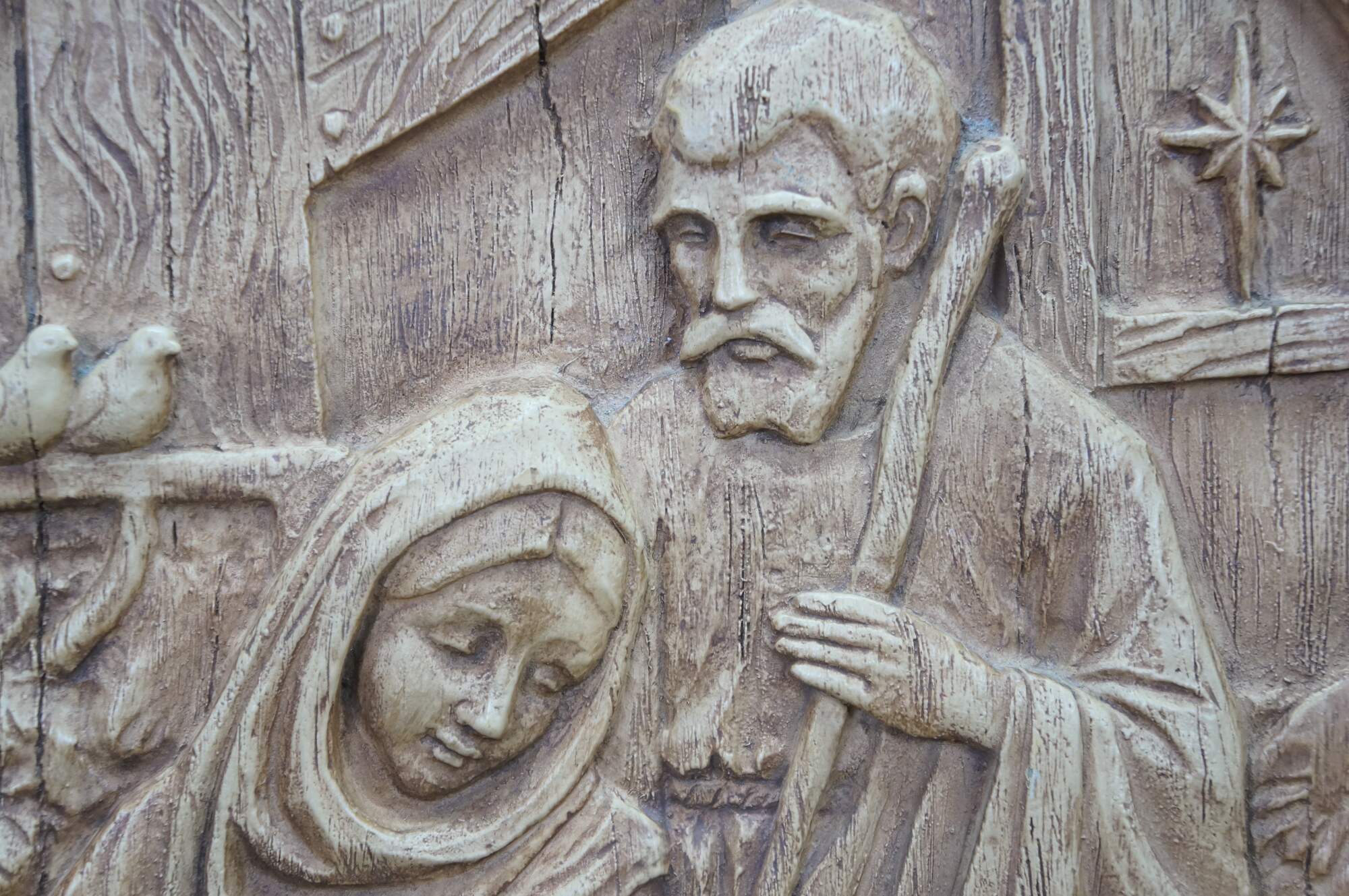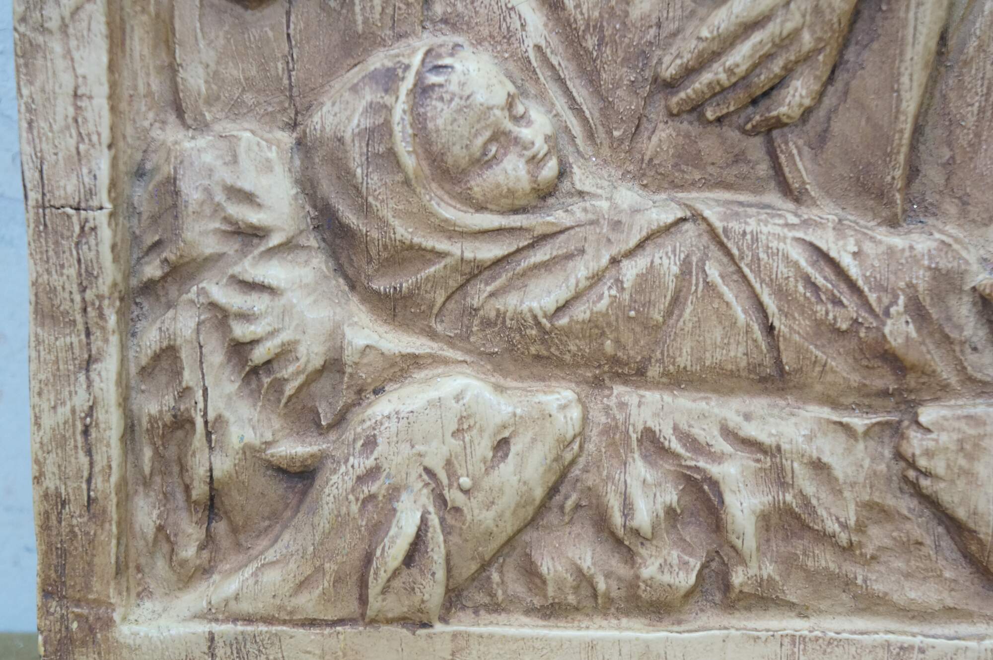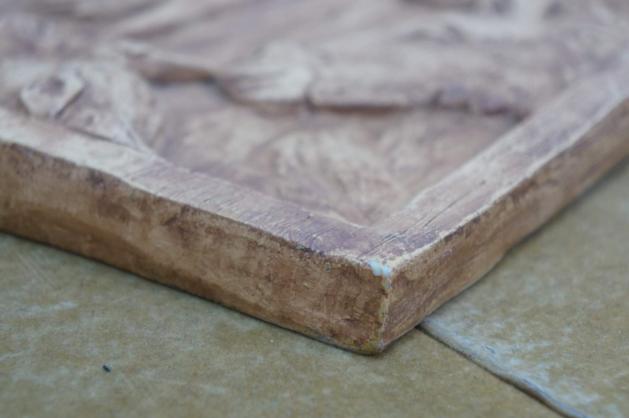 Vintage resin faux carved wood high relief Christmas Nativity plaque depicting the Holy Family (Mary, Joseph, and Baby Jesus) in a scene with birds, sheep and a donkey.