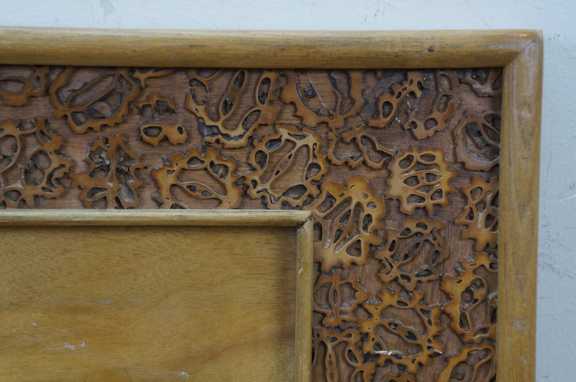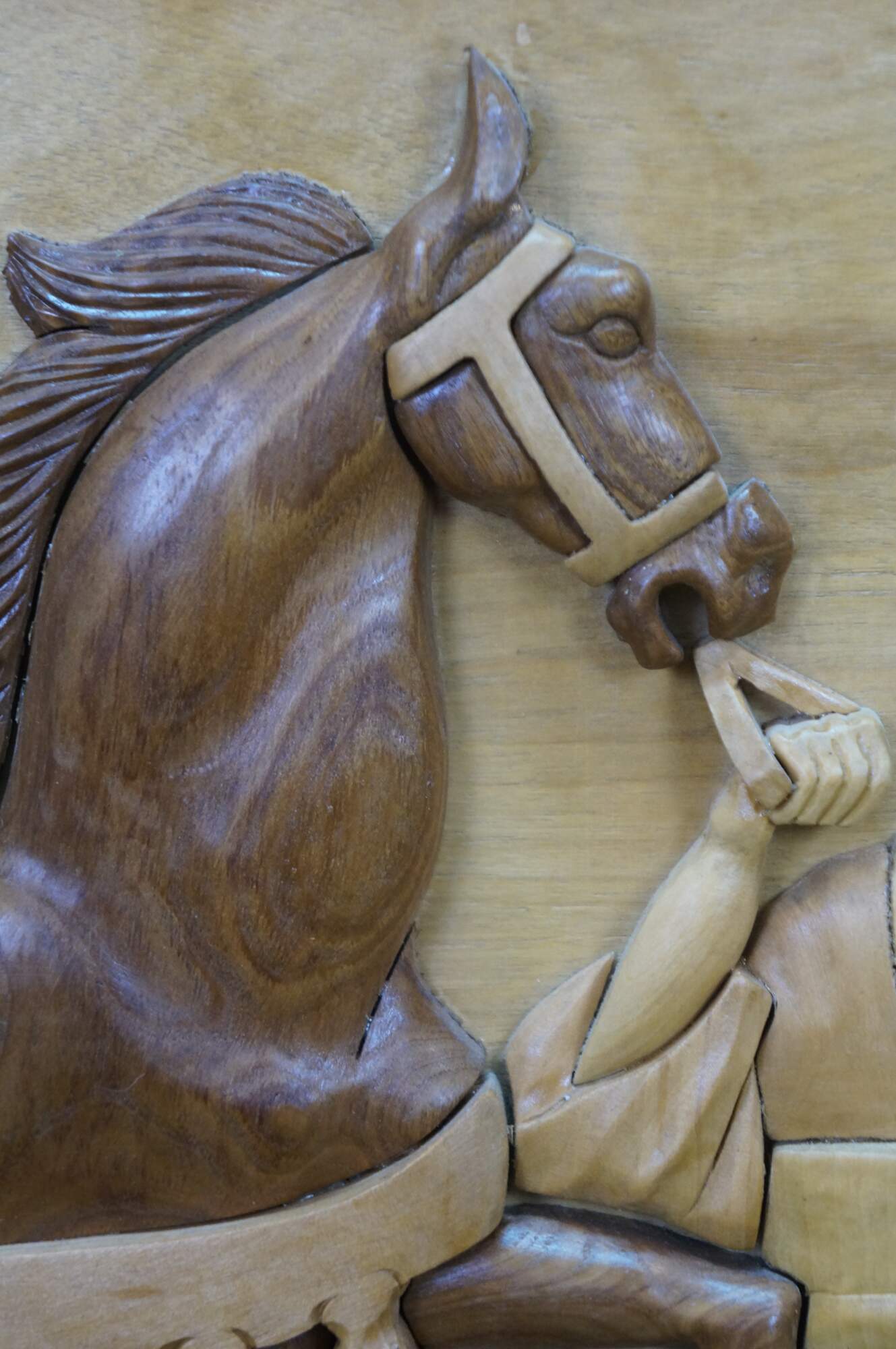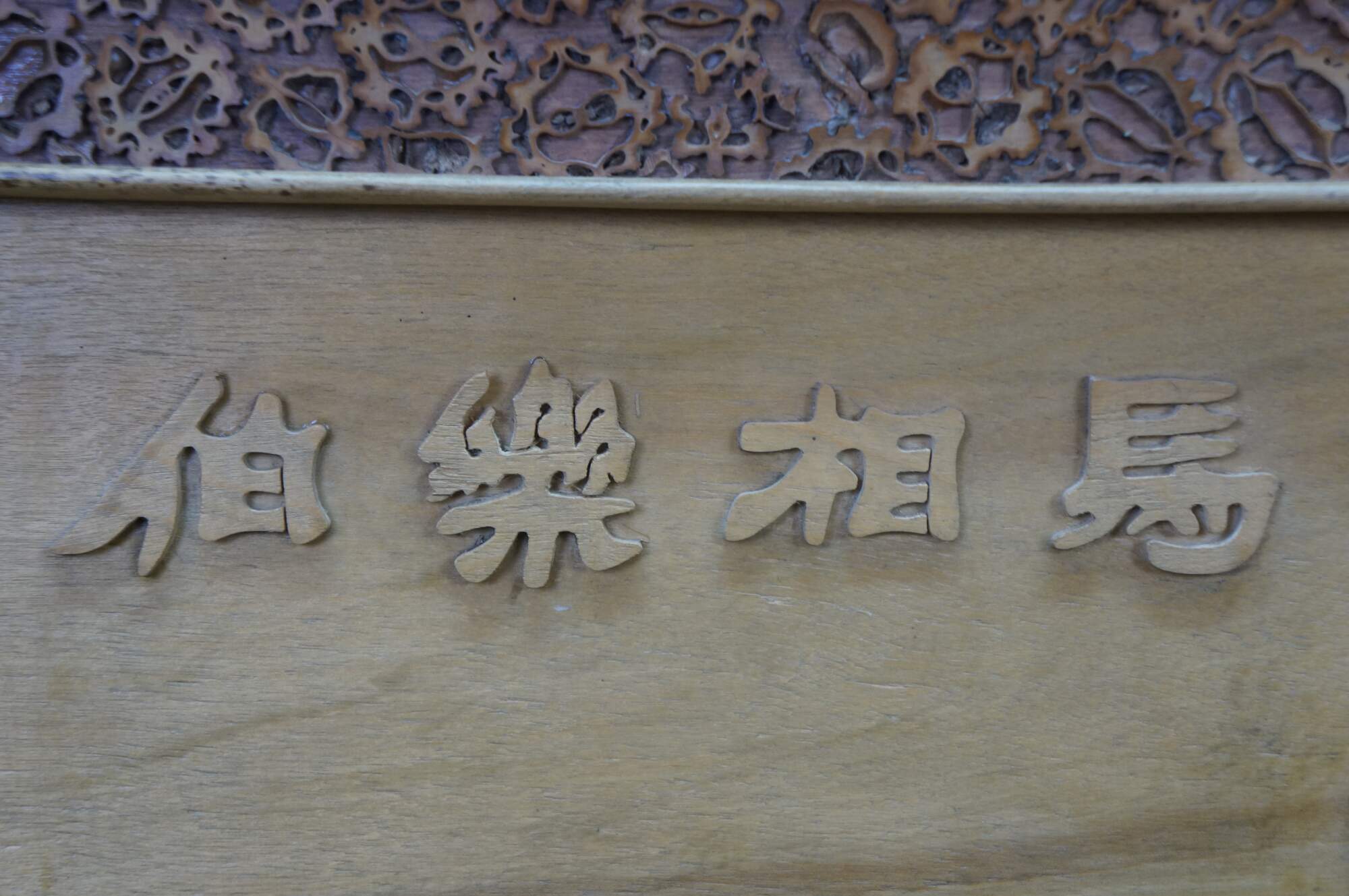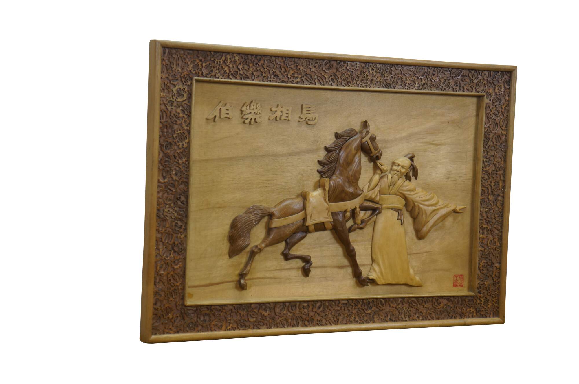 Vintage Chinese Chinoiserie hand-carved wood relief panel / plaque depicting the famous Chinese idiom Bole Xiang Ma (伯樂相馬), Calligraphy translates to Bole selecting a horse, and represents finding hidden talent. The scene shows Bole, a legendary figure known for his ability to judge horses, interacting with a fine Tang horse. The legendary horse-tamer, who possessed the unique ability to recognize a qianlima 千里馬, thousand-li horse, a rare horse capable of galloping 400 km in a day. Frame border features sliced silvers of what appear to be walnuts.