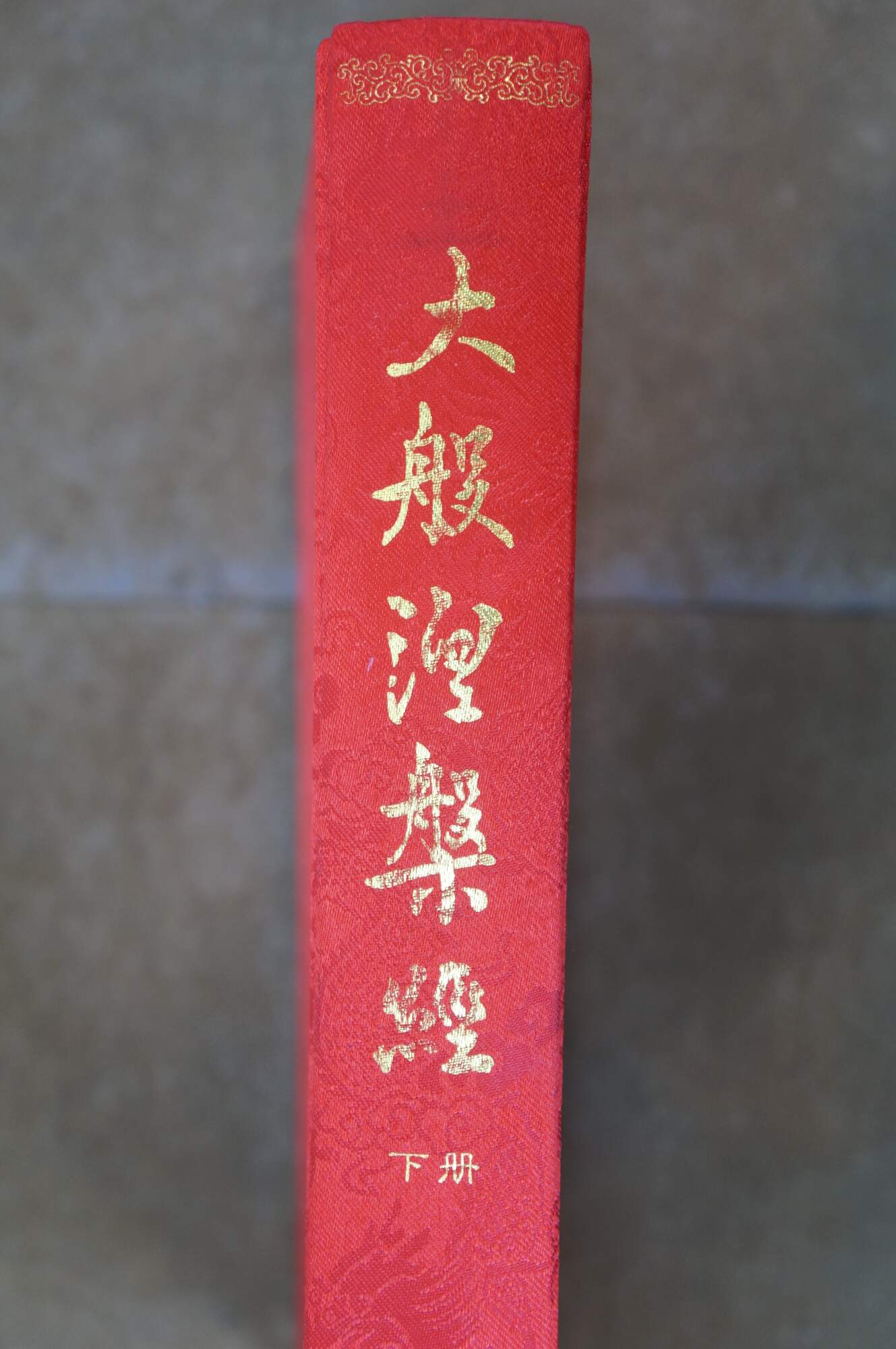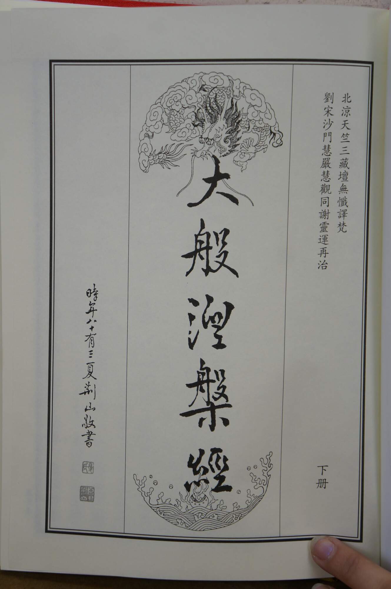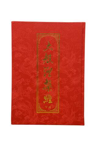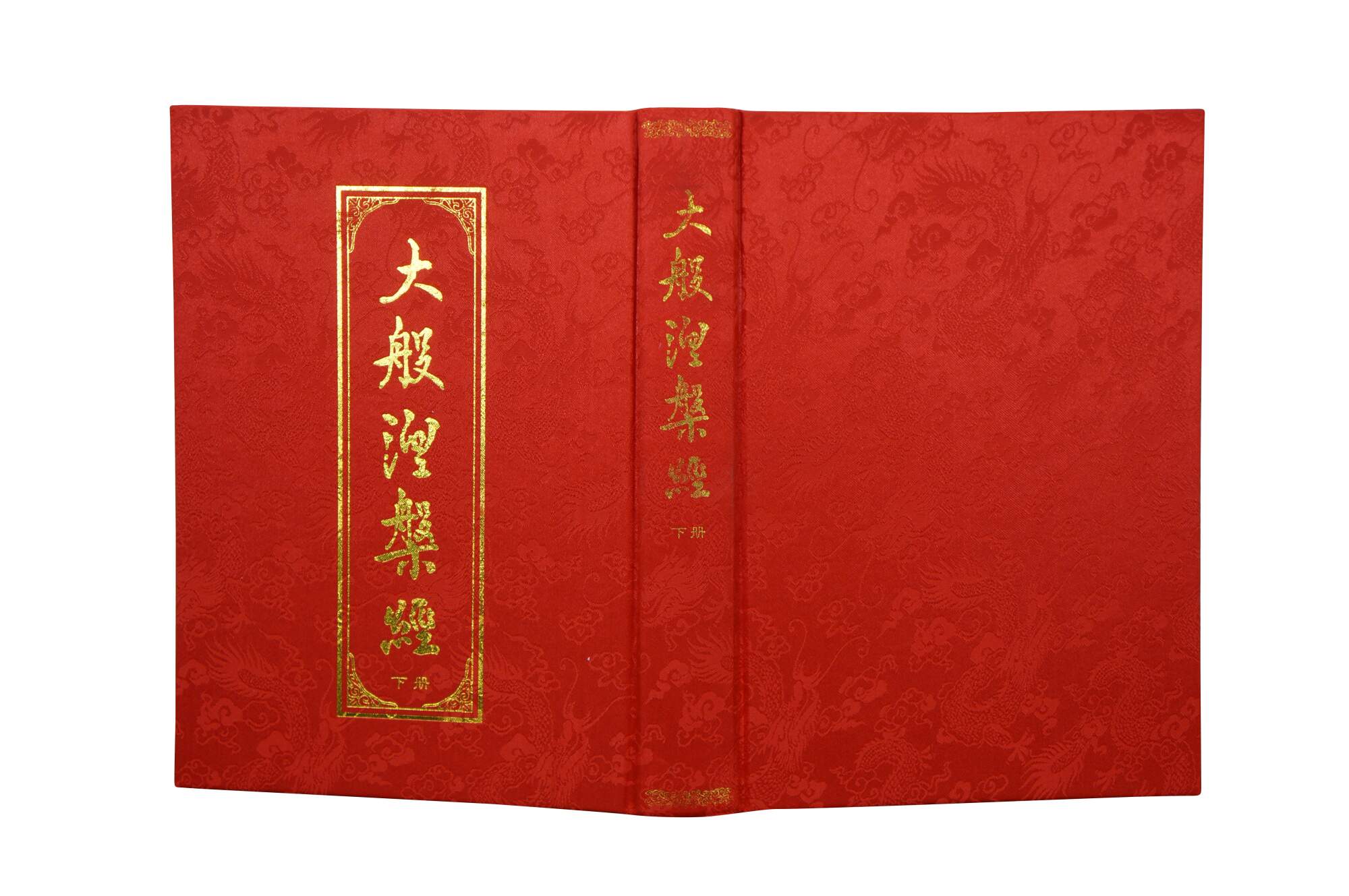 Vintage Chinese Buddhist text known as the Mahaparinirvana Sutra. The cover features gold calligraphy and five toed dragons on a red sky.