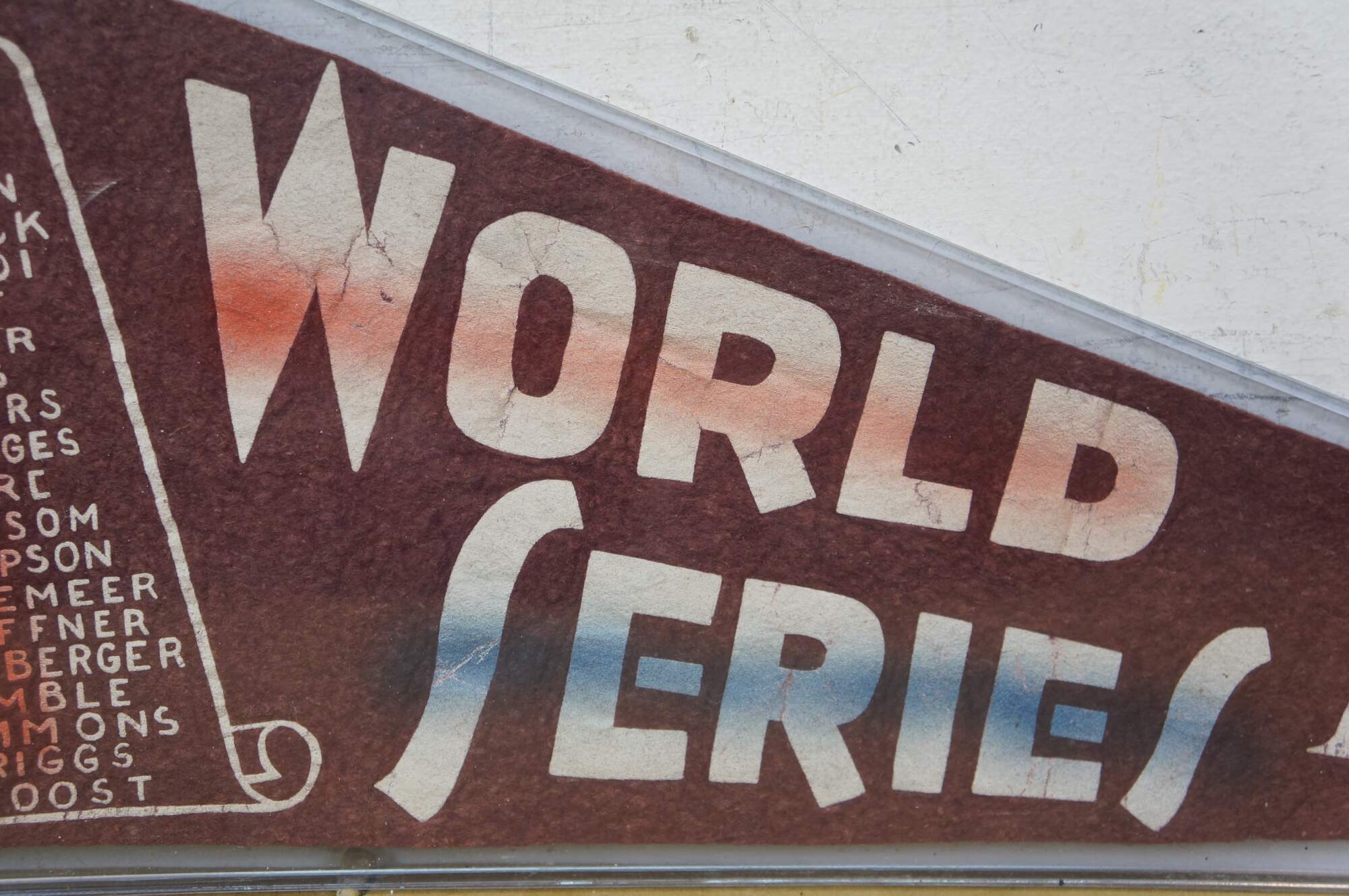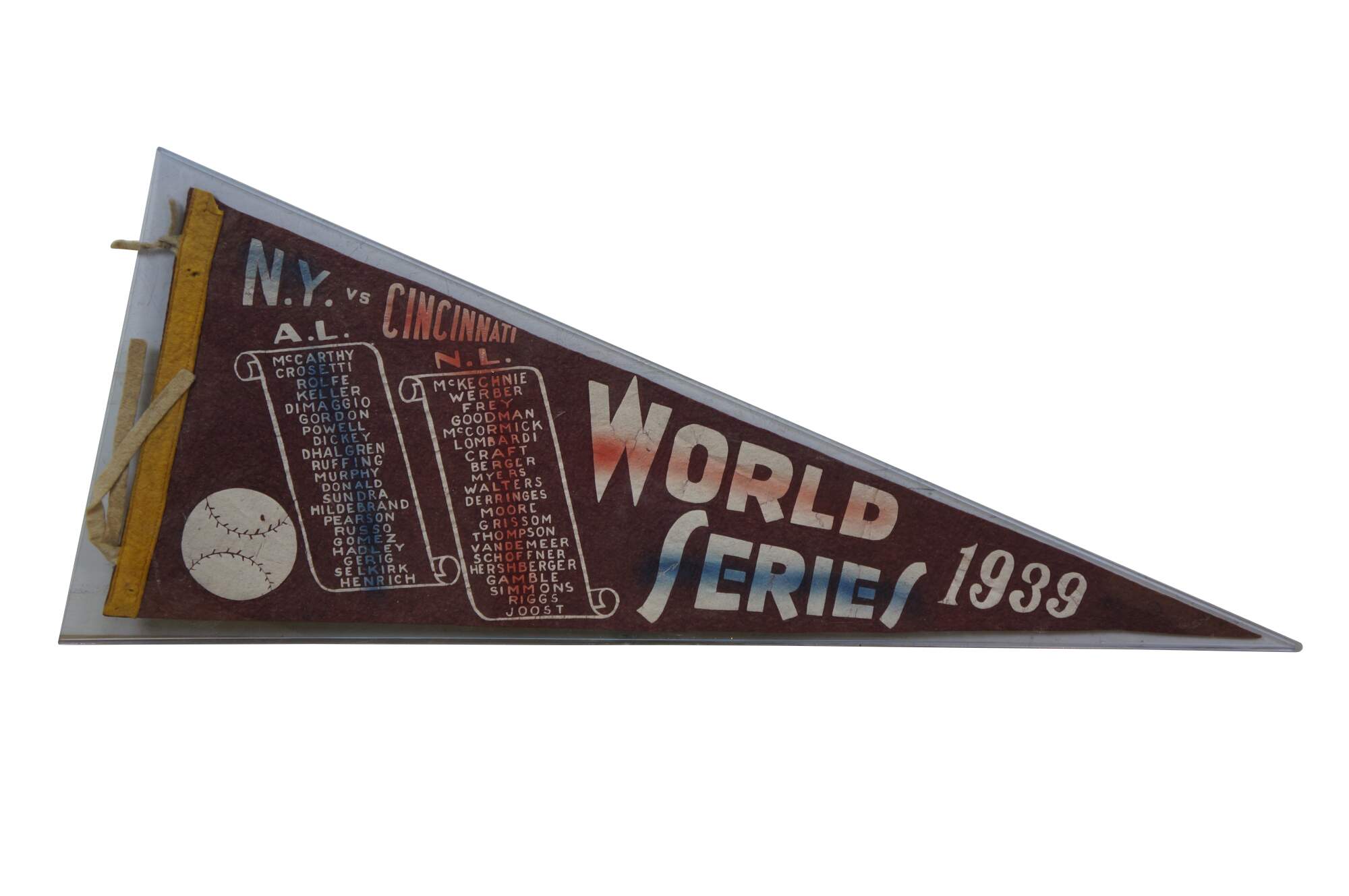 Rare antique 1939 Major League Baseball World Series team roster felt pennant commemorating the MLB championship matchup between the New York Yankees and the Cincinnati Reds. It lists the rosters for both teams, featuring legendary players like Joe DiMaggio and Lue Gehrig (which was misspelled) for the Yankees and Ernie Lombardi for the Reds. The 1939 World Series resulted in a four-game sweep by the New York Yankees, marking their fourth consecutive championship.