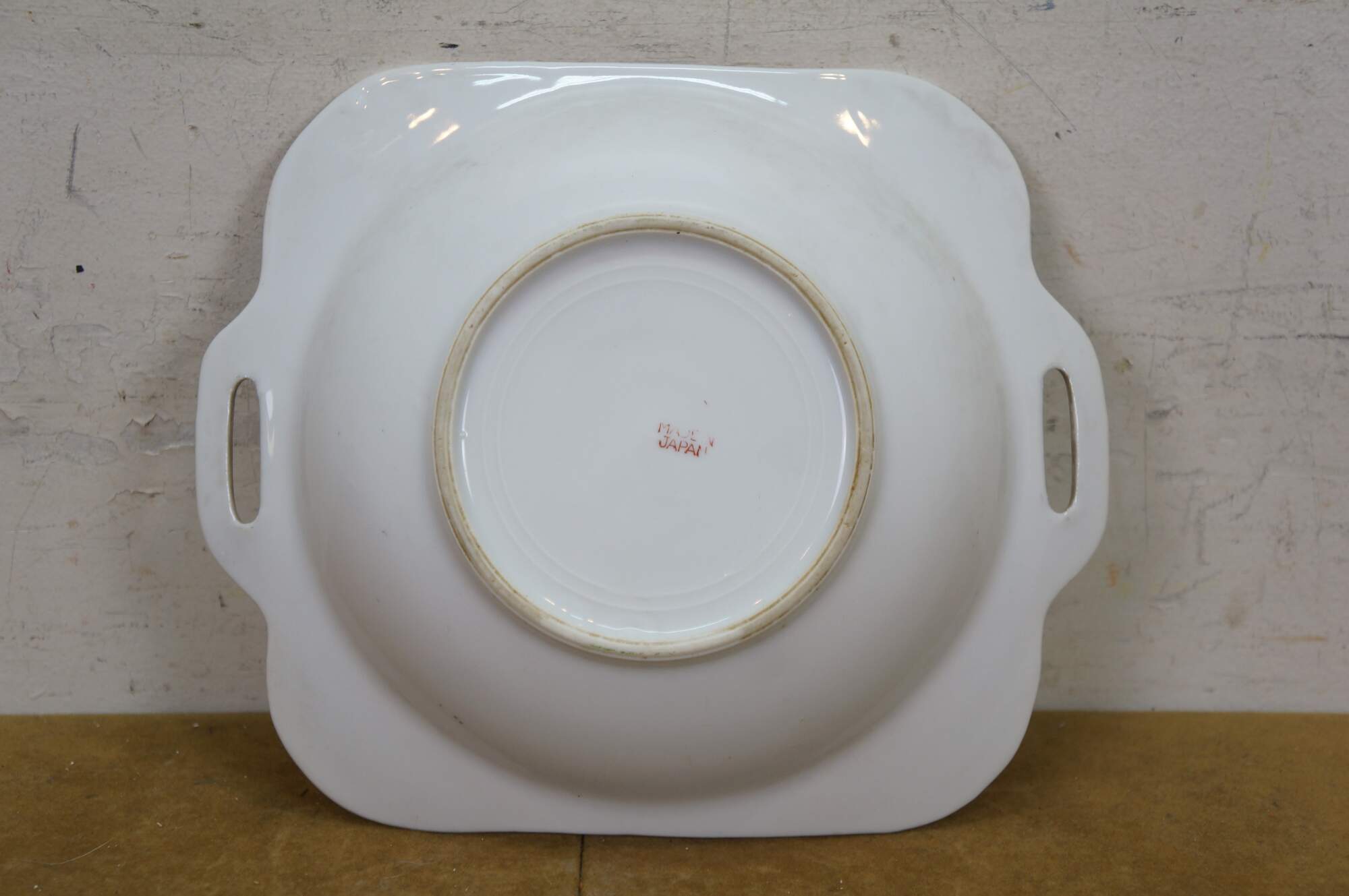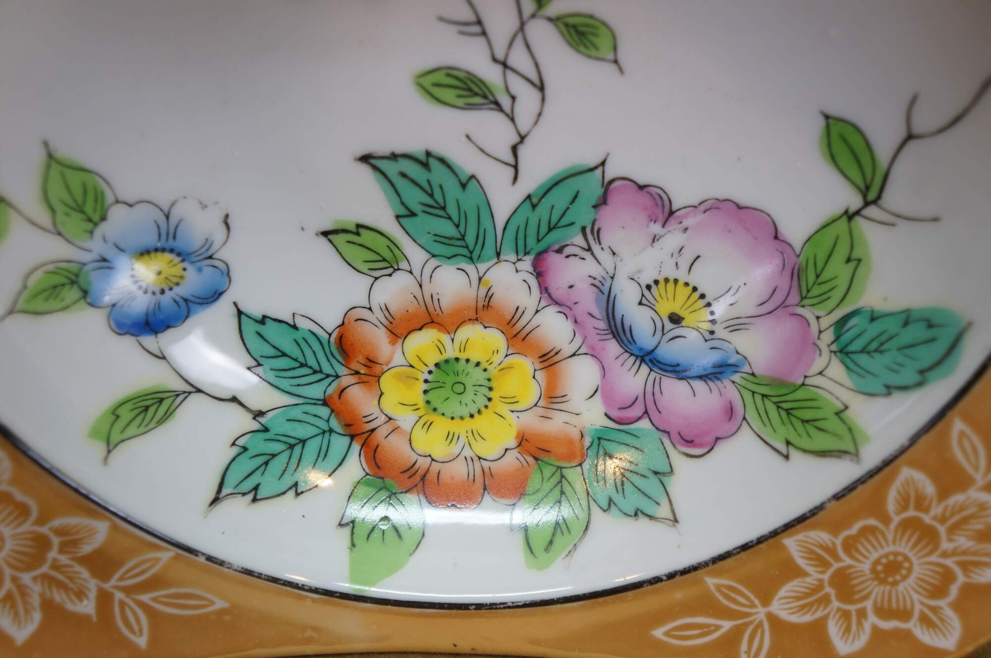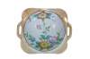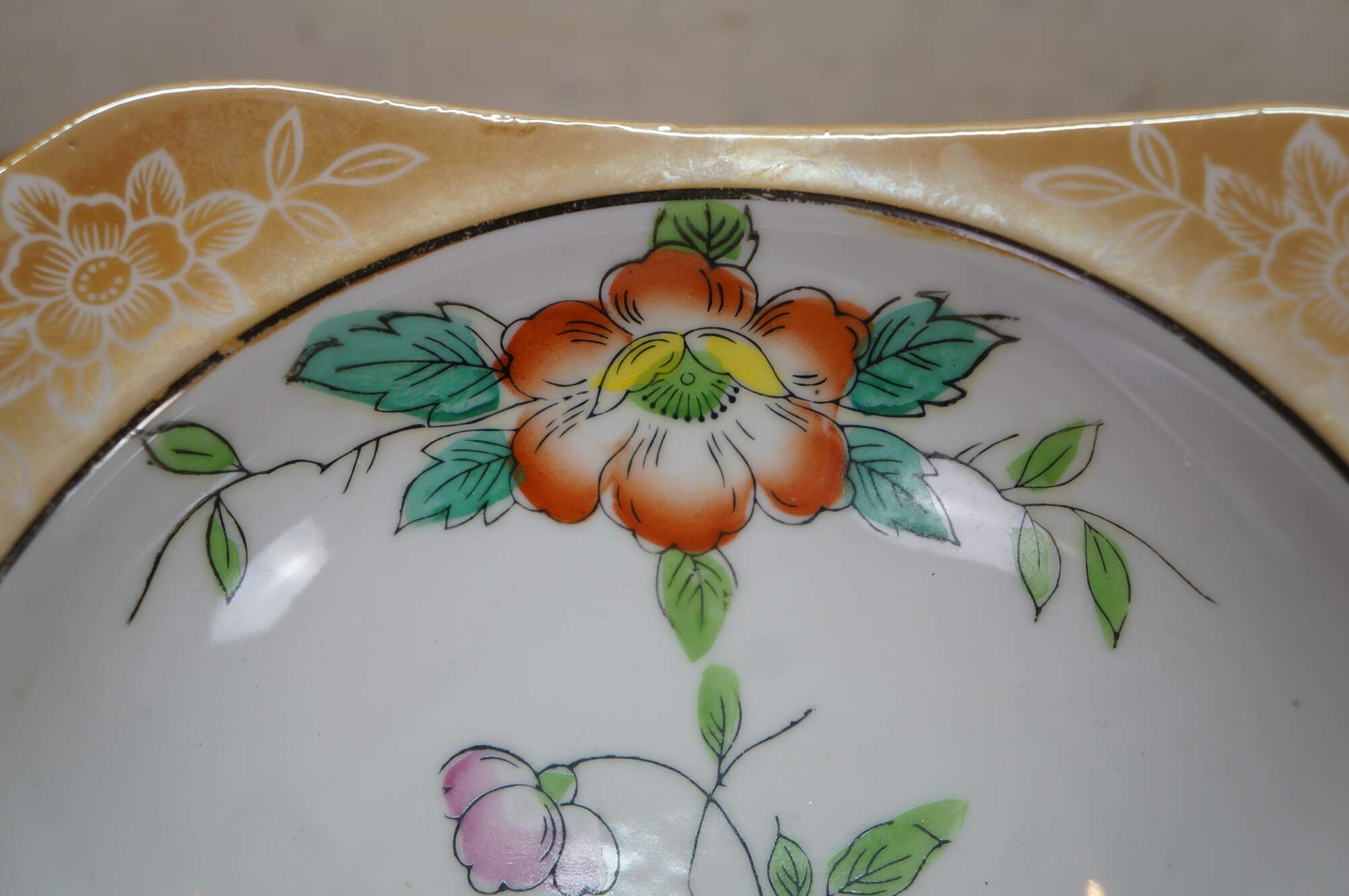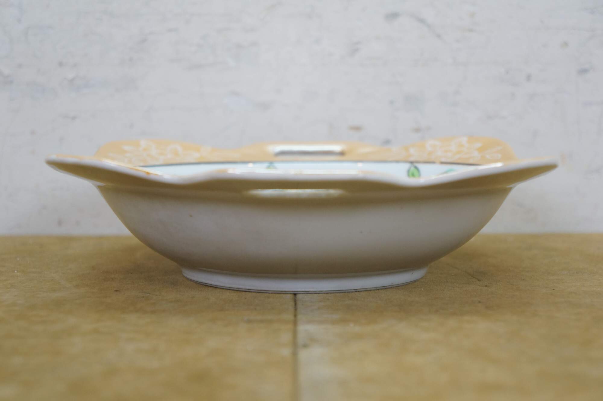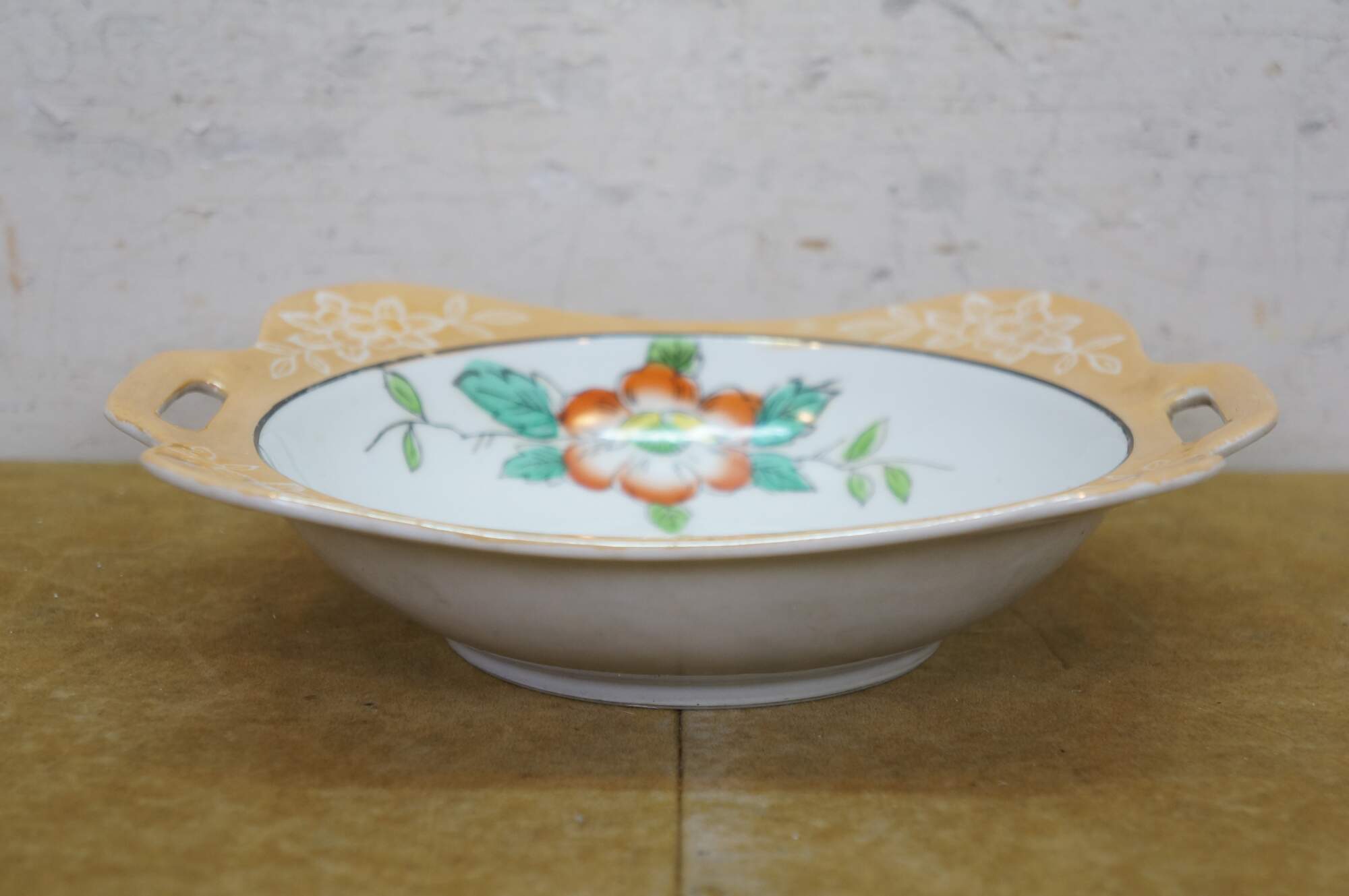 Vintage Japanese lusterware serving bowl featuring a hand-painted floral design on a porcelain body with a lustrous peach or tan border and side handles. Made in Japan, circa 1930s.
