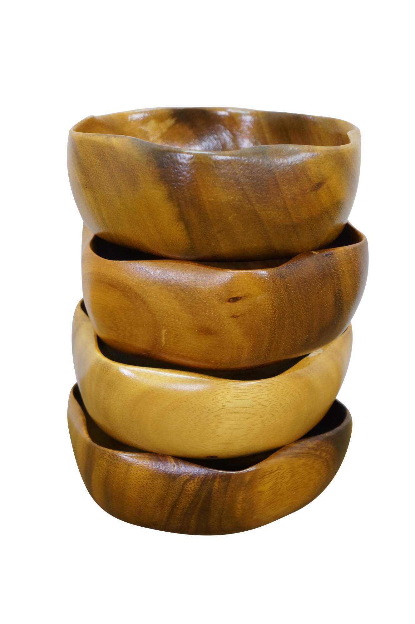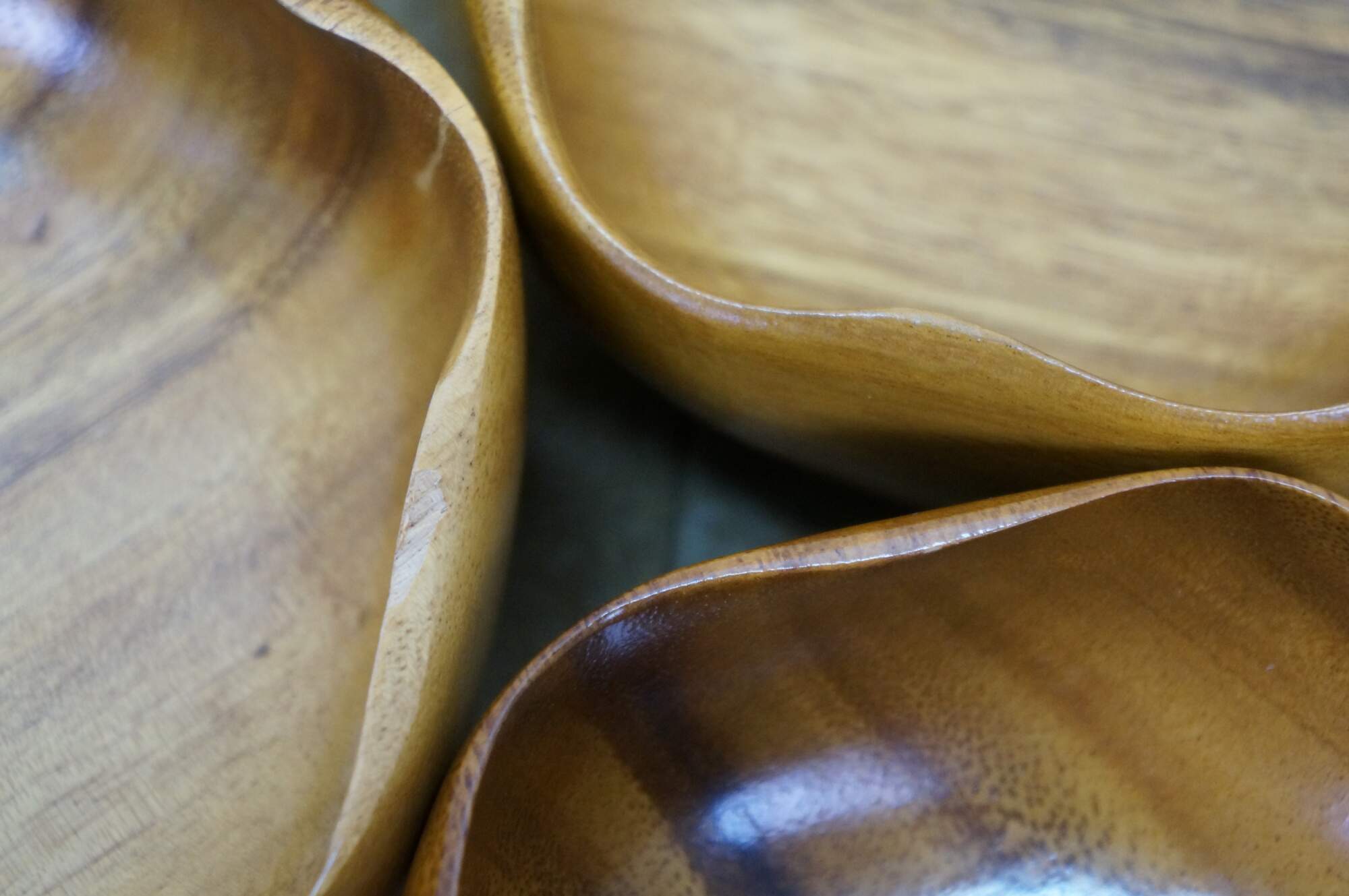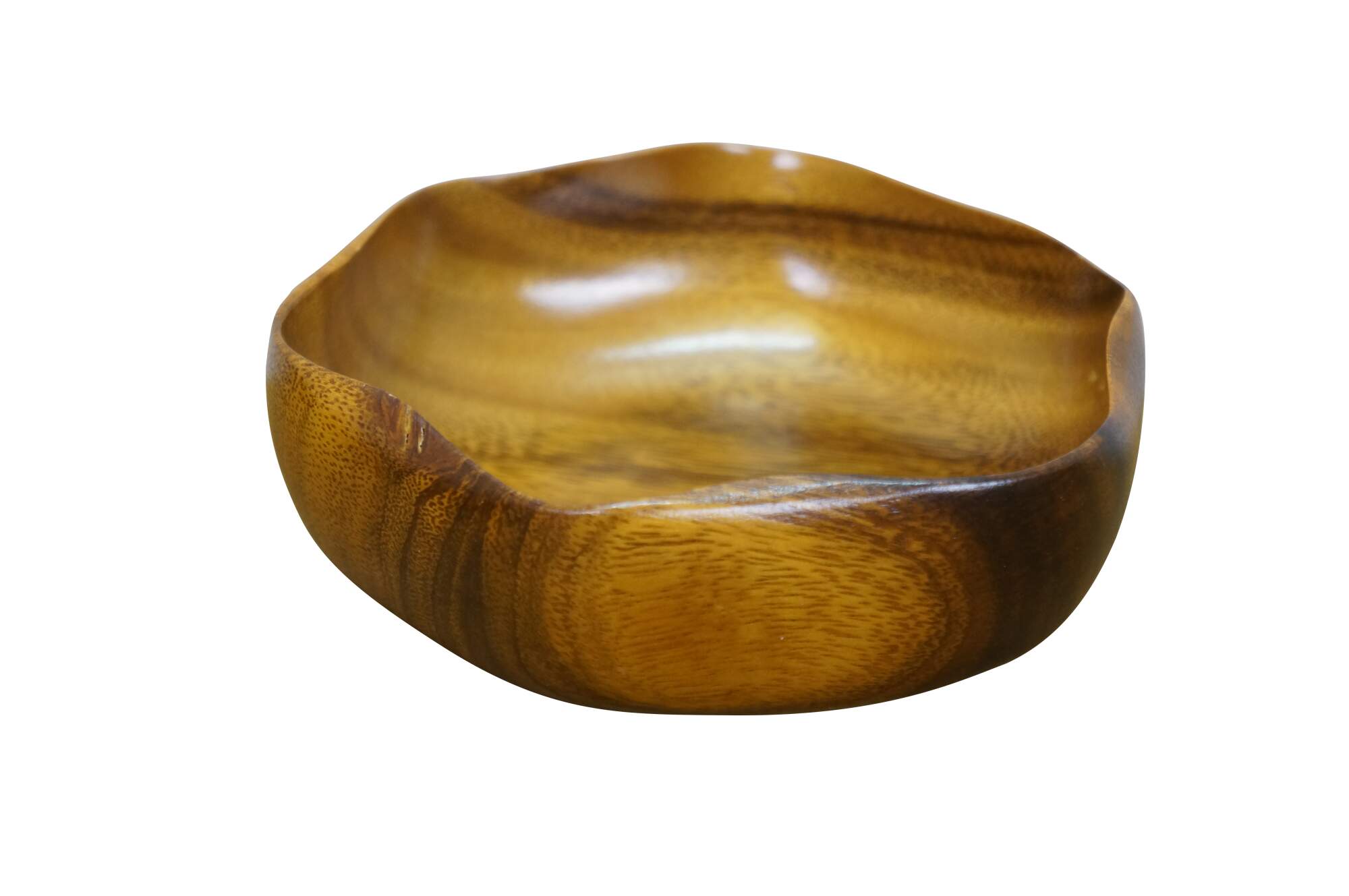 Four vintage hand-turned bowls crafted from monkey pod hardwood and featuring a distinct scalloped, freeform edge. Made in Hawaii, signed on base.