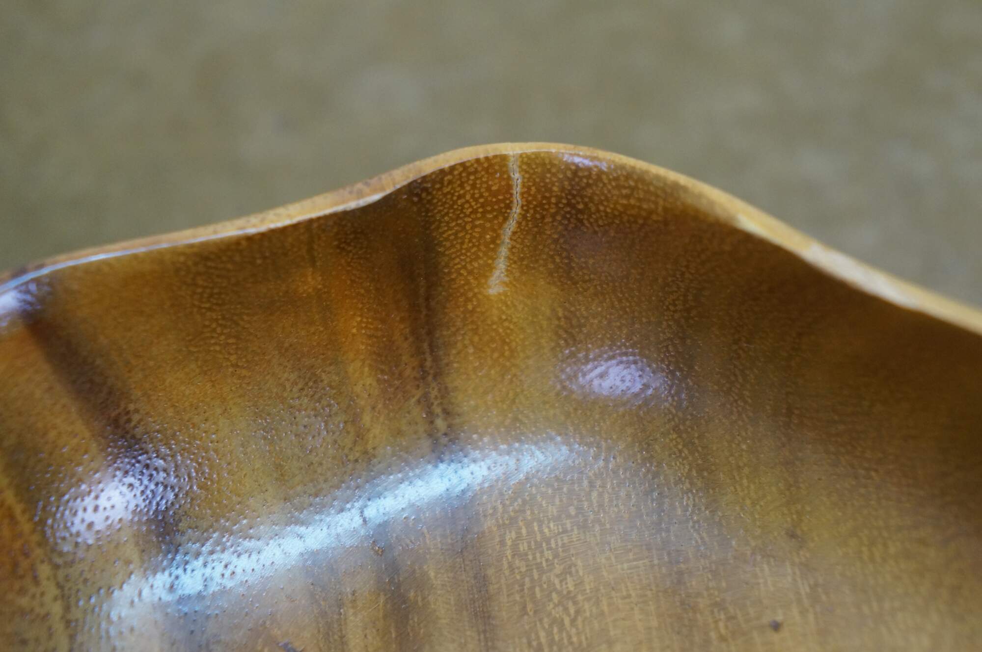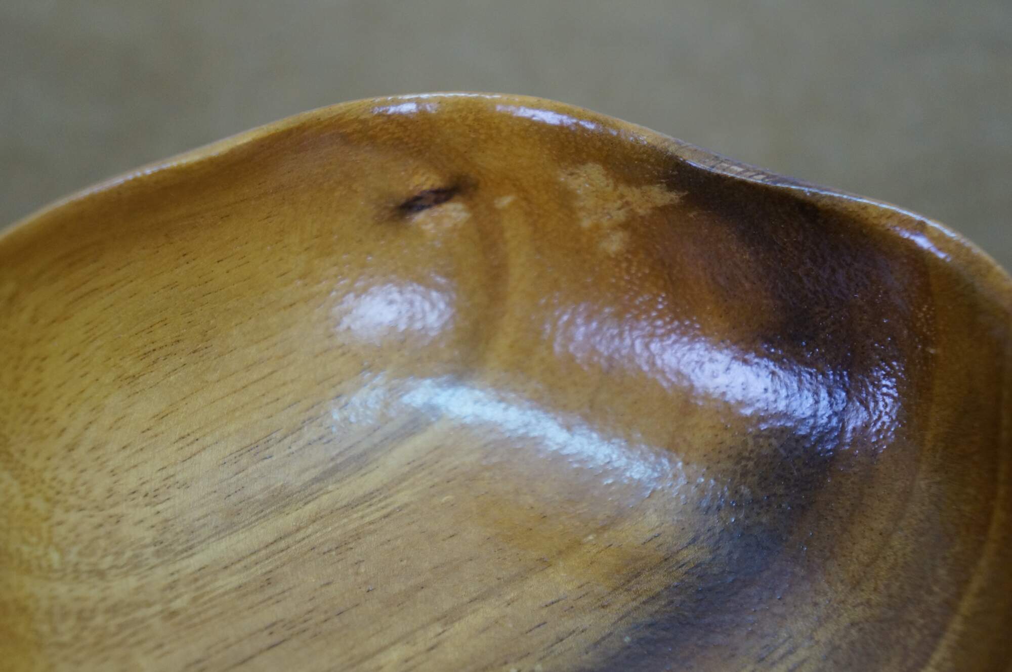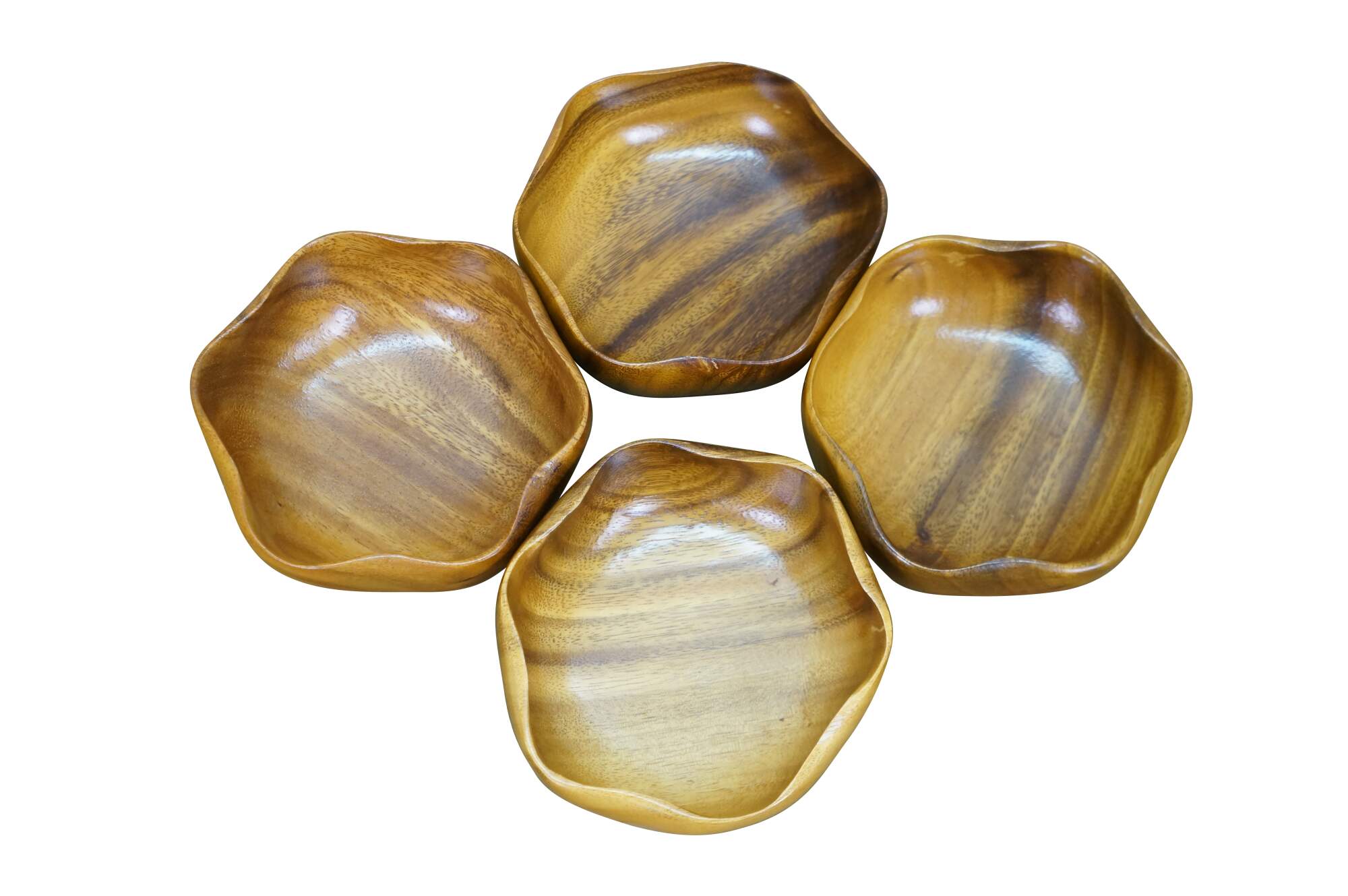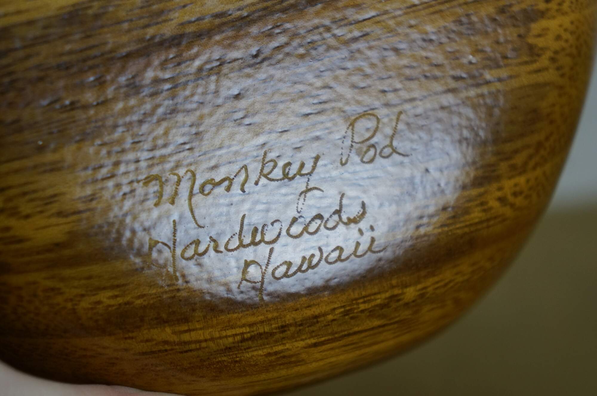 Four vintage hand-turned bowls crafted from monkey pod hardwood and featuring a distinct scalloped, freeform edge. Made in Hawaii, signed on base.