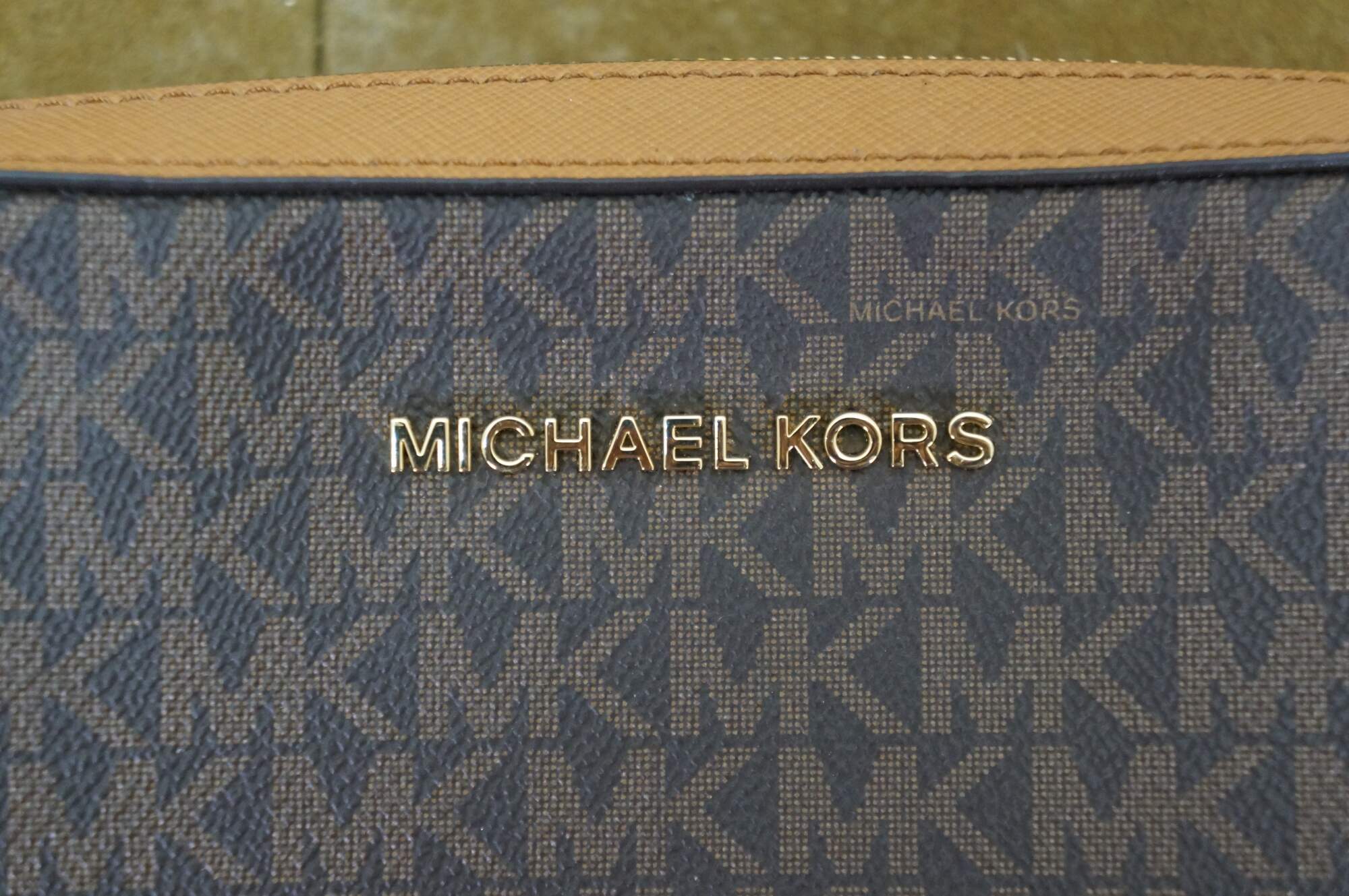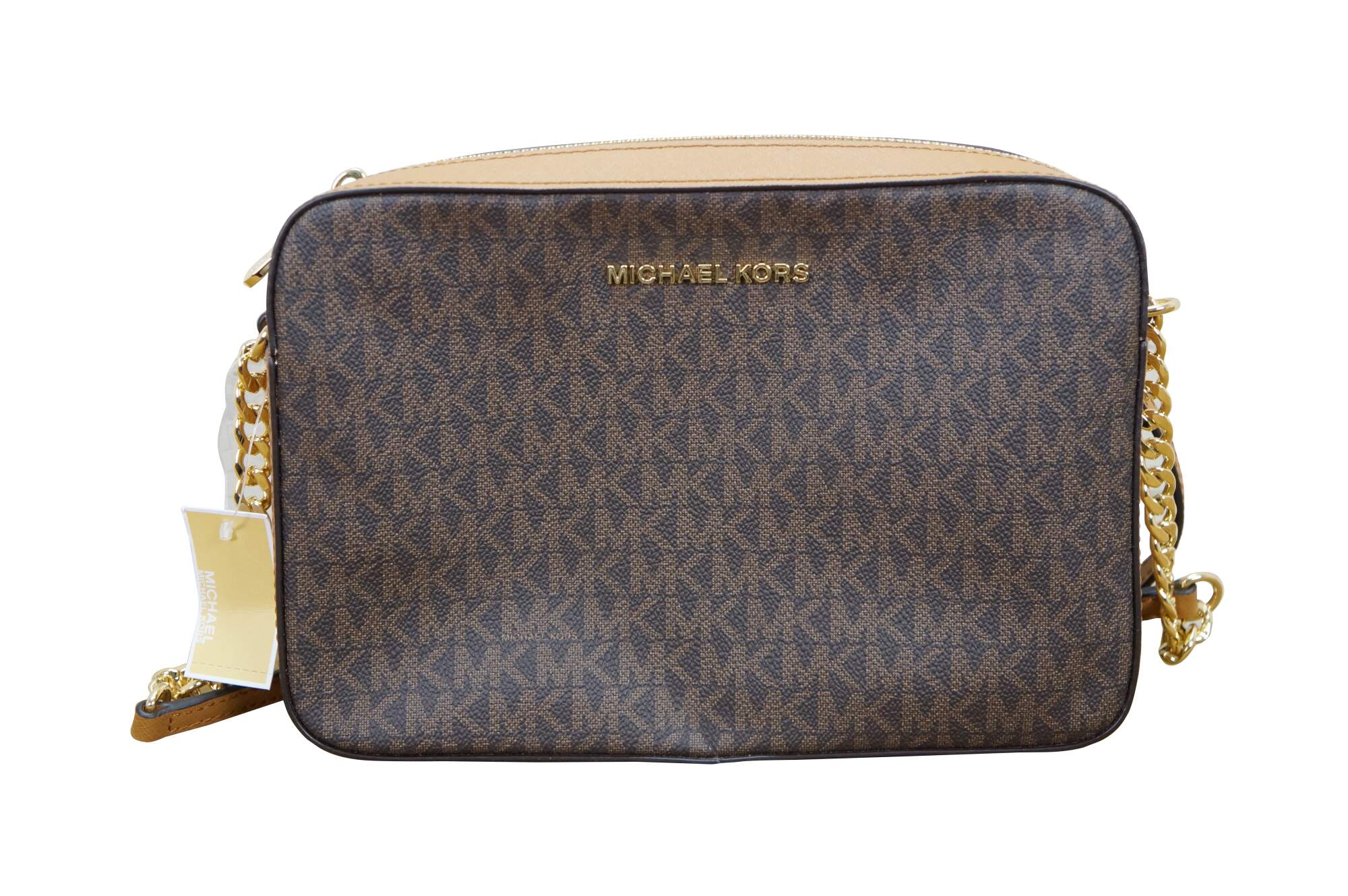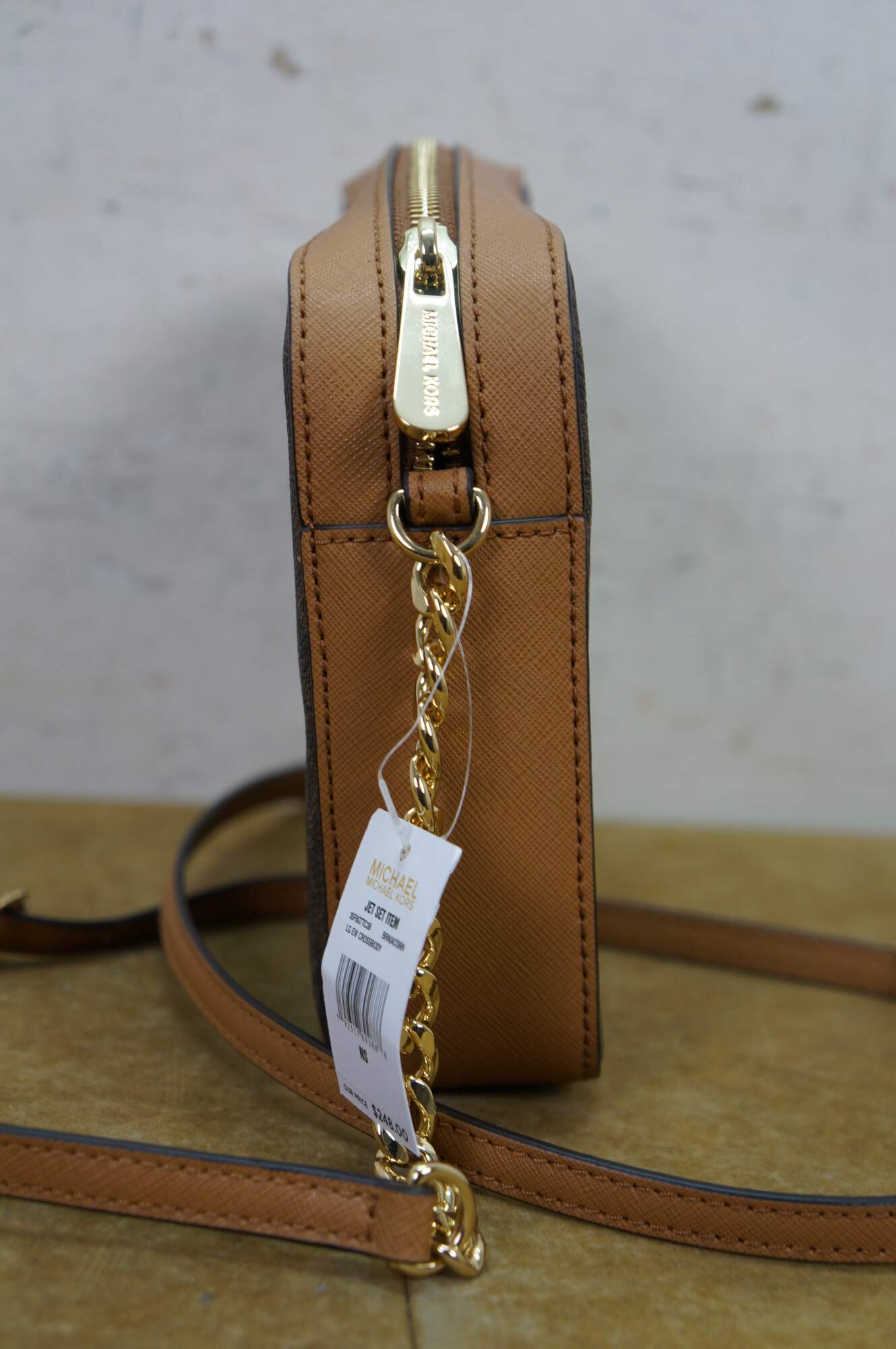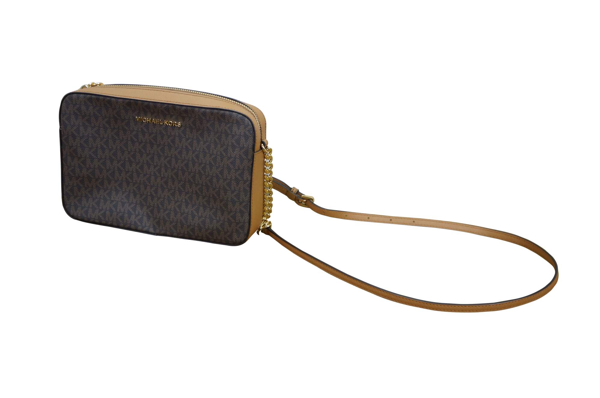 Michael Kors Jet Set Item East West (EW) crossbody bag in brown signature PVC leather. MSRP $248. 35f8gttc3b.
