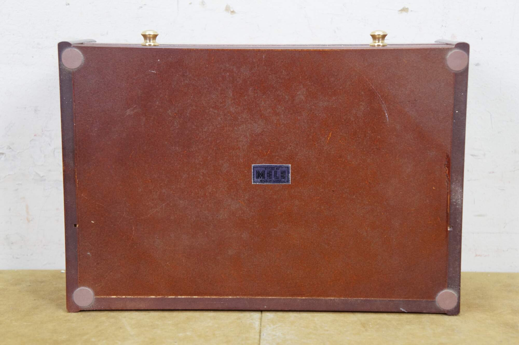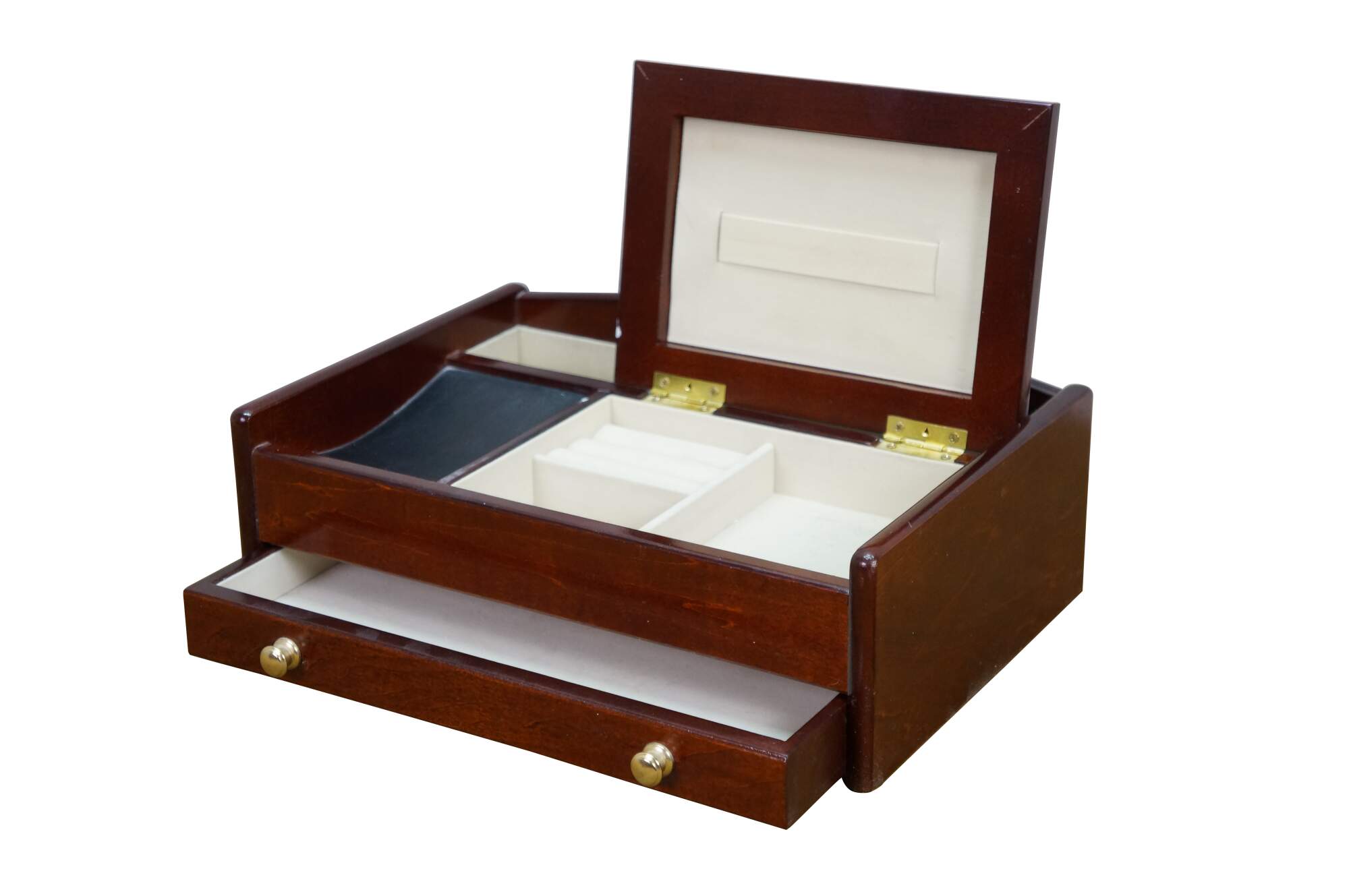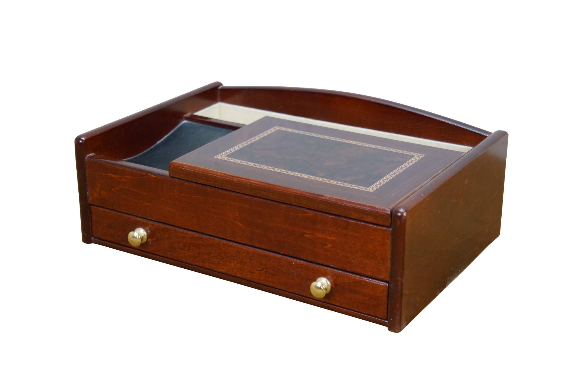 Vintage Mele & Co Davin dresser or desktop jewelry box / valet / organizer. Made of wood with a walnut and burl finish. Coin slide tray, 1 small section for loose jewelry / cufflinks, 1 large open section, a row of ring rolls, and an open area storage drawer slot.