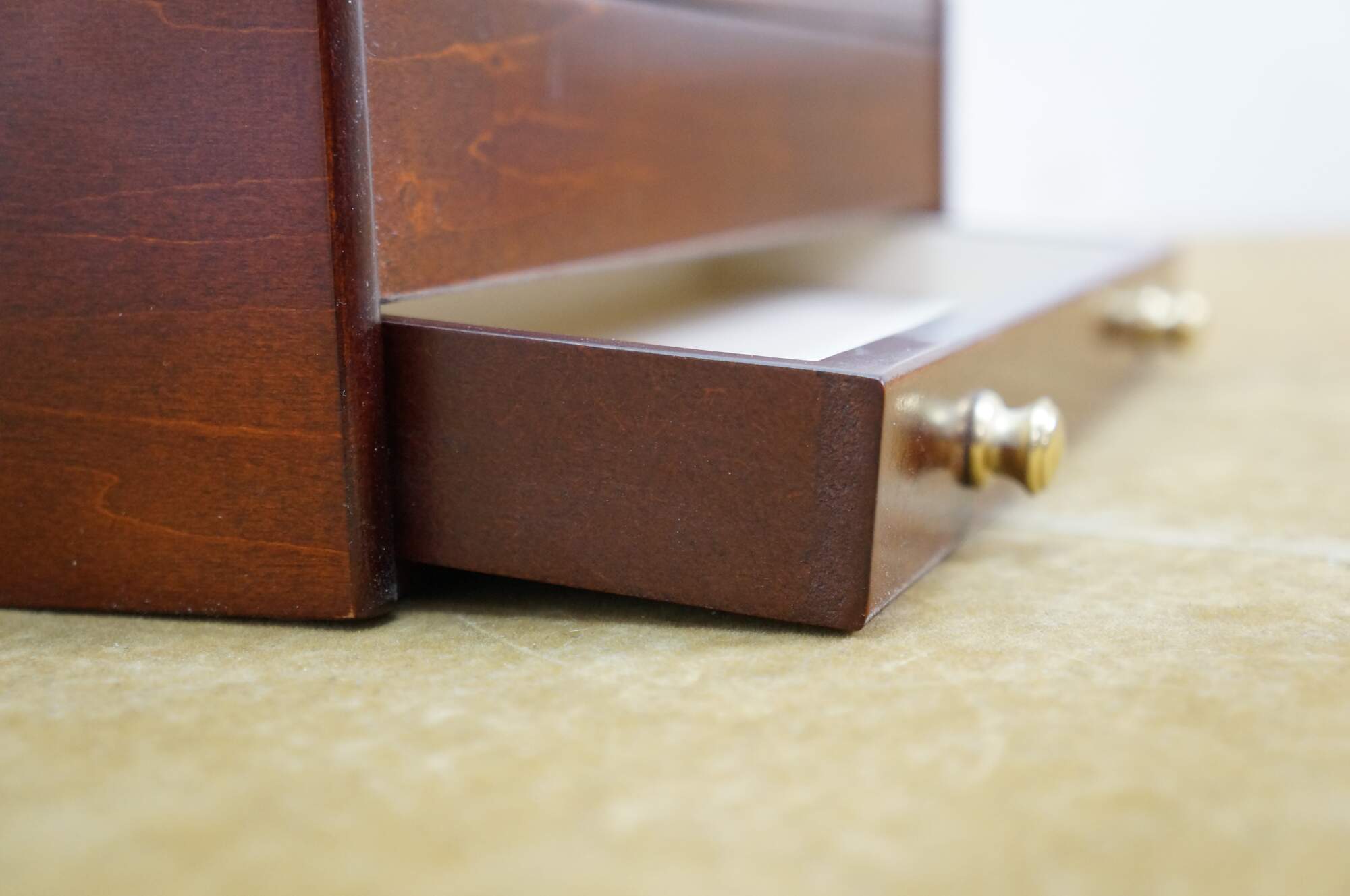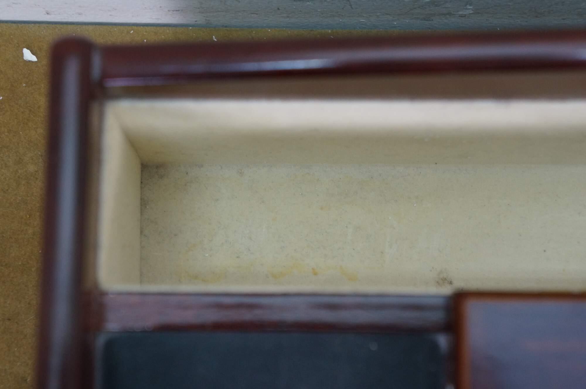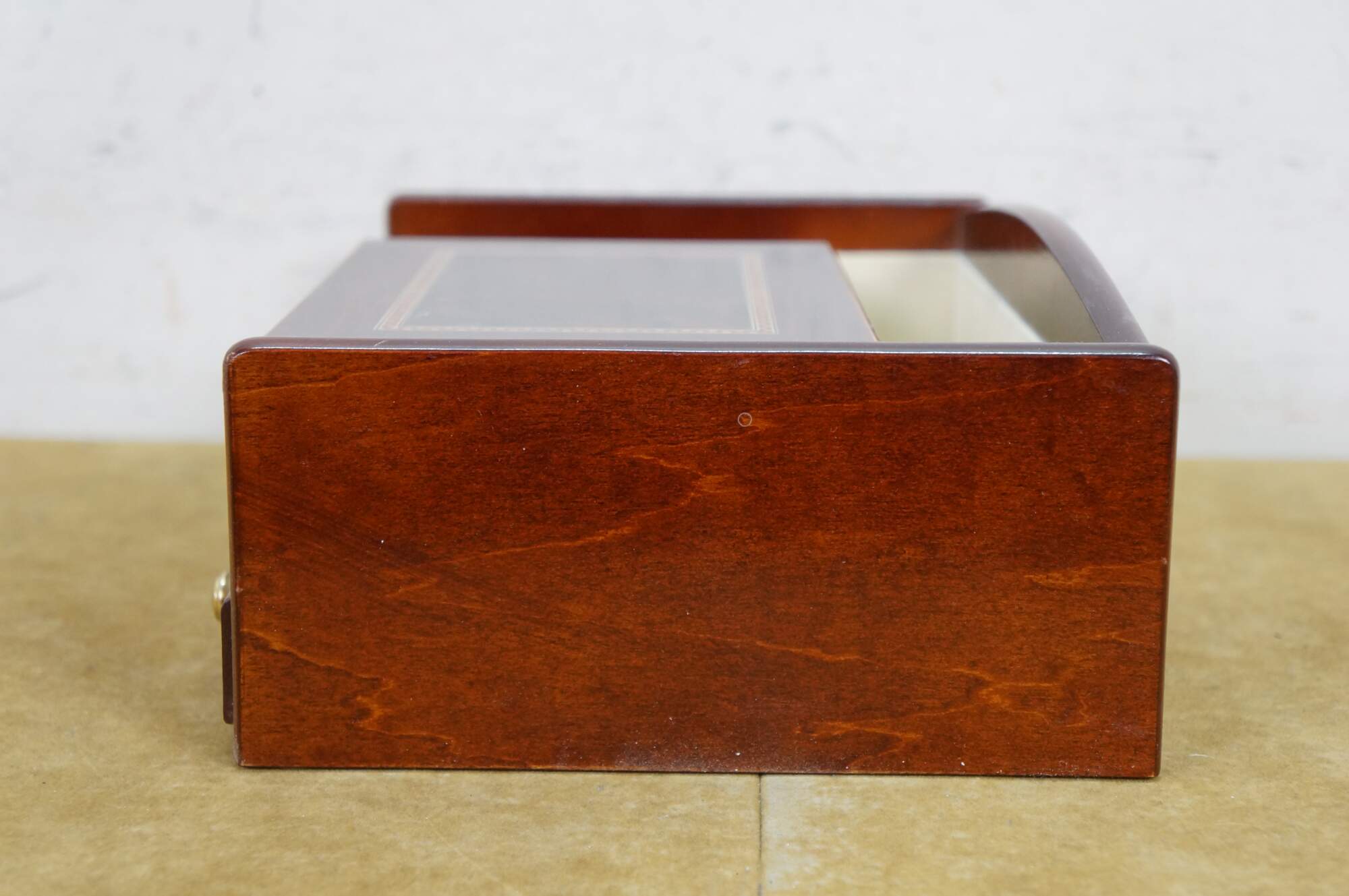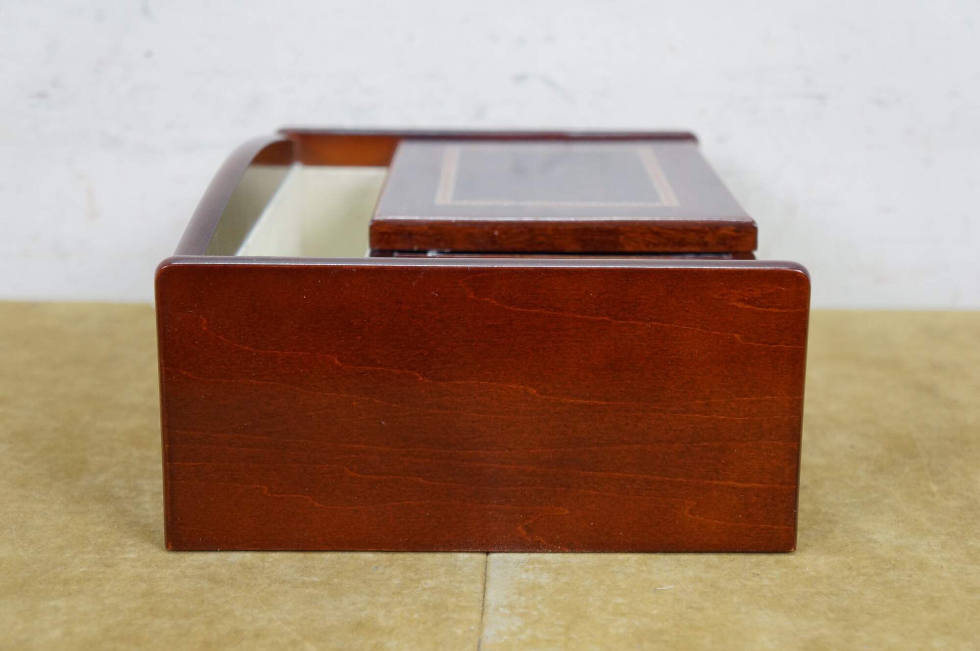 Vintage Mele & Co Davin dresser or desktop jewelry box / valet / organizer. Made of wood with a walnut and burl finish. Coin slide tray, 1 small section for loose jewelry / cufflinks, 1 large open section, a row of ring rolls, and an open area storage drawer slot.