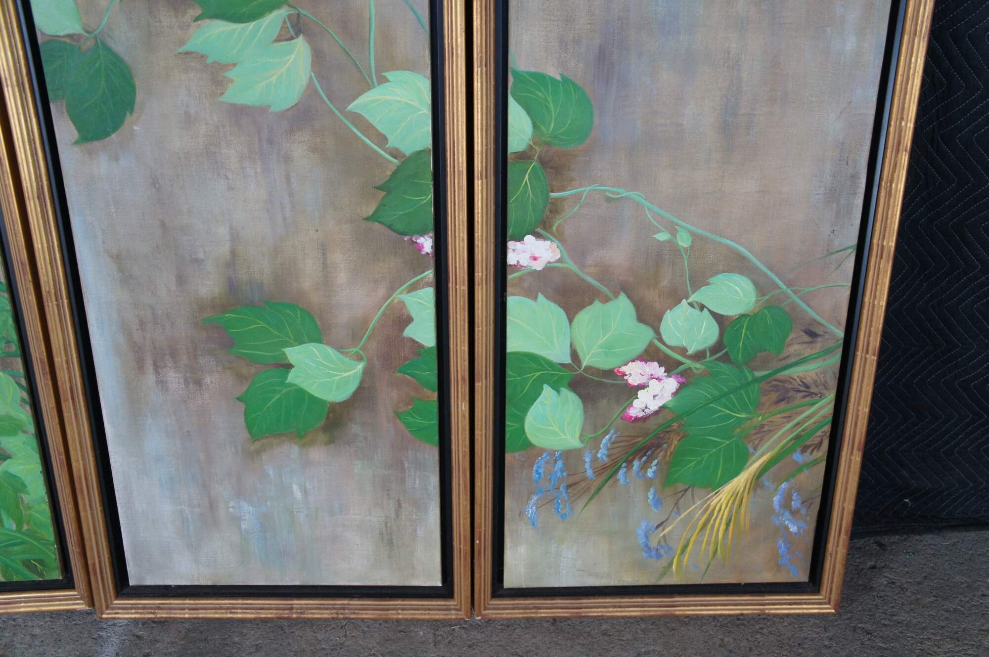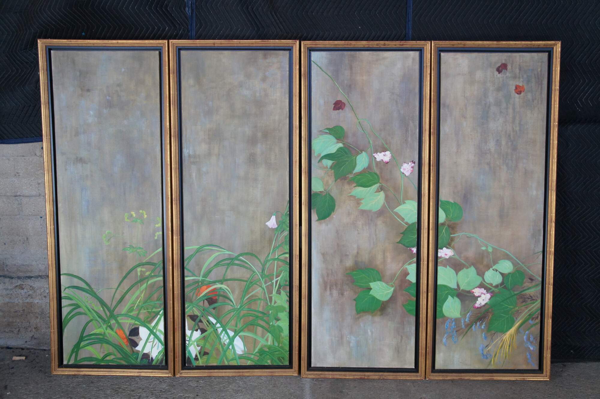 Summer Rain is a masterpiece that was painted by Sakai Hoisu during the Edo-period (1603-1868). This contemporary example after the artist separates the work into eight canvas connected through four separate folding screens or room dividers. Each canvas is a masterfully hand painted oil painting framed in wood with gold trim. Summer Rain showcases a refreshing atmosphere of a thunderstorm in Japan. Also known as Summer and Autumn Flower Plants. Each of the four screens can stand alone. Mounting hardware could be added to hang along a wall. Backing is fabric covered.