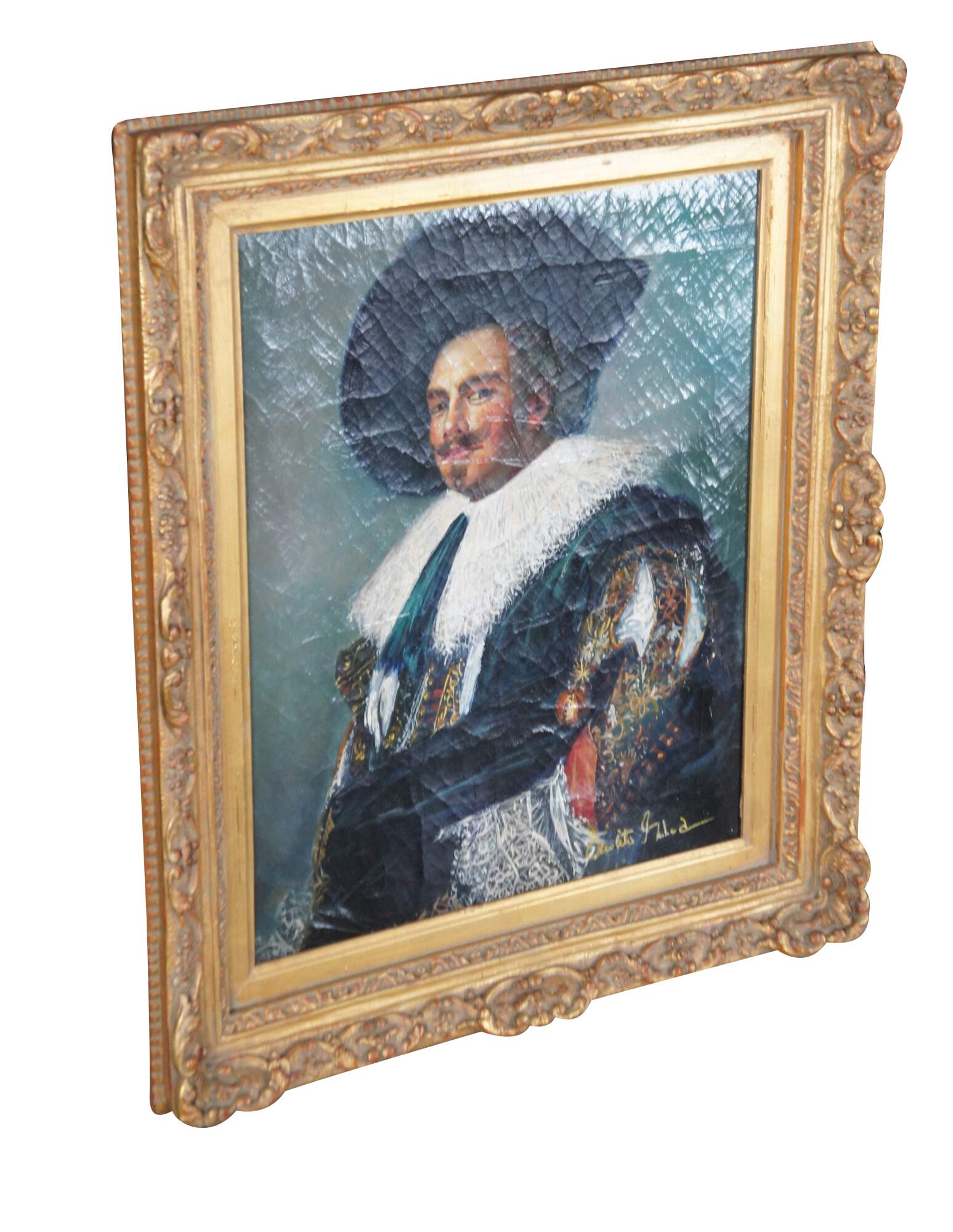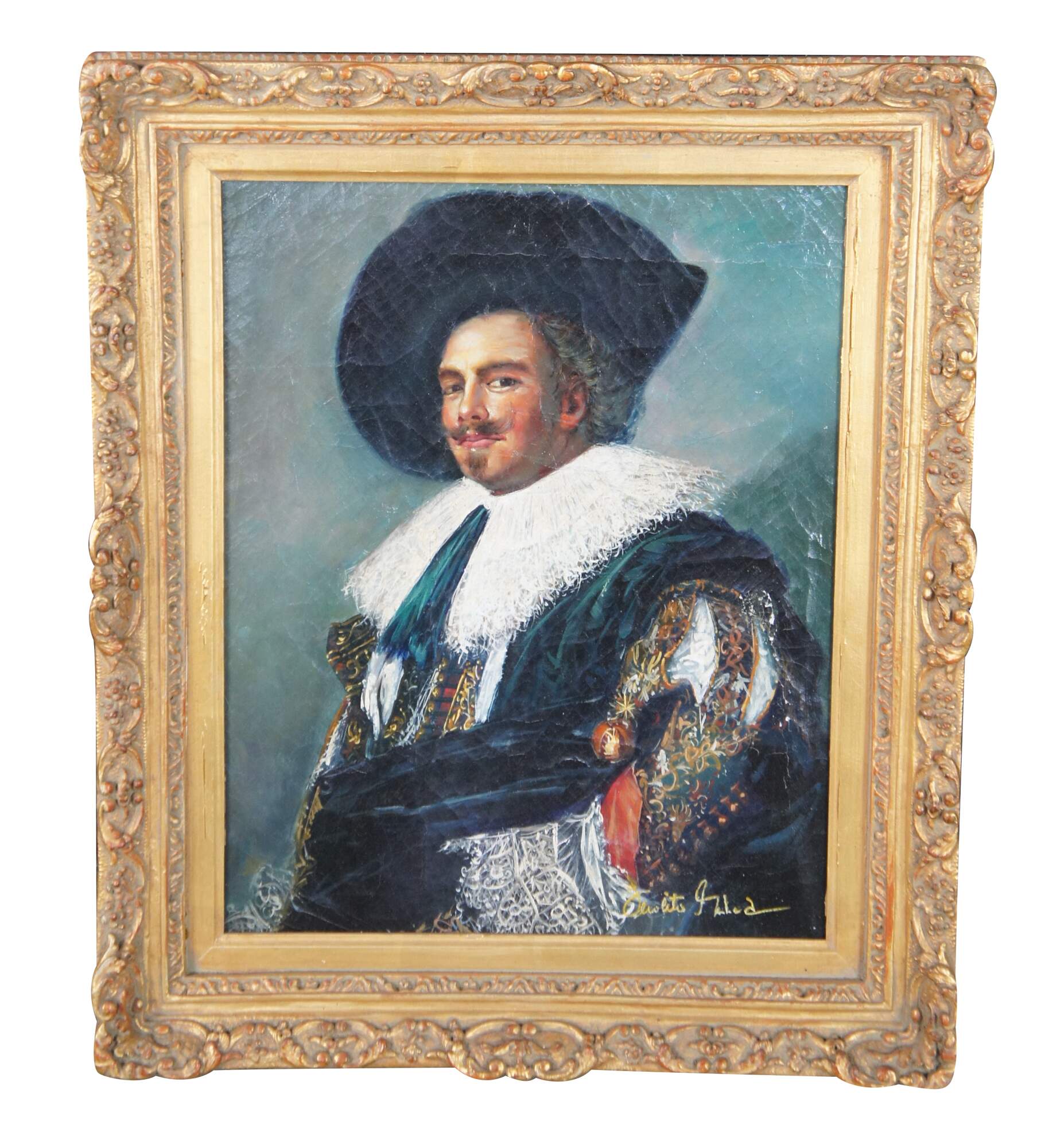 Contemporary school oil painting after the 1624 portrait The Laughing Cavalier by Dutch Golden Age painter Frans Hals. The painting is on a craquelure canvas to give the impression of age and signed lower right. The painting is ornately framed with a gold finish. Circa late 20th Century