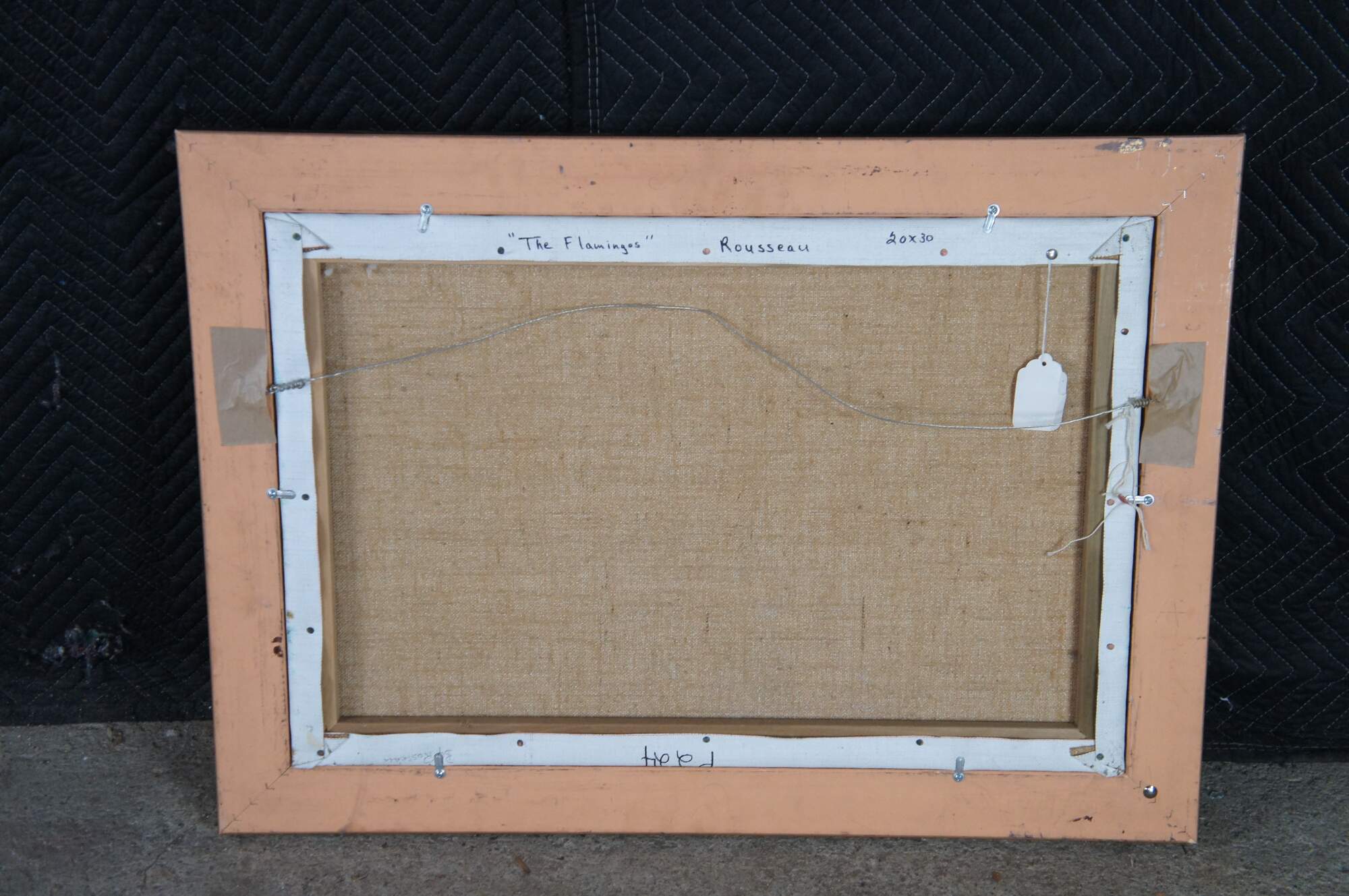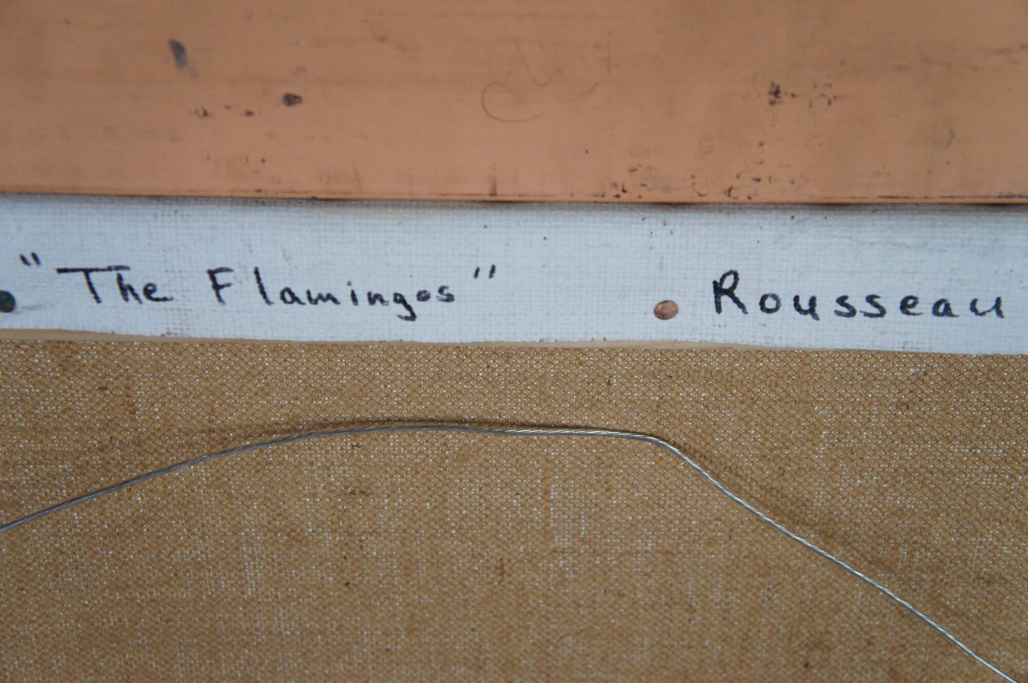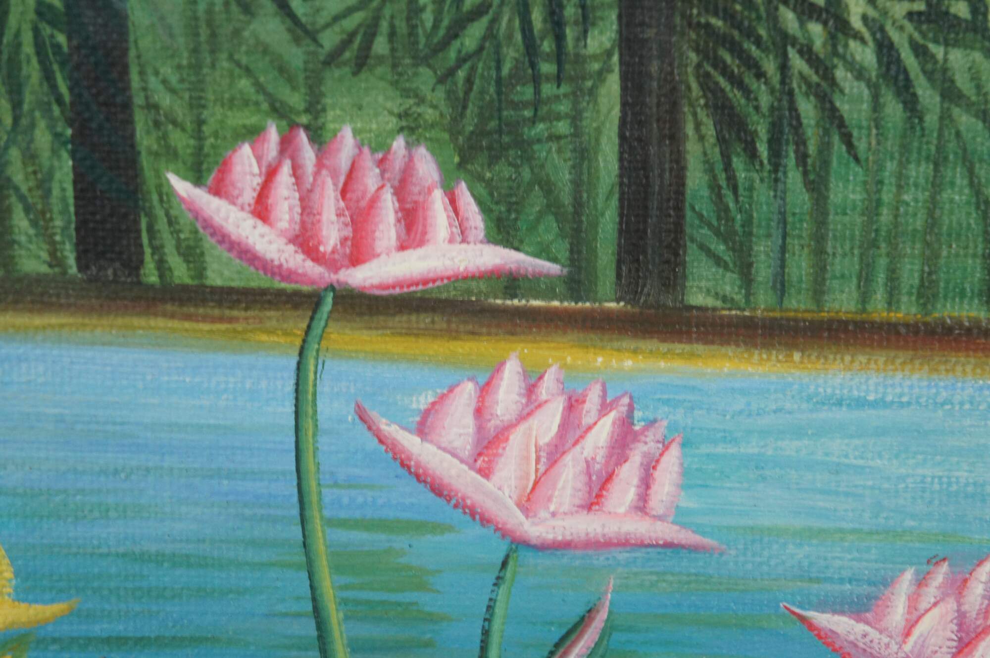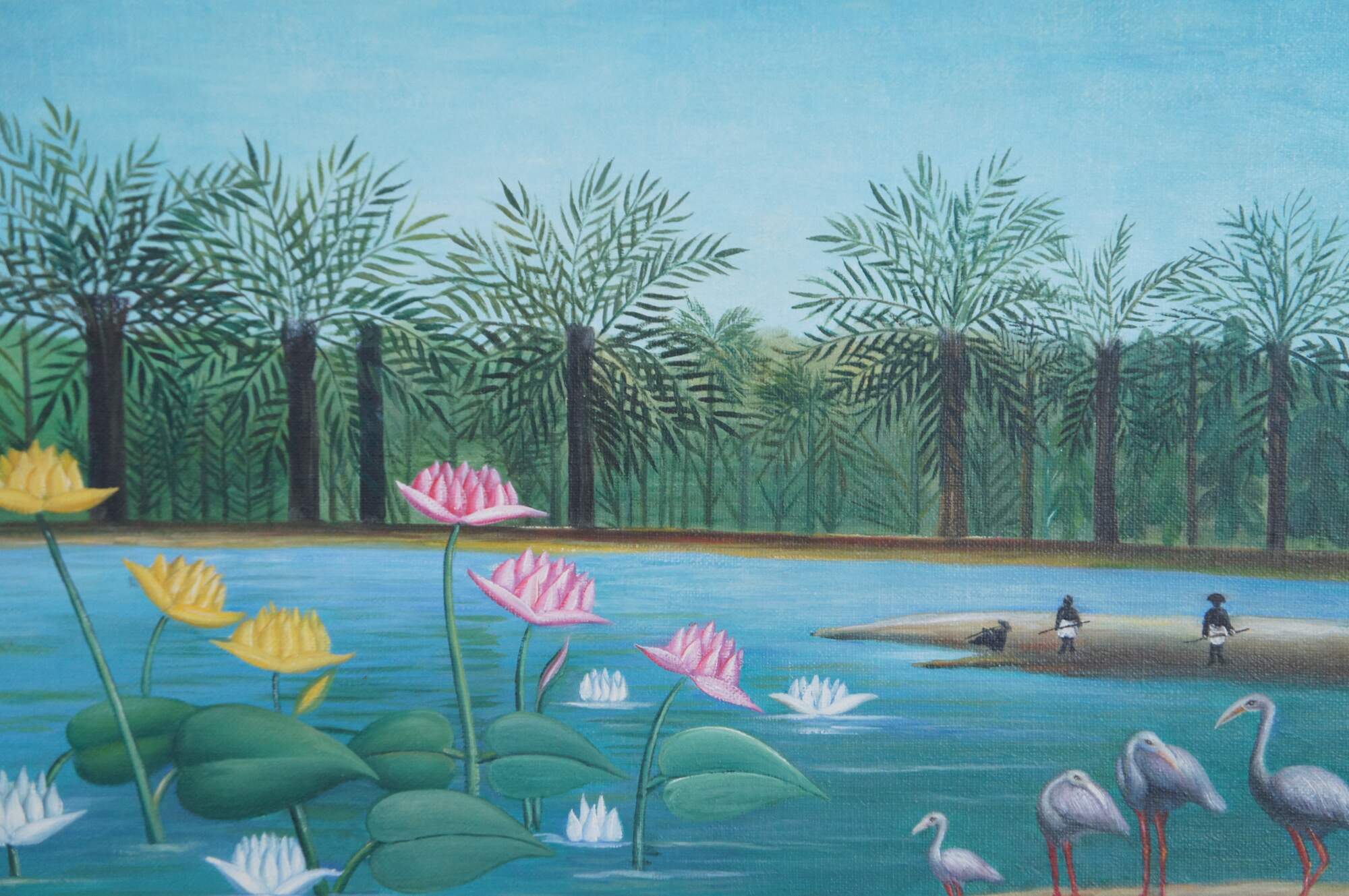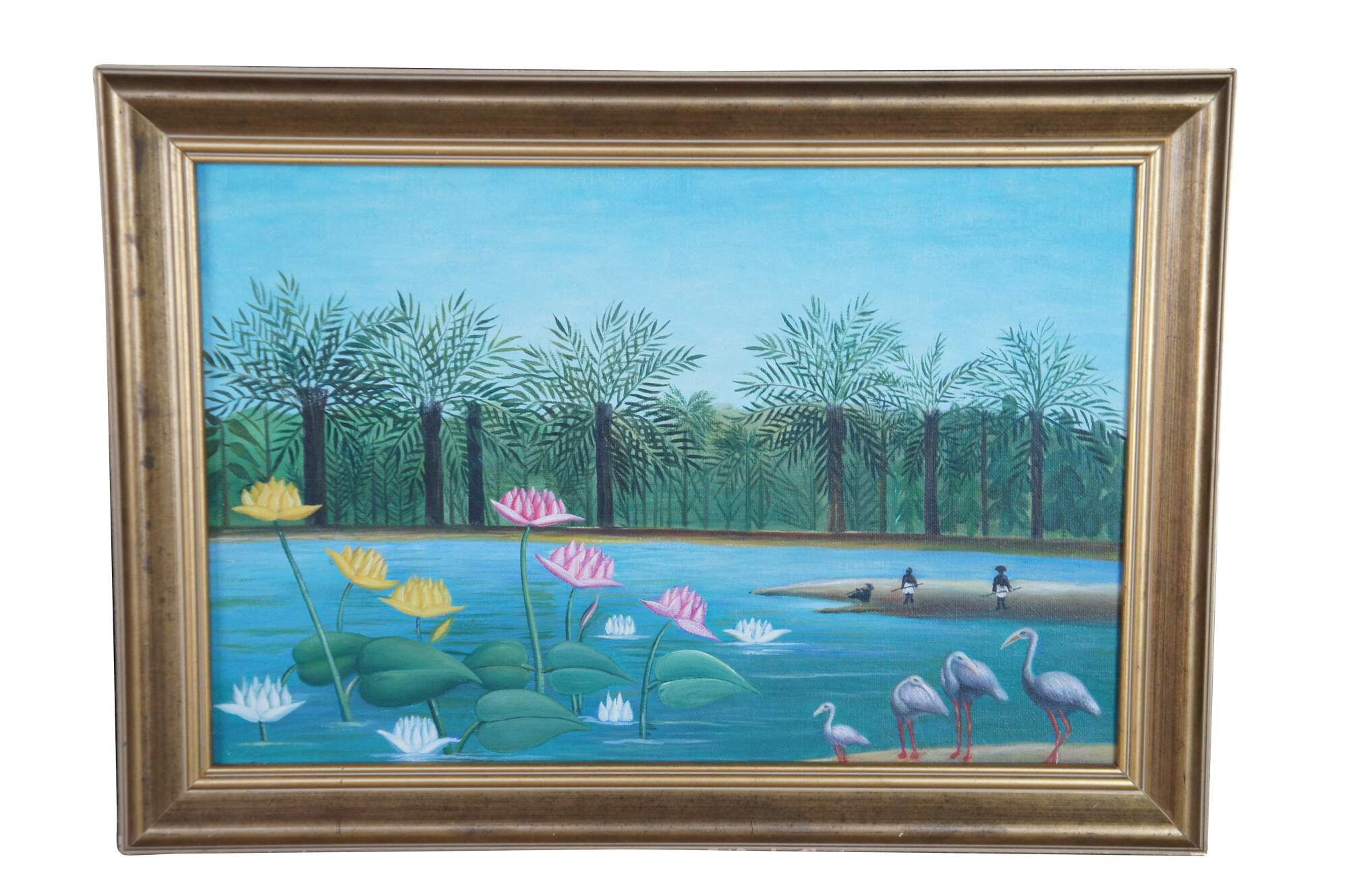 The Flamingoes is a painting by Henri Rousseau that was originally created in 1910. A tropical riverscape featuring flamingos, water lilies, and dense jungle foliage. This late 20th century contemporary school example has beautiful color and is framed in wood with a gold finish. The original painting is in a private New York Collection.