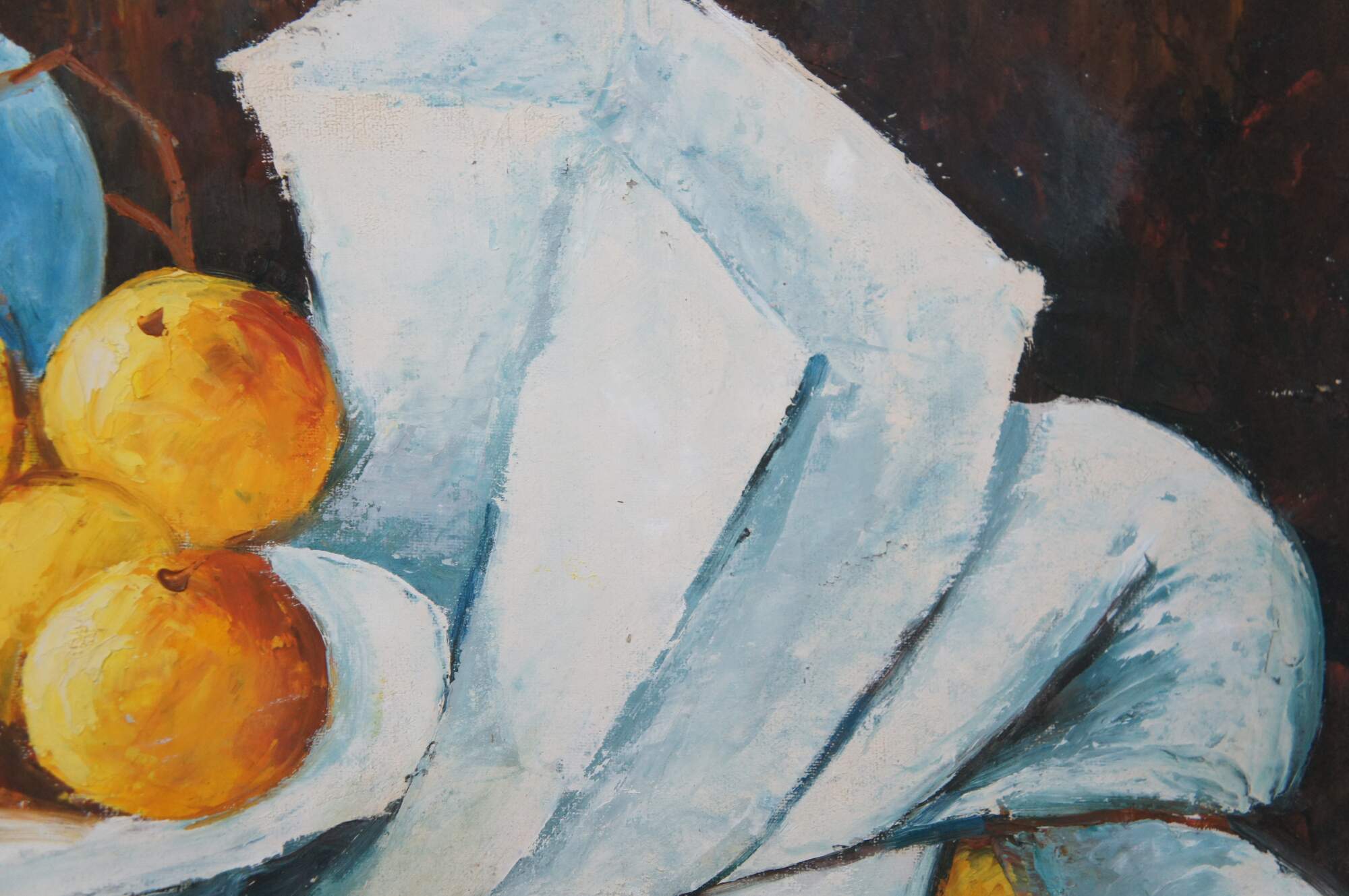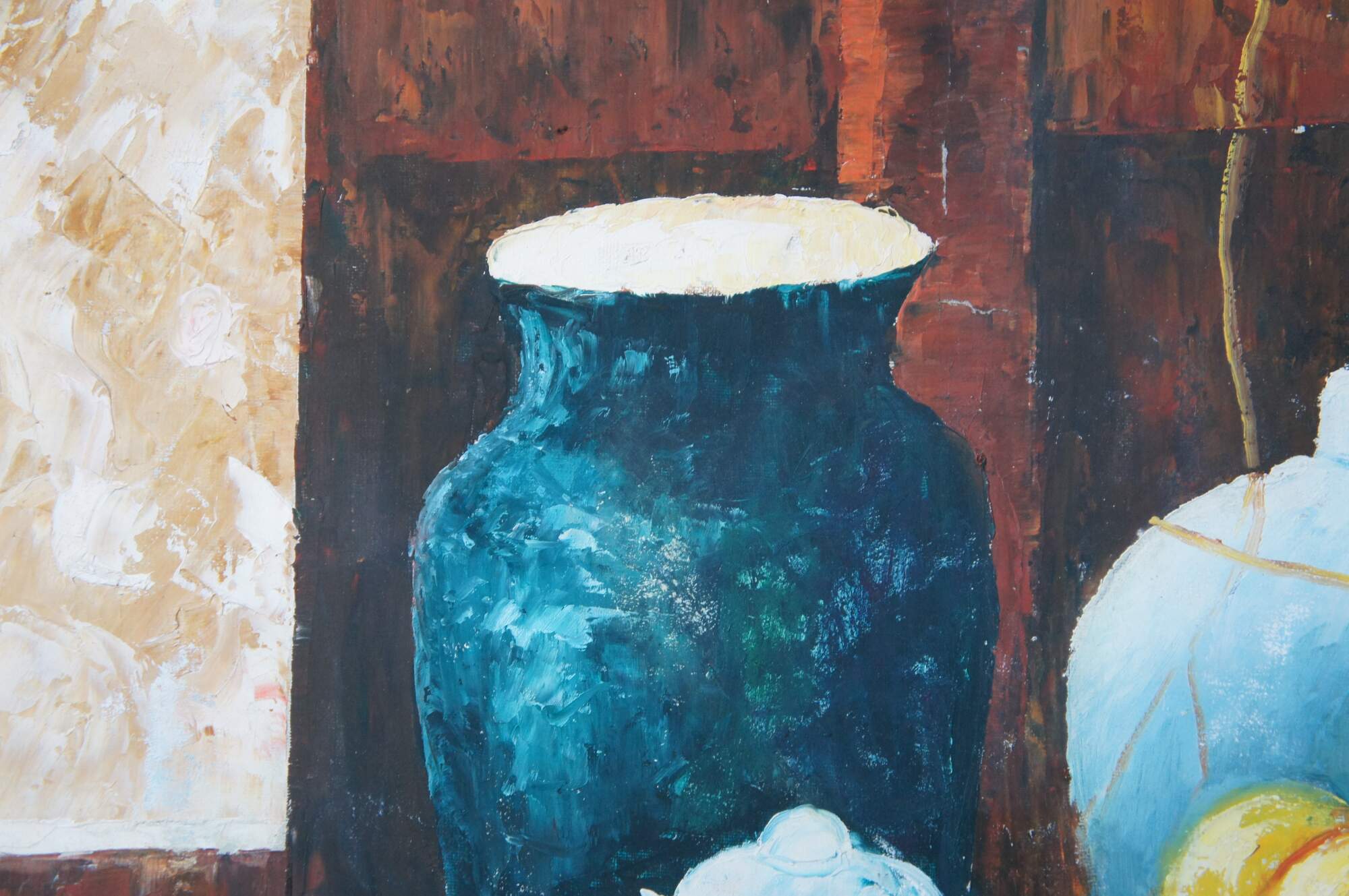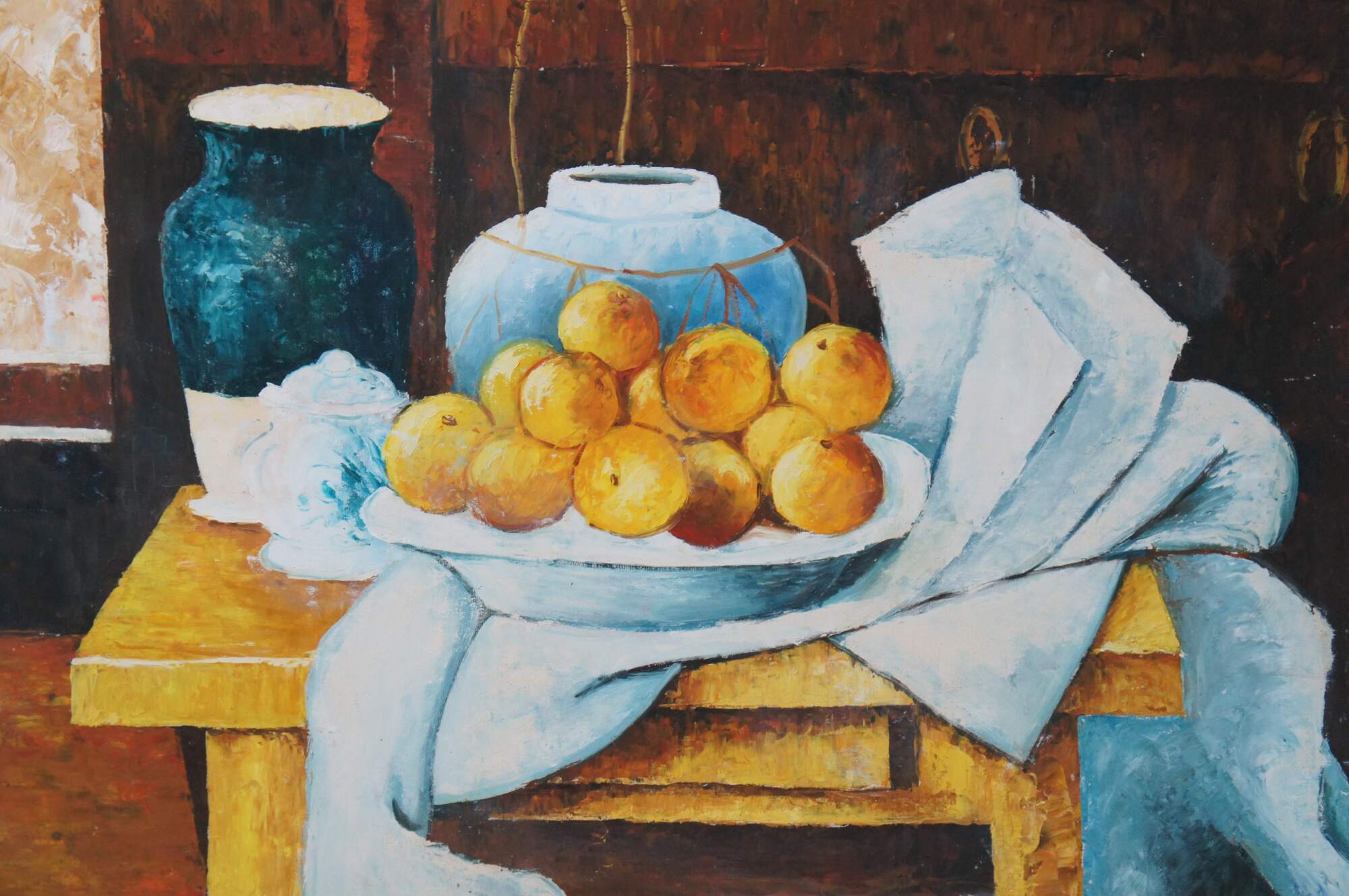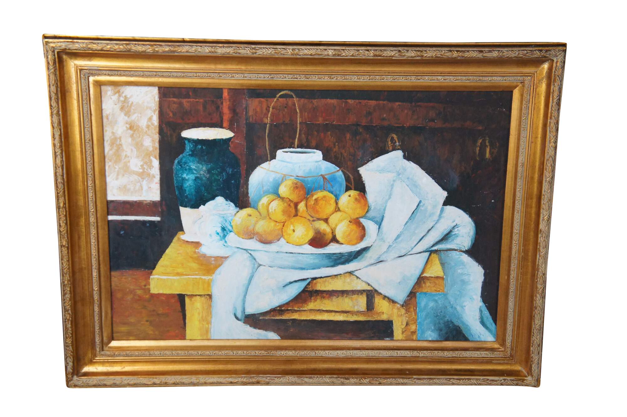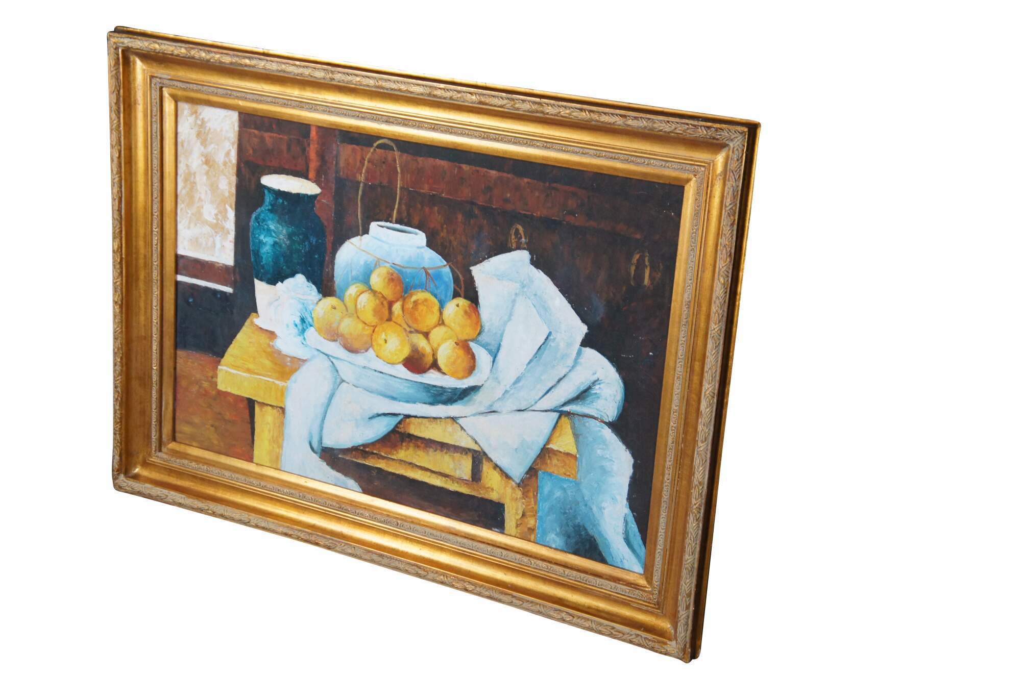 Contemporary School oil painting After Paul Cezanne's Still Life with a Chest of Drawers (1883/87). The original is currently on display at the Neue Pinakothek in Munich, Germany. Features a bowl of oranges resting on a table with two vases in front of a Bureau. The canvas is framed in Louis XV manner with a gold finish.